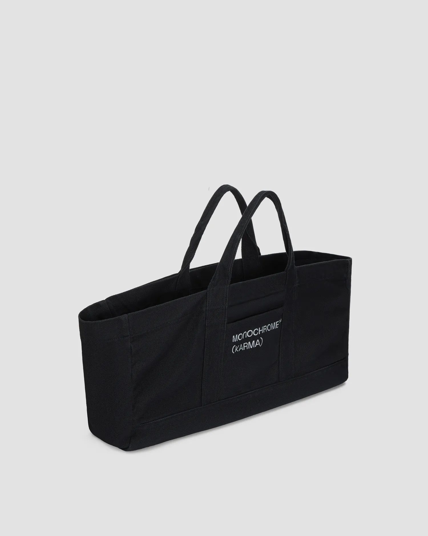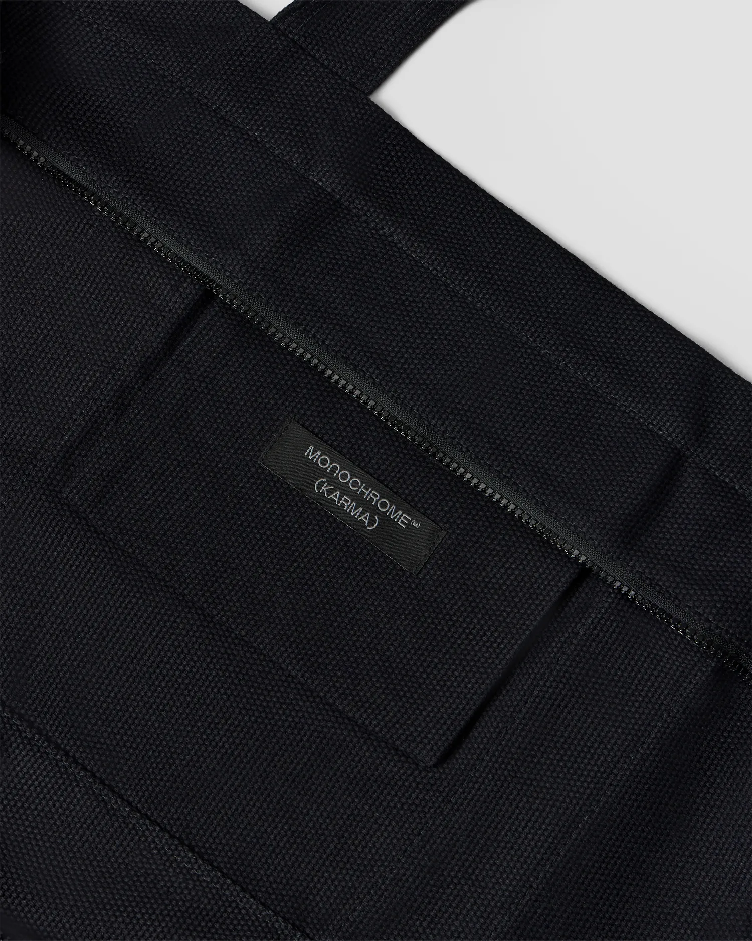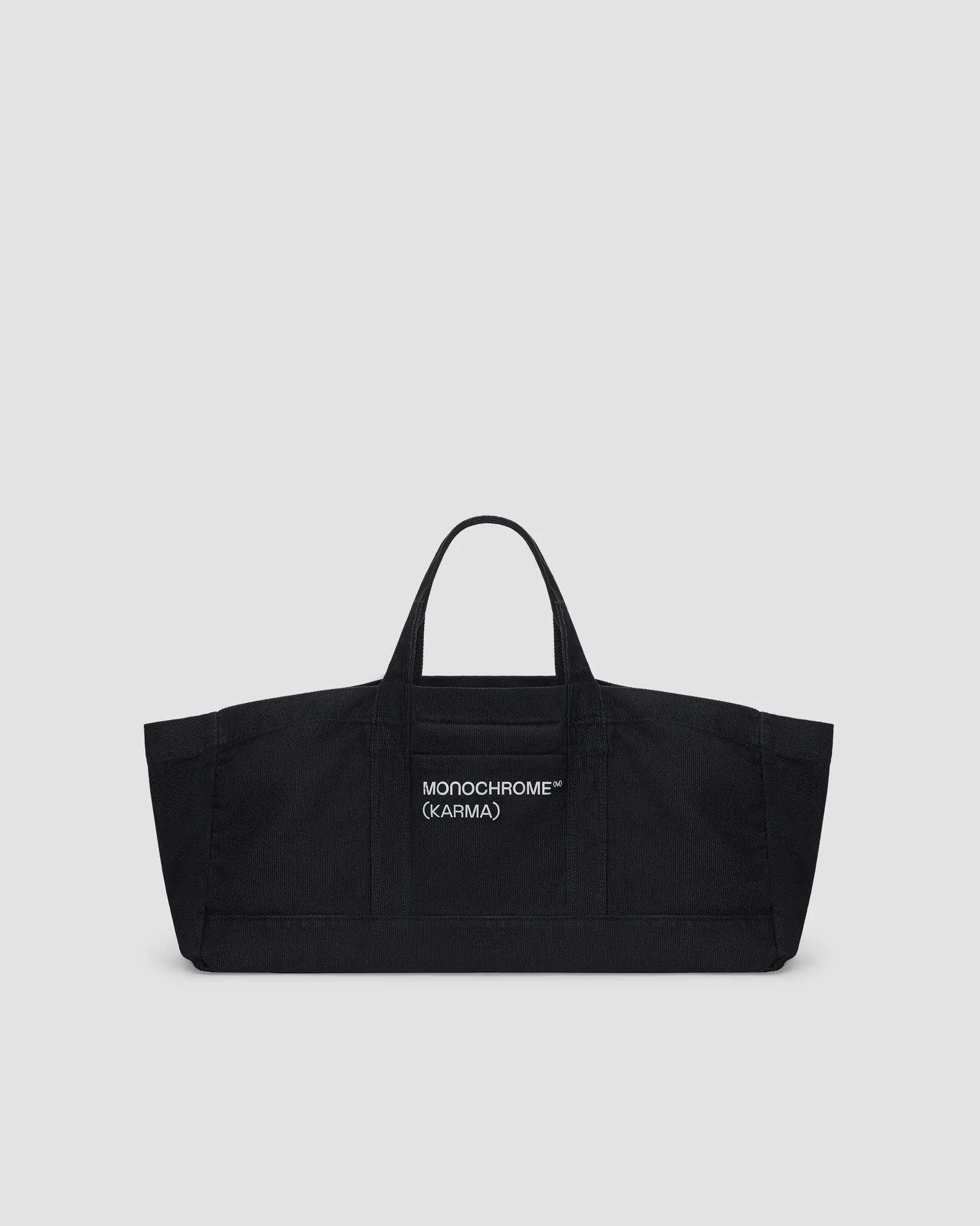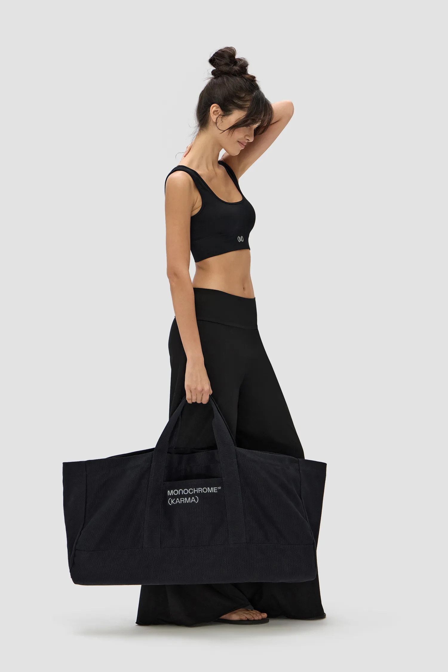 Большая спортивная сумка из 100% хлопка в черном цвета. Размер сумки идеально подходит для переноски коврика для йоги. Оснащена карманом снаружи и внутренним скрытым карманом с клапаном. Застегивается на молнию в тон изделия. Пуллер на молнии в виде элемента фирменного паттерна MONOCHROME. Рельефный логотип MONOCHROME KARMA контрастного белого цвета на внешнем кармане. Можно стирать в стиральной машине. Упаковка в черную подарочную коробку.