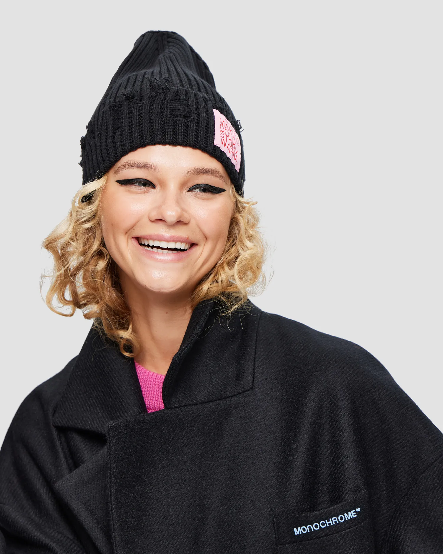 Вязаная шапка с рваными краями. Жаккардовый лейбл на отвороте с фирменной айдентикой. Цвет шапки: черный. Упаковка в базовую коробку. Допустима погрешность в измерениях 2-3 см.