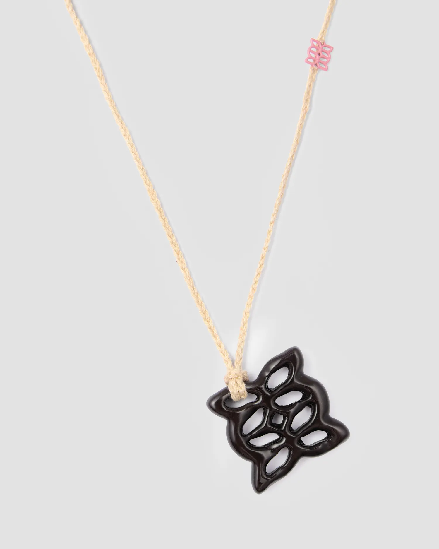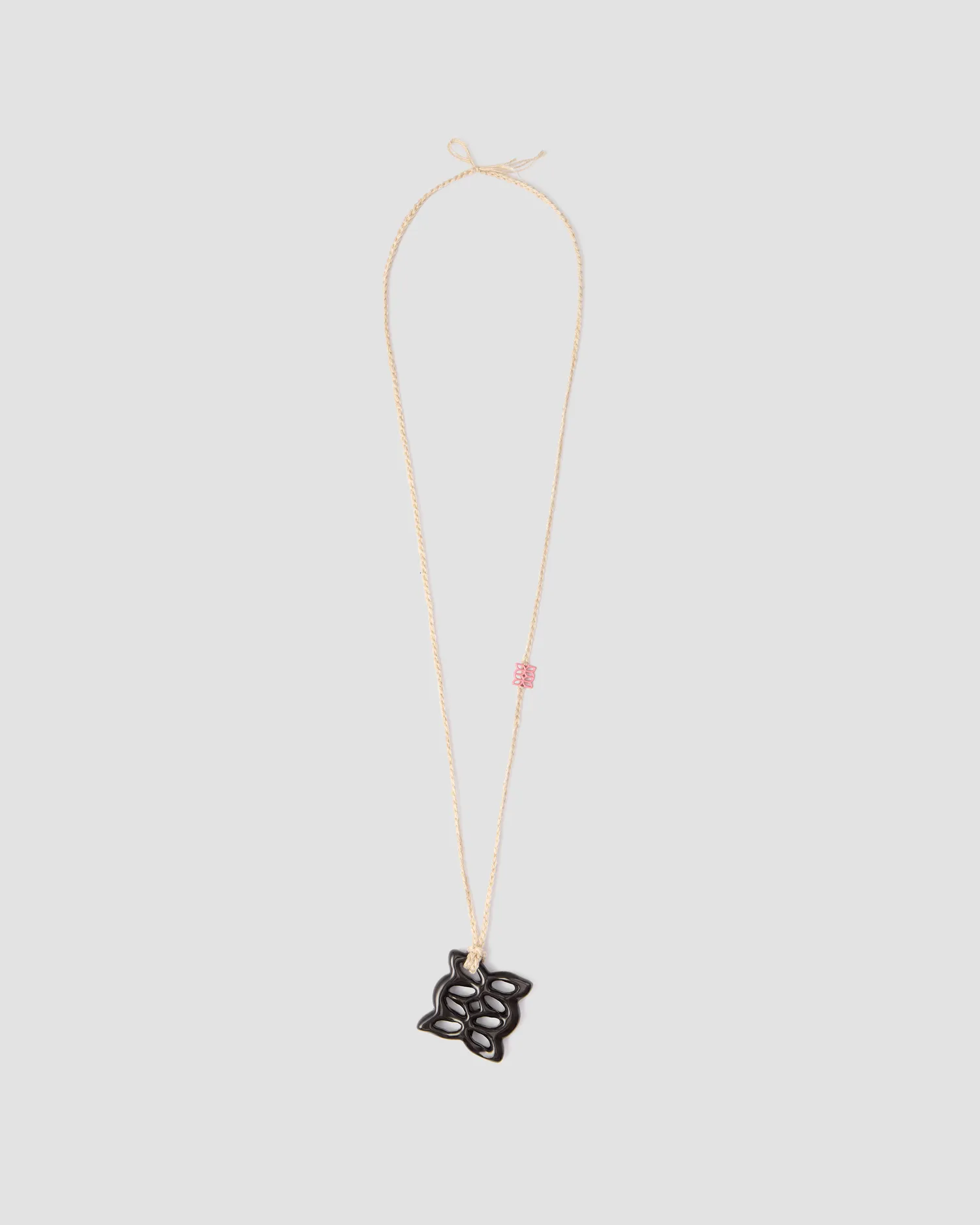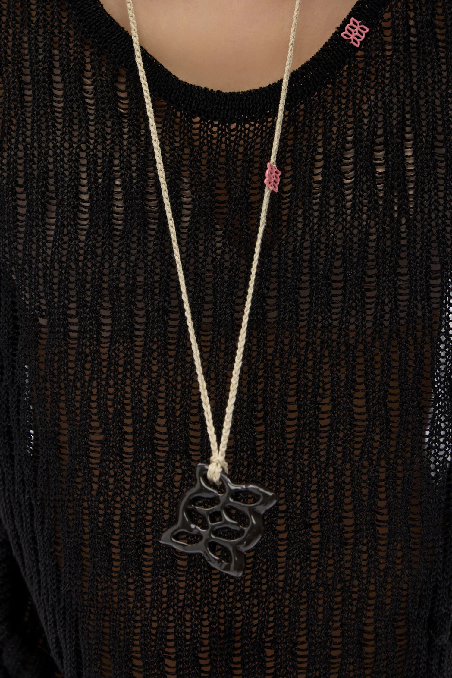 Керамическая подвеска черного цвета в виде фирменного элемента паттерна MONOCHROME. Каждое изделие изготавливается вручную. Шнурок молочного цвета из 100% хлопка с металлической нашивкой фирменного паттерна розового цвета. Изделие хрупкое, поэтому его нельзя ронять. Можно мыть. Упаковка в подарочную коробку.