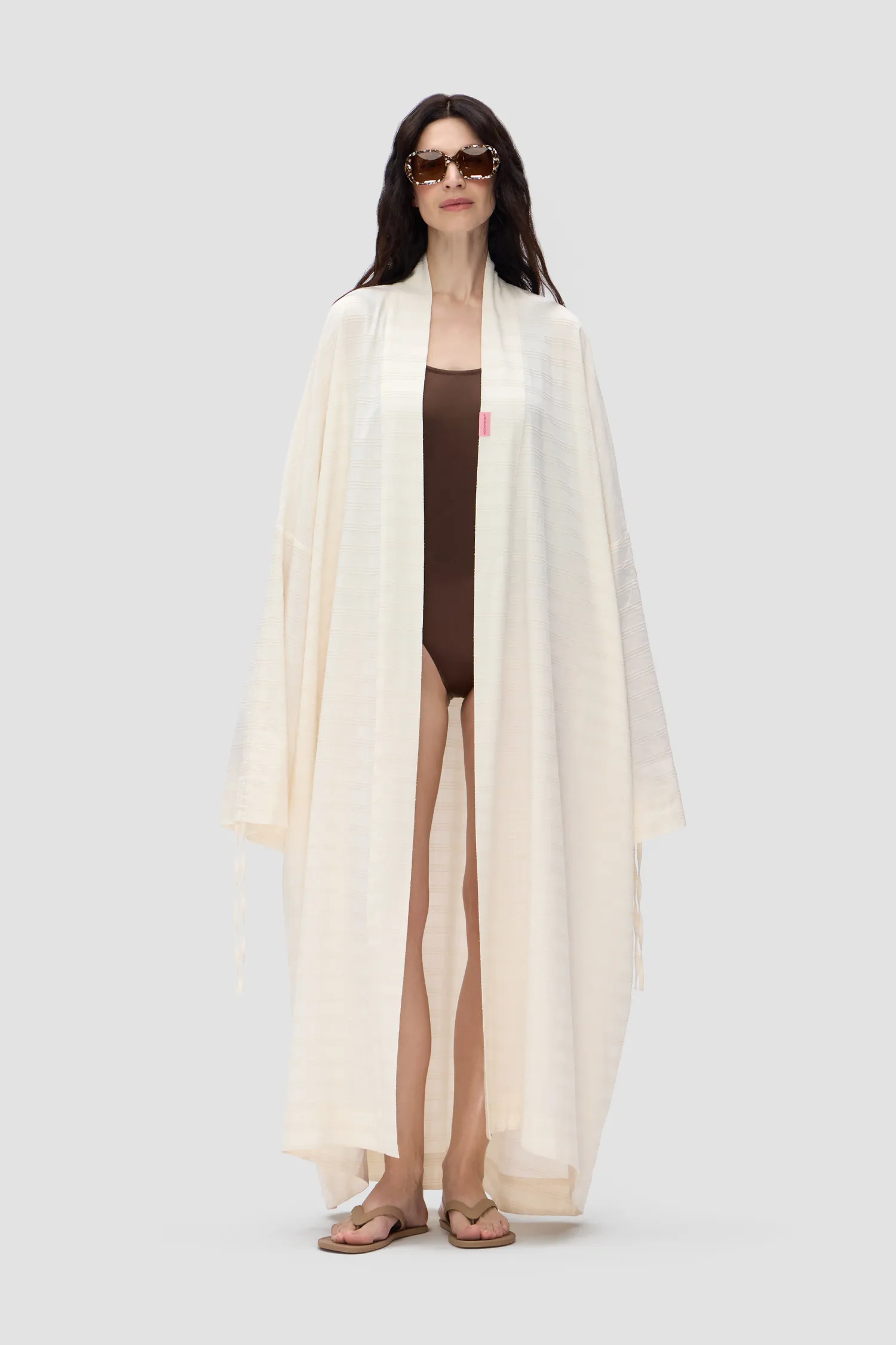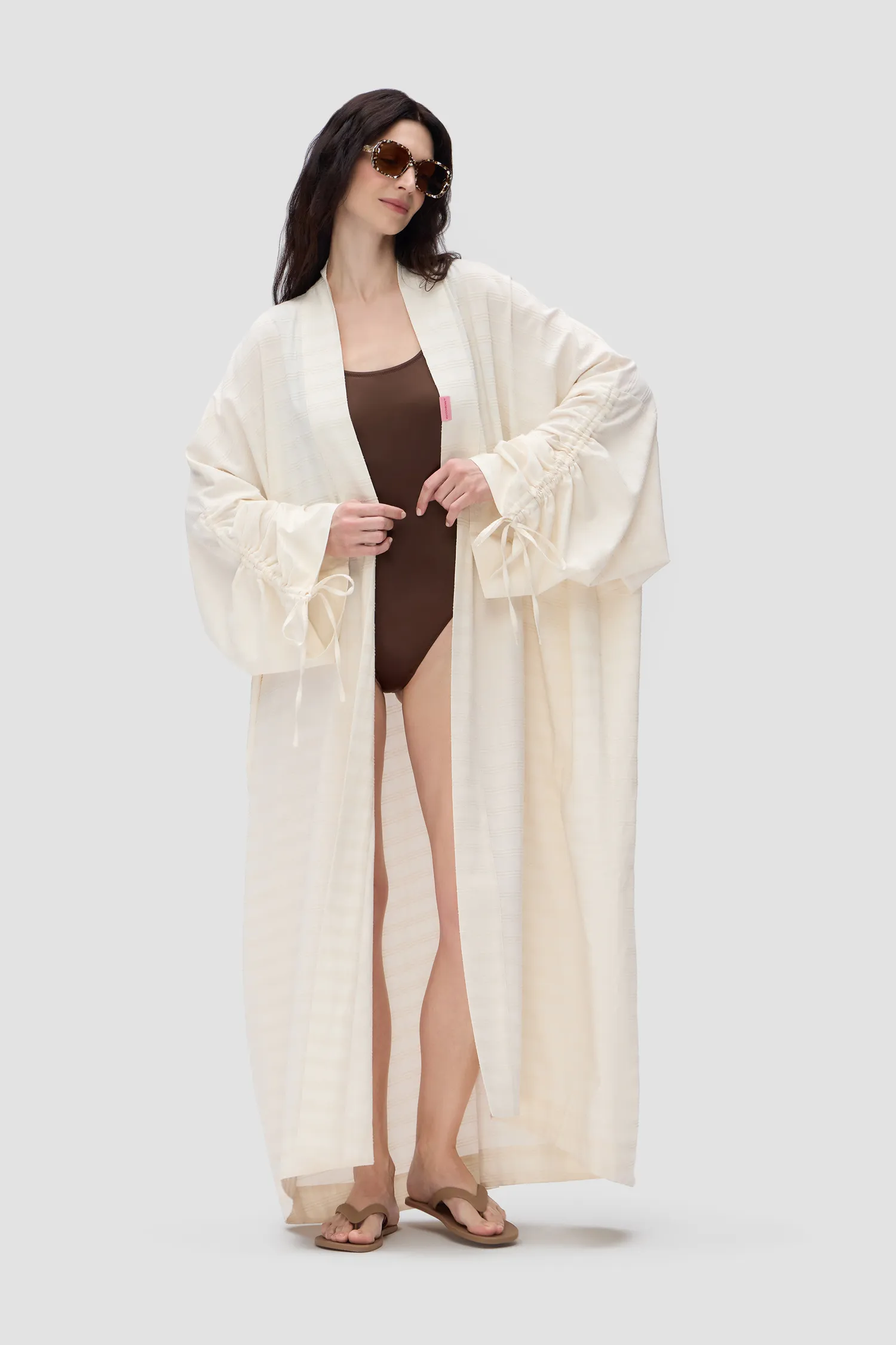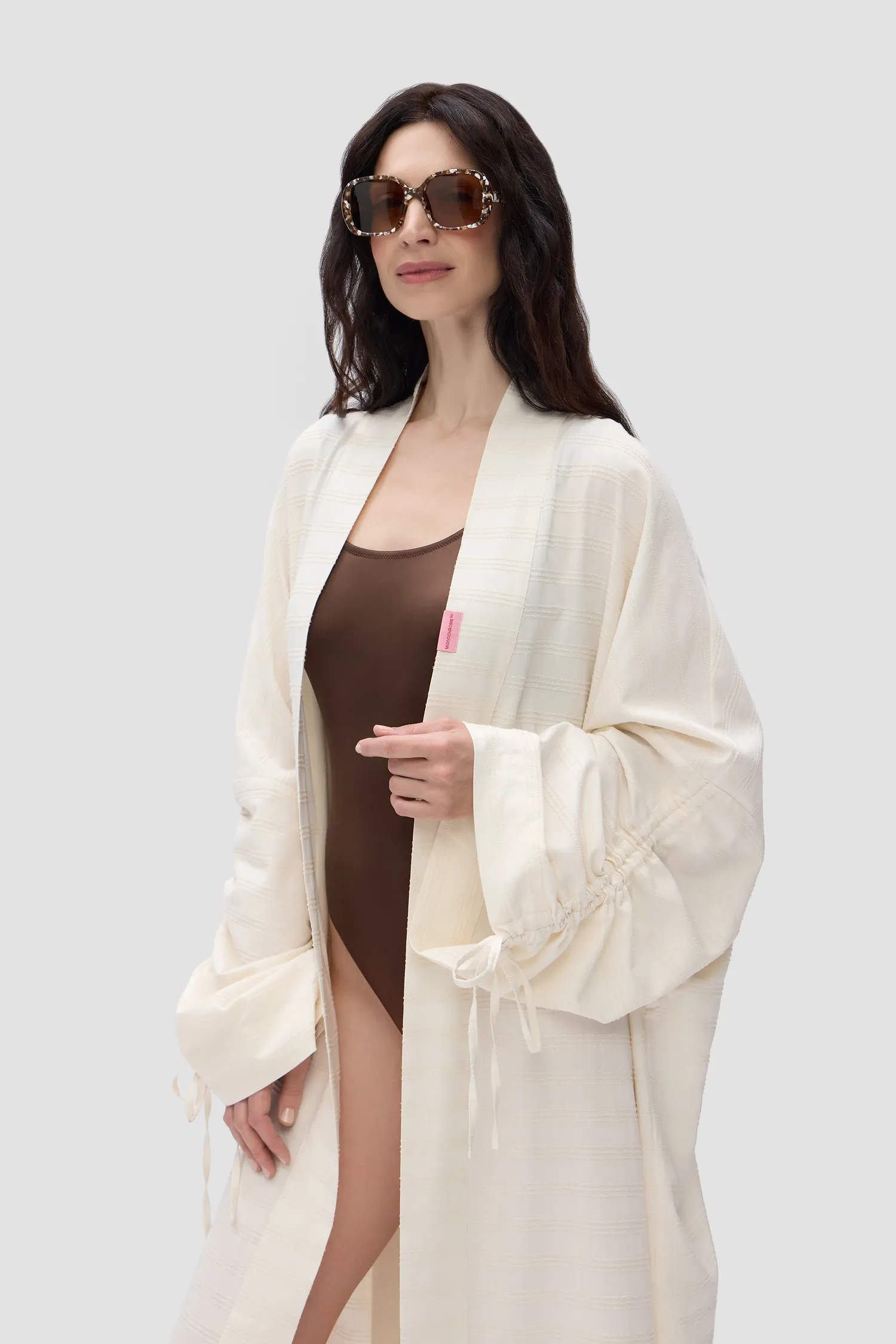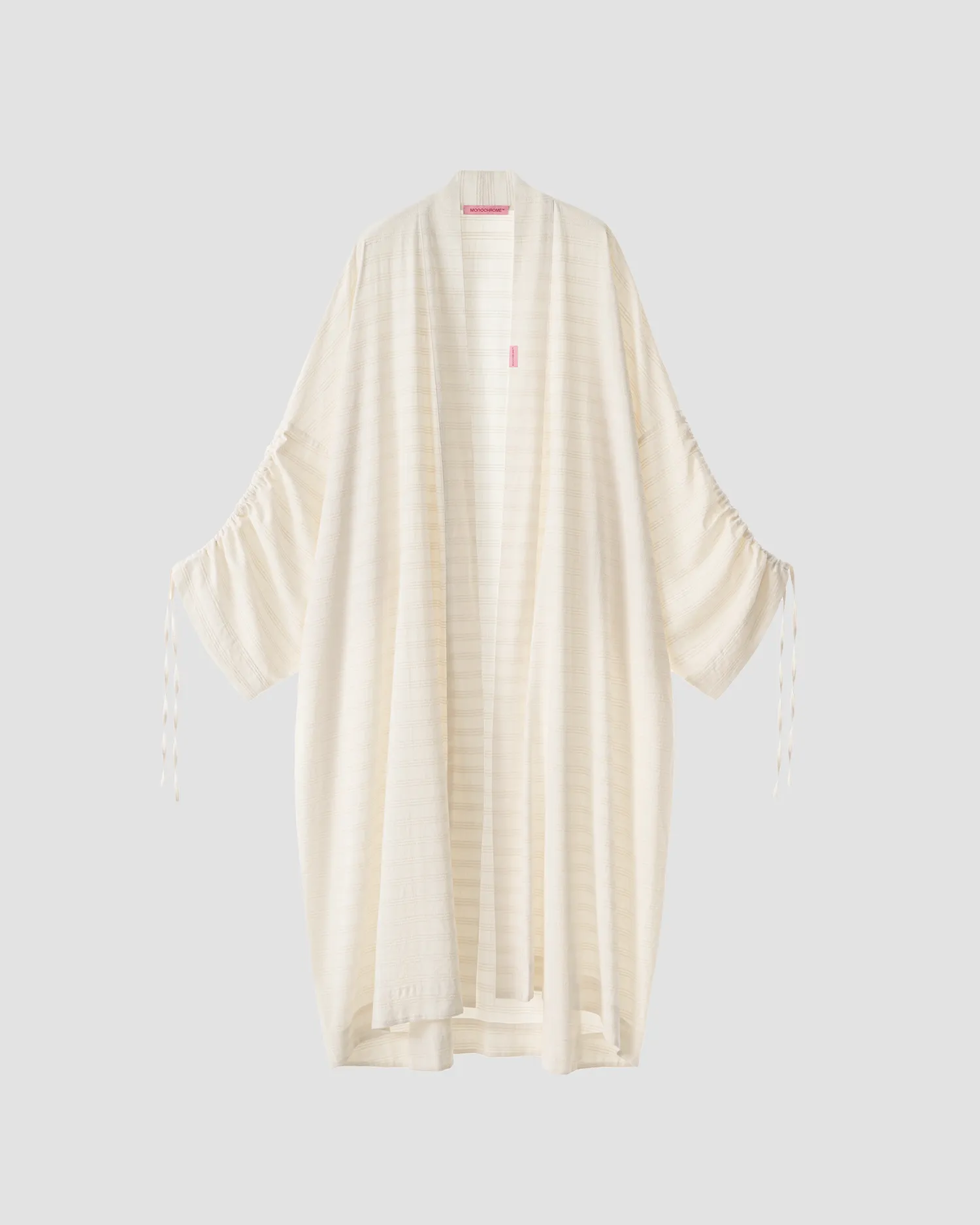 Халат-кимоно из смесового хлопка с широкими рукавами из коллекции RESORT. Легкая дышащая ткань. Рукава на завязках, с помощью которых, можно регулировать длину. В комплект входит длинный пояс. Жаккардовый флажок розового цвета. Onesize&Unisex. Упаковка в подарочную коробку.