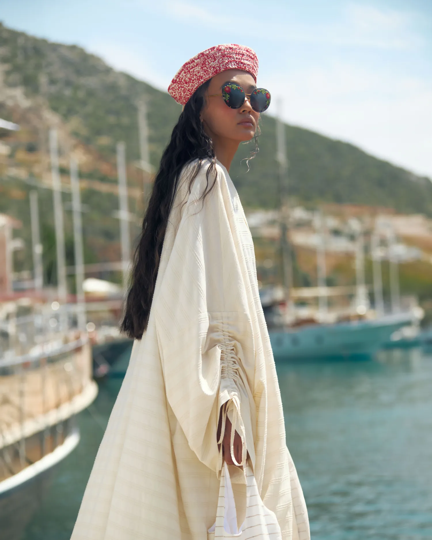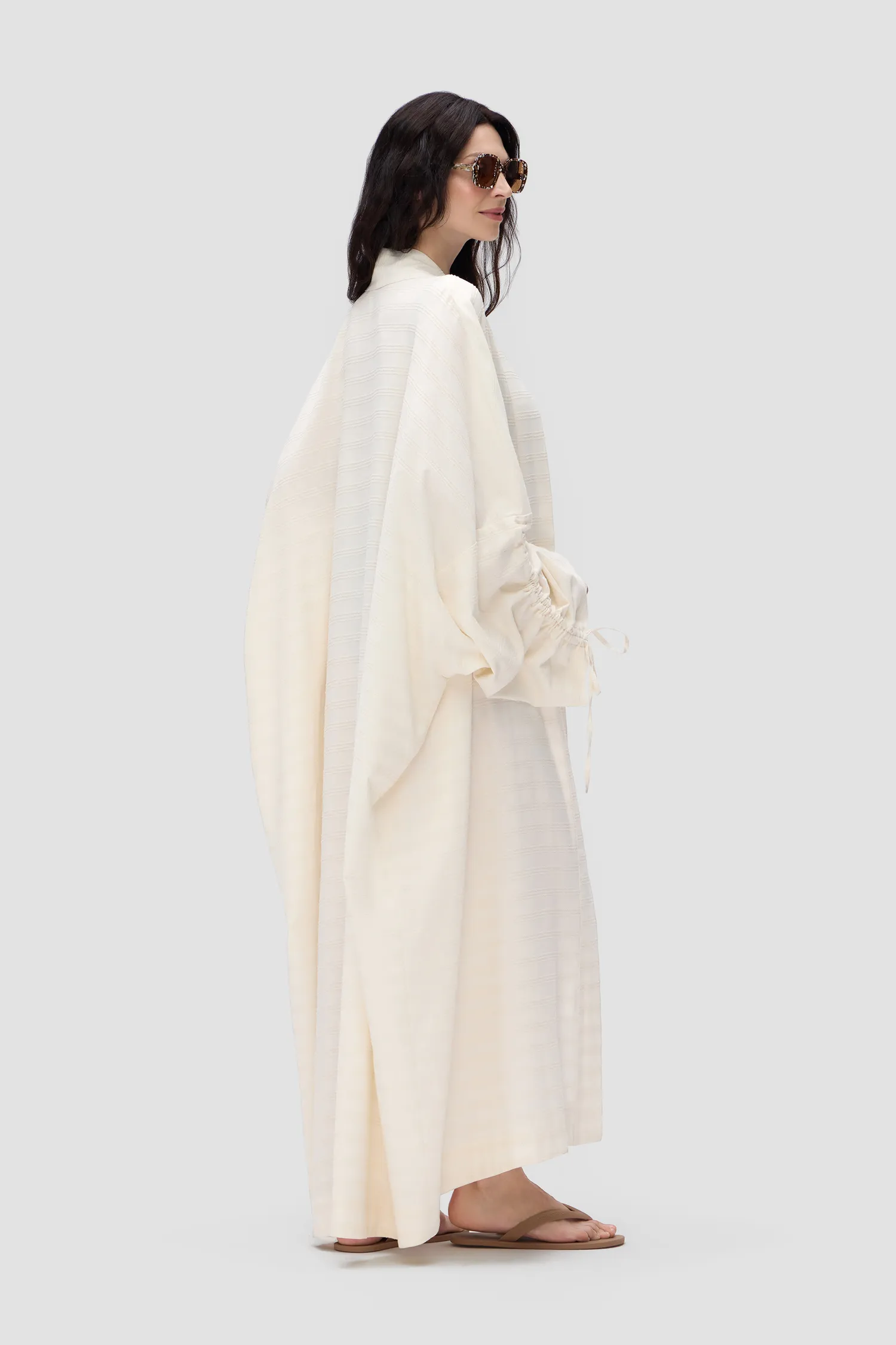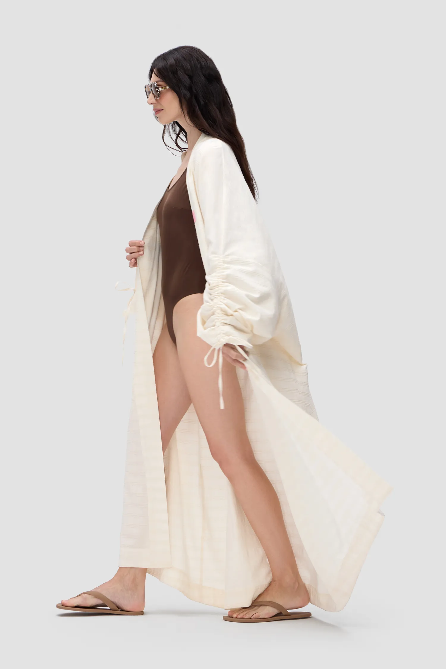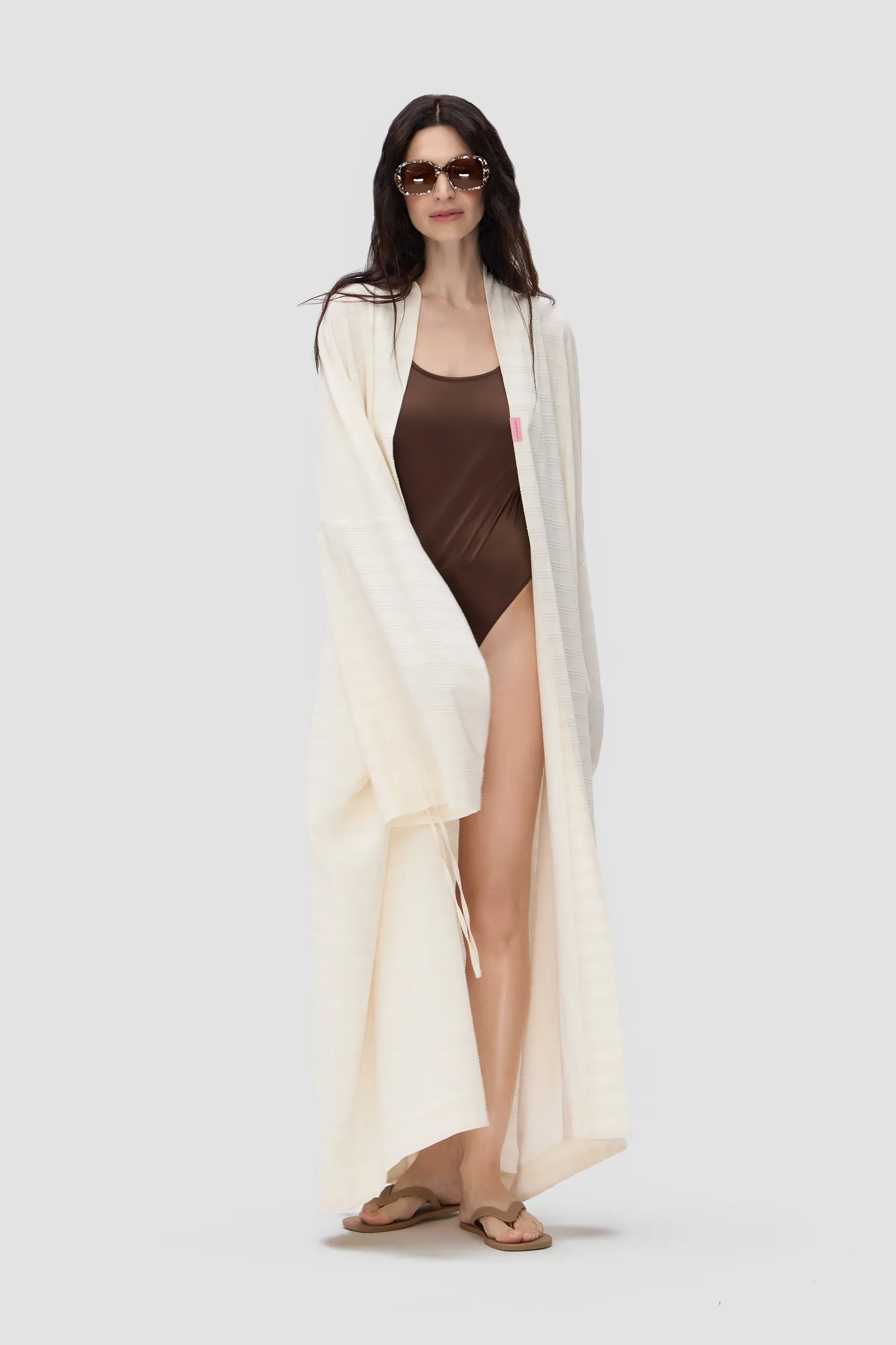 Халат-кимоно из смесового хлопка с широкими рукавами из коллекции RESORT. Легкая дышащая ткань. Рукава на завязках, с помощью которых, можно регулировать длину. В комплект входит длинный пояс. Жаккардовый флажок розового цвета. Onesize&Unisex. Упаковка в подарочную коробку.