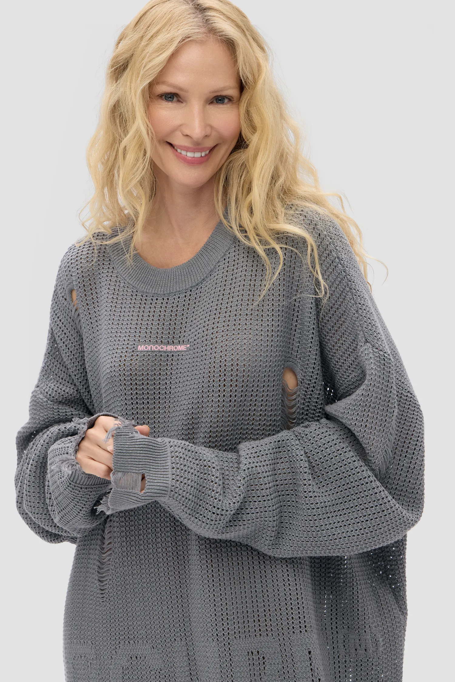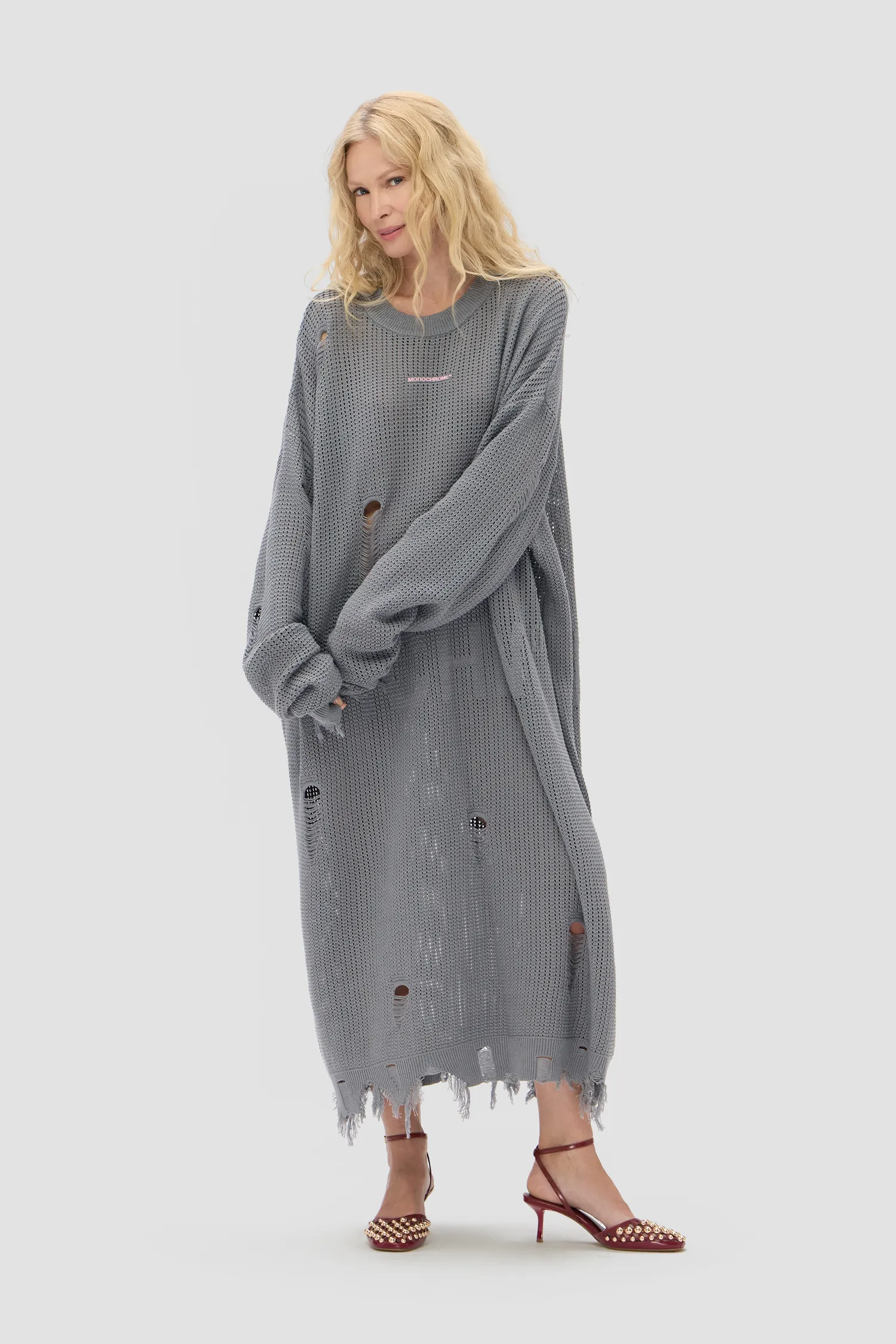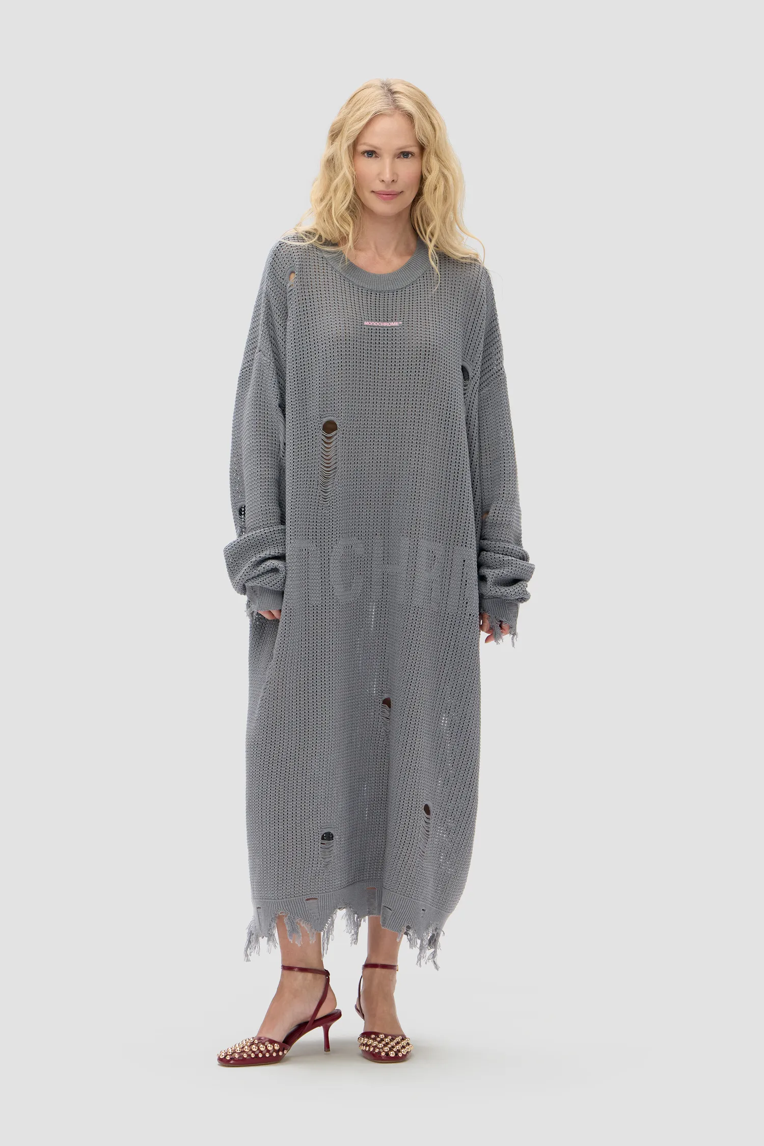 Oversized платье с изящным вязальным узором и фирменной айдентикой MNCHRM™. О-образный вырез. Onesize. Рельефный логотип MONOCHROME на груди. Упаковка в подарочную коробку.