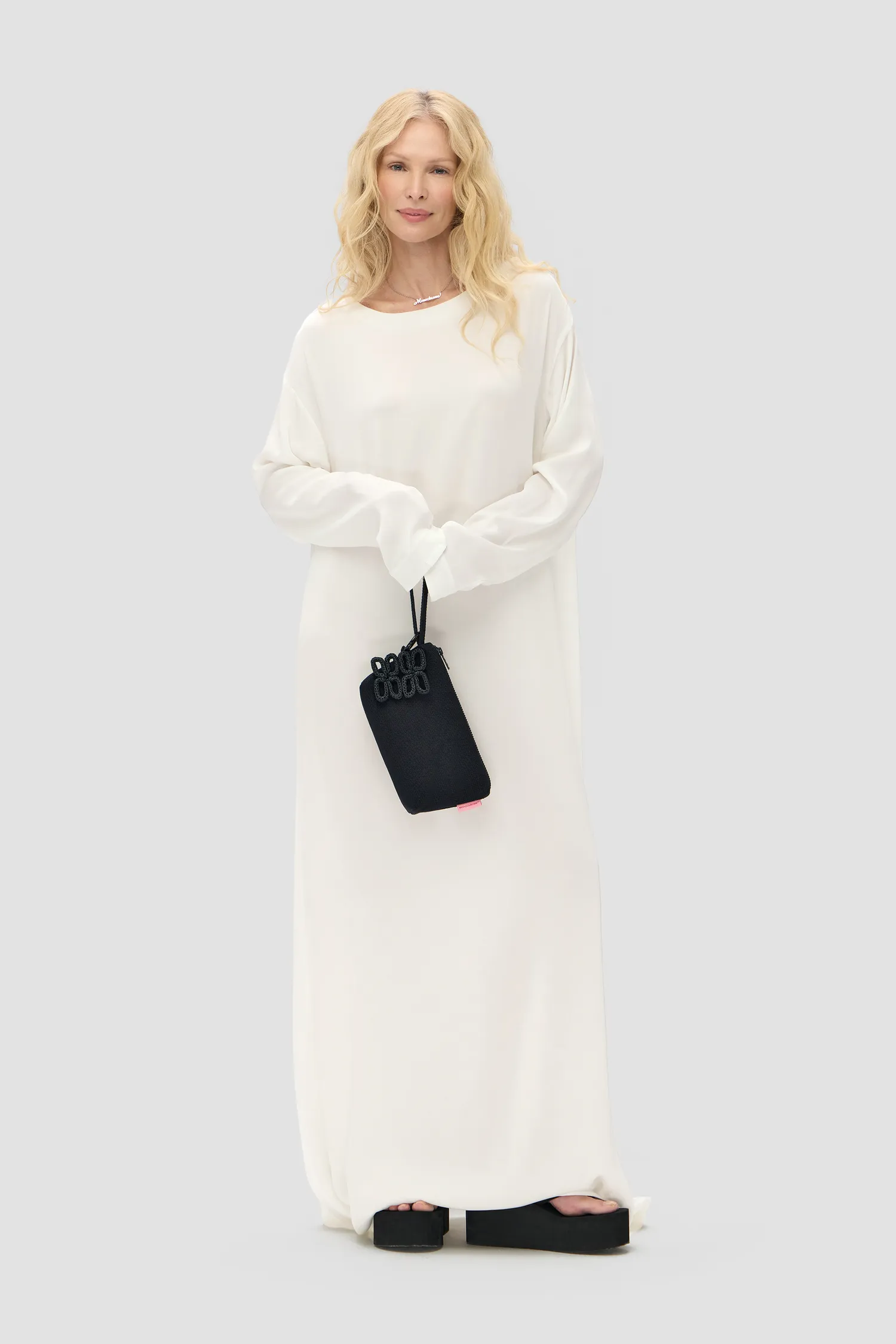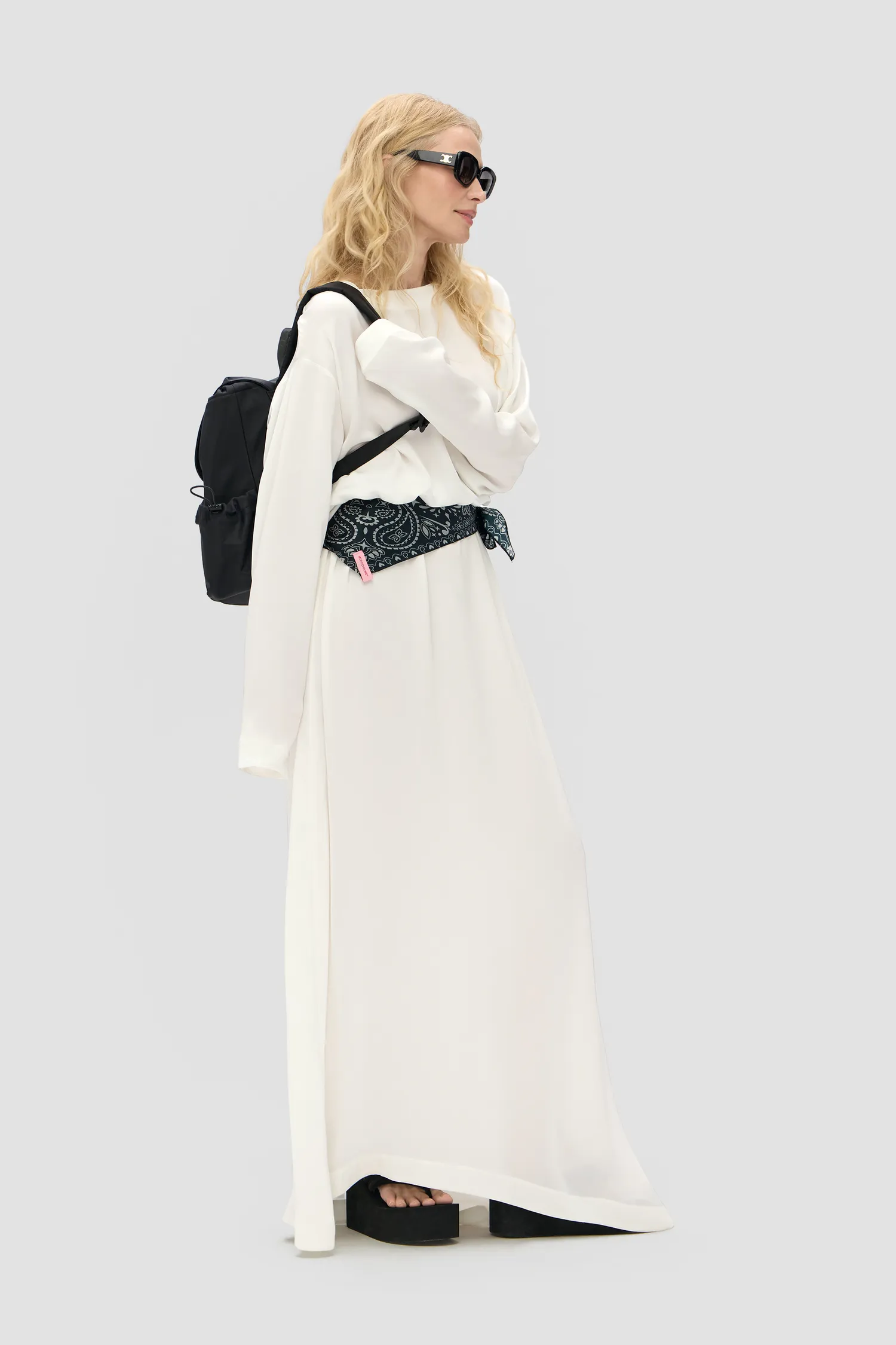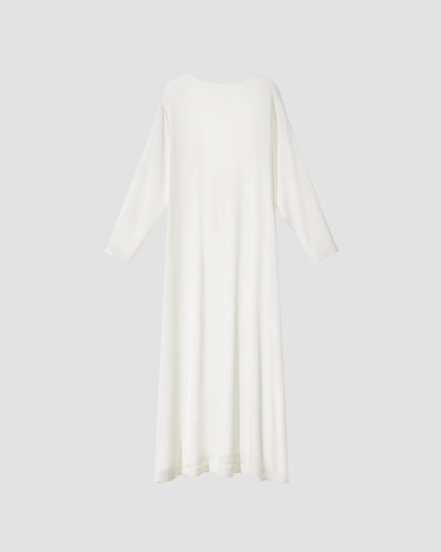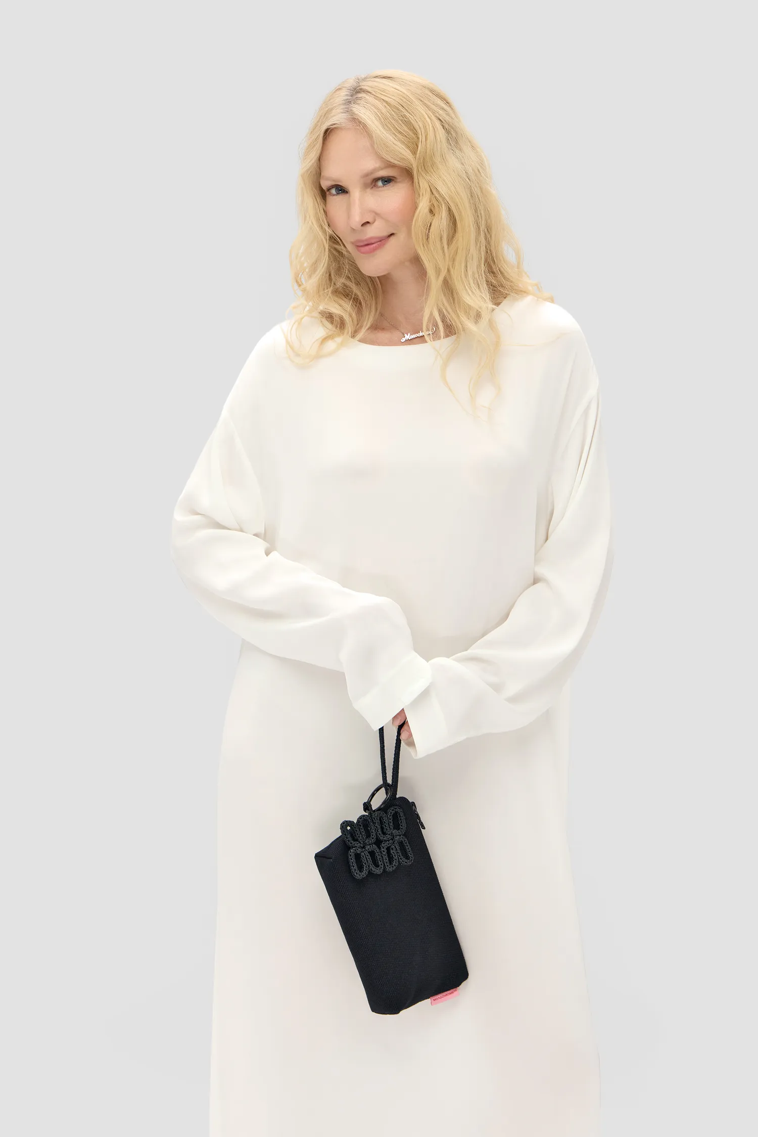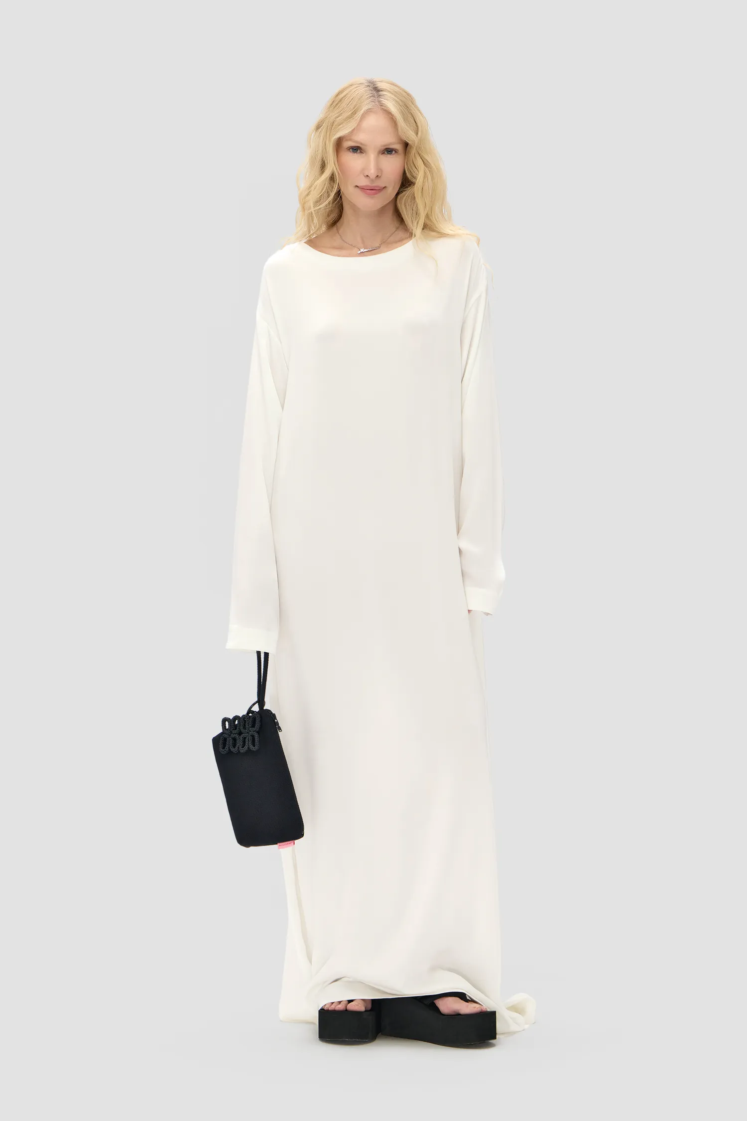 Платье из смеси вискозы и шелка. Вырез на спине, дополненный завязками. Свободный крой и универсальная длина, которую можно скорректировать под любой рост. Флажок на рукаве. Упаковка в подарочную коробку.