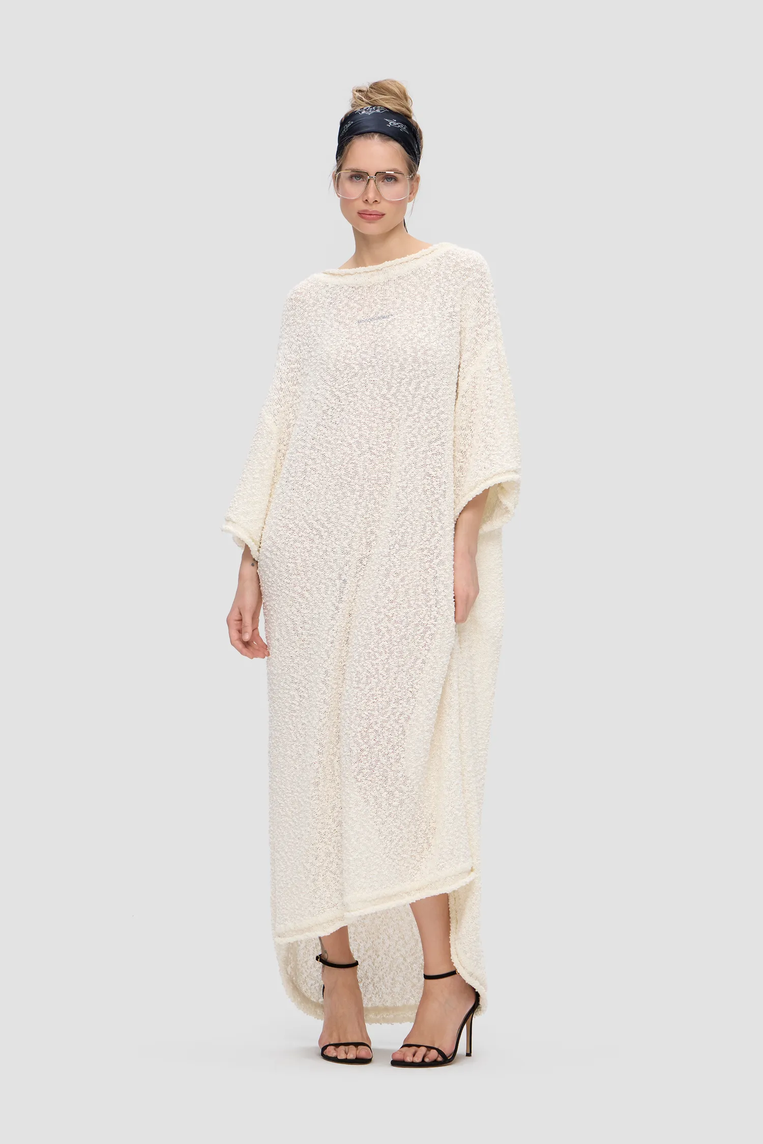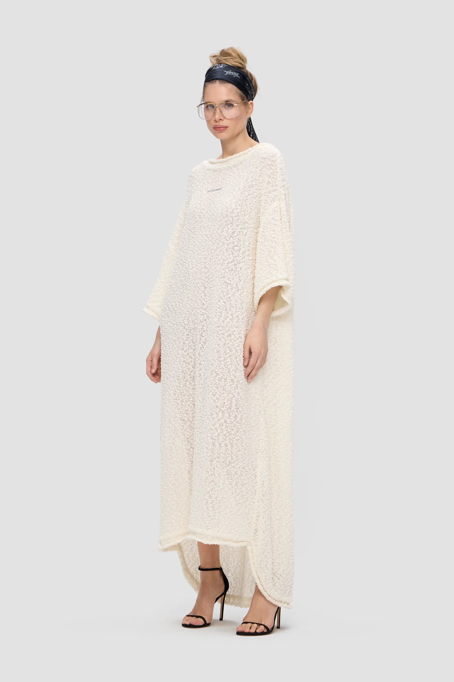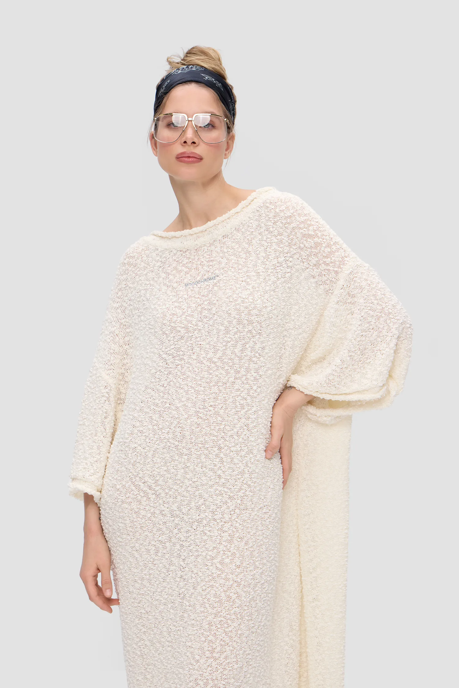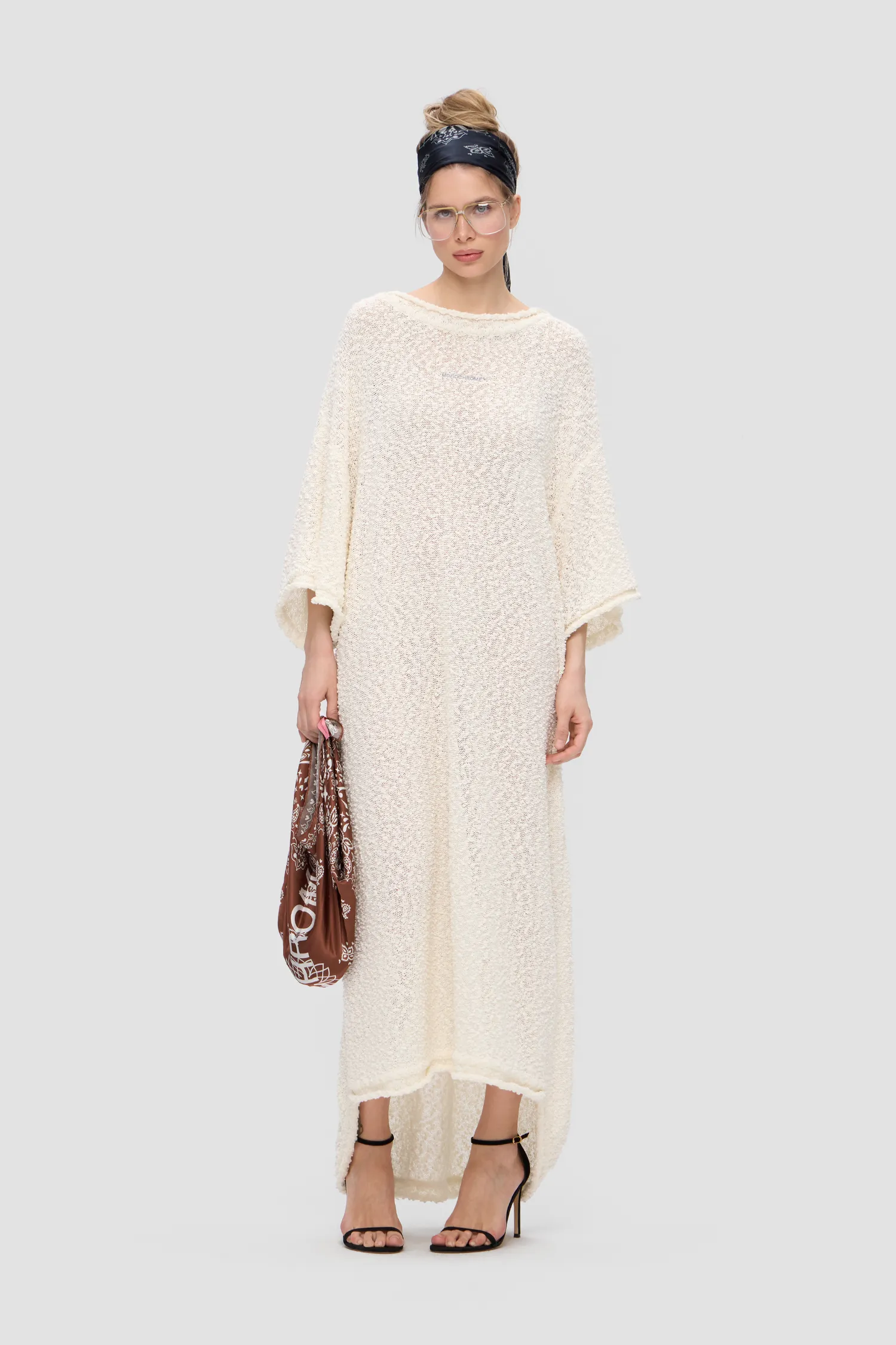 Oversized платье фактурной вязки молочного цвета. О-образный вырез спереди и V-образный вырез на спинке. Платье из тонкой махровой пряжи. Объемные рукава. Рельефный логотип MONOCHROME на груди белого цвета. Рекомендуем горизонтальное хранение. Упаковка в подарочную коробку.