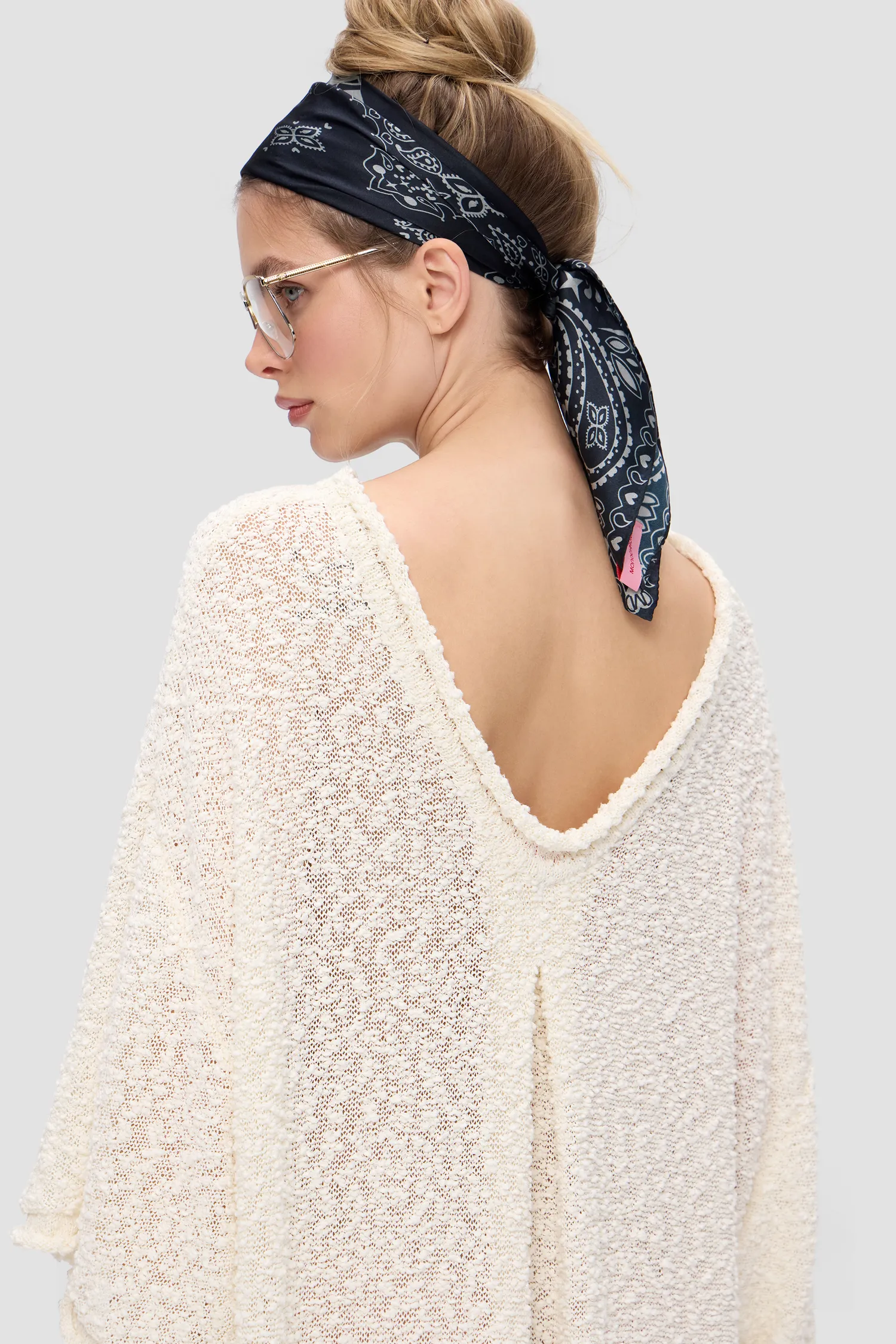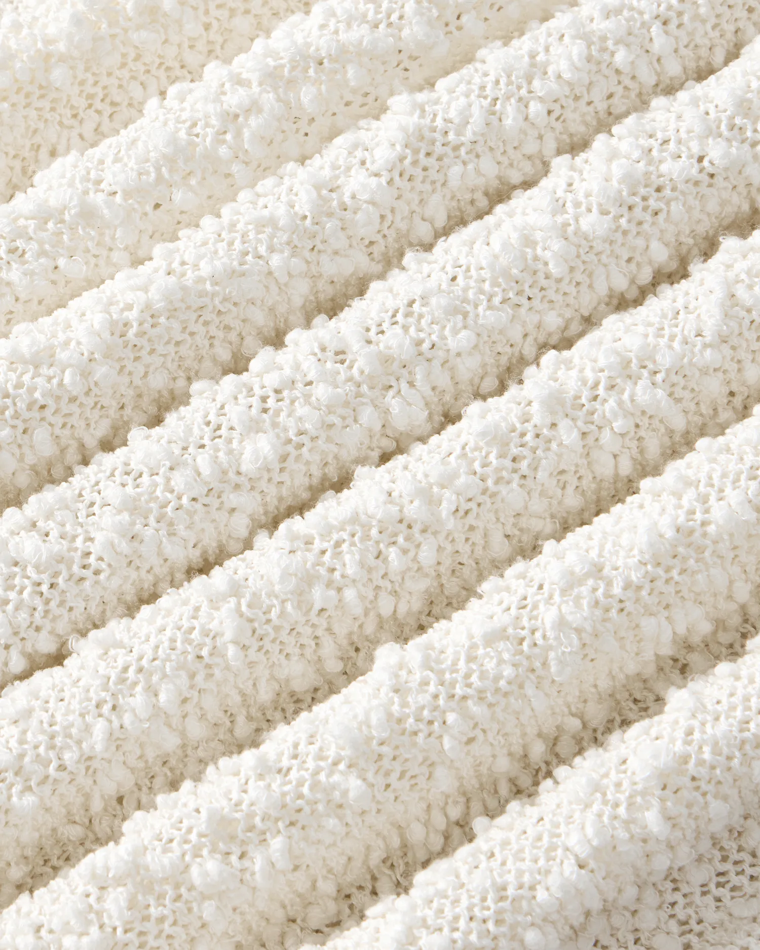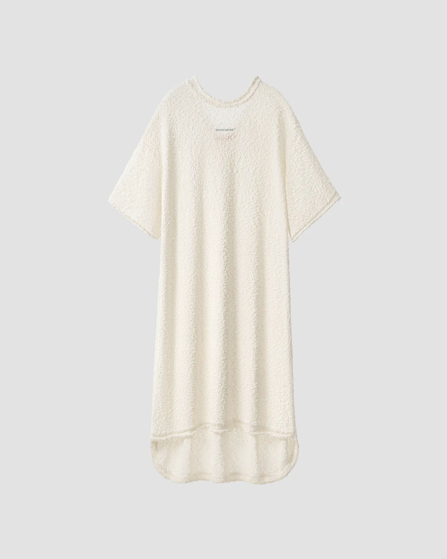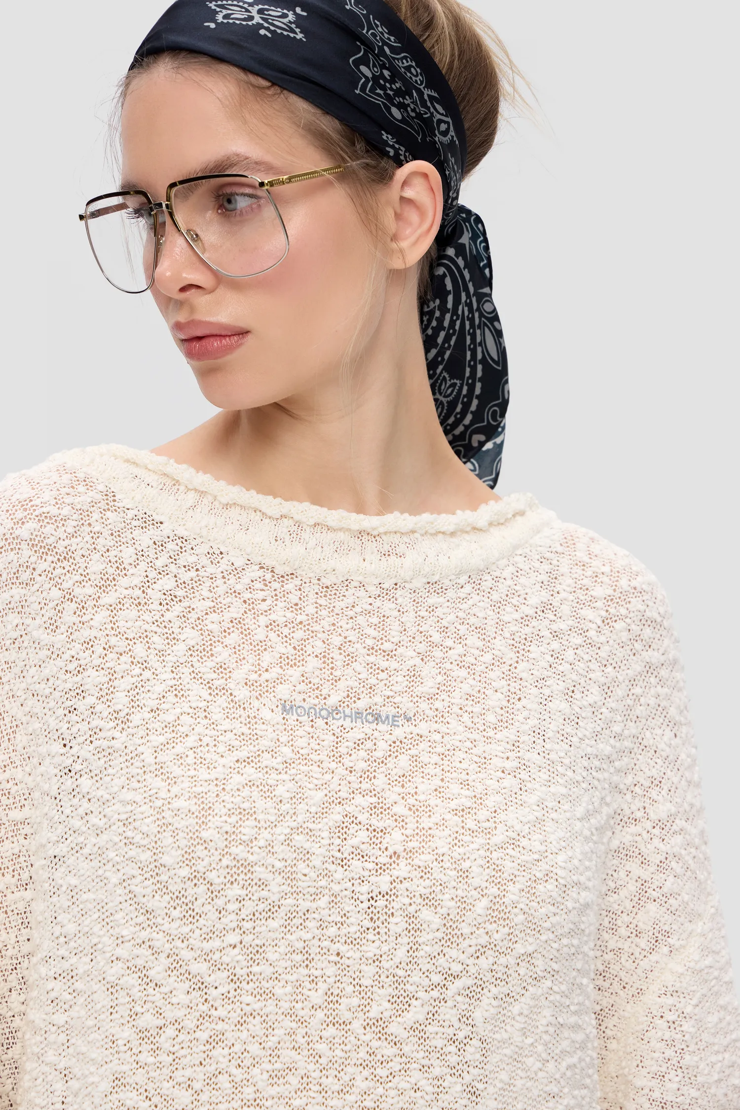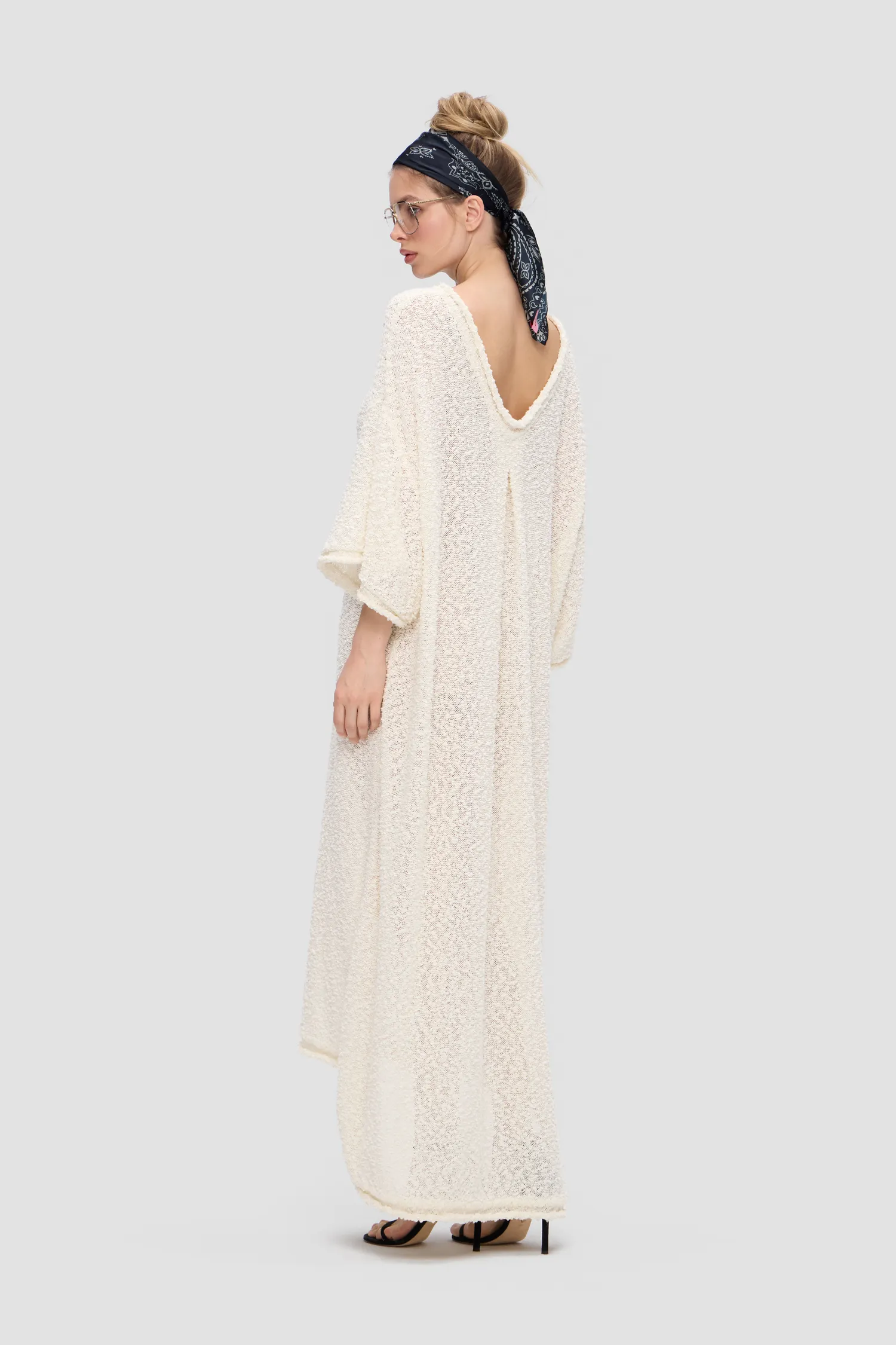 Oversized платье фактурной вязки молочного цвета. О-образный вырез спереди и V-образный вырез на спинке. Платье из тонкой махровой пряжи. Объемные рукава. Рельефный логотип MONOCHROME на груди белого цвета. Рекомендуем горизонтальное хранение. Упаковка в подарочную коробку.
