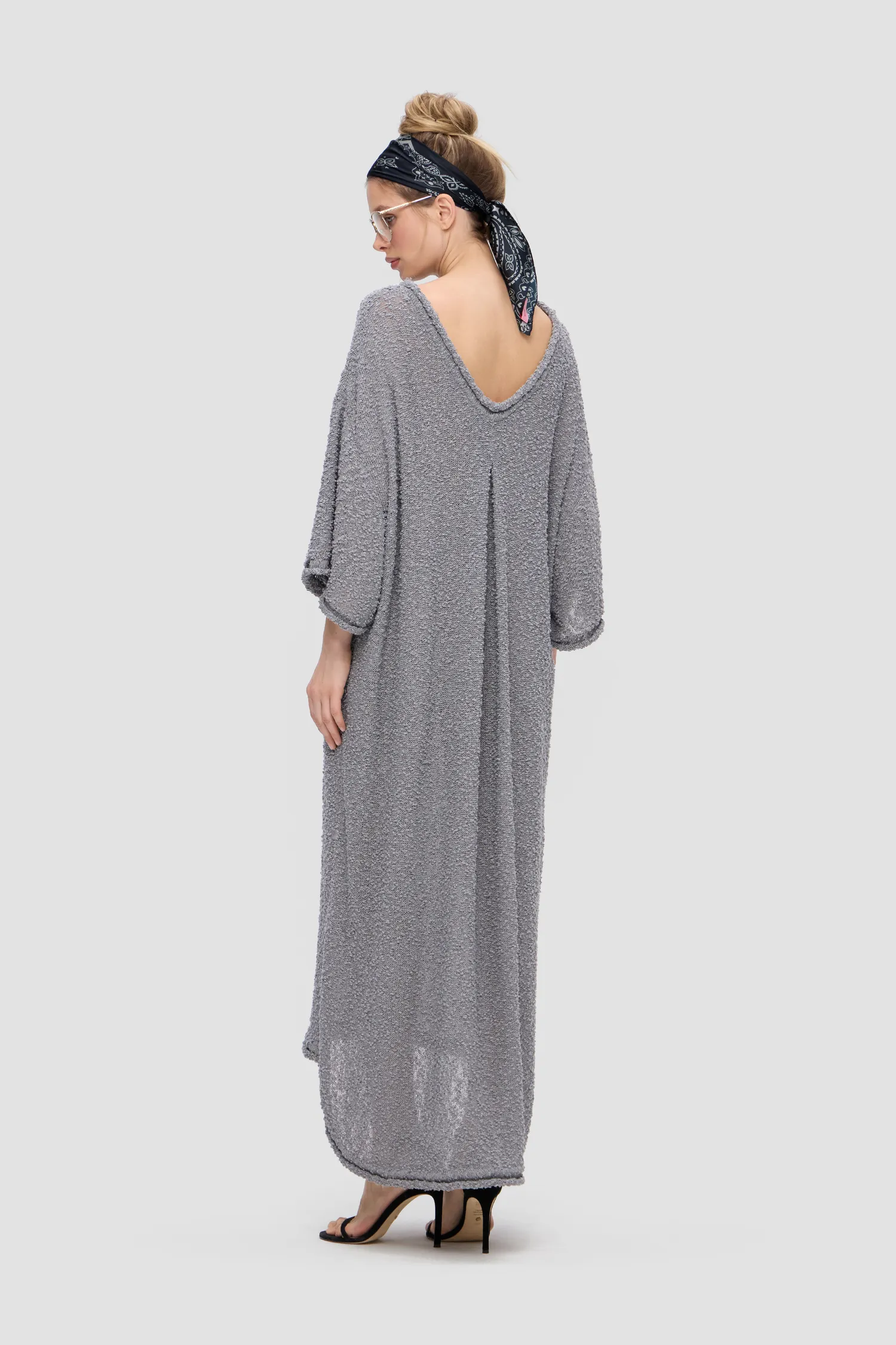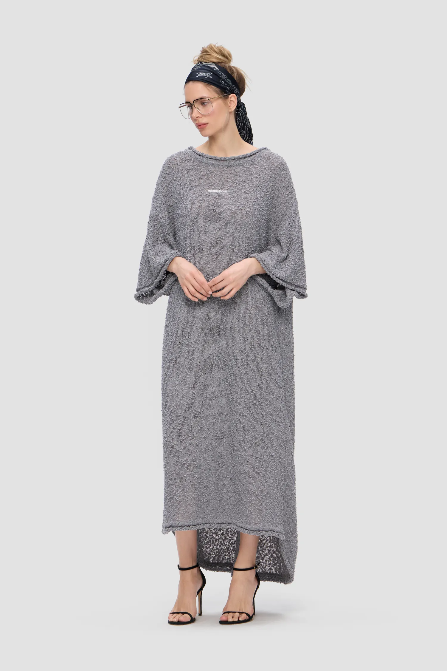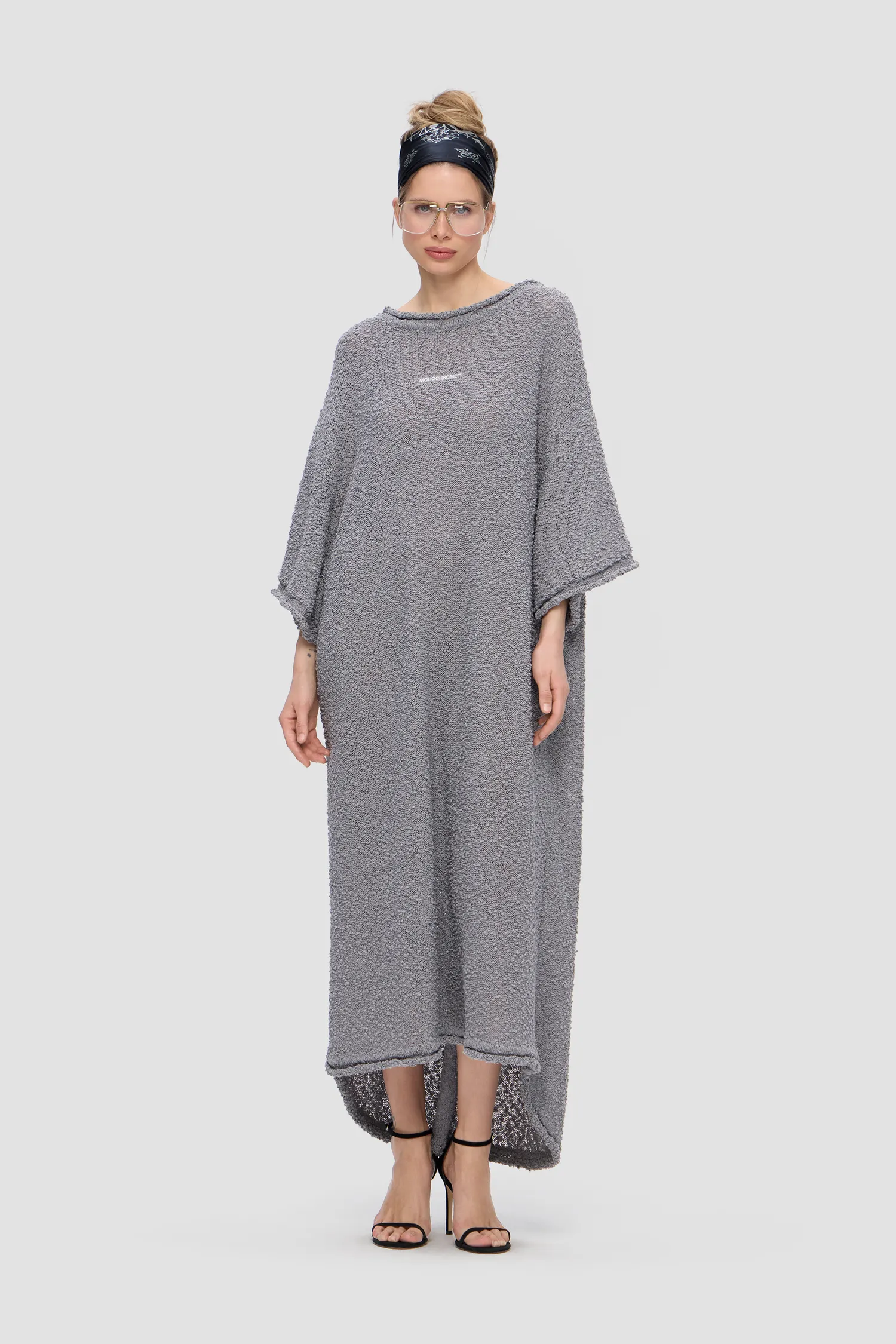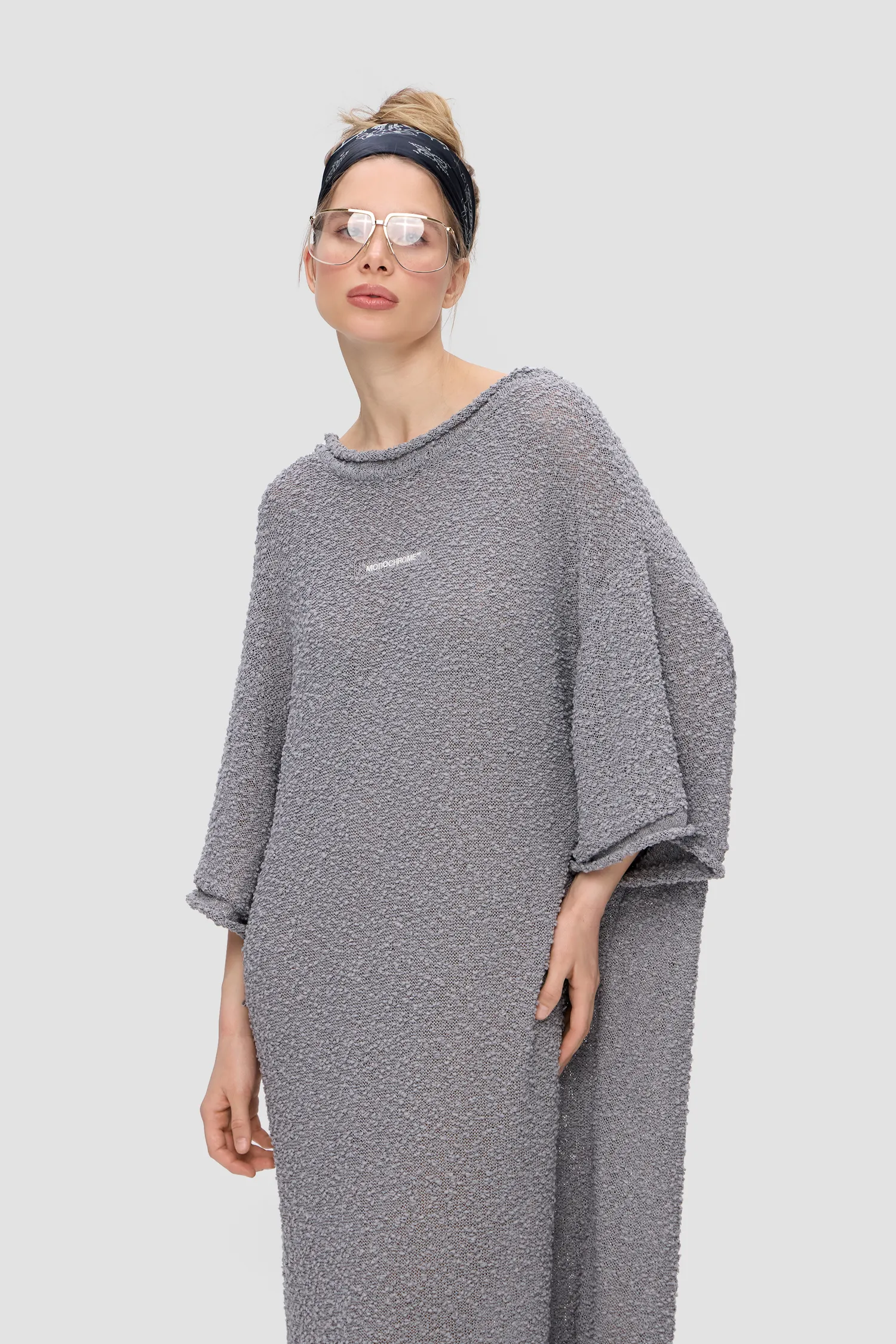 Oversized платье фактурной вязки серого цвета. О-образный вырез спереди и V-образный вырез на спинке. Платье из тонкой махровой пряжи. Объемные рукава. Рельефный логотип MONOCHROME на груди белого цвета. Рекомендуем горизонтальное хранение. Упаковка в подарочную коробку.
