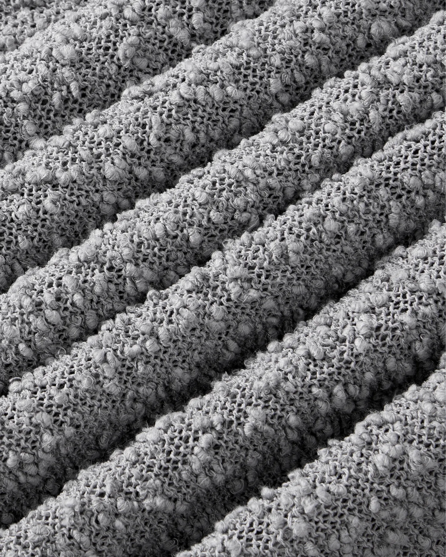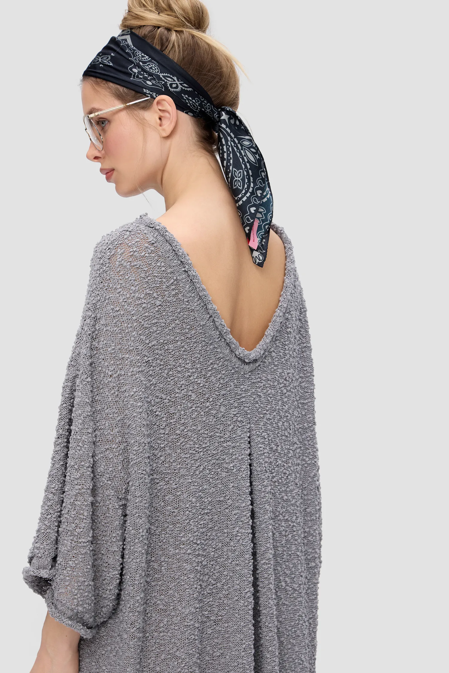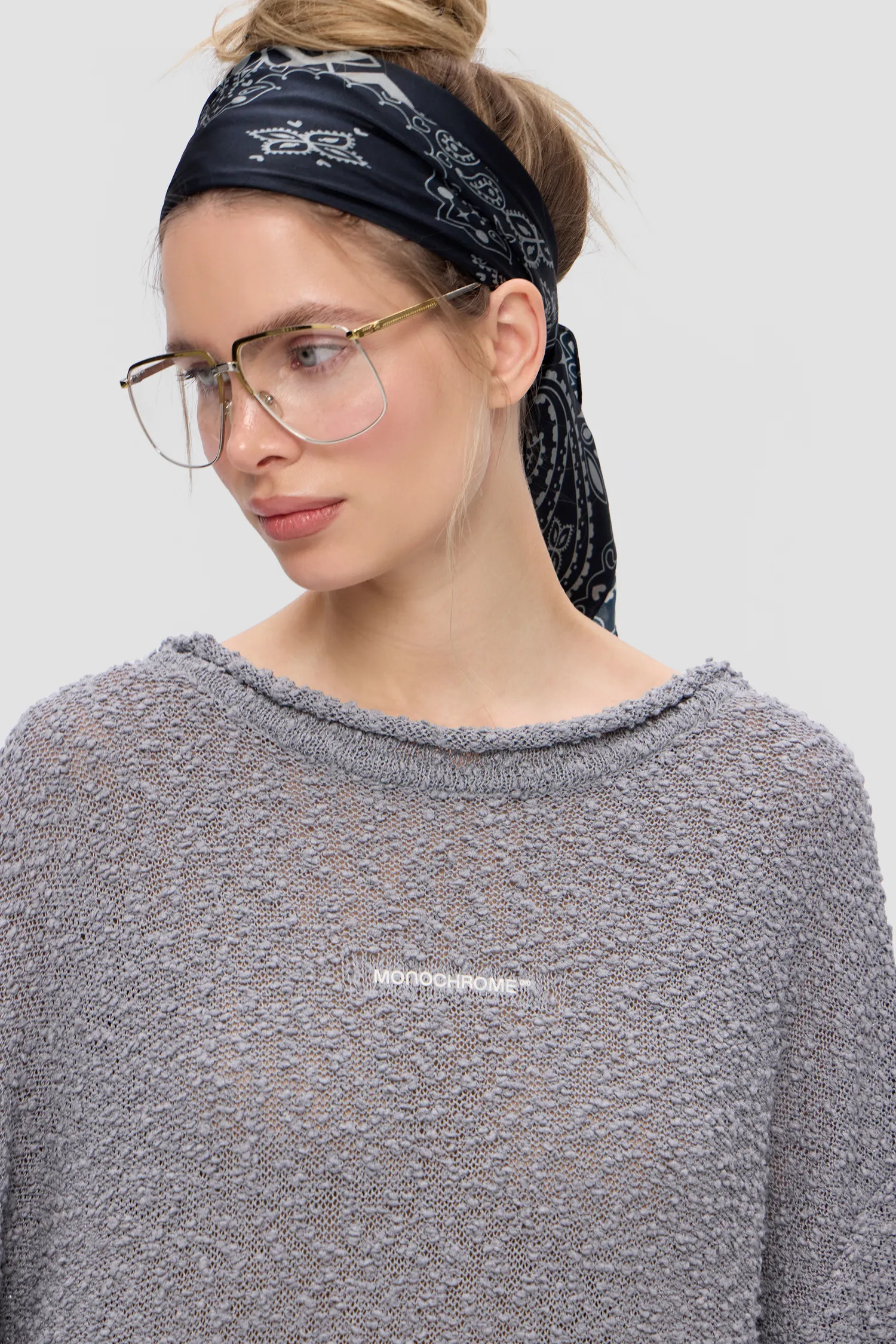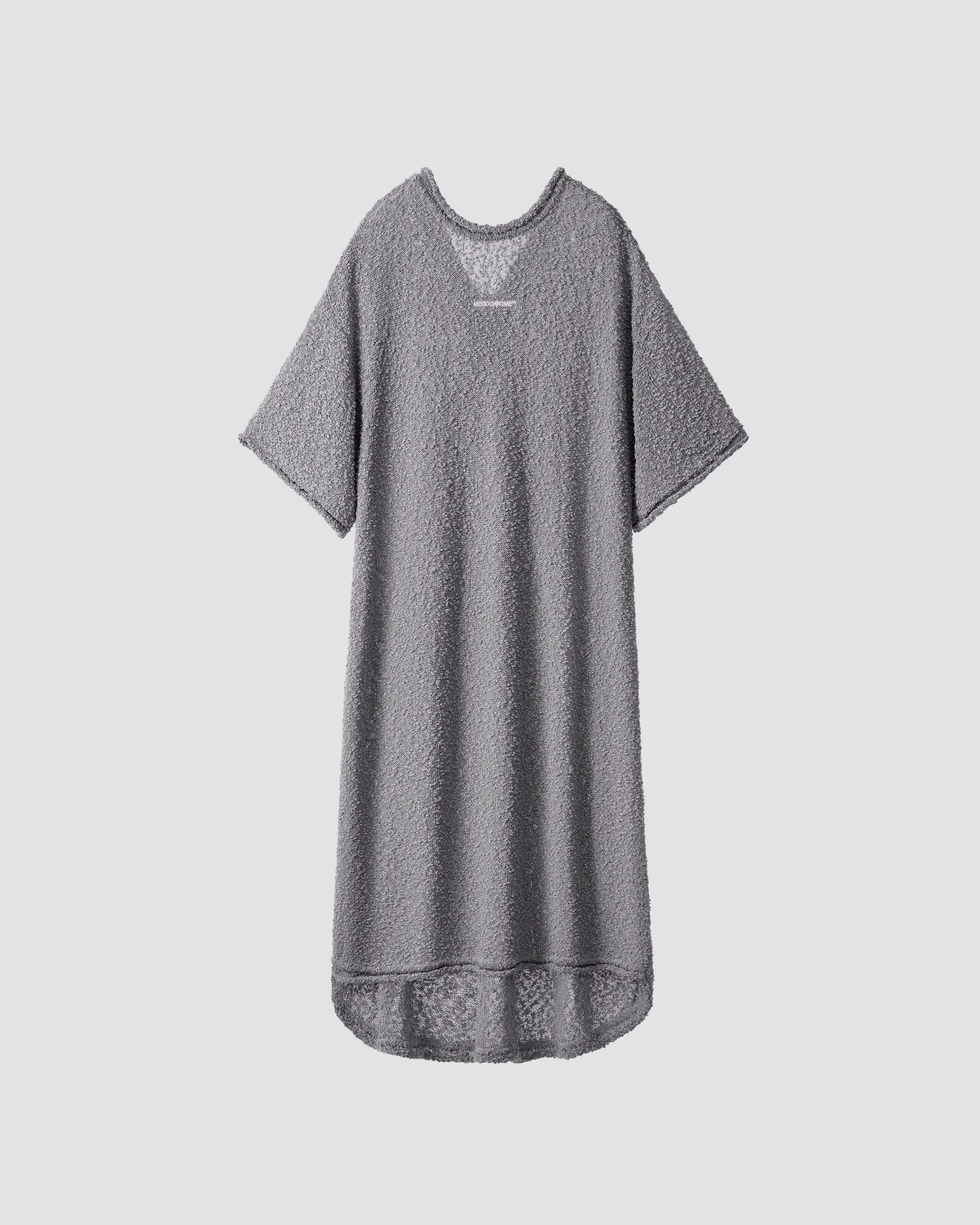 Oversized платье фактурной вязки серого цвета. О-образный вырез спереди и V-образный вырез на спинке. Платье из тонкой махровой пряжи. Объемные рукава. Рельефный логотип MONOCHROME на груди белого цвета. Рекомендуем горизонтальное хранение. Упаковка в подарочную коробку.
