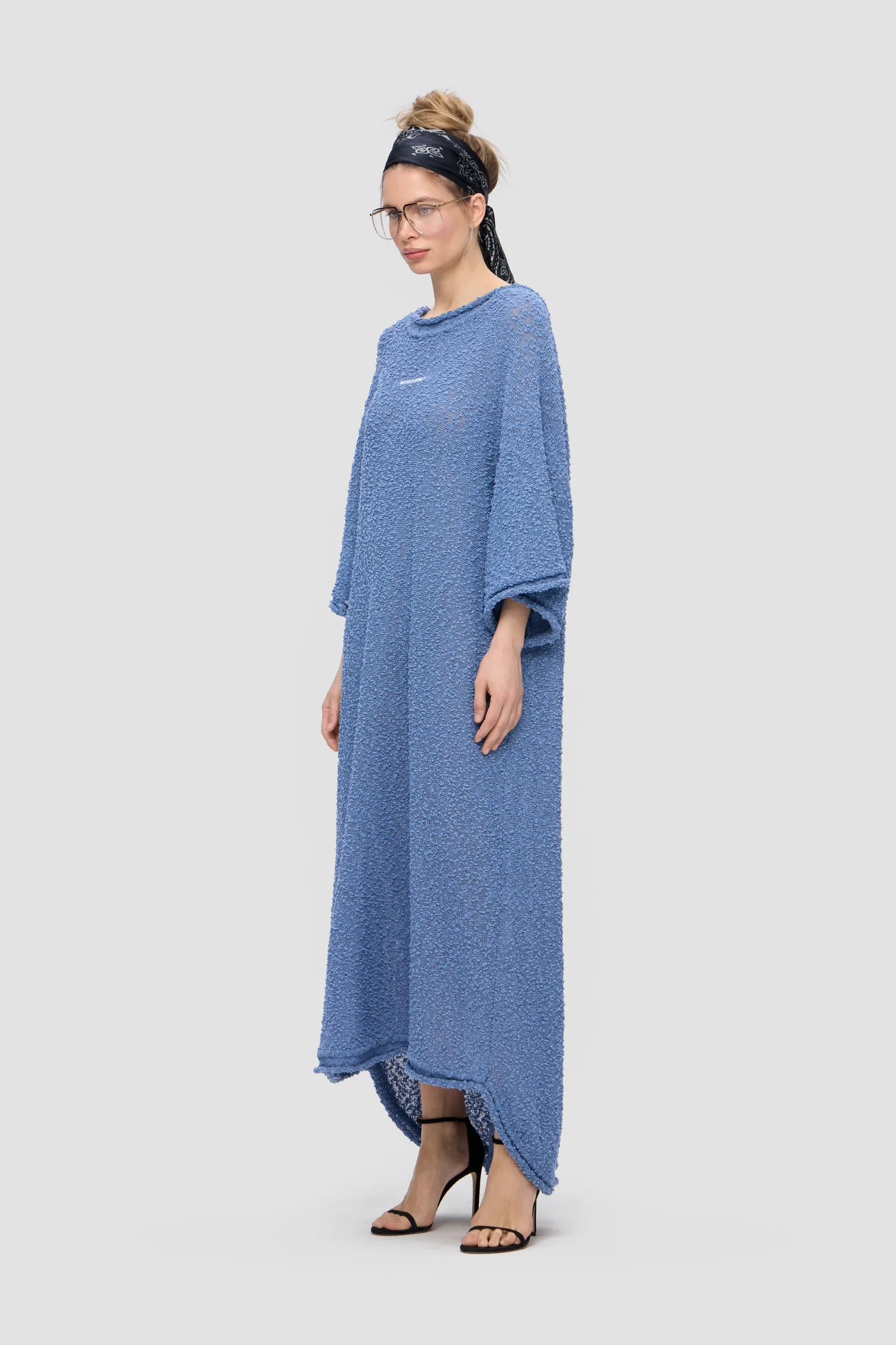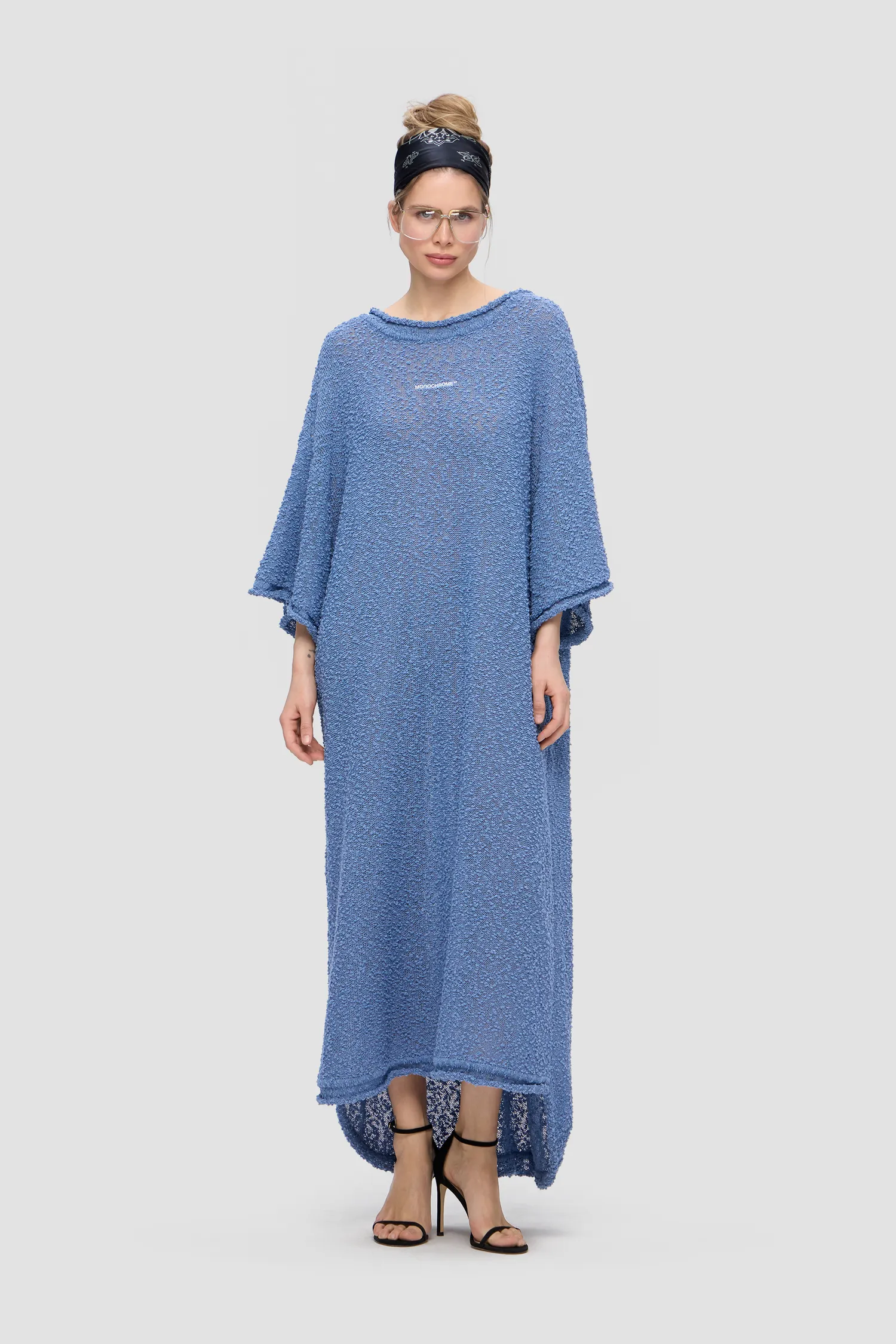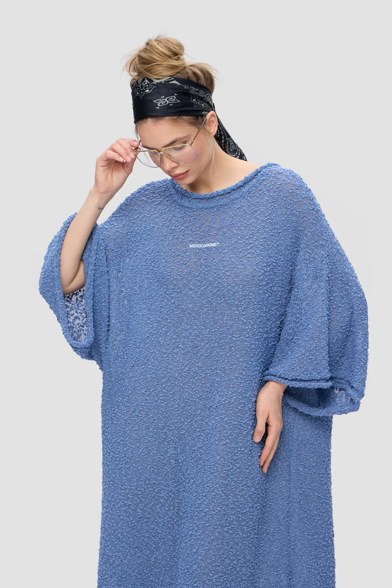 Oversized платье фактурной вязки голубого цвета. О-образный вырез спереди и V-образный вырез на спинке. Платье из тонкой махровой пряжи. Объемные рукава. Рельефный логотип MONOCHROME на груди белого цвета. Рекомендуем горизонтальное хранение. Упаковка в подарочную коробку.