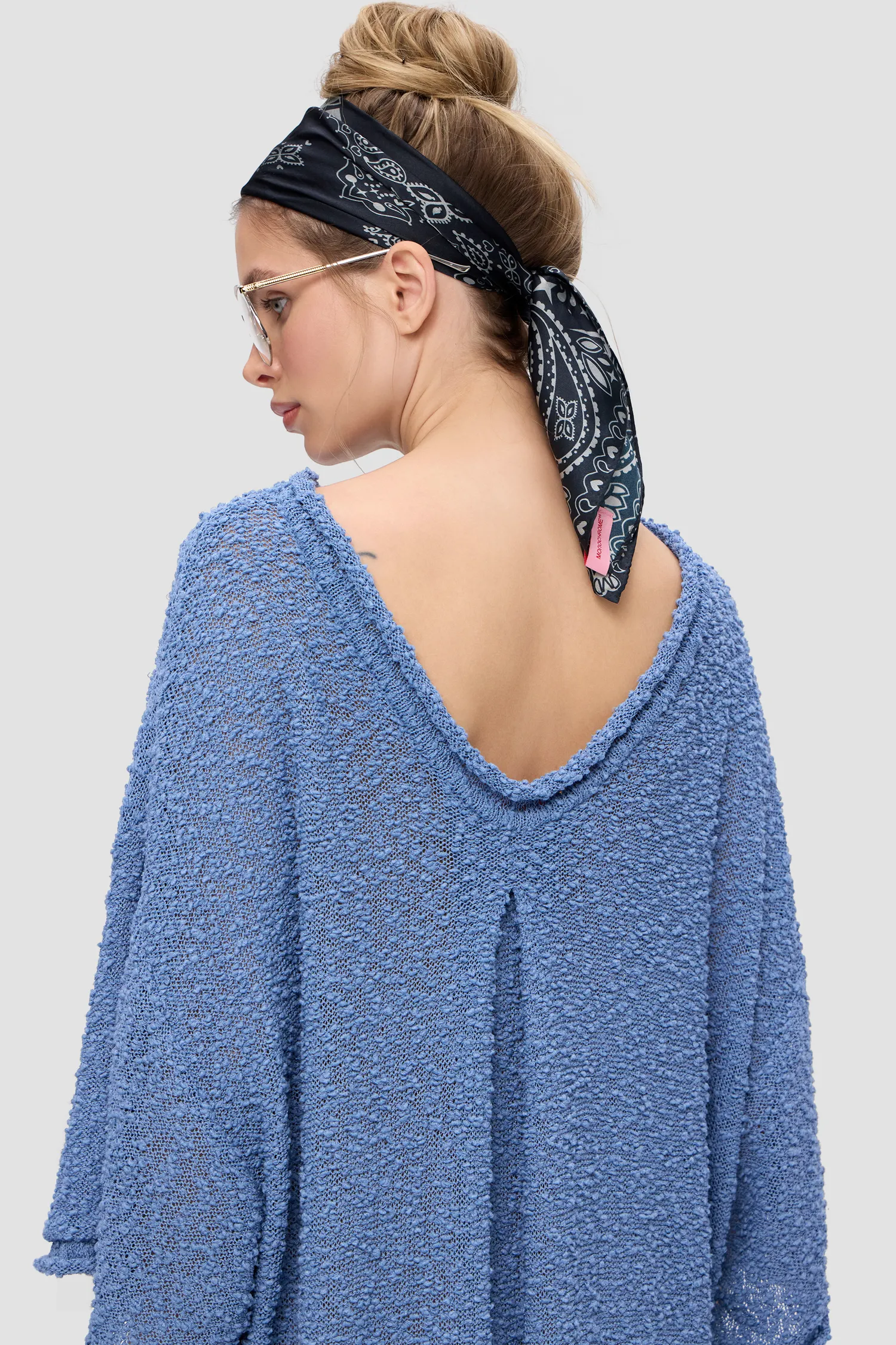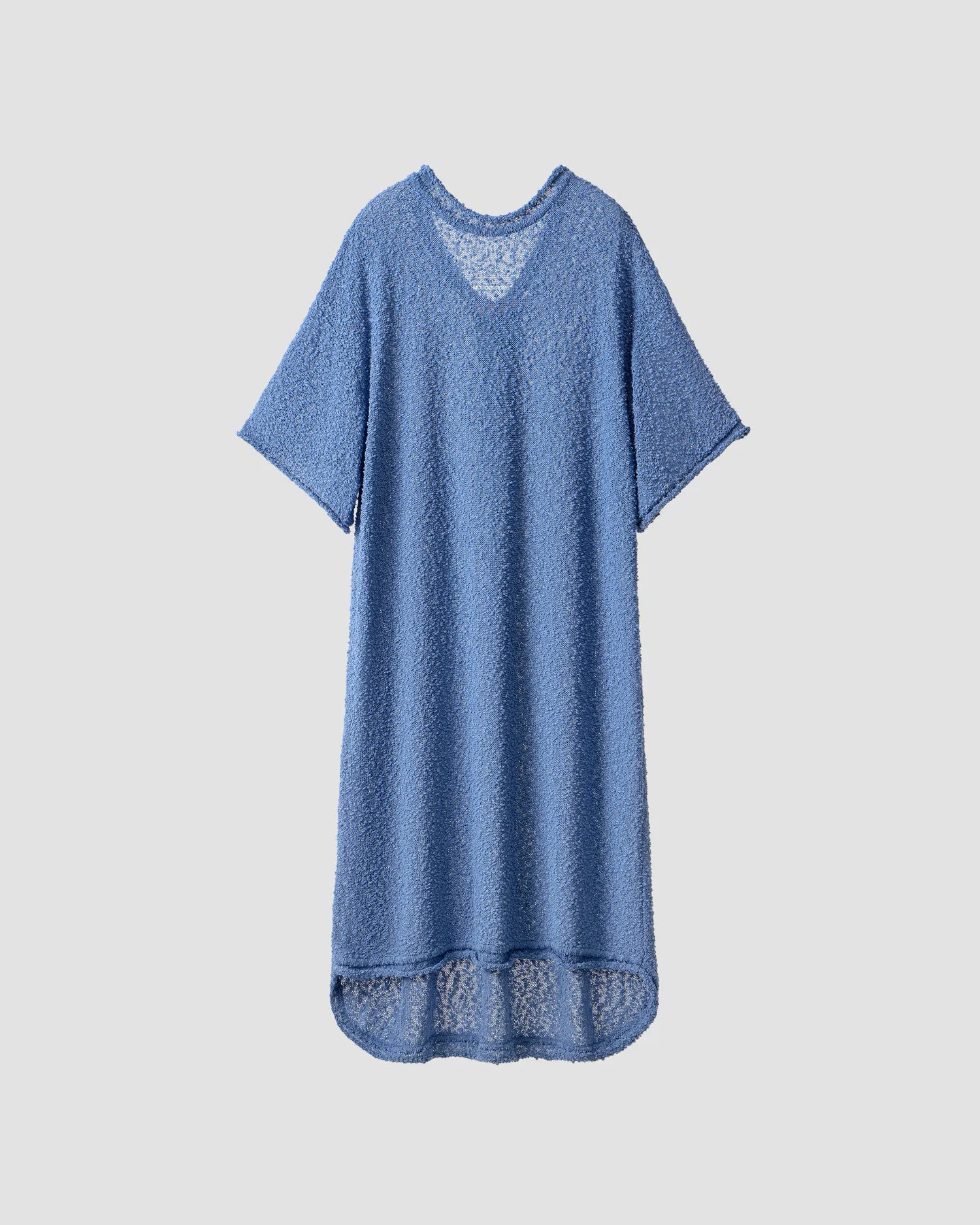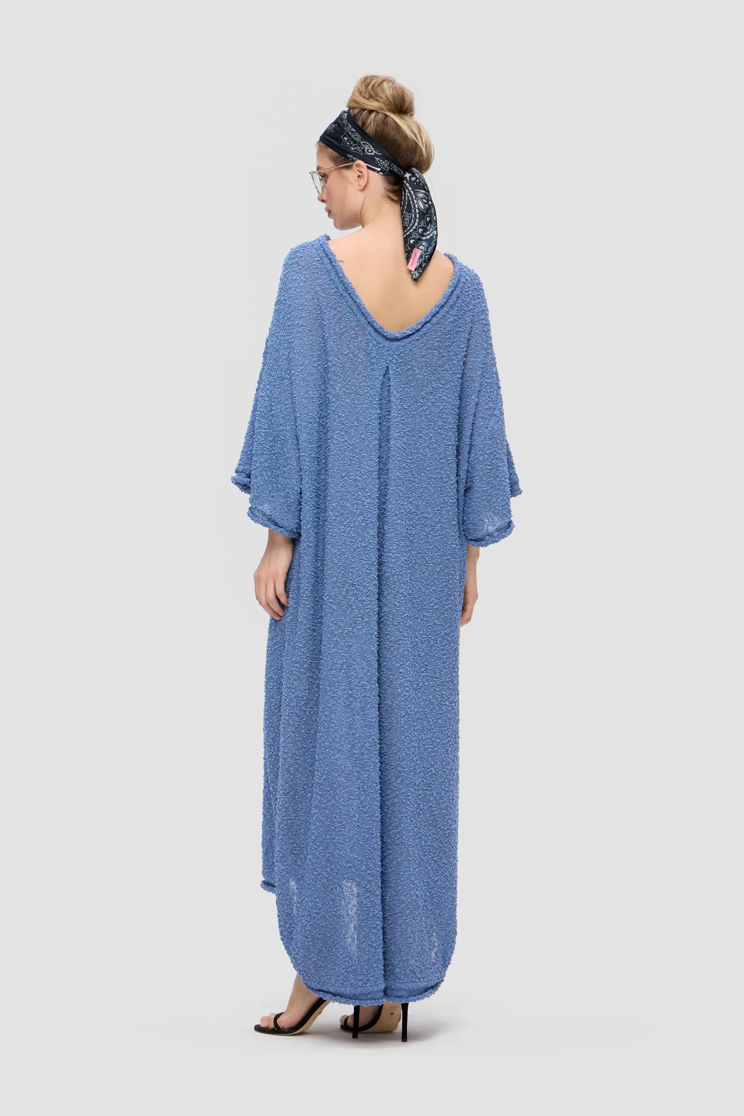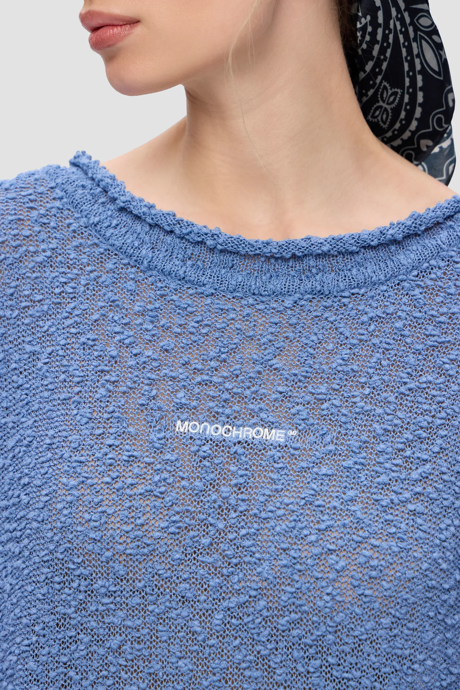 Oversized платье фактурной вязки голубого цвета. О-образный вырез спереди и V-образный вырез на спинке. Платье из тонкой махровой пряжи. Объемные рукава. Рельефный логотип MONOCHROME на груди белого цвета. Рекомендуем горизонтальное хранение. Упаковка в подарочную коробку.