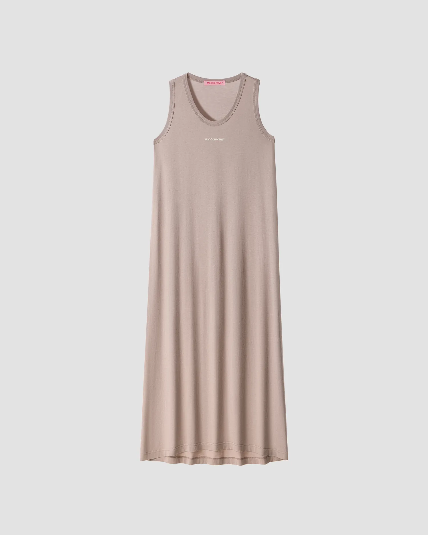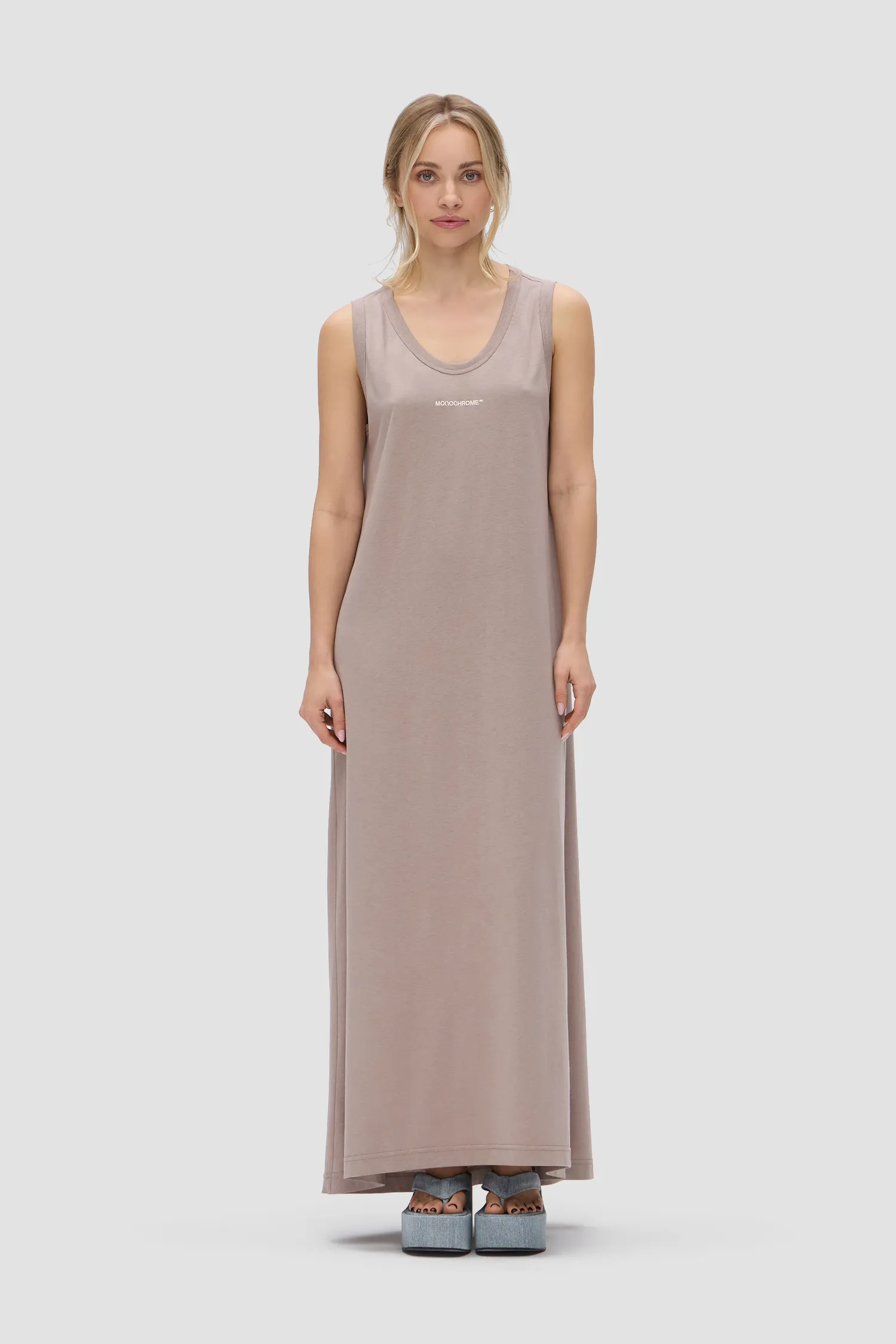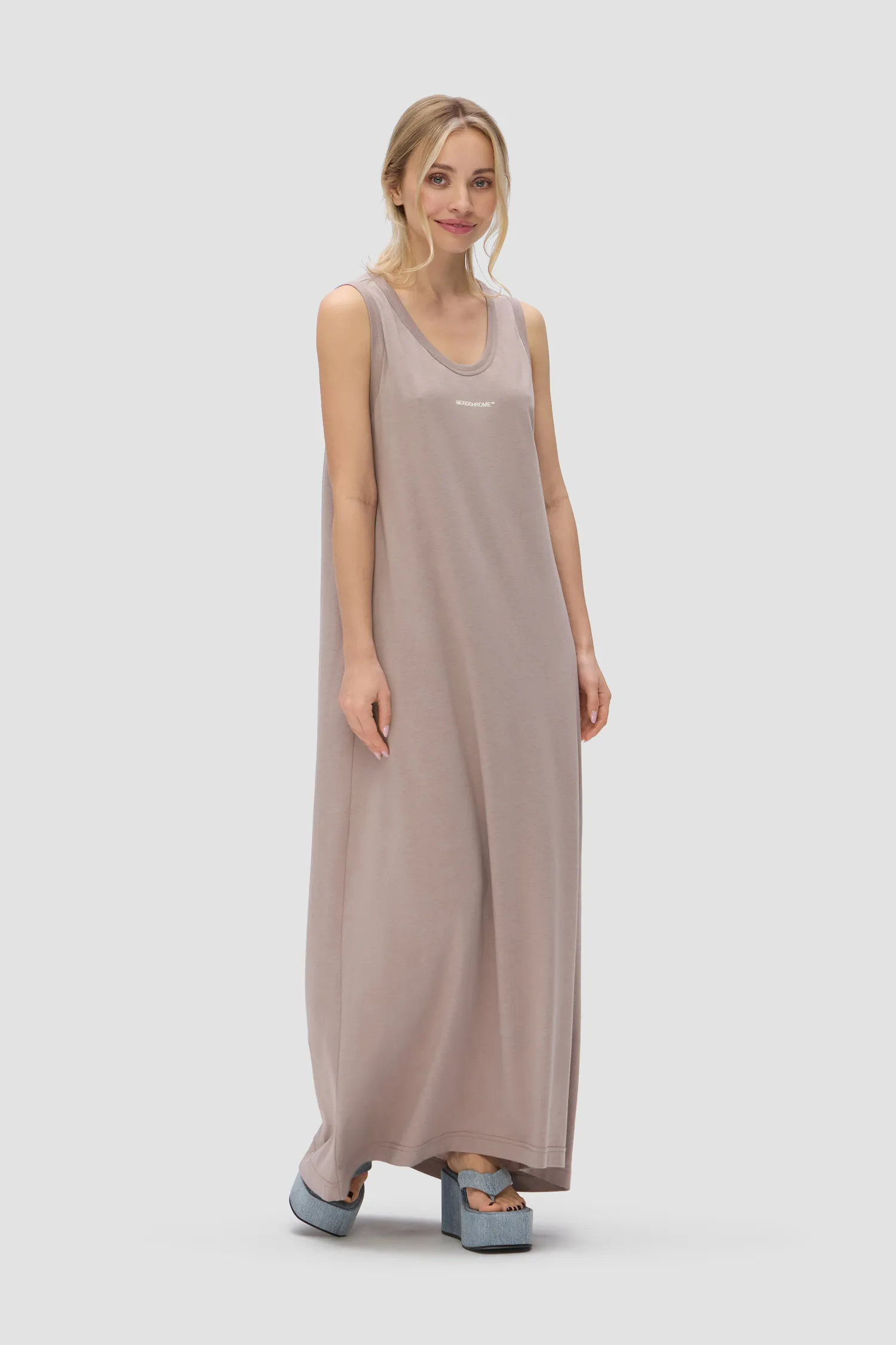 Платье-майка свободного кроя без рукавов. Длина макси. Модель выполнена из смесового органического хлопкового полотна. U-образный вырез. Рельефный логотип MONOCHROME в области груди. Упаковка в подарочную коробку.