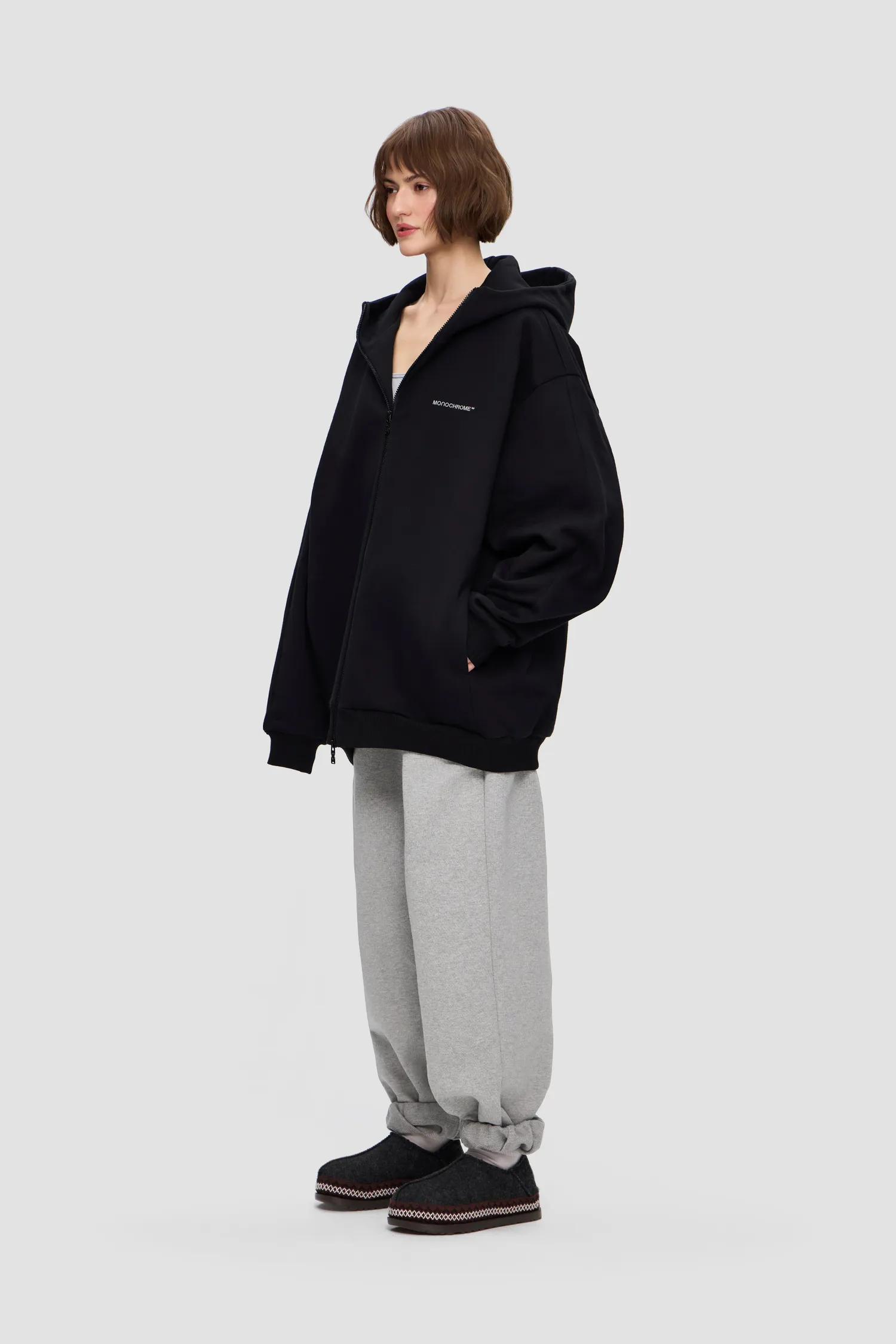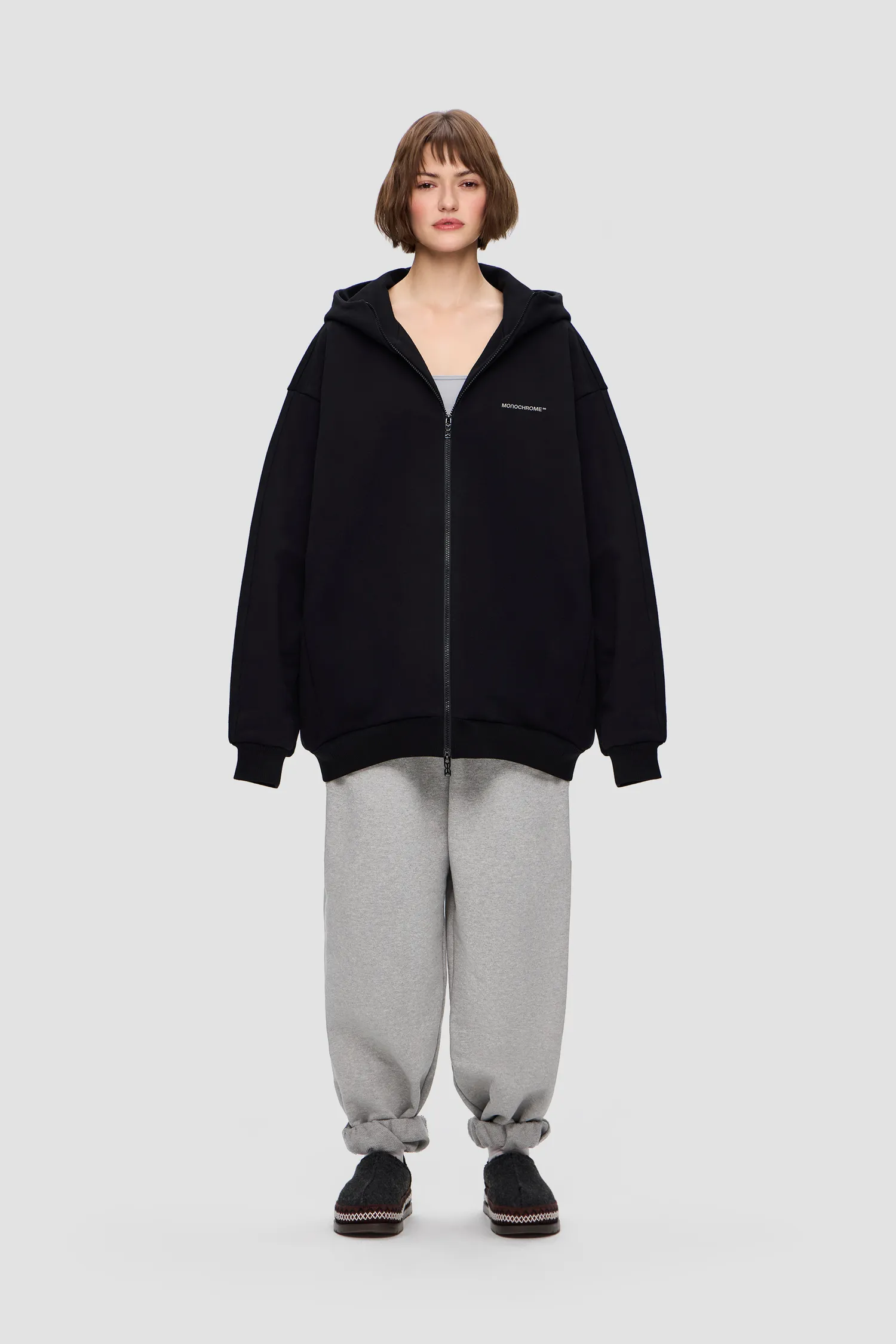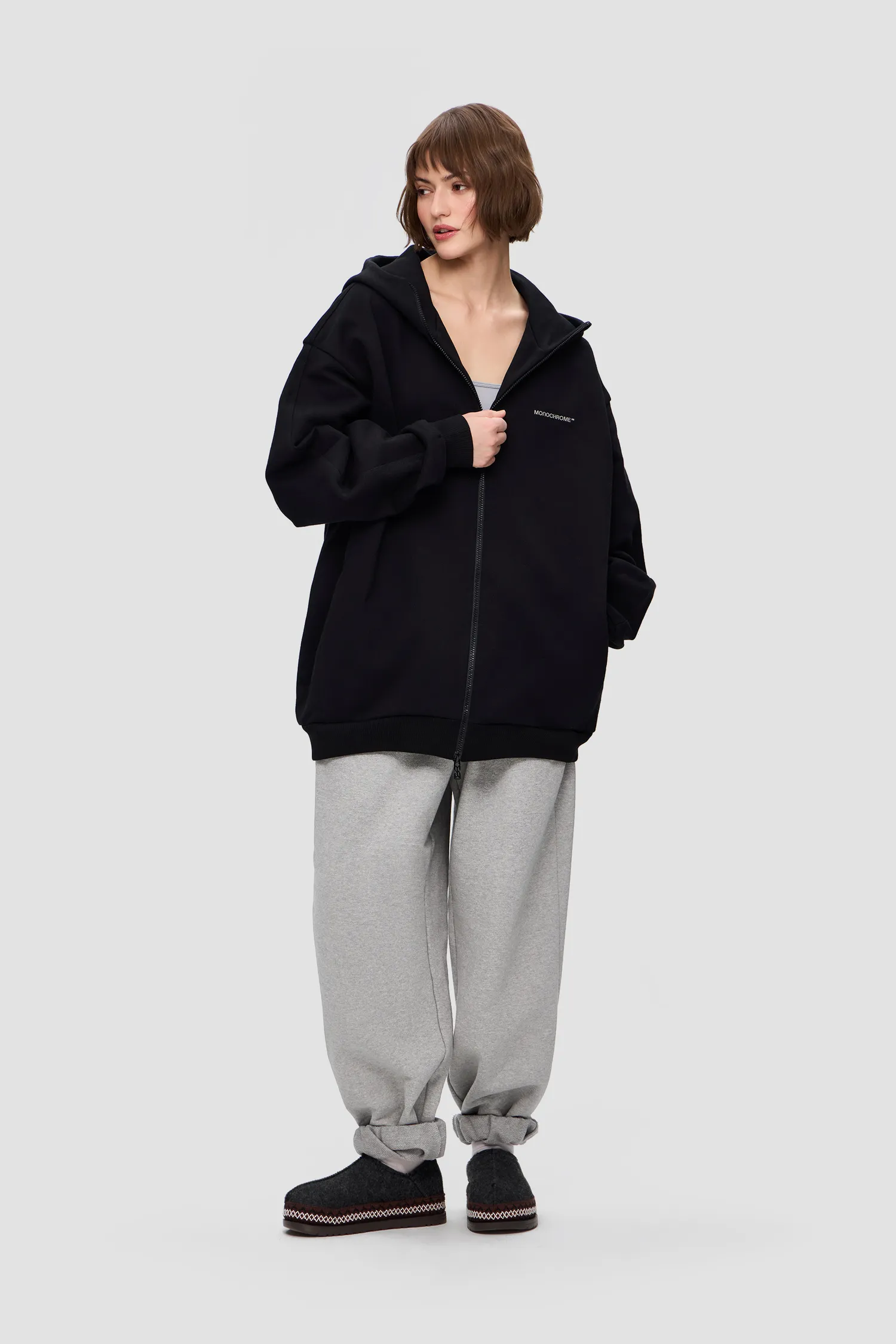 Худи на молнии из 100% хлопкового полотна. Скрытые боковые карманы. Глубокий капюшон с продольным сечением. Петельная текстура полотна без начеса. Рельефный логотип MONOCHROME в области груди. Пуллер на молнии выполнен в виде элемента фирменного паттерна Упаковка в подарочную коробку. Сделано в России на собственной мануфактуре MONOCHROME.