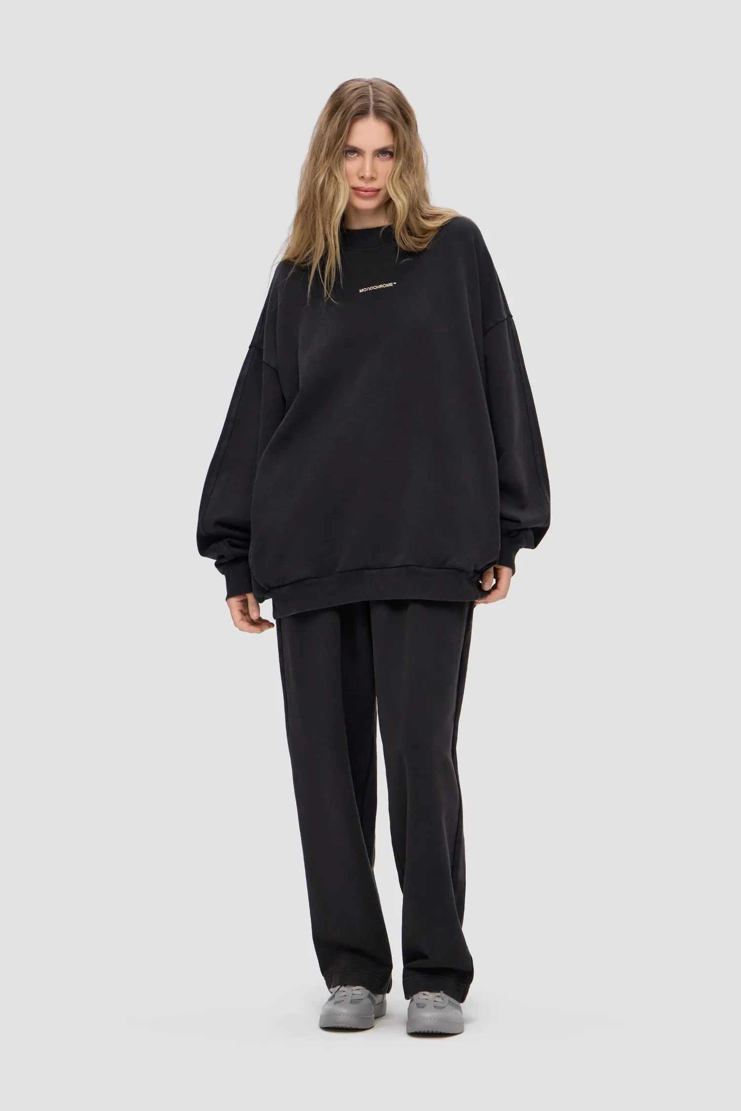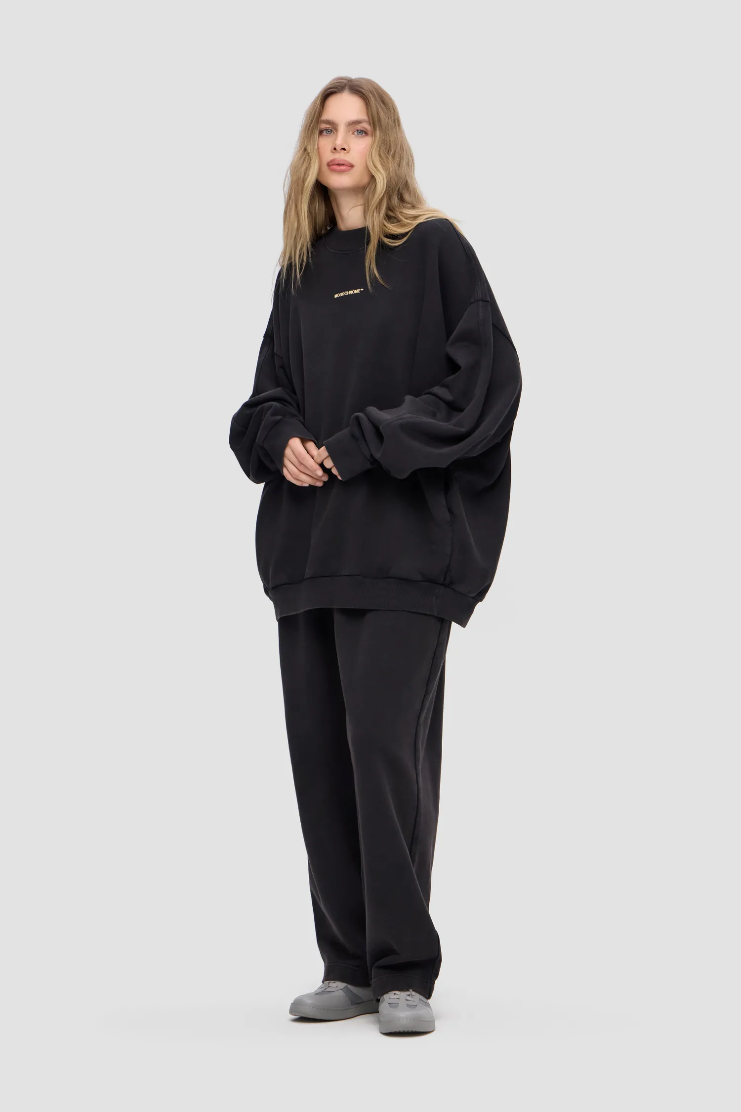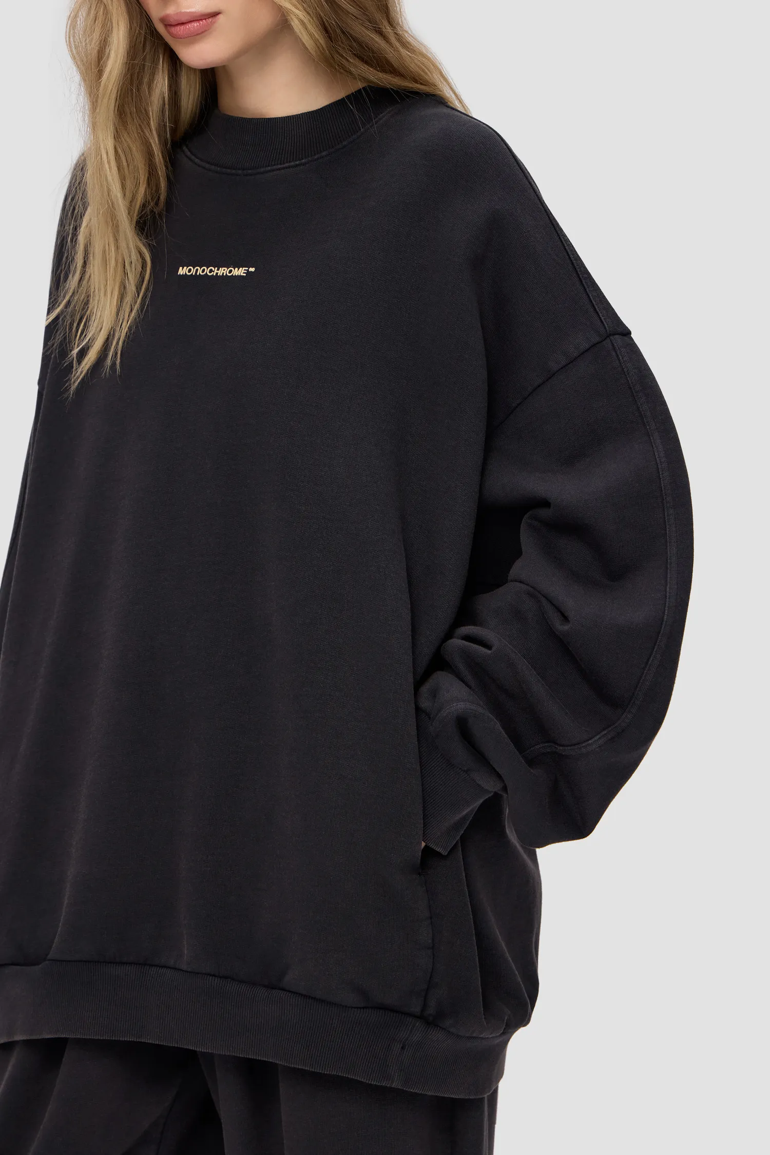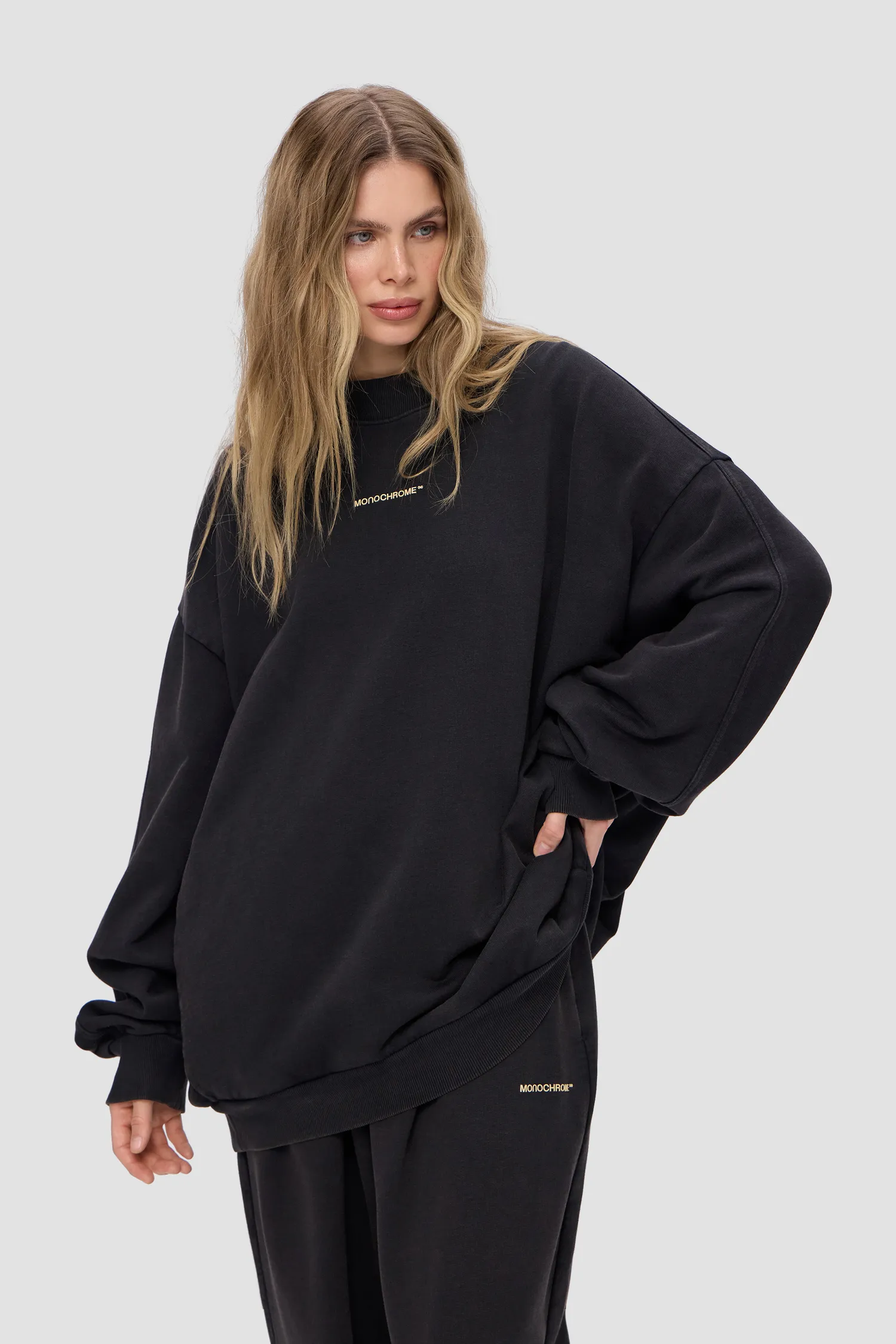 Oversized свитшот черного цвета из натурального хлопка. О-образный вырез. Рельефный логотип в области груди контрастного цвета. Скрытые боковые карманы. Эластичный манжеты на рукавах и по нижнему краю изделий. Петельная текстура ткани без начеса. Упаковка в подарочную коробку.