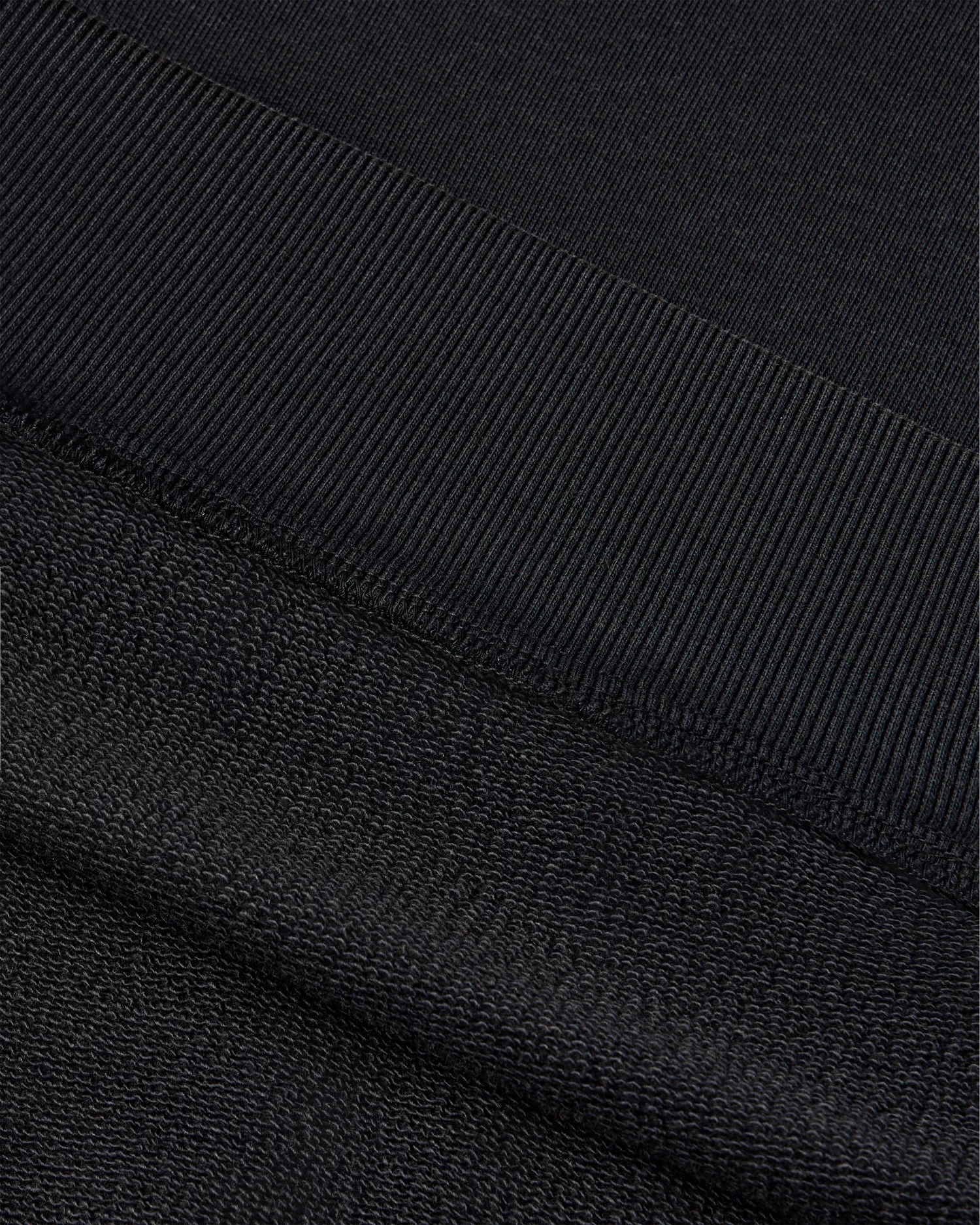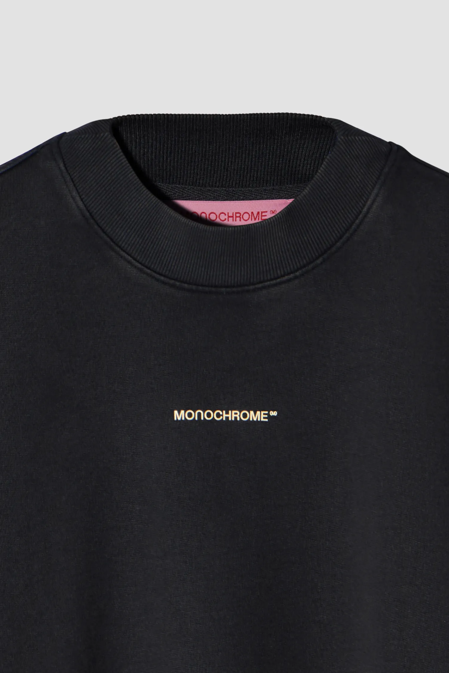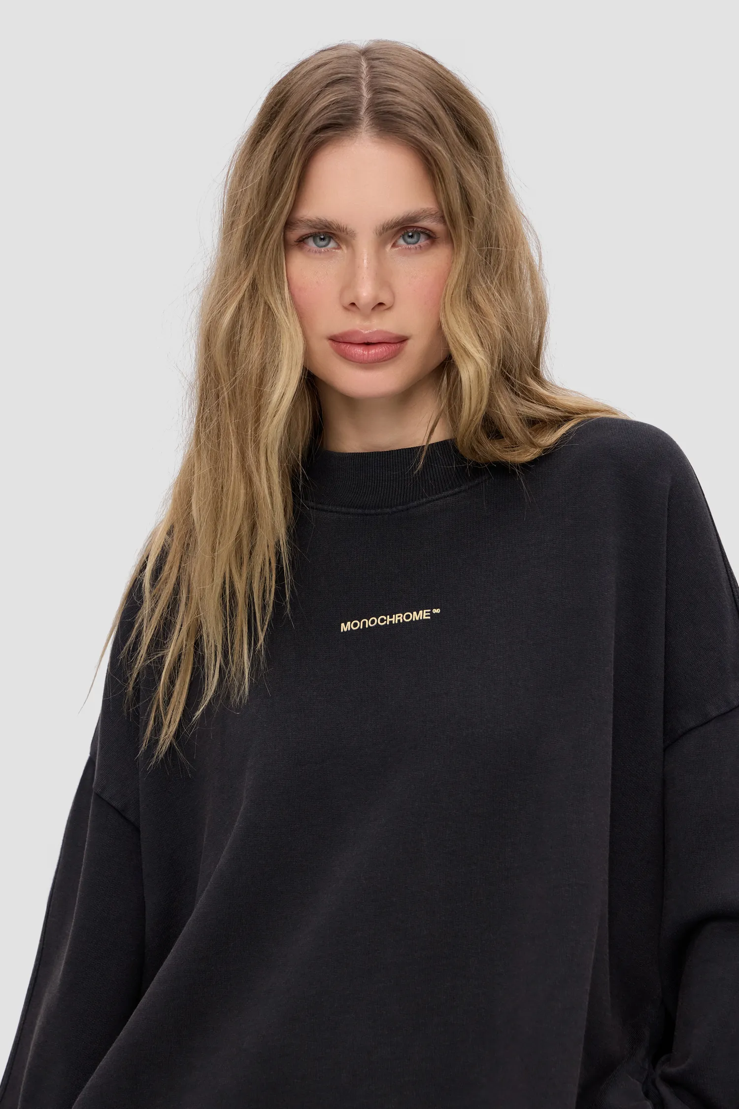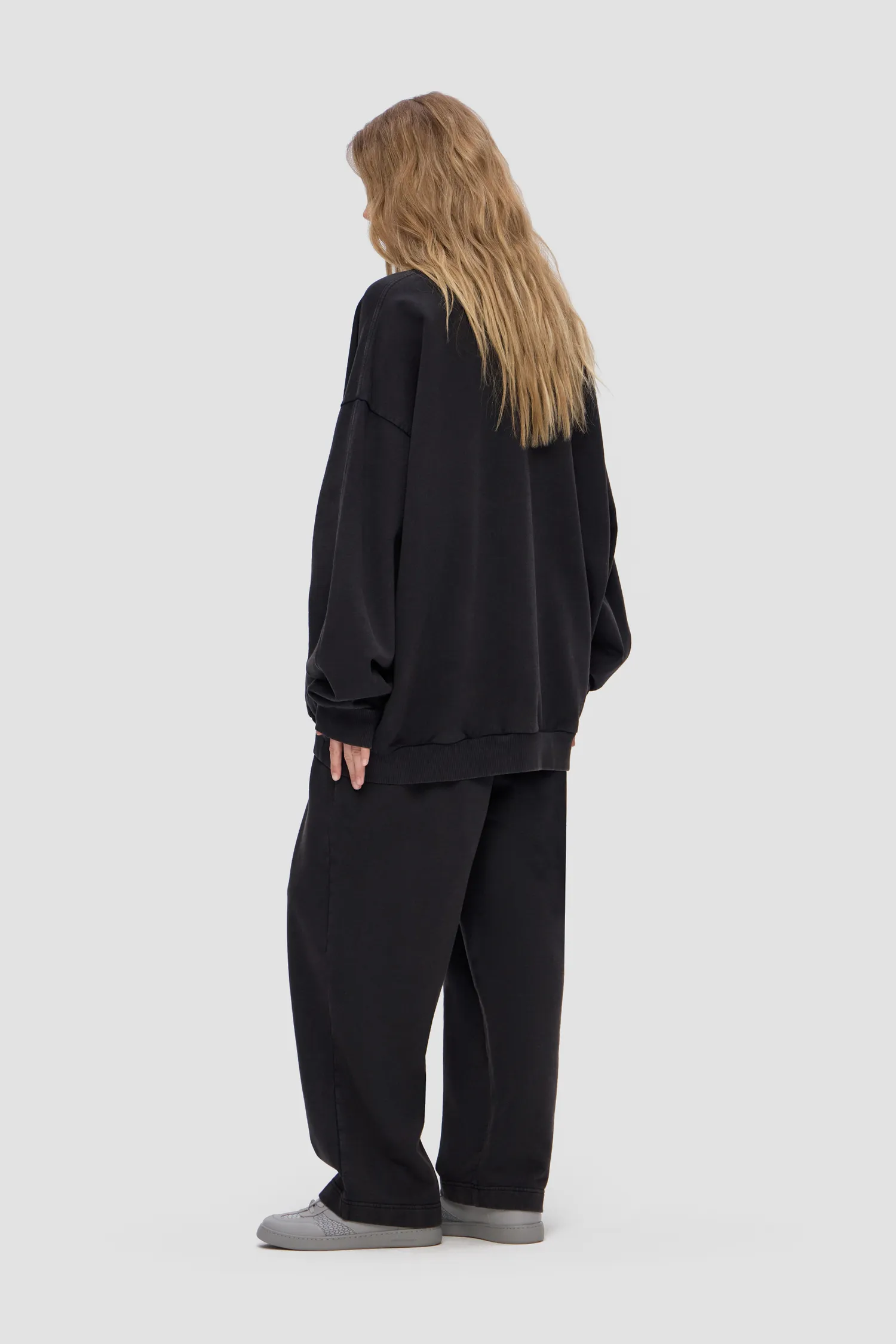Oversized свитшот черного цвета из натурального хлопка. О-образный вырез. Рельефный логотип в области груди контрастного цвета. Скрытые боковые карманы. Эластичный манжеты на рукавах и по нижнему краю изделий. Петельная текстура ткани без начеса. Упаковка в подарочную коробку.