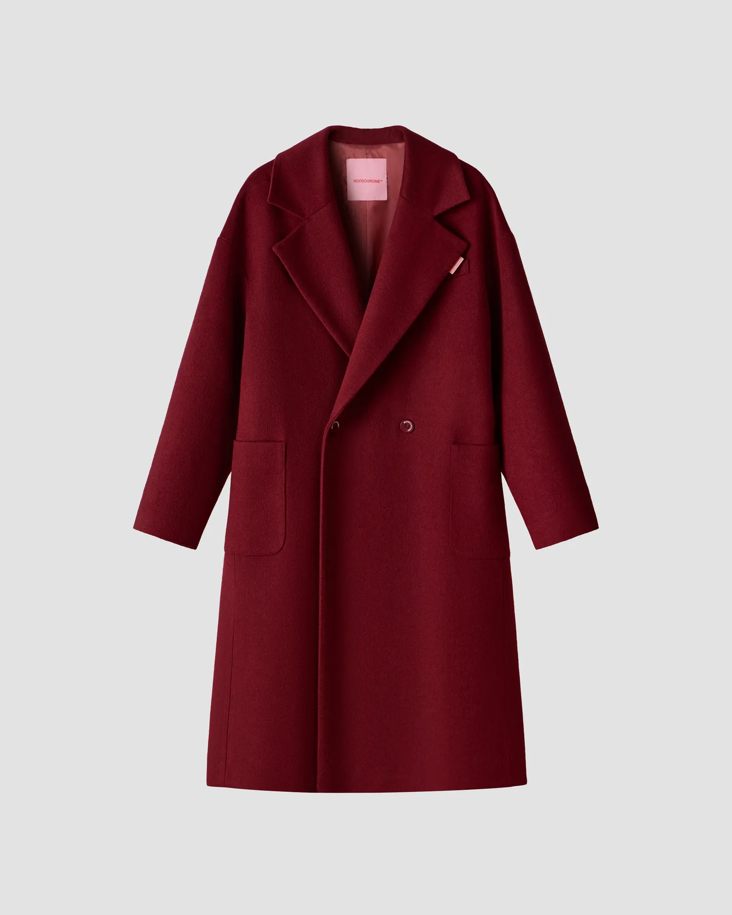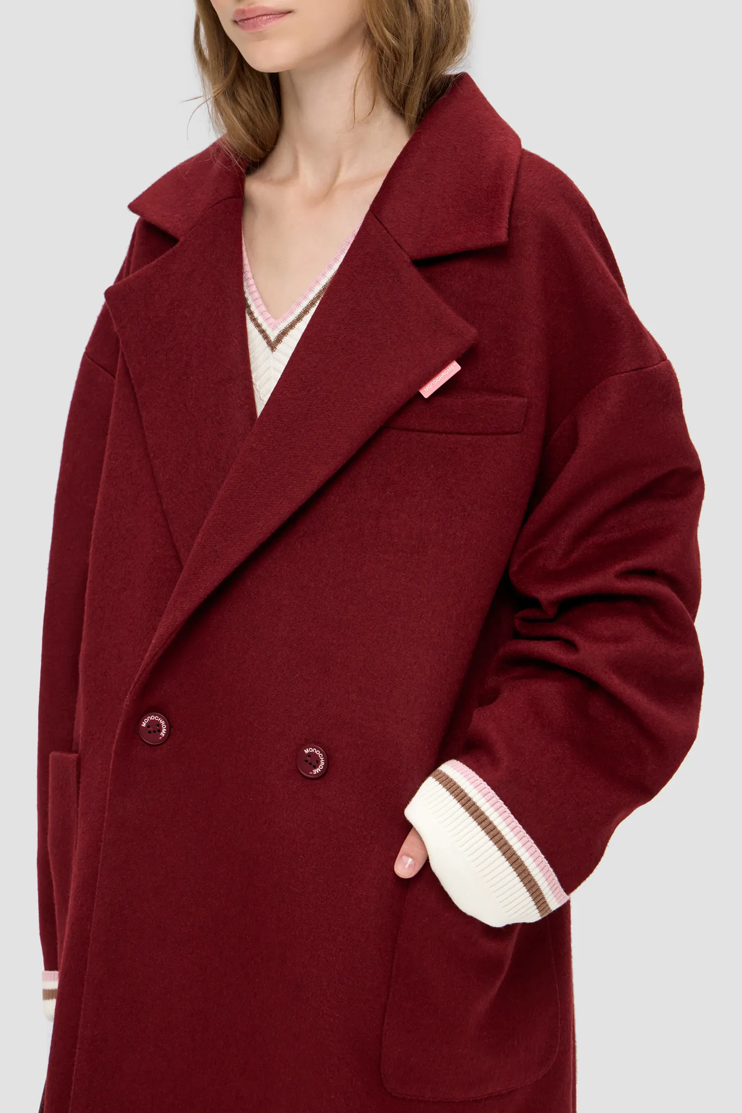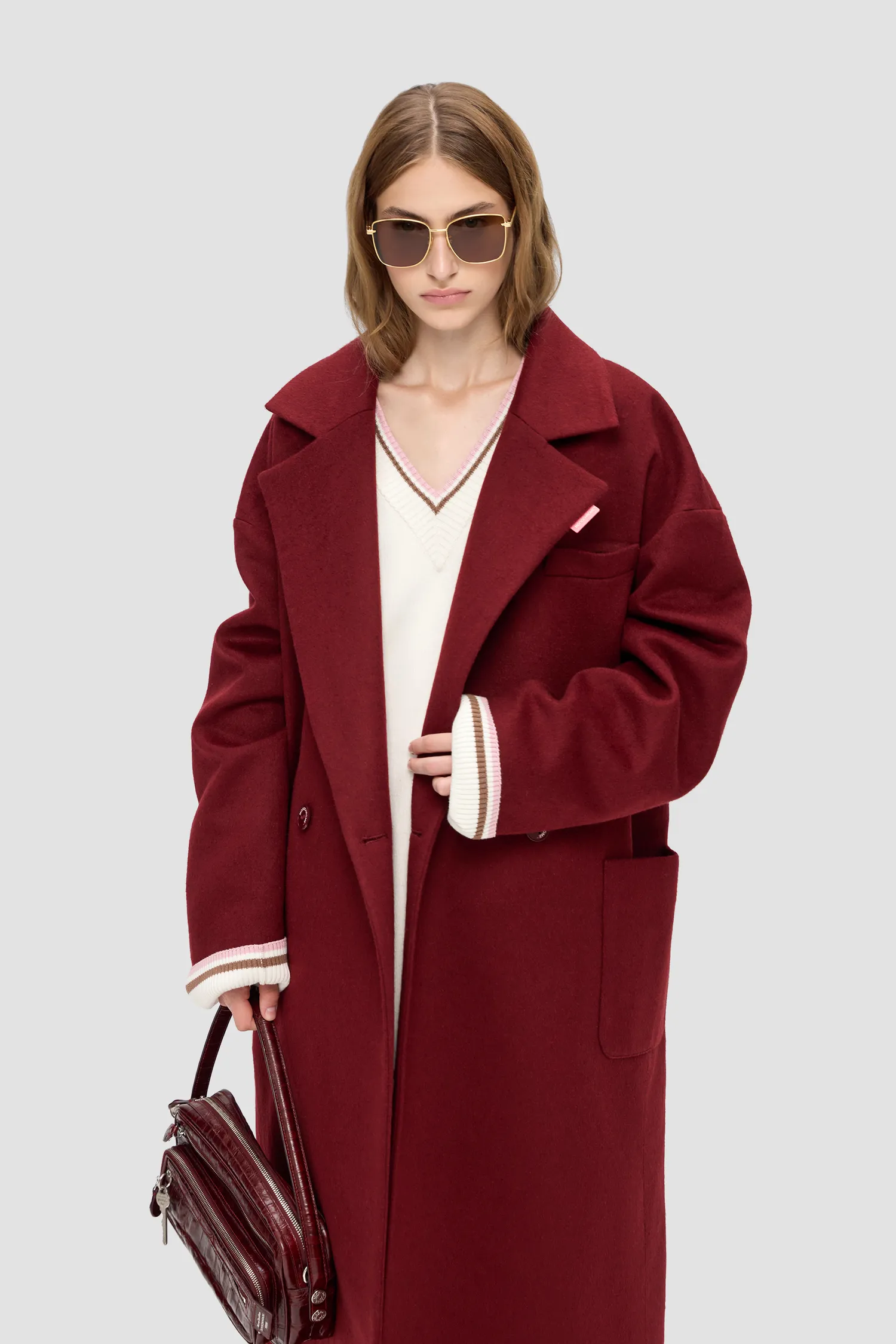 Пальто оверсайз-кроя, выполненное из шерстяного полотна. Натуральный подклад с вискозой в составе позволяет телу "дышать". Изделие оснащено плоскими карманами без клапана с двух сторон. Тип застежки: пуговицы. Полимерная нашивка розового цвета с логотипом на лацкане. Фирменная упаковка в брендированный чехол.