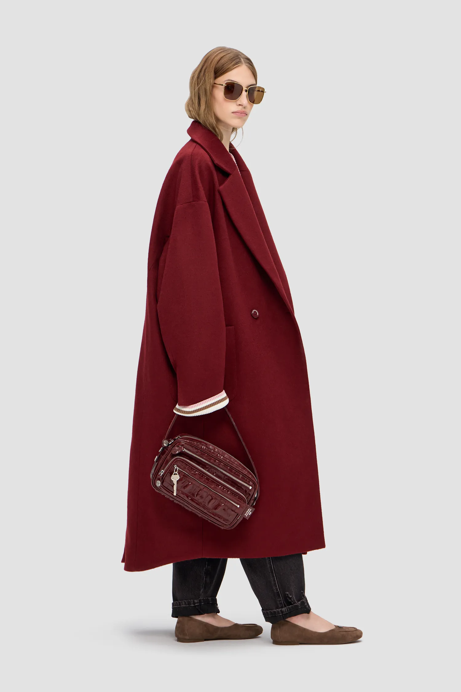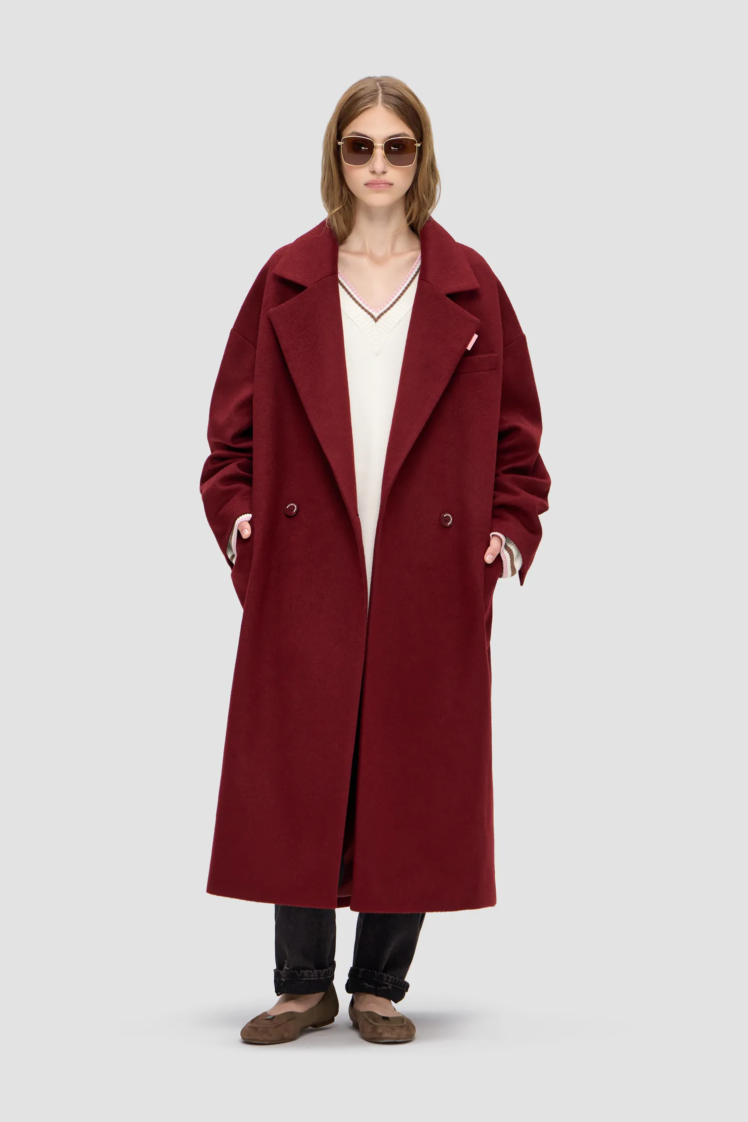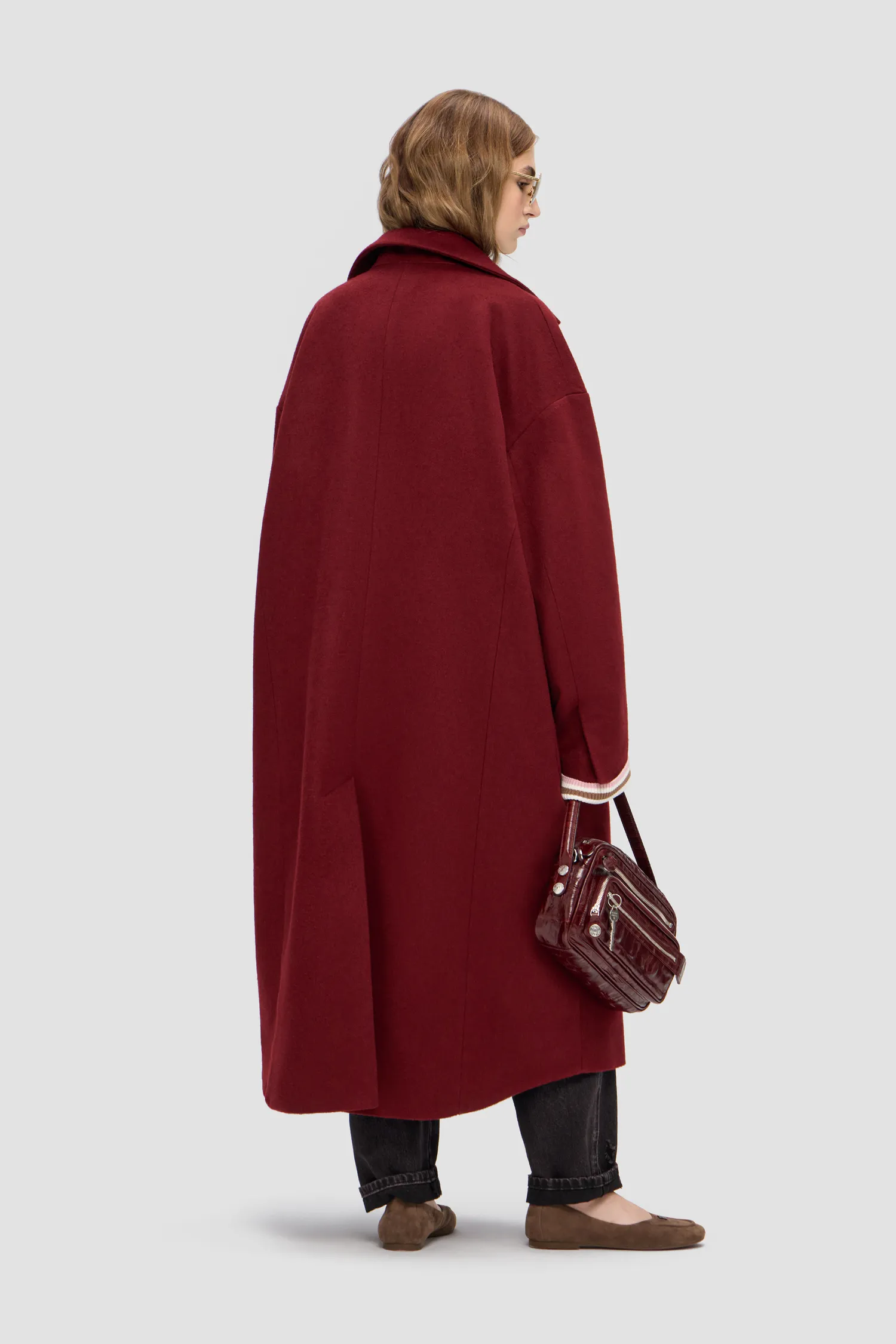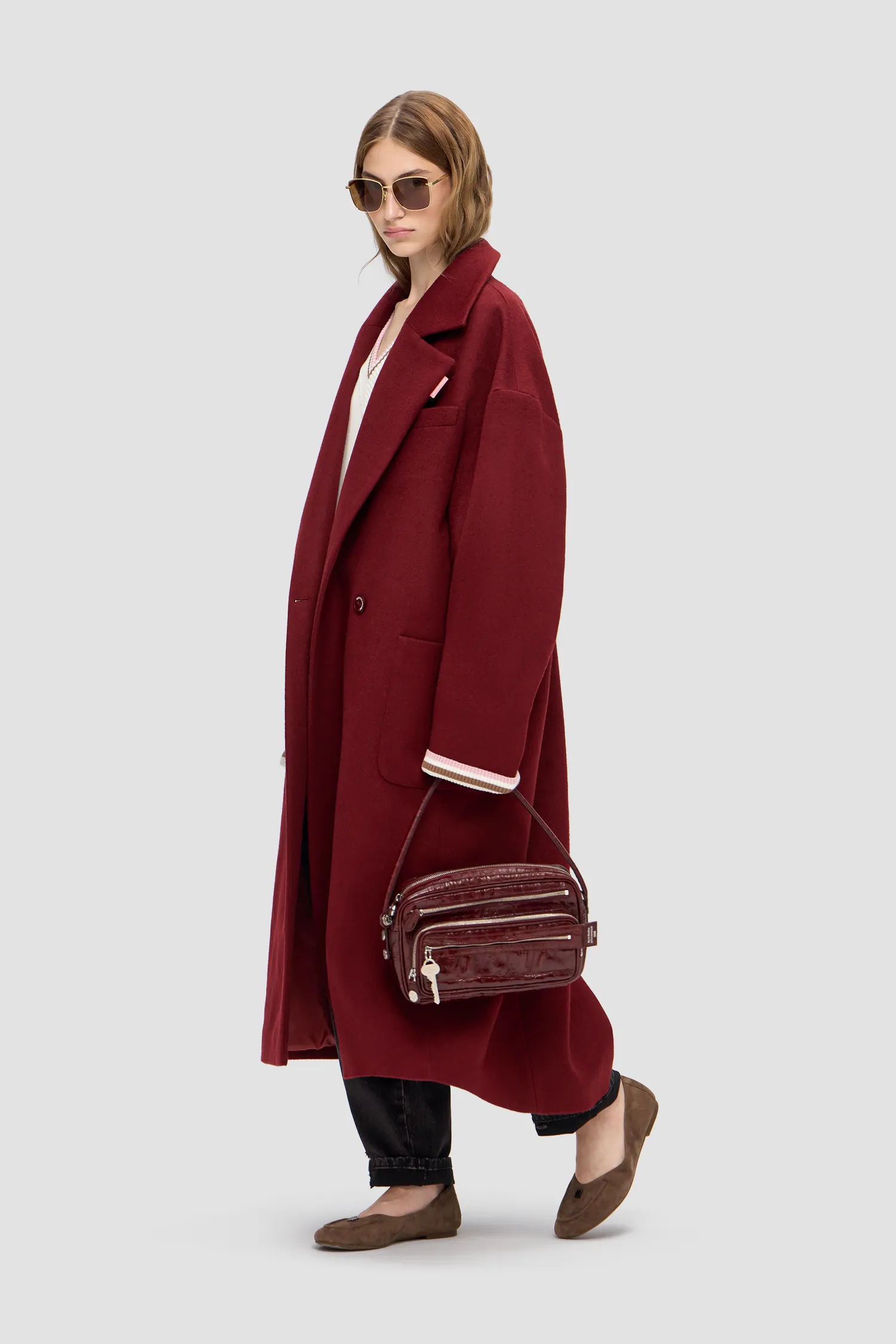 Пальто оверсайз-кроя, выполненное из шерстяного полотна. Натуральный подклад с вискозой в составе позволяет телу "дышать". Изделие оснащено плоскими карманами без клапана с двух сторон. Тип застежки: пуговицы. Полимерная нашивка розового цвета с логотипом на лацкане. Фирменная упаковка в брендированный чехол.