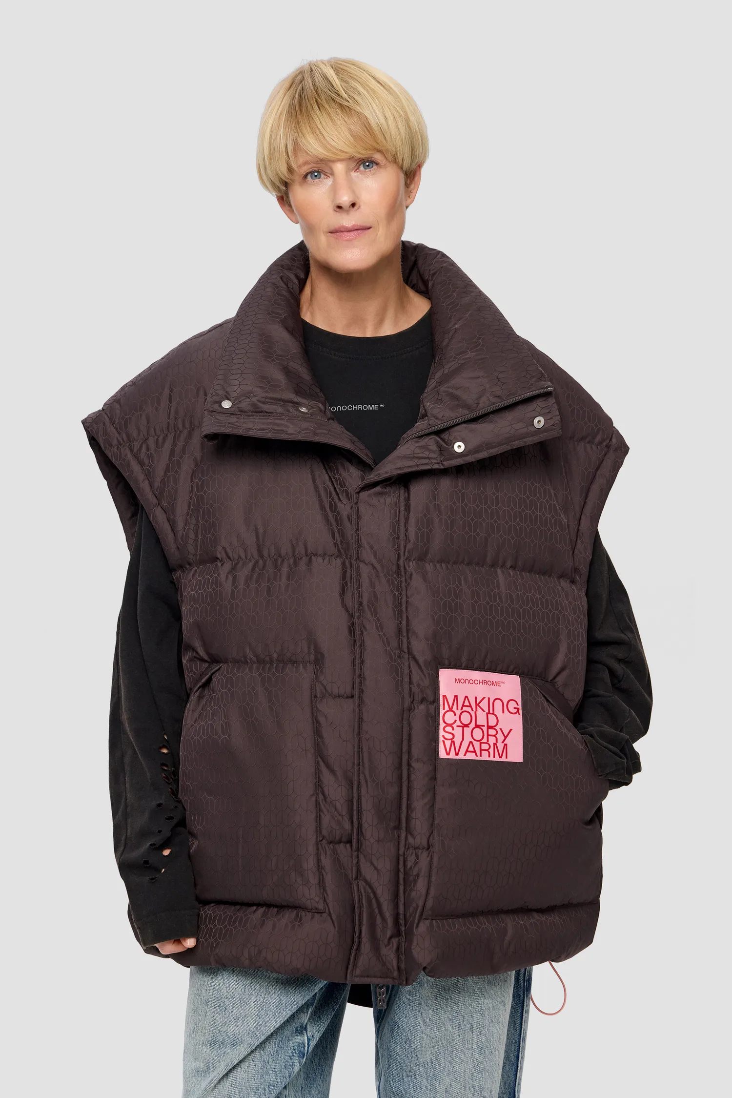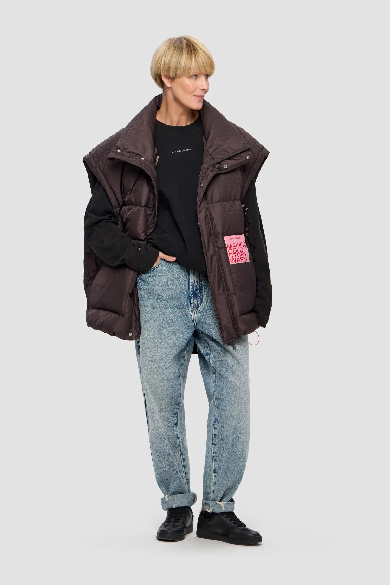 Дутый оверсайз жилет из влагонепроницаемой ткани с элементами фирменного паттерна MONOCHROME. Основной материал: полиэстер, наполнитель: 90% утиный пух / 10% перо (по стандартам RDS*). Молнии с защитой от ветра и влаги. Воротник-стойка. Нашивной жаккардовый лейбл. Пройма и нижняя часть изделия регулируется кулисками. Скрытые боковые карманы из мягкого флиса. Упаковка в базовую коробку.
