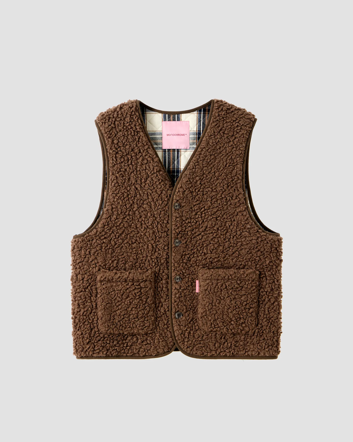 Утепленный жилет из коллекции VILLAGE'25. Выполнен из смесовой шерсти, имитирующей овчину. Два накладных боковых кармана. Подклад в клетку из смесовой вискозы позволяет телу «дышать». Тип застежки: металлические пуговицы с винтажным эффектом. Полимерная нашивка розового цвета с логотипом на кармане. Упаковка в подарочную коробку.