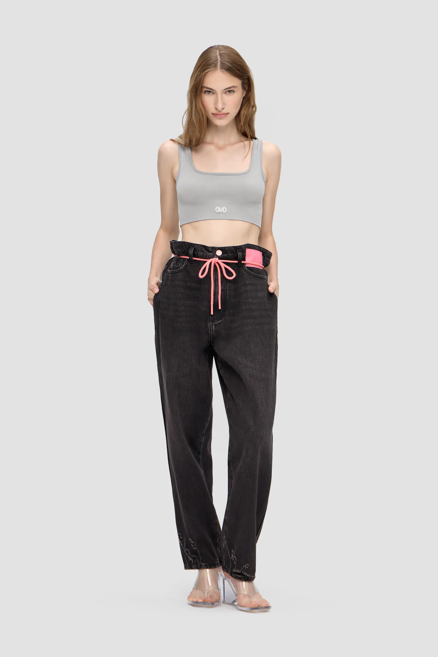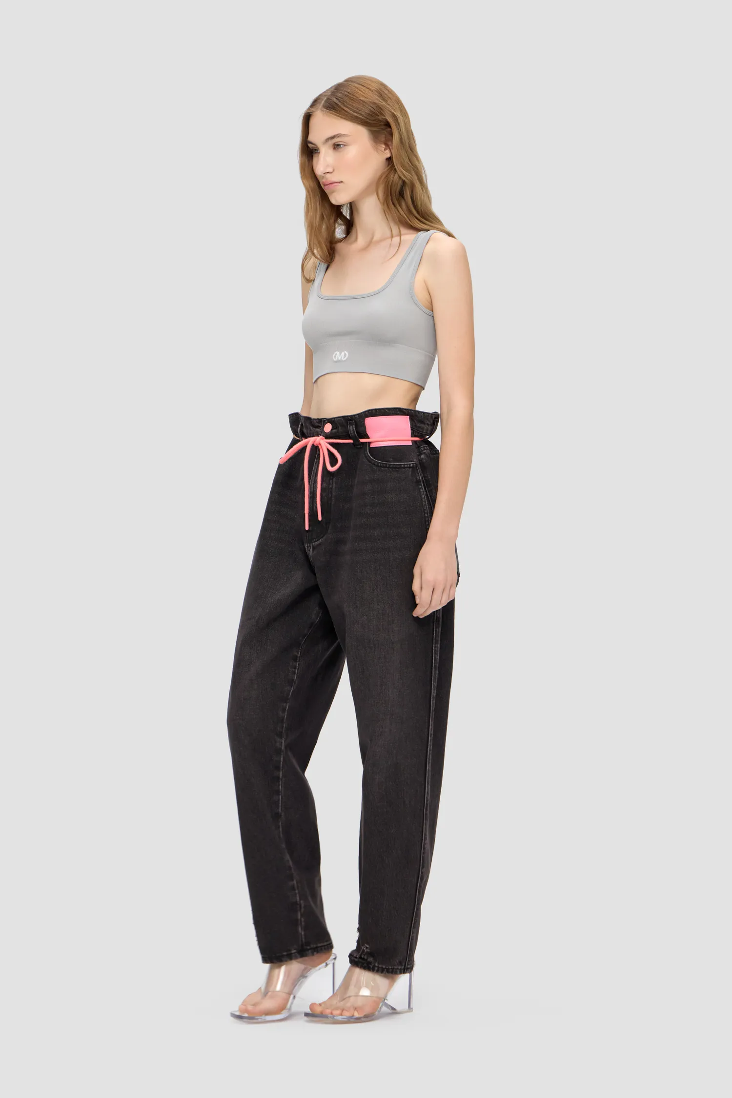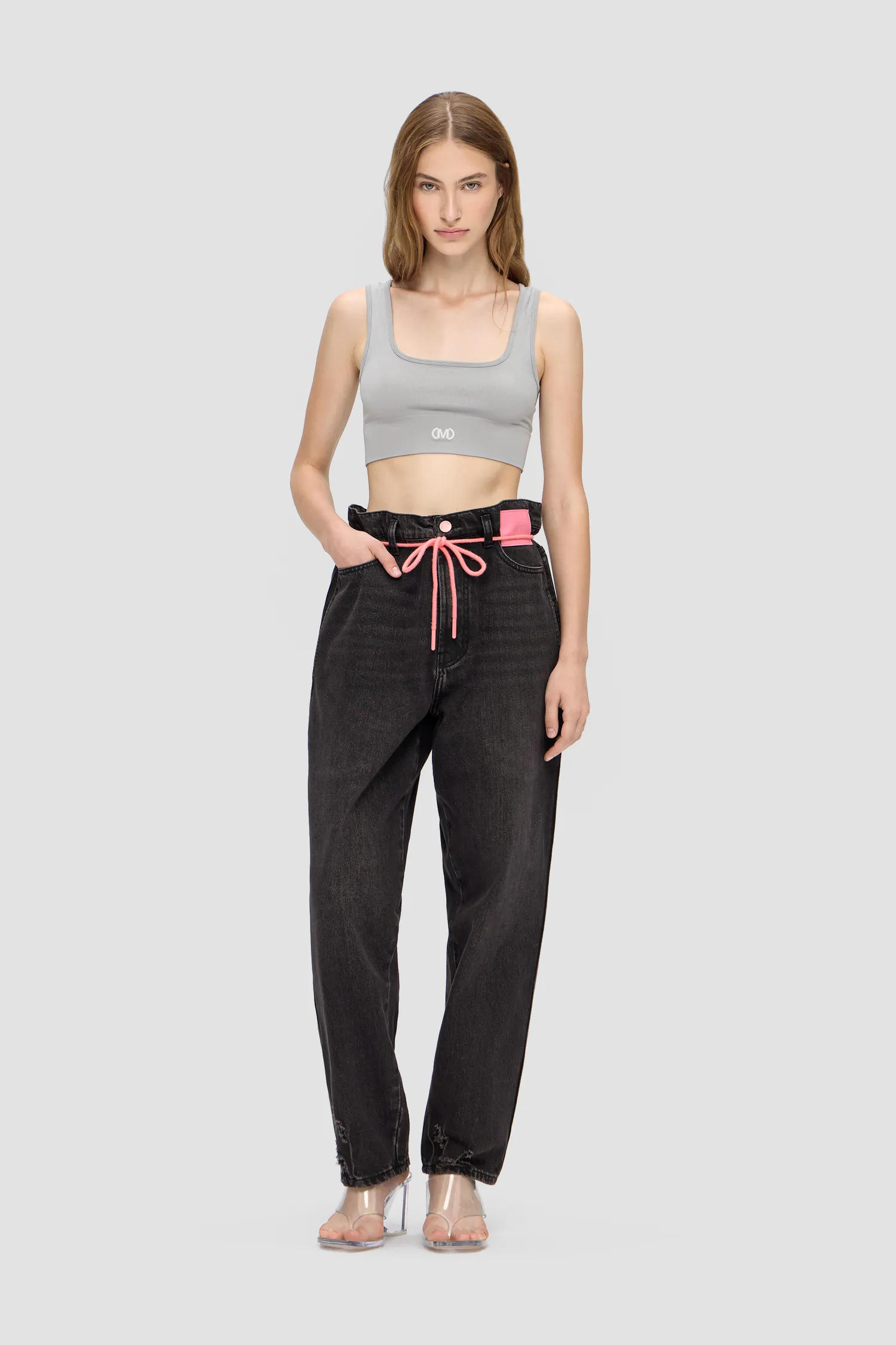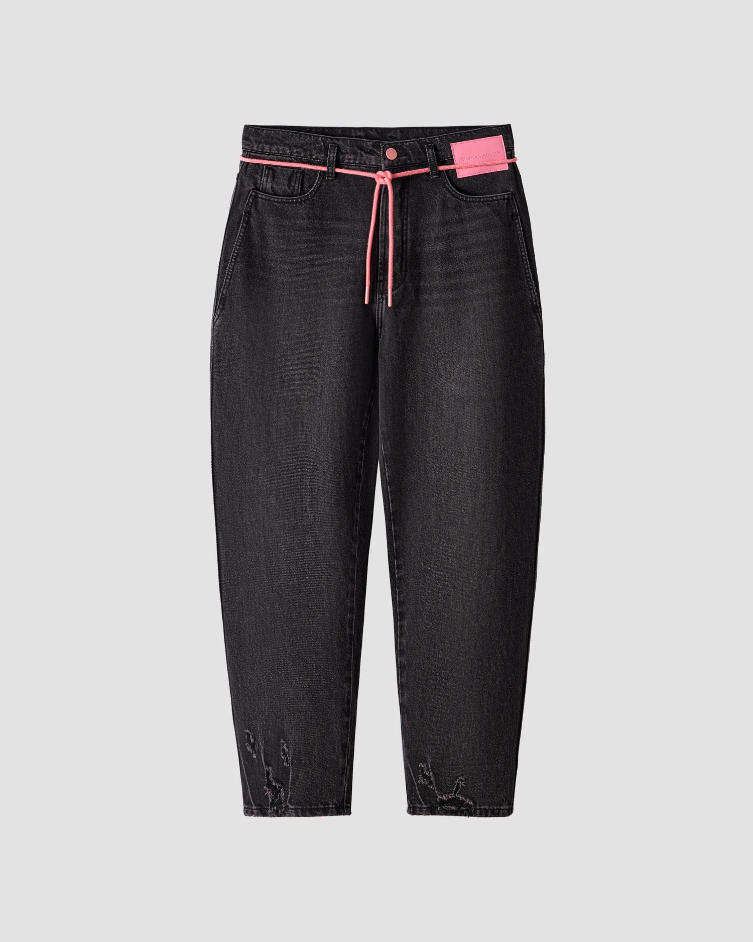 Джинсы из смесового хлопка широкого кроя baggy. Винтажная варка и дистресс-эффект с декоративными дырками по нижнему краю изделия. Петли для ремня переплетены в виде фирменной М с задней стороны. Пять карманов. Застежка на молнию и пуговицу спереди. В комплекте идет розовый шнурок для талии. Кожаный розовый лейбл спереди. Упаковка в подарочную коробку.