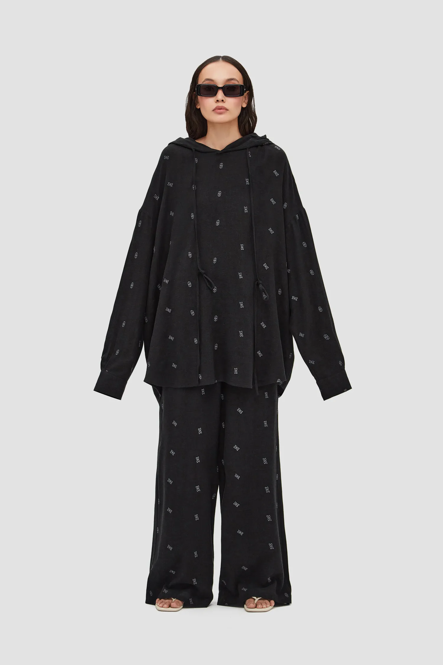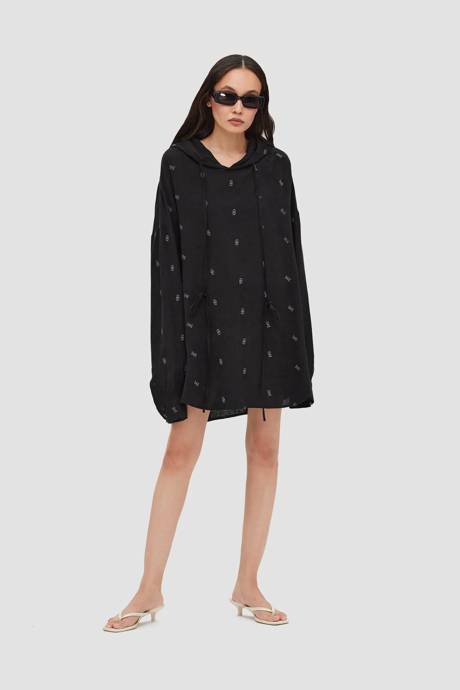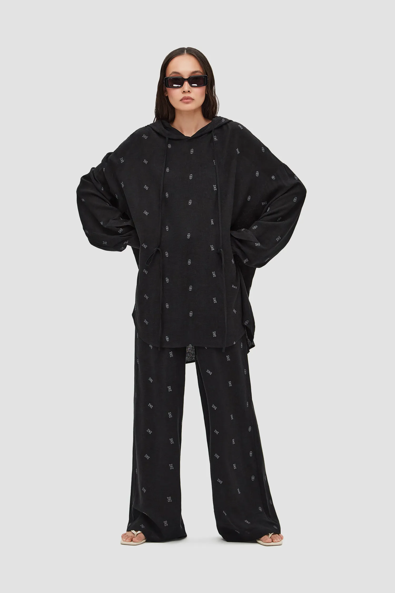Оверсайз туника с капюшоном на завязках. Легкая дышащая ткань из смеси льна и вискозы, расшитая фирменным паттерном MONOCHROME™ . Объемные рукава с манжетами на пуговицах. Упаковка в подарочную коробку.