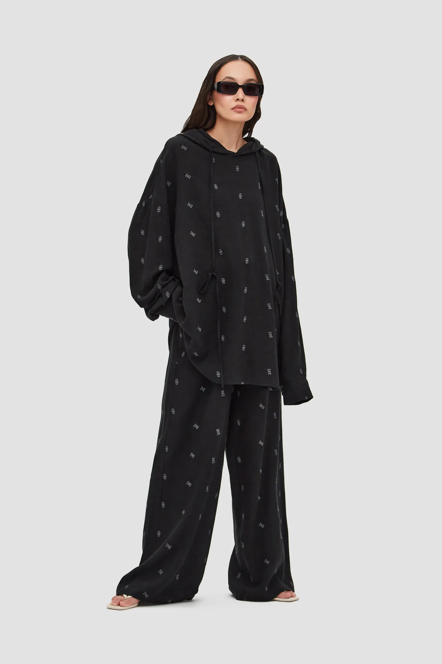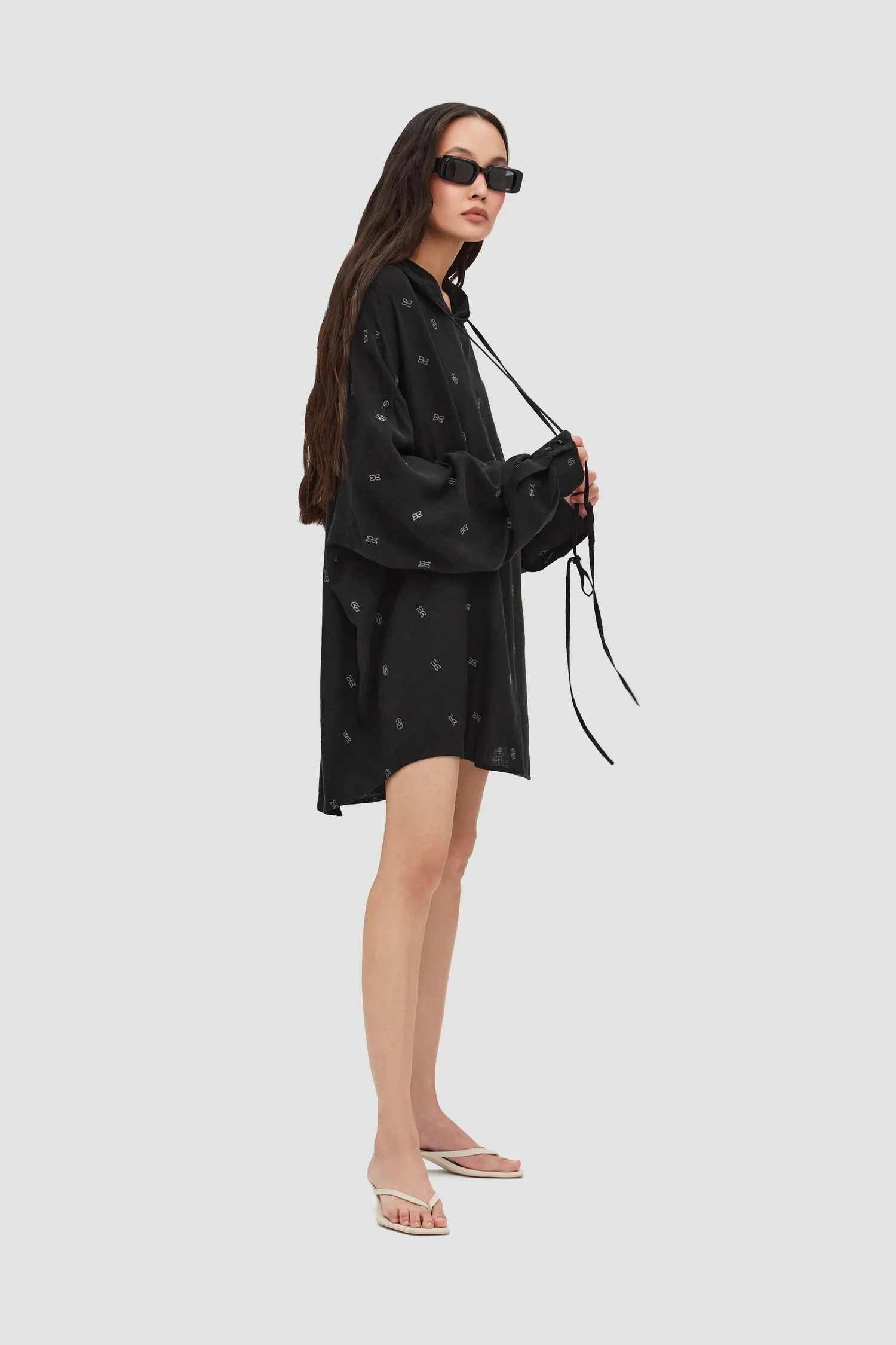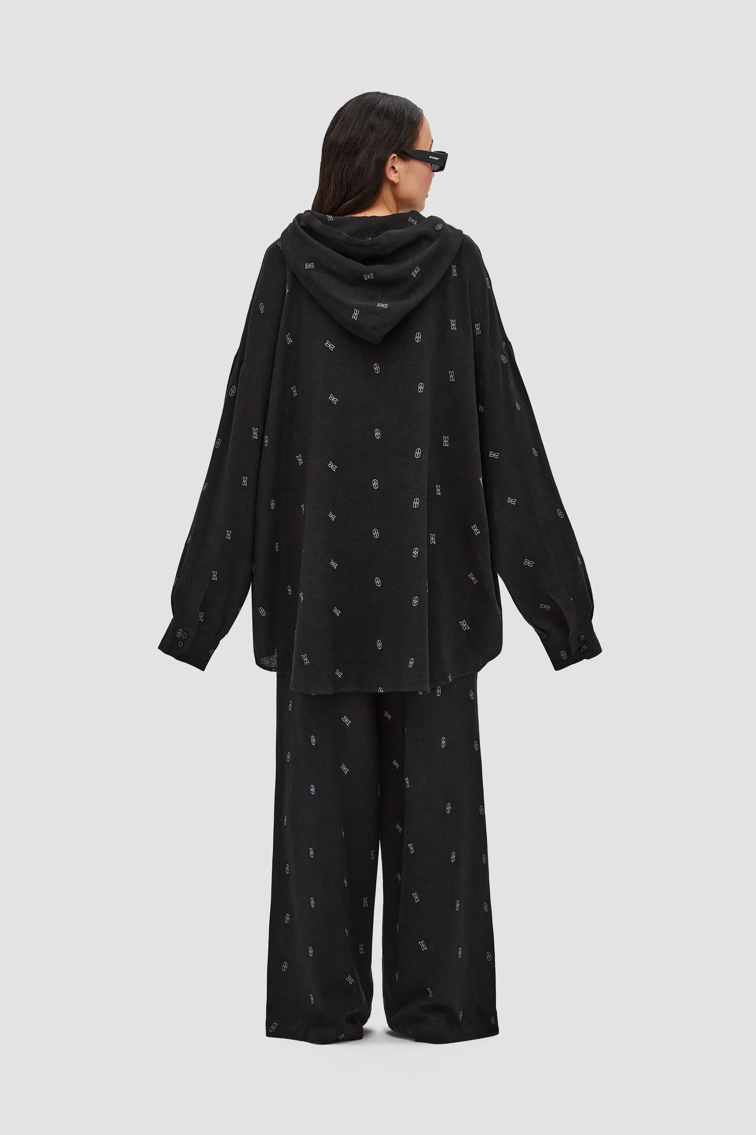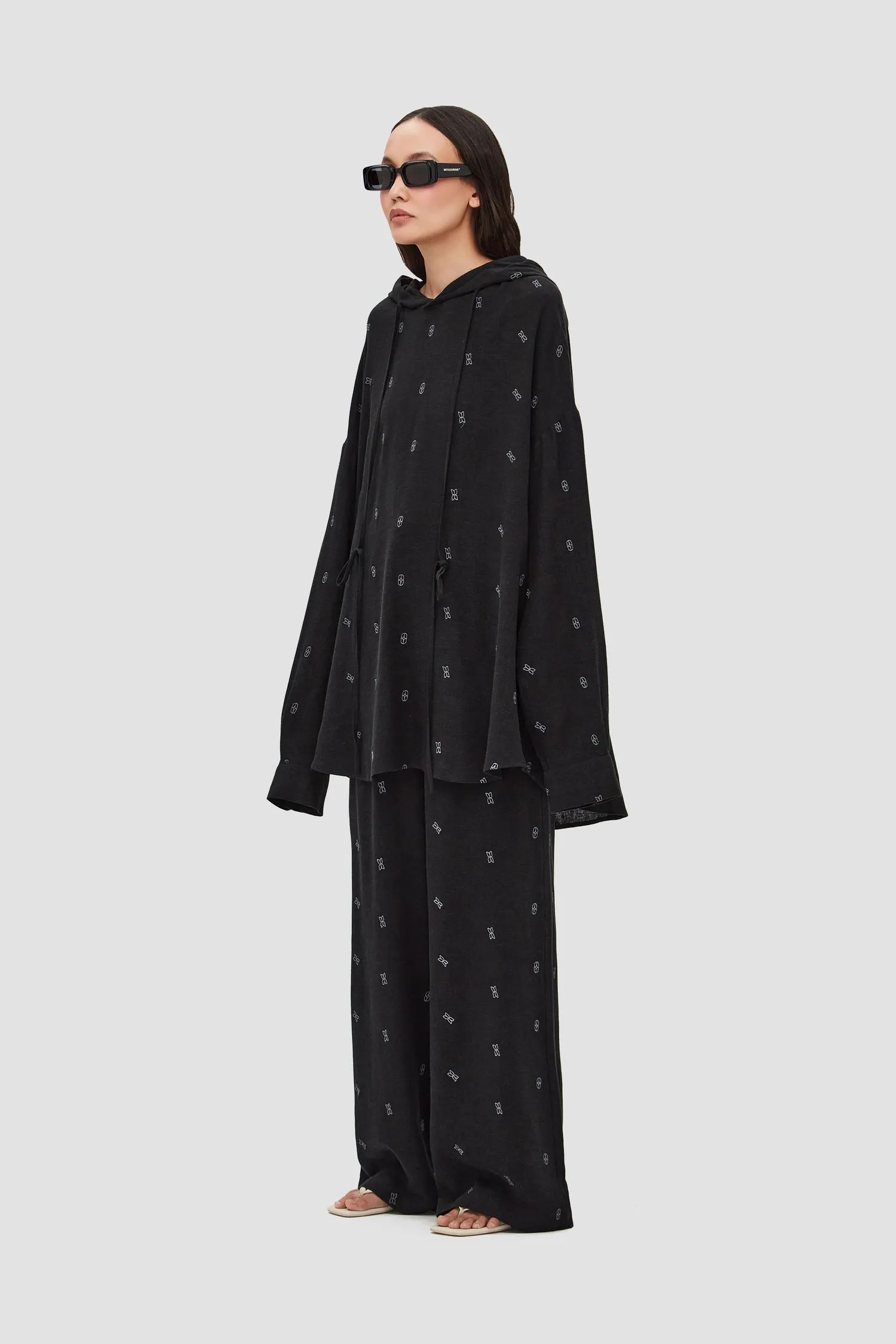 Оверсайз туника с капюшоном на завязках. Легкая дышащая ткань из смеси льна и вискозы, расшитая фирменным паттерном MONOCHROME™ . Объемные рукава с манжетами на пуговицах. Упаковка в подарочную коробку.