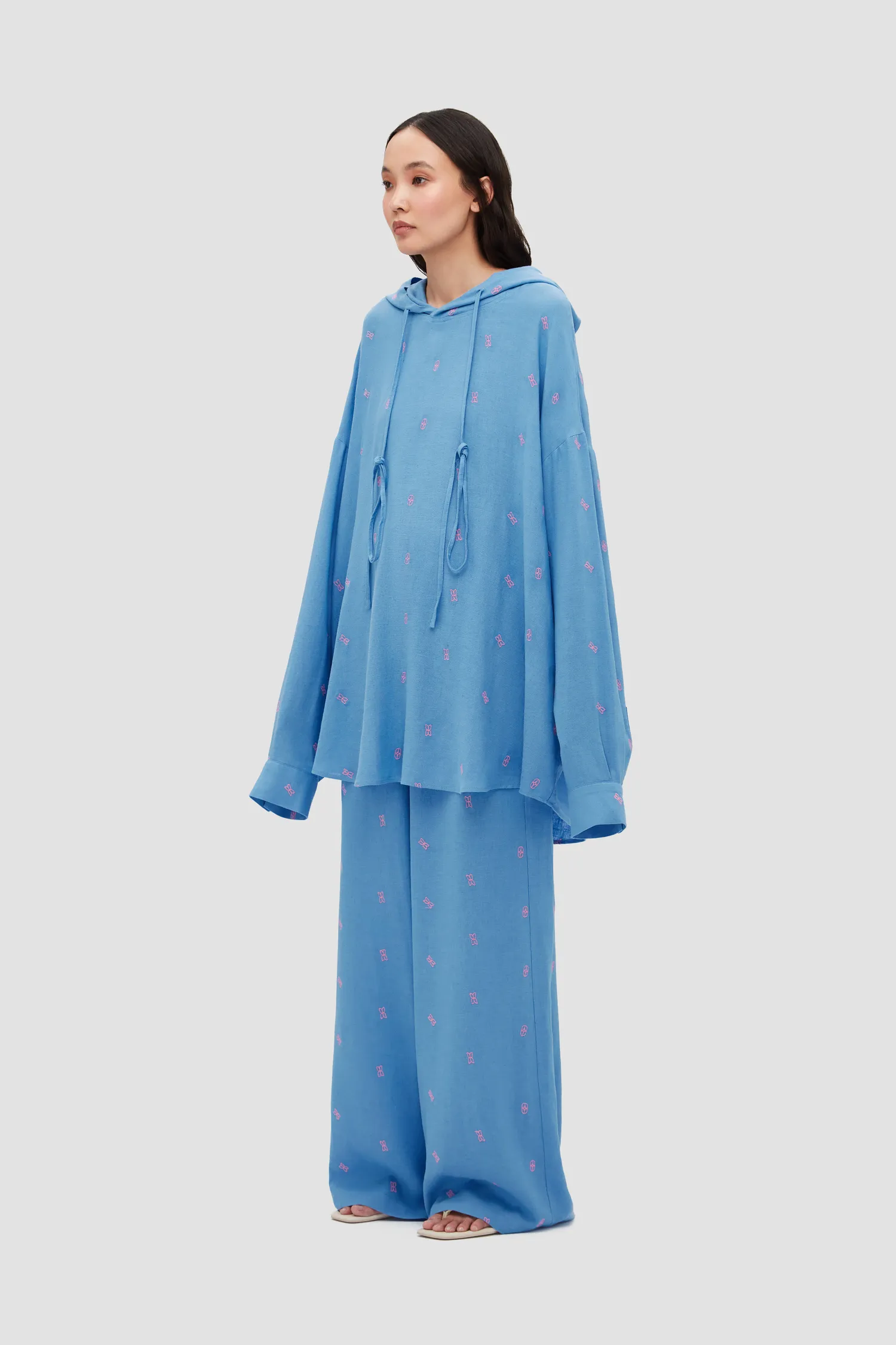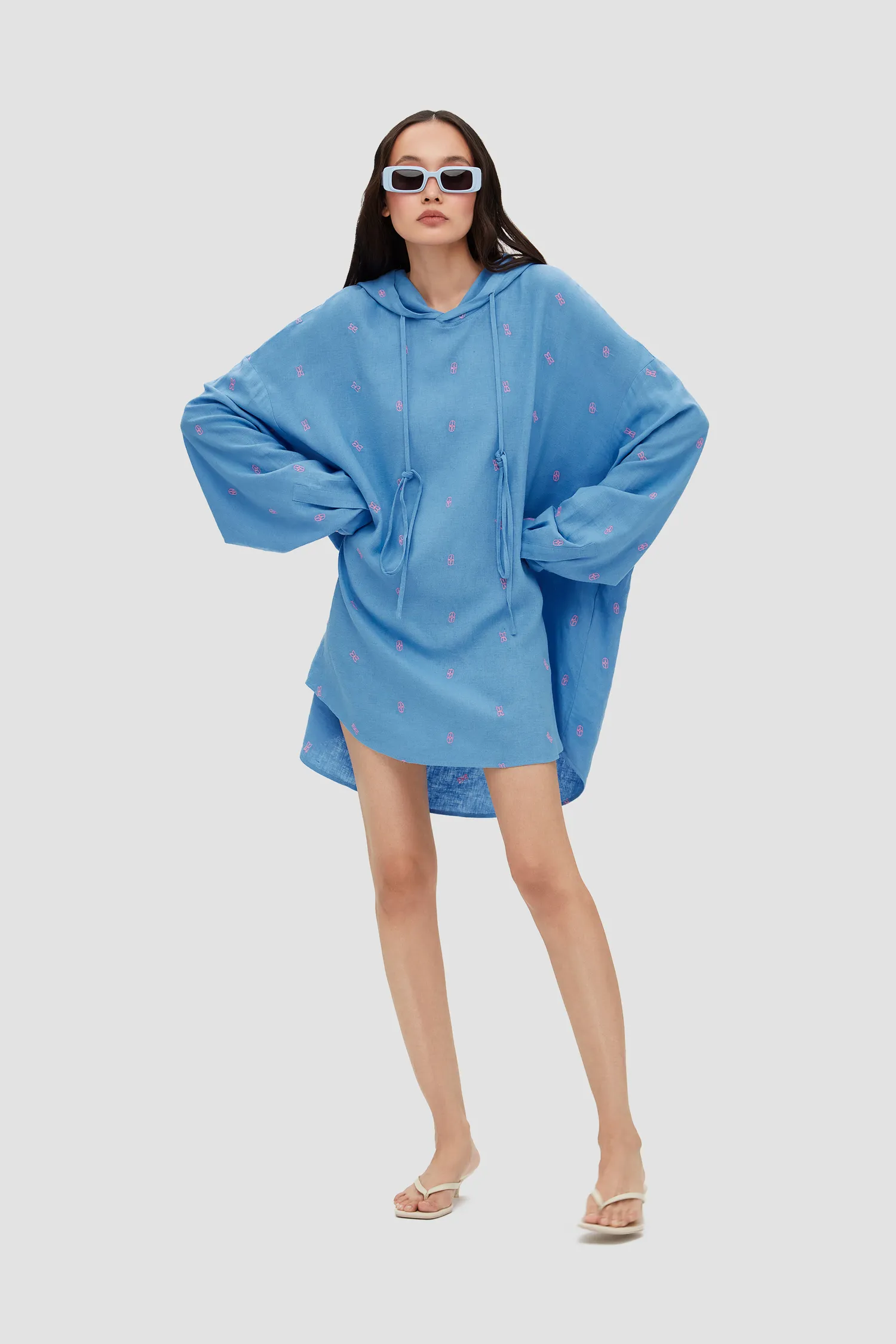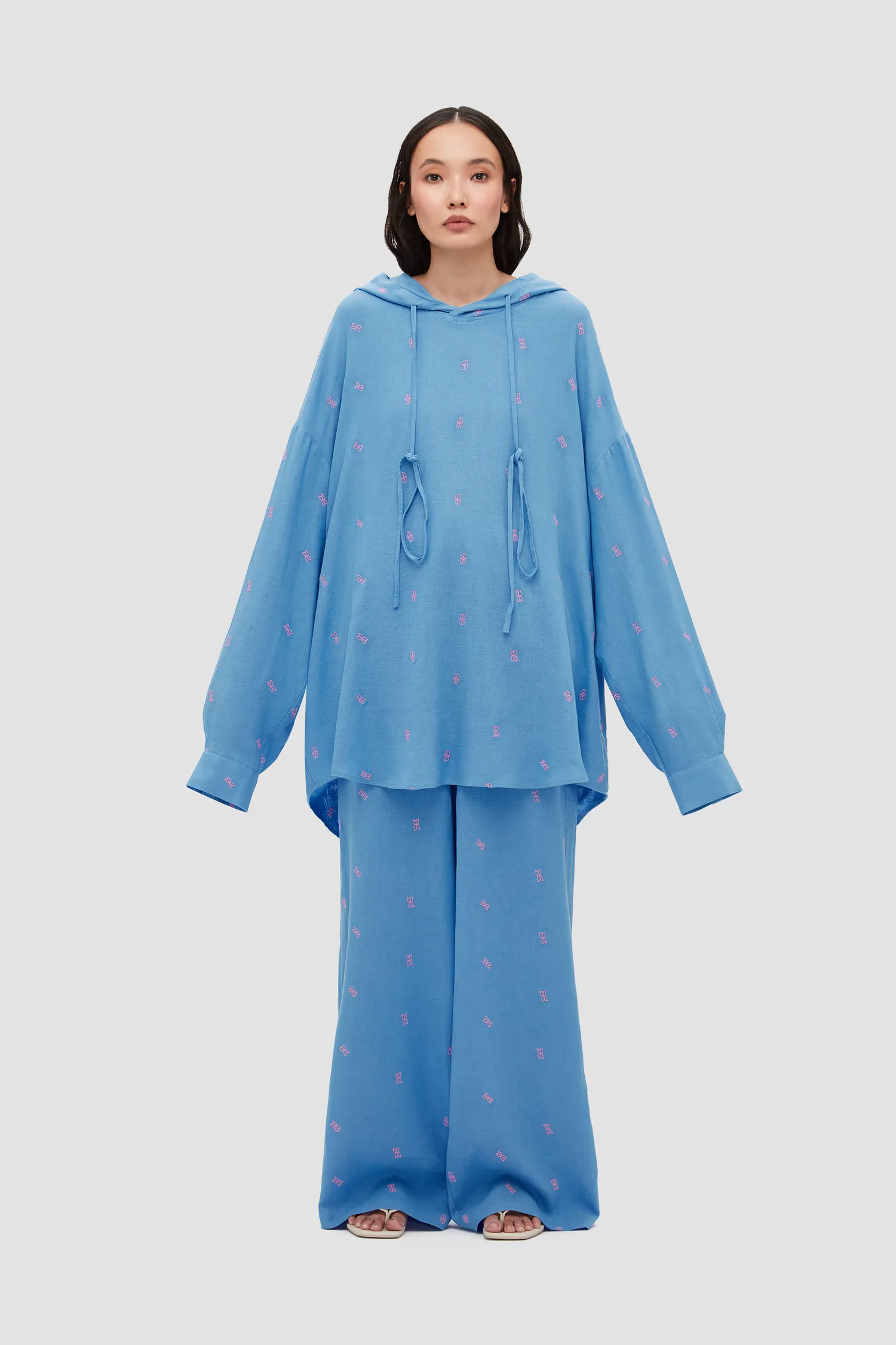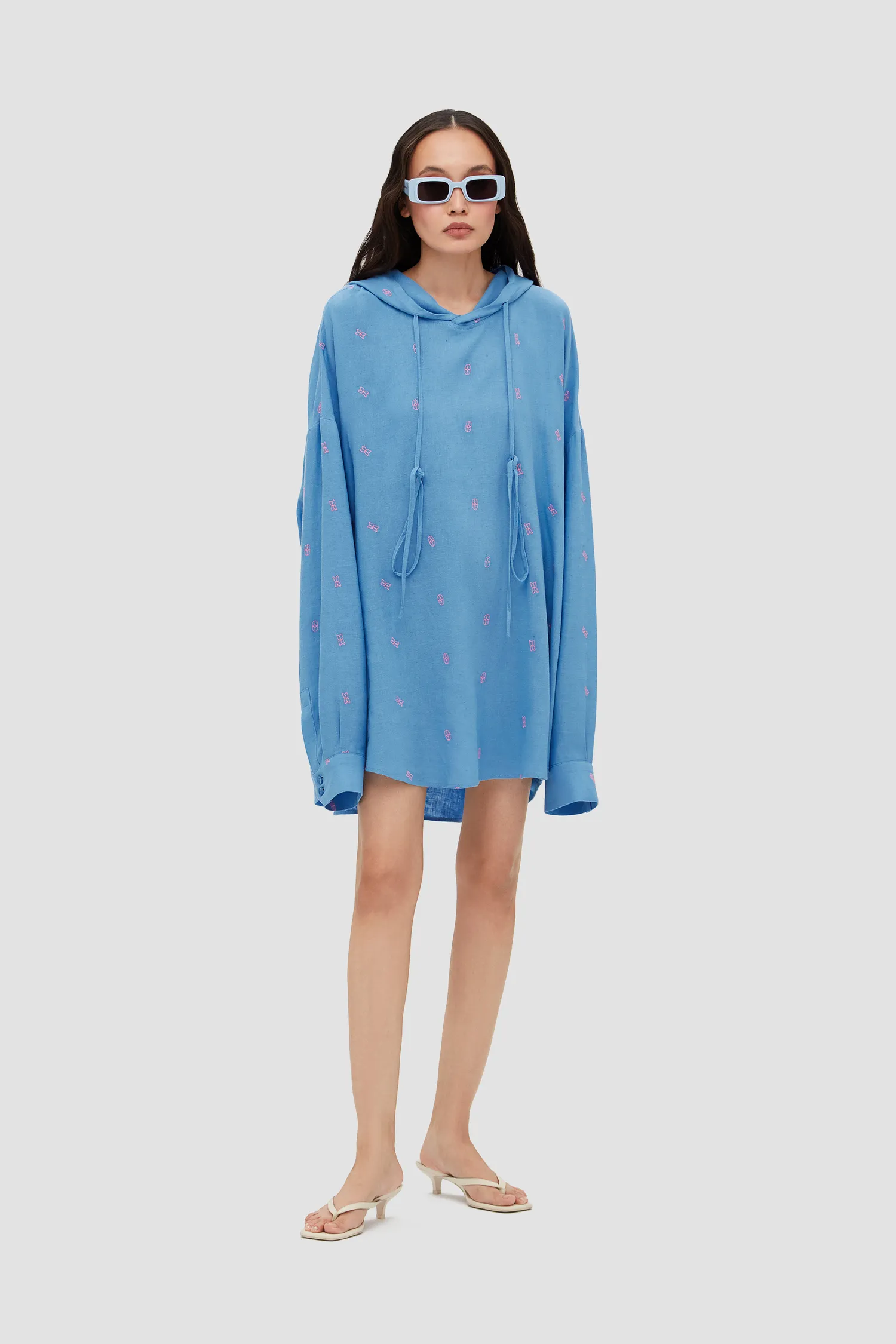 Оверсайз туника с капюшоном на завязках. Легкая дышащая ткань из смеси льна и вискозы, расшитая фирменным паттерном MONOCHROME. Объемные рукава с манжетами на пуговицах. Упаковка в подарочную коробку.