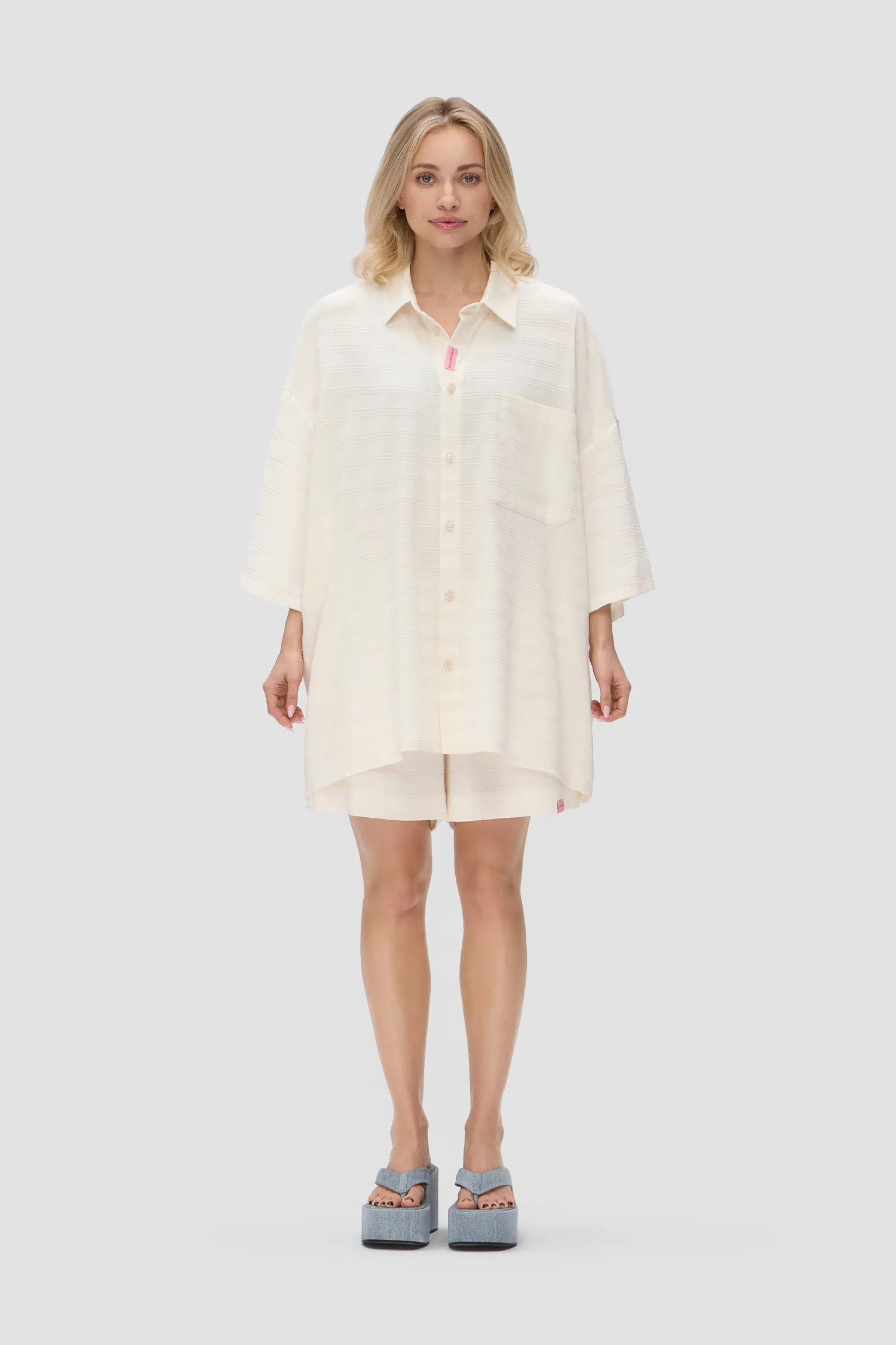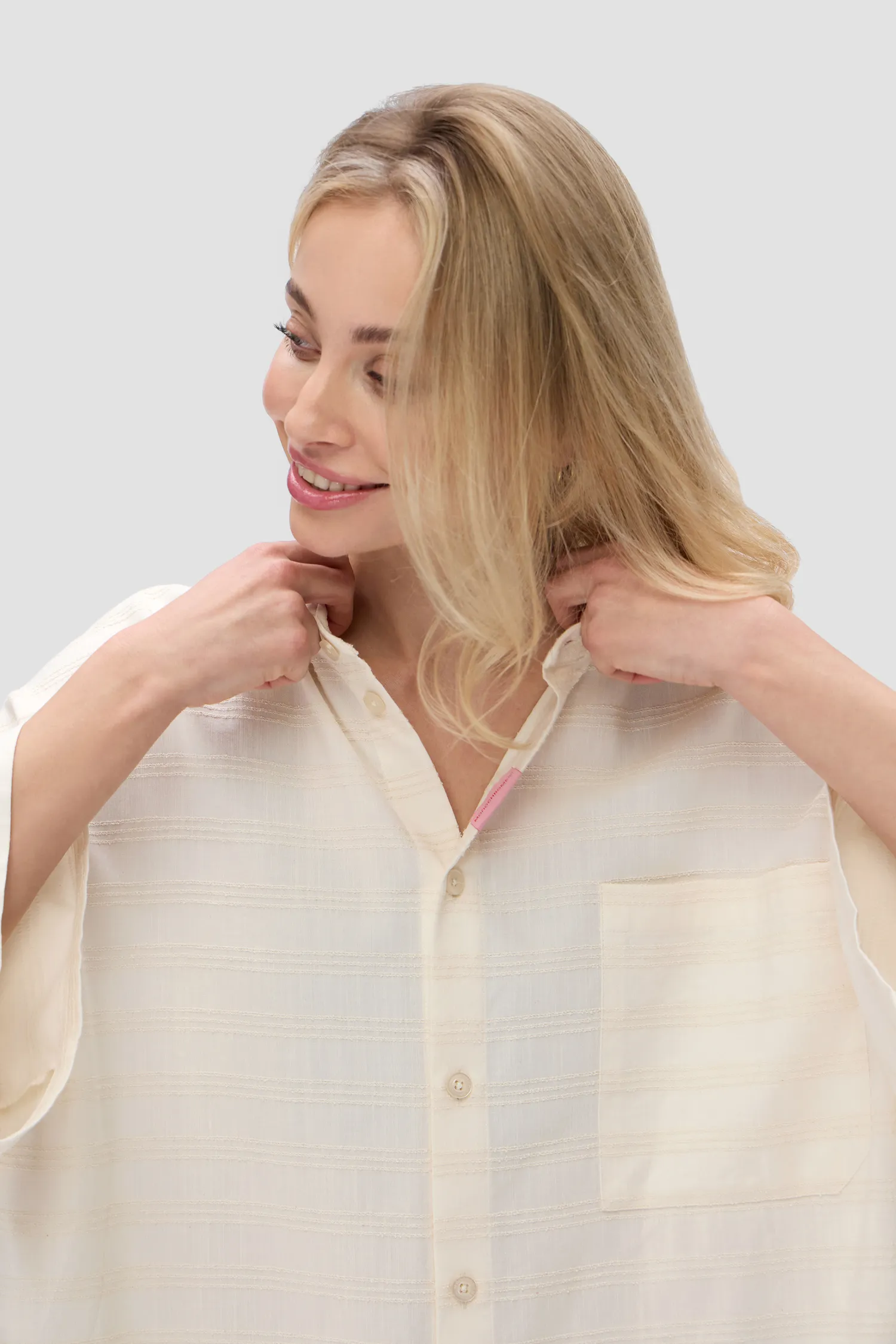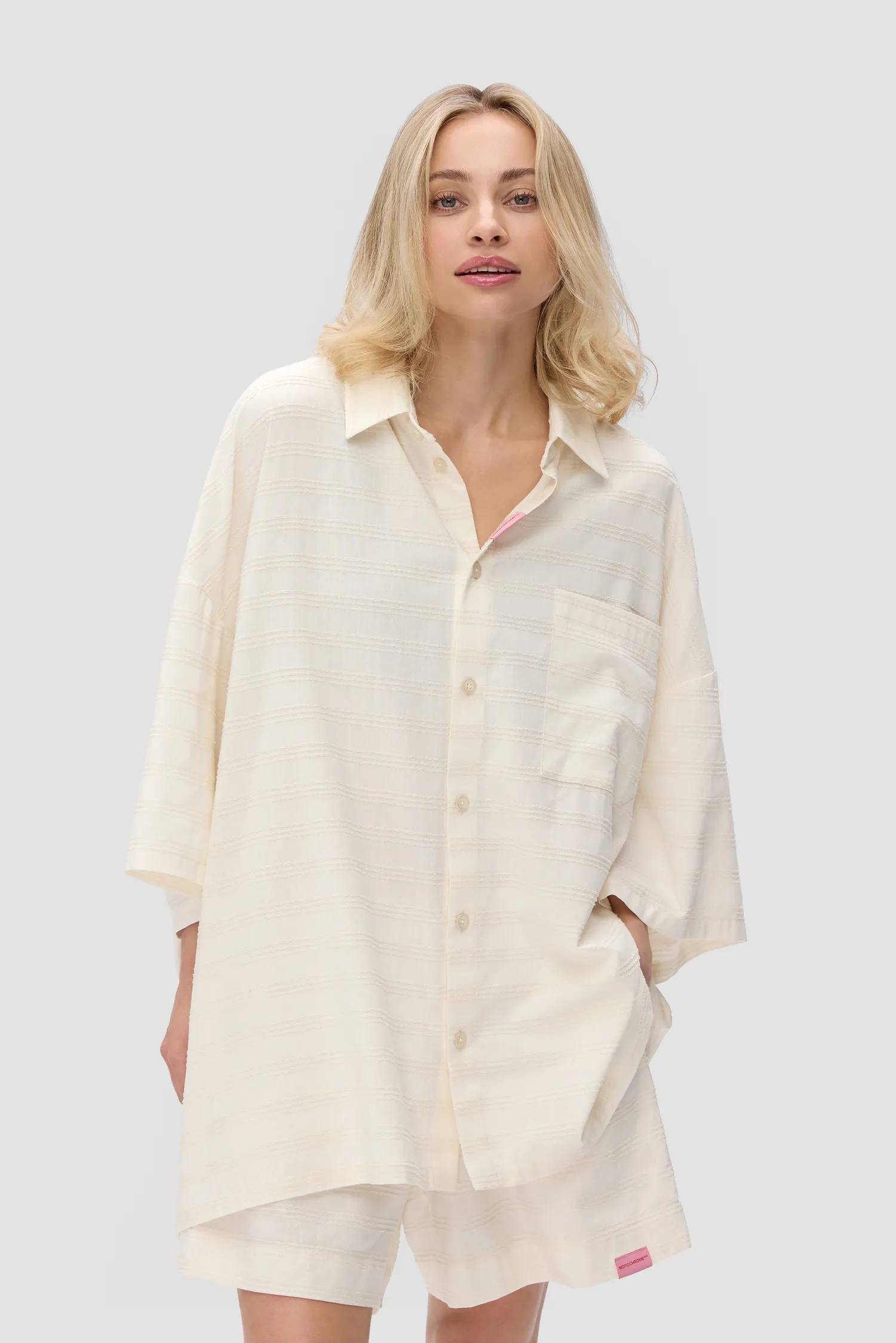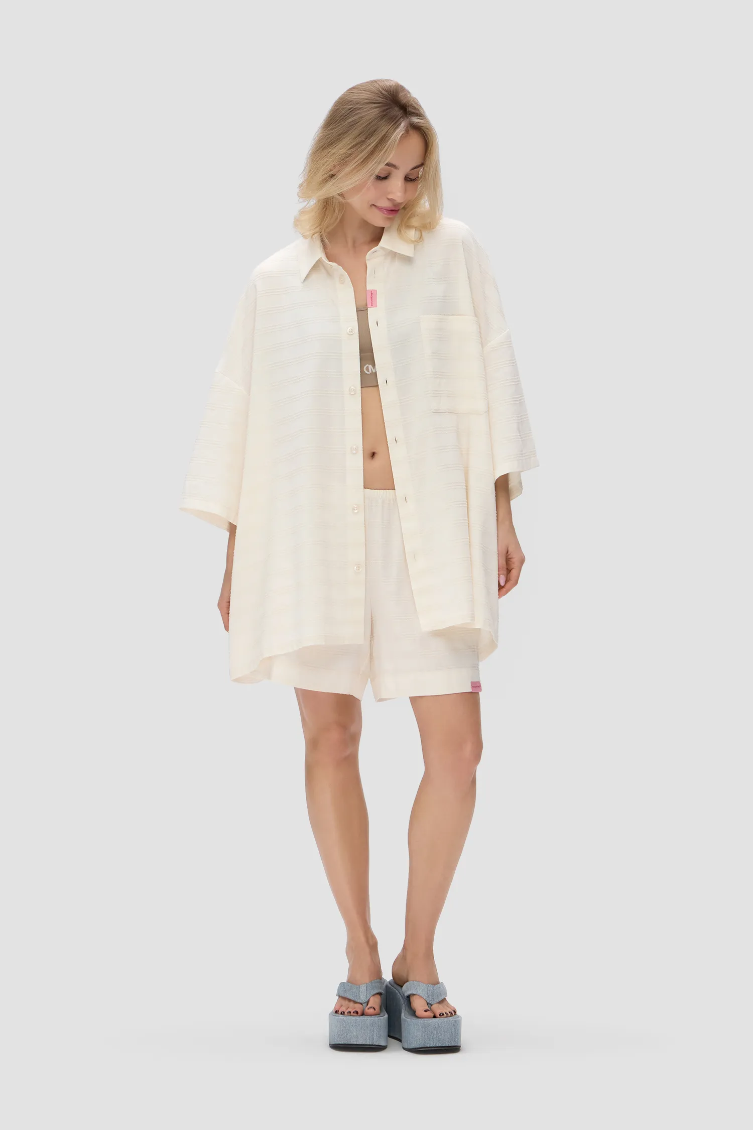 Оверсайз рубашка из смесового хлопка с коротким рукавом из коллекции RESORT. Застежка на пуговицы. Классический воротник. Один нагрудный карман. Легкая дышащая ткань. Onesize&Unisex. Упаковка в подарочную коробку.