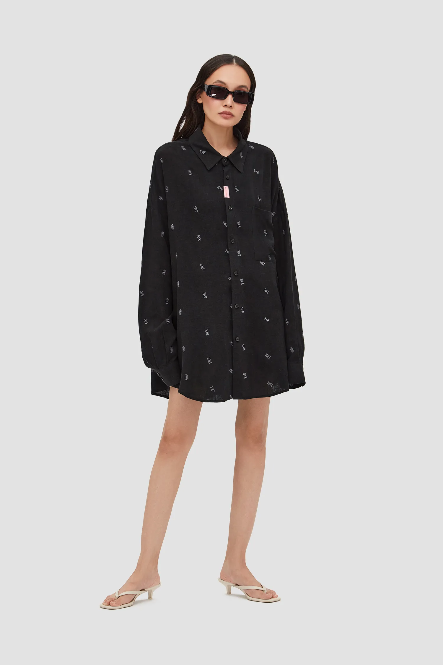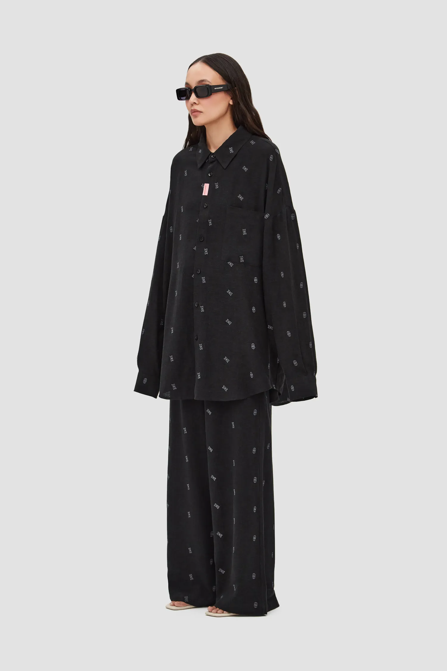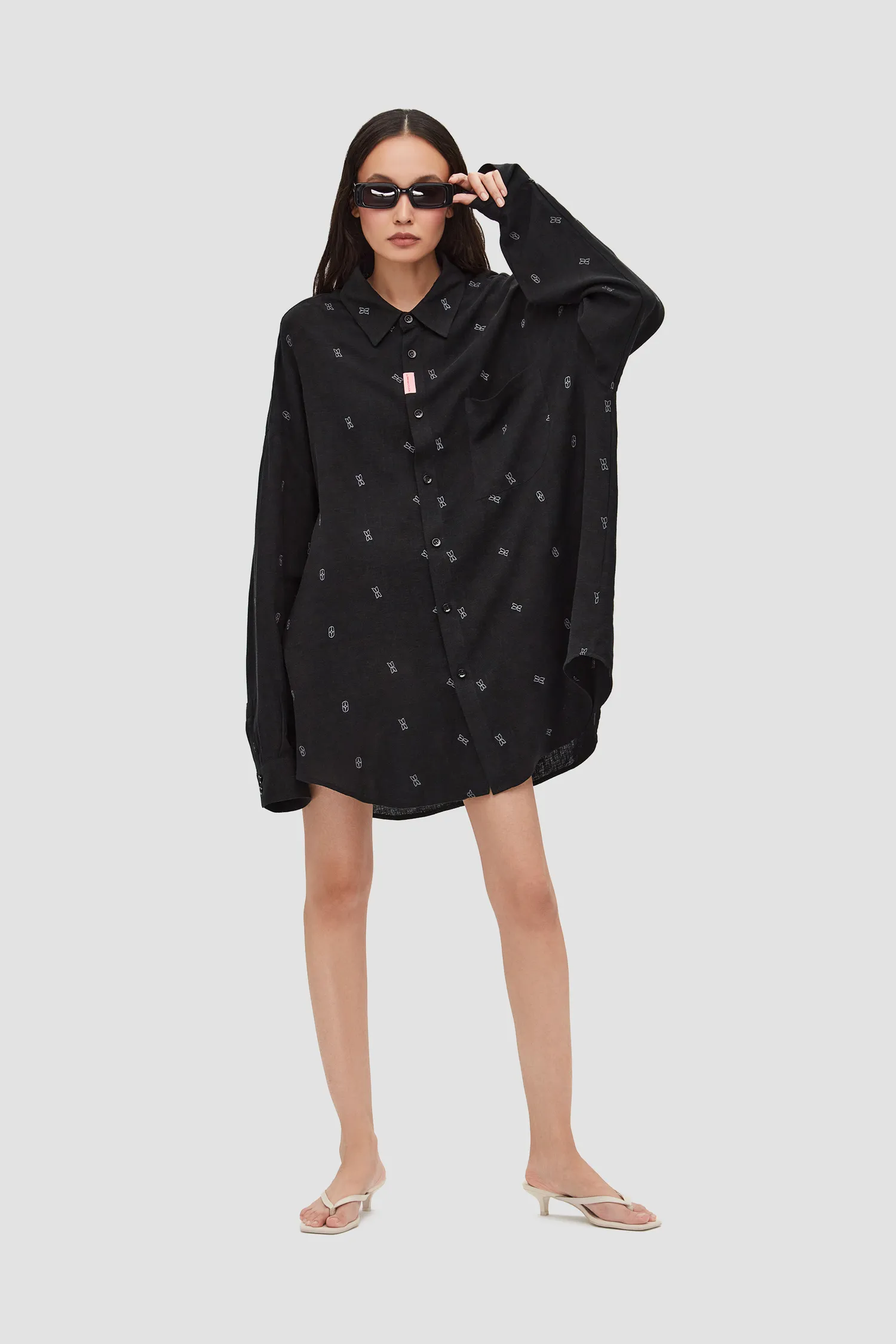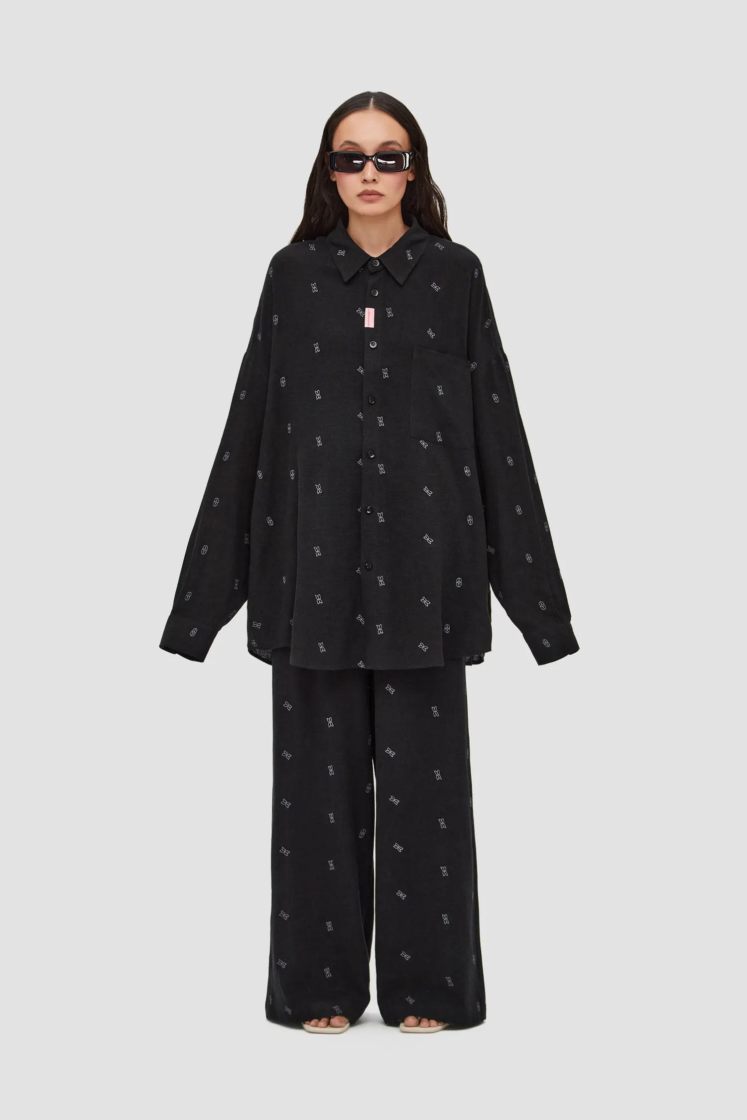 Оверсайз рубашка на пуговицах. Легкая дышащая ткань из смеси льна и вискозы, расшитая фирменным паттерном MONOCHROME. Объемные рукава с манжетами на пуговицах. Нагрудный карман. Упаковка в подарочную коробку.
