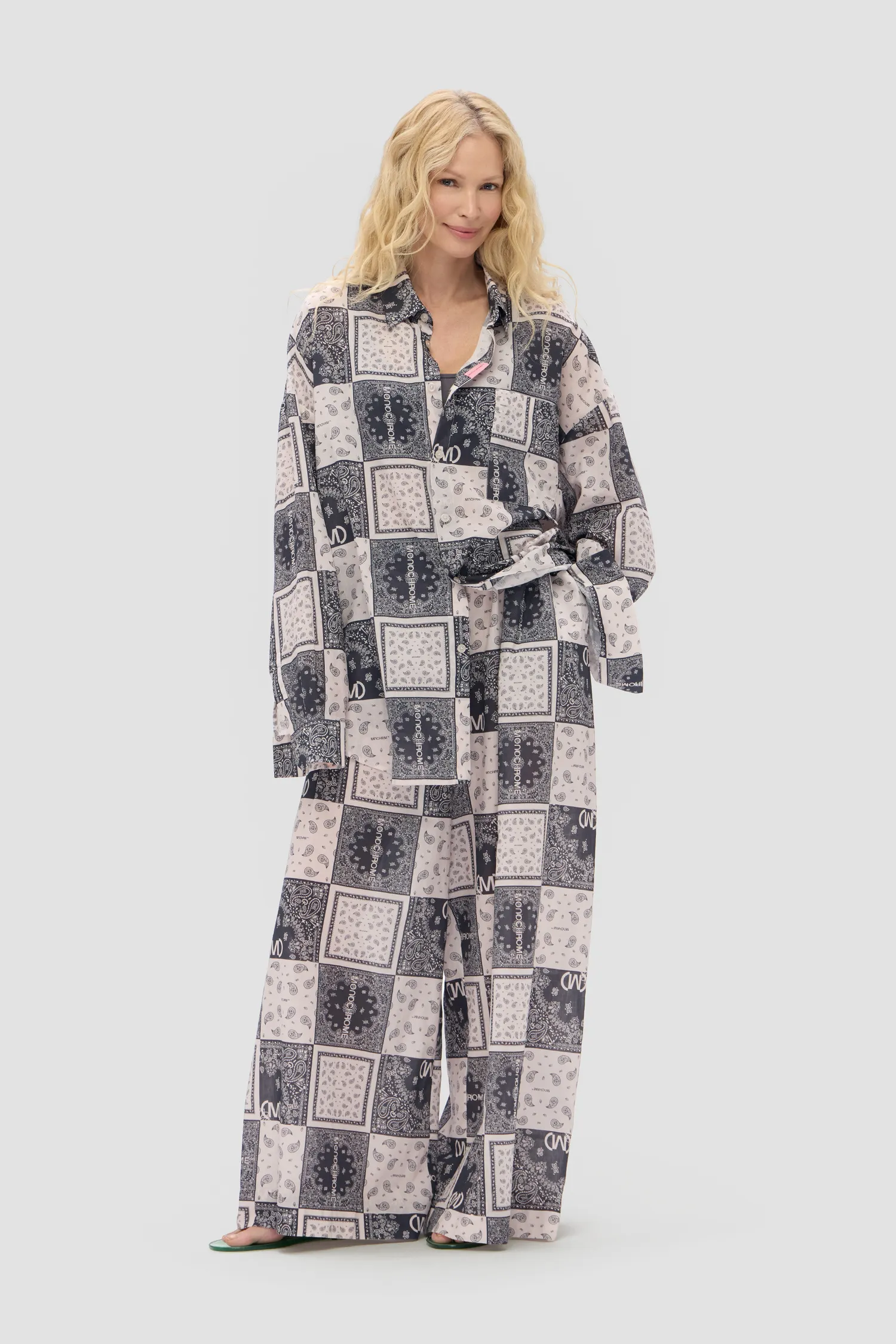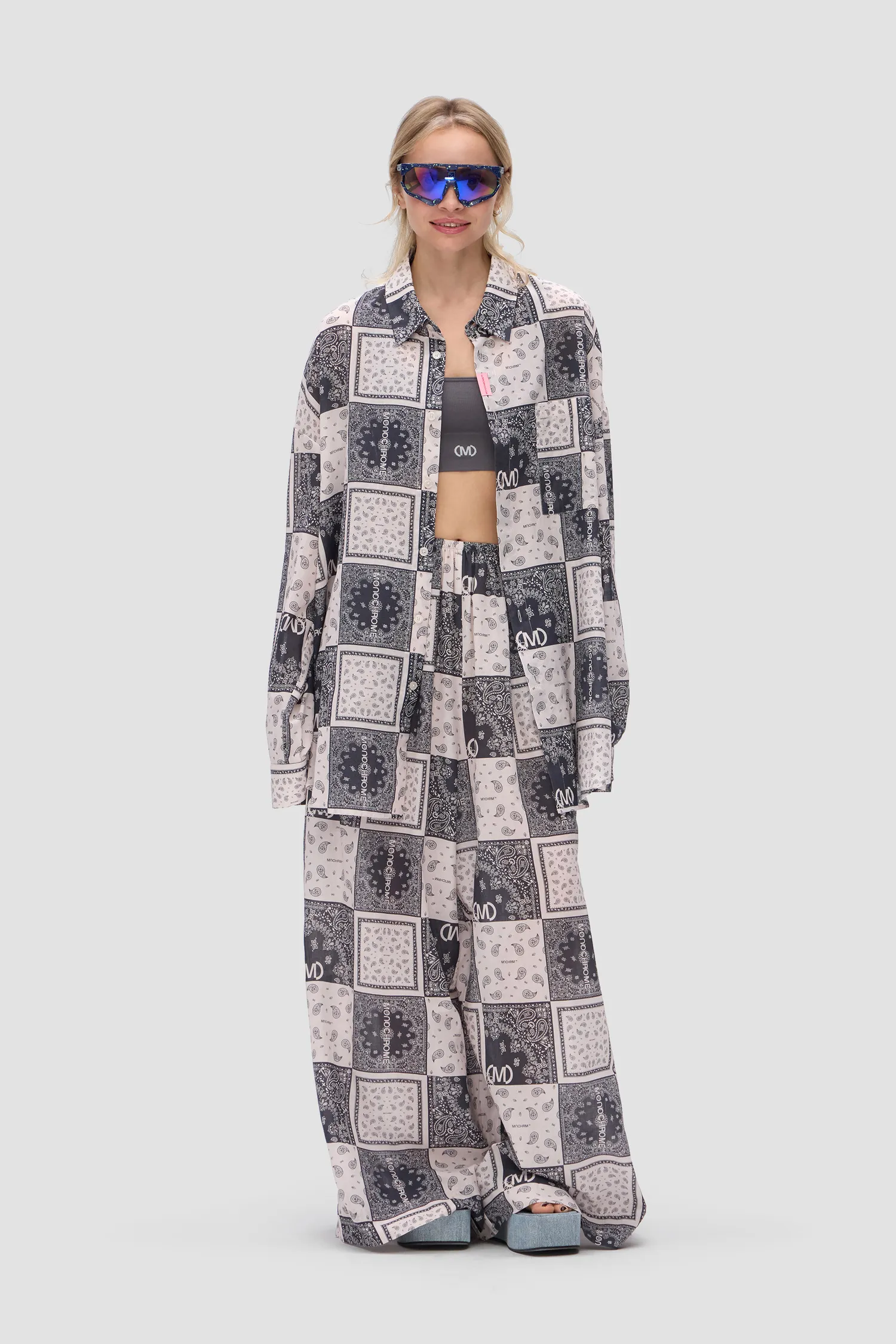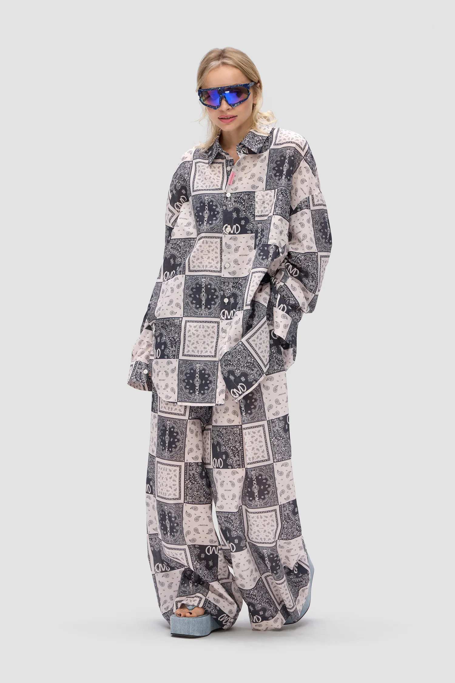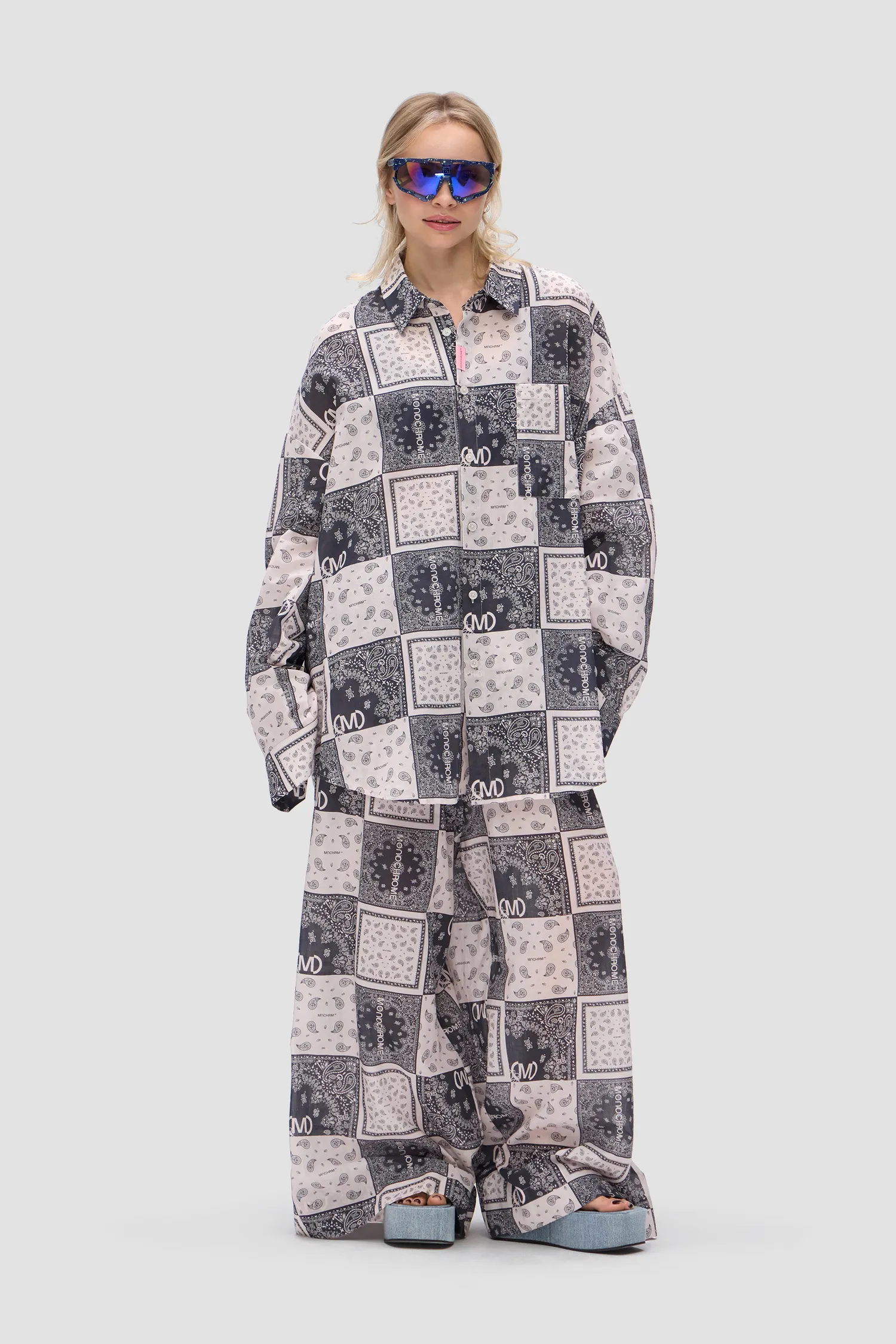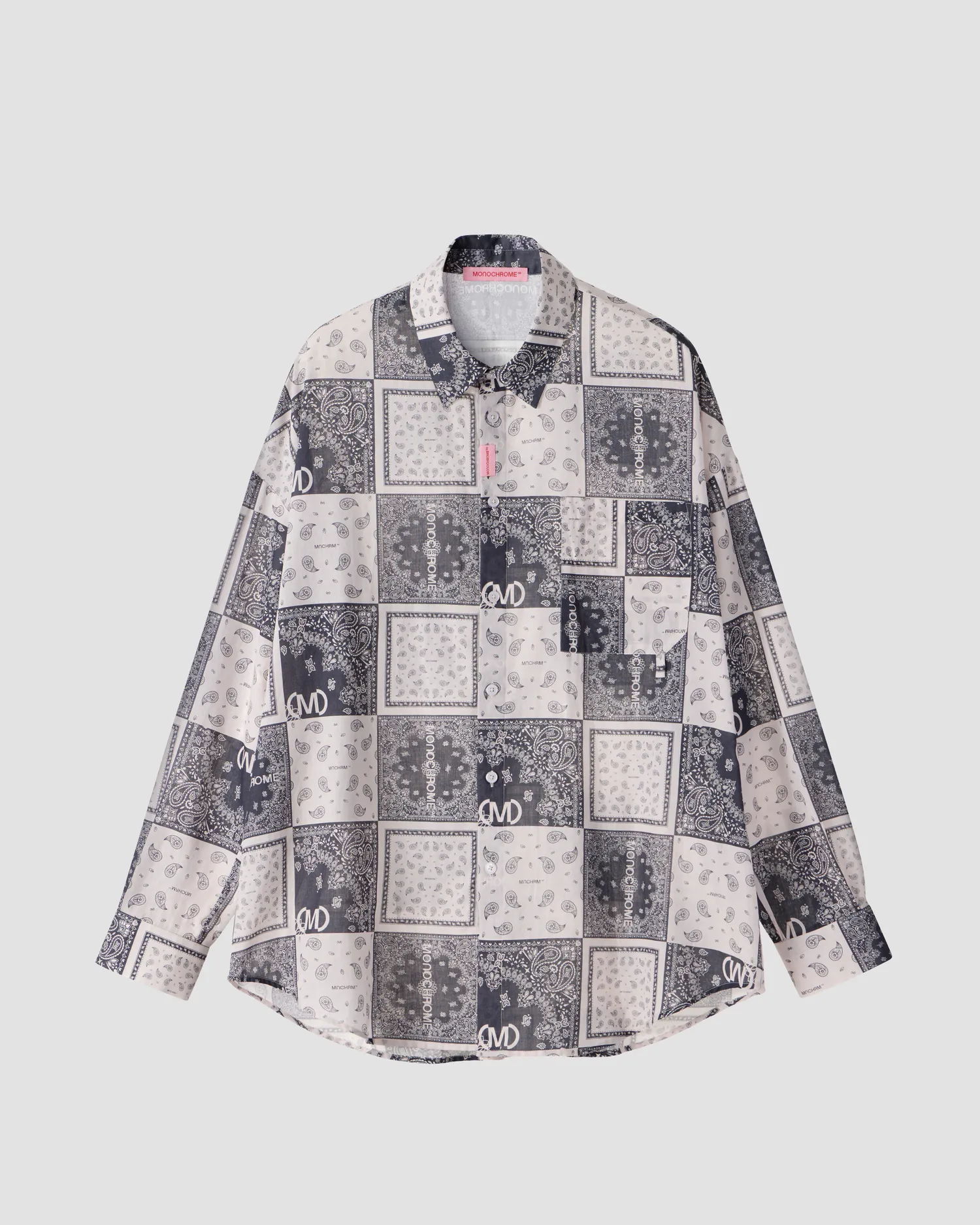 Oversized рубашка с принтом BANDANA черного цвета из 100% хлопка. Объемные рукава с манжетами на пуговицах. Классический воротник и застежка на пуговицы. Нагрудный карман с петелькой для карабина. Жаккардовый флажок розового цвета. Onesize&Unisex. Упаковка в подарочную коробку.