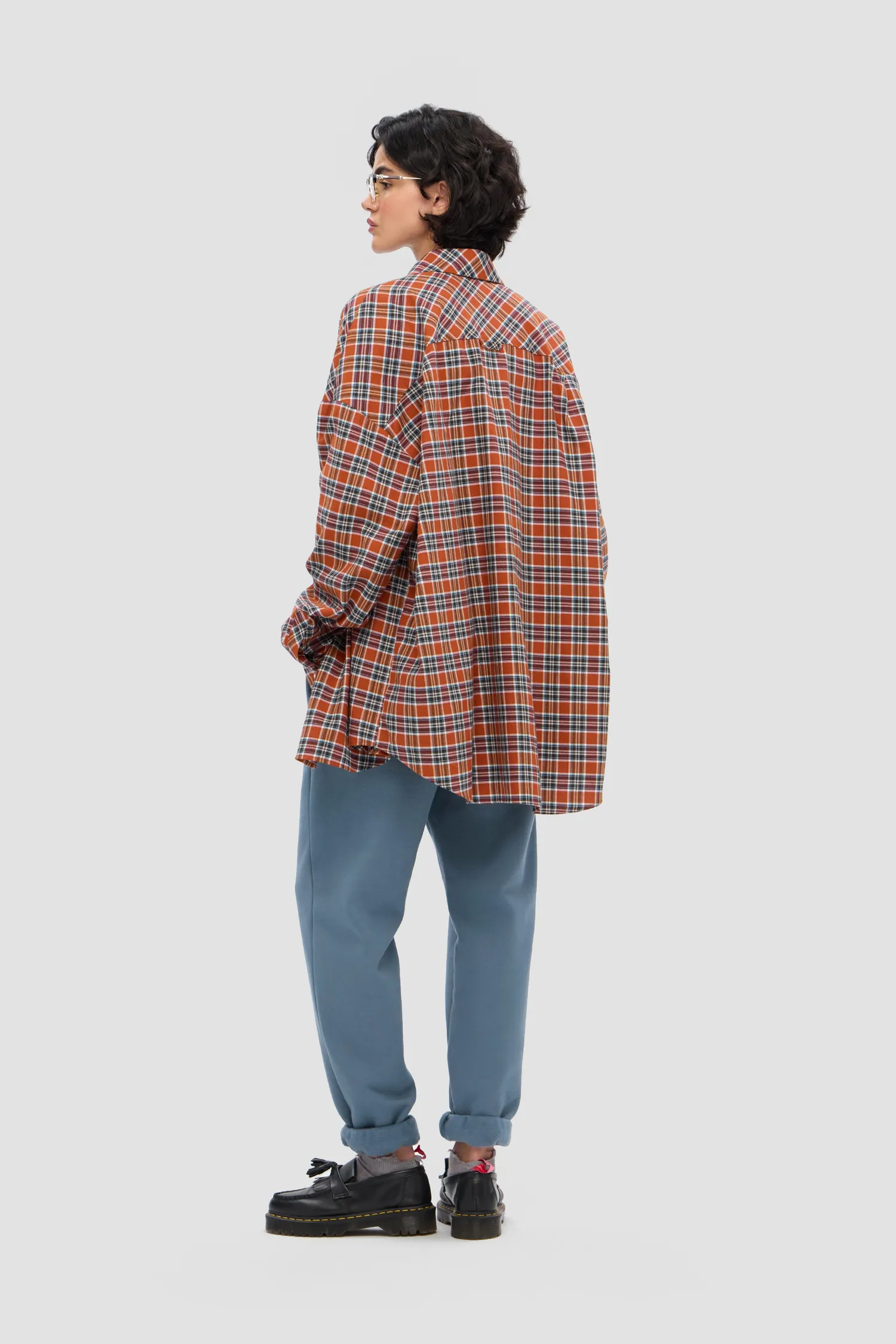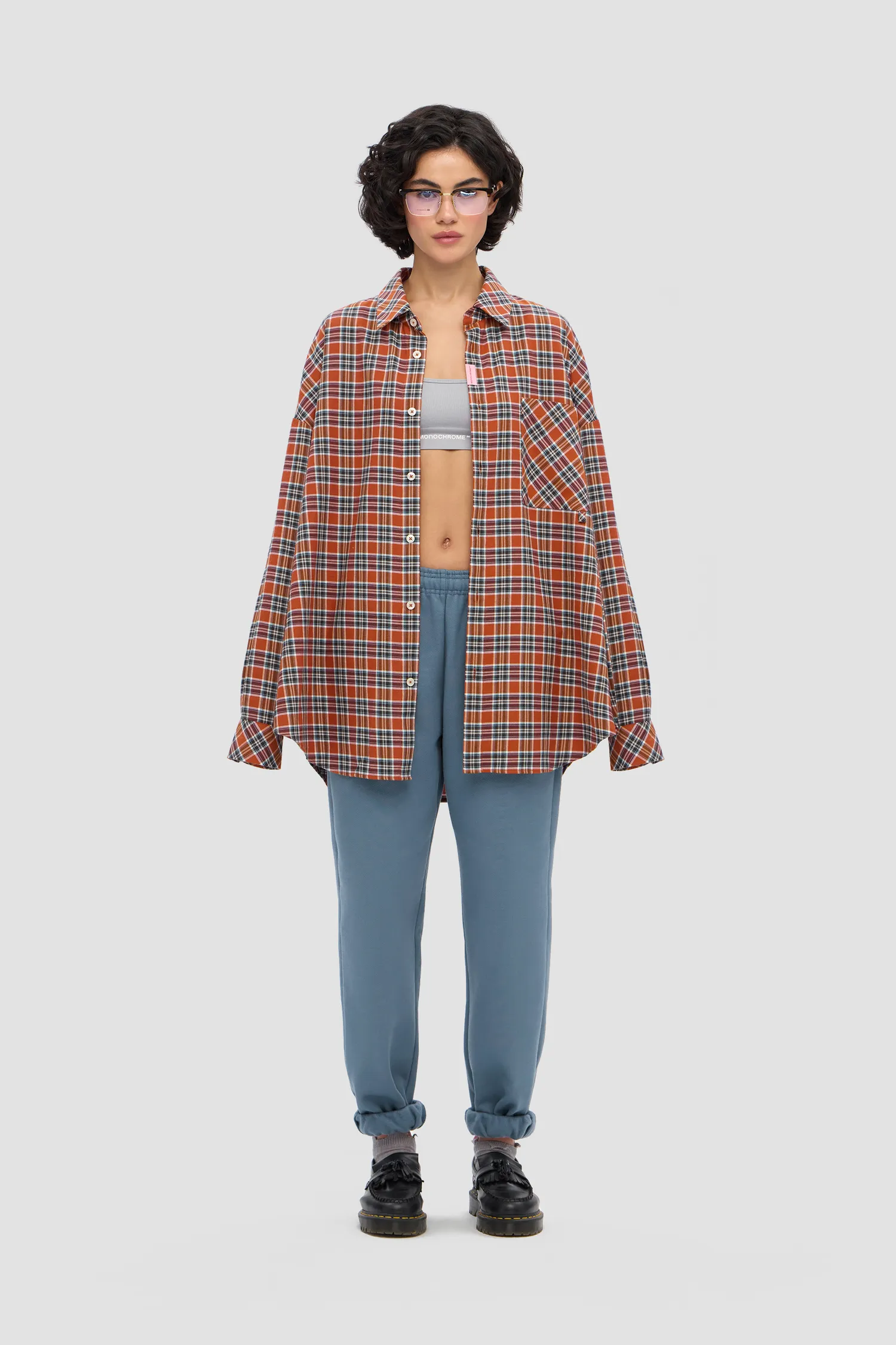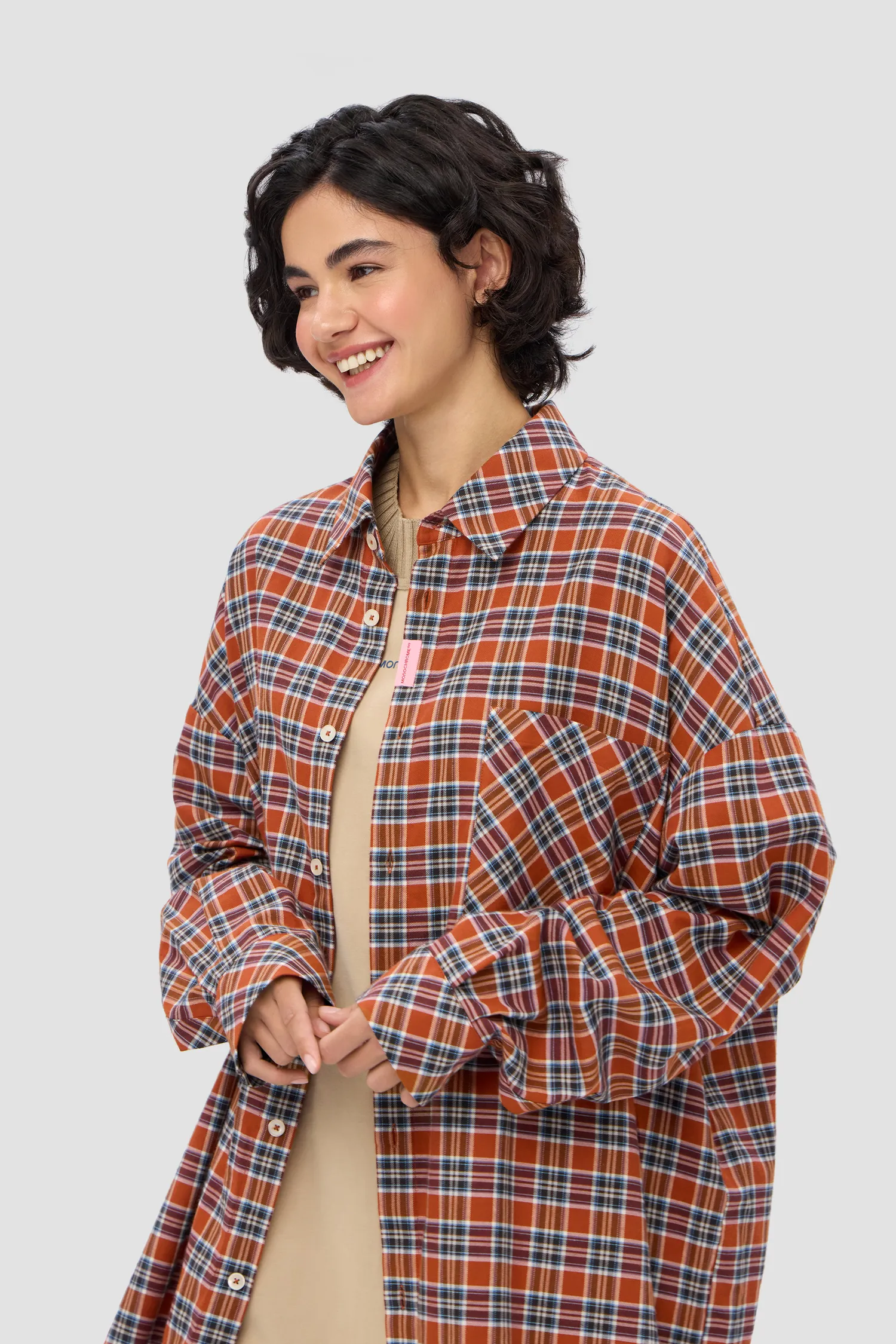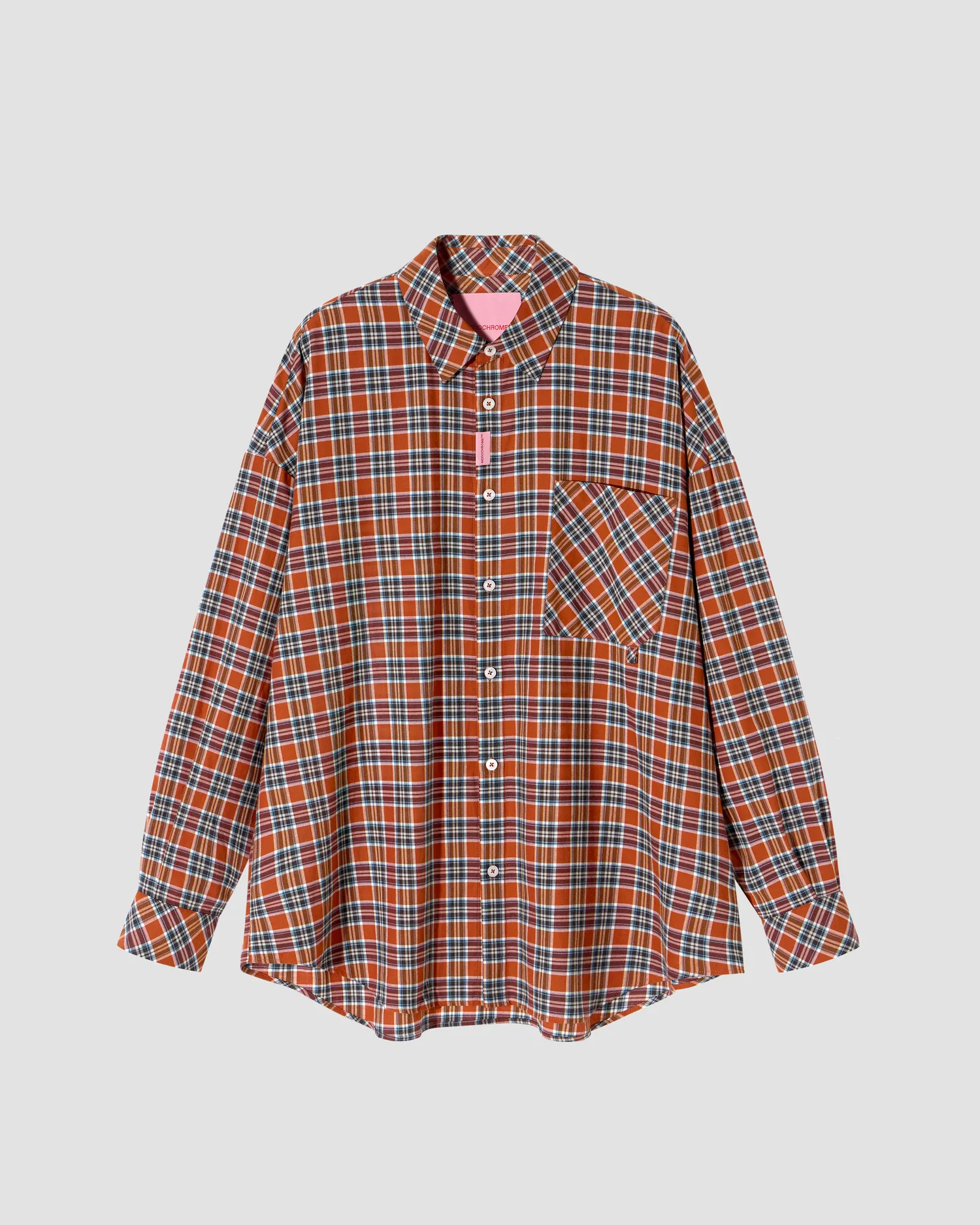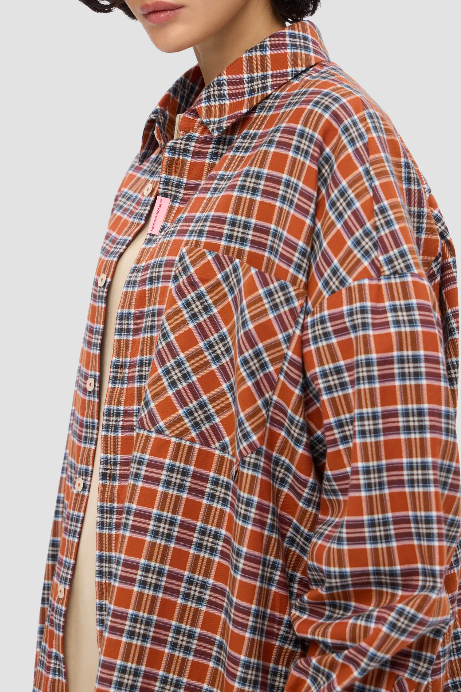 Oversize рубашка в клетку из 100% хлопка. Объемные рукава с манжетами на пуговицах. Классический воротник и застежка на пуговицы. Закругленный подол. Один нагрудный карман. Петелька для карабина кармане. Жаккардовый флажок розового цвета. Упаковка в подарочную коробку.