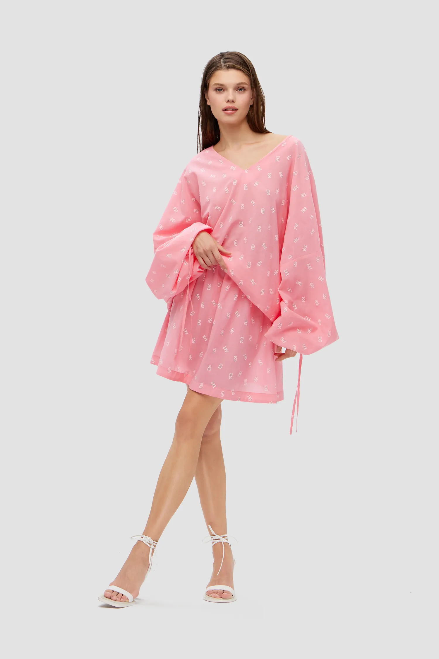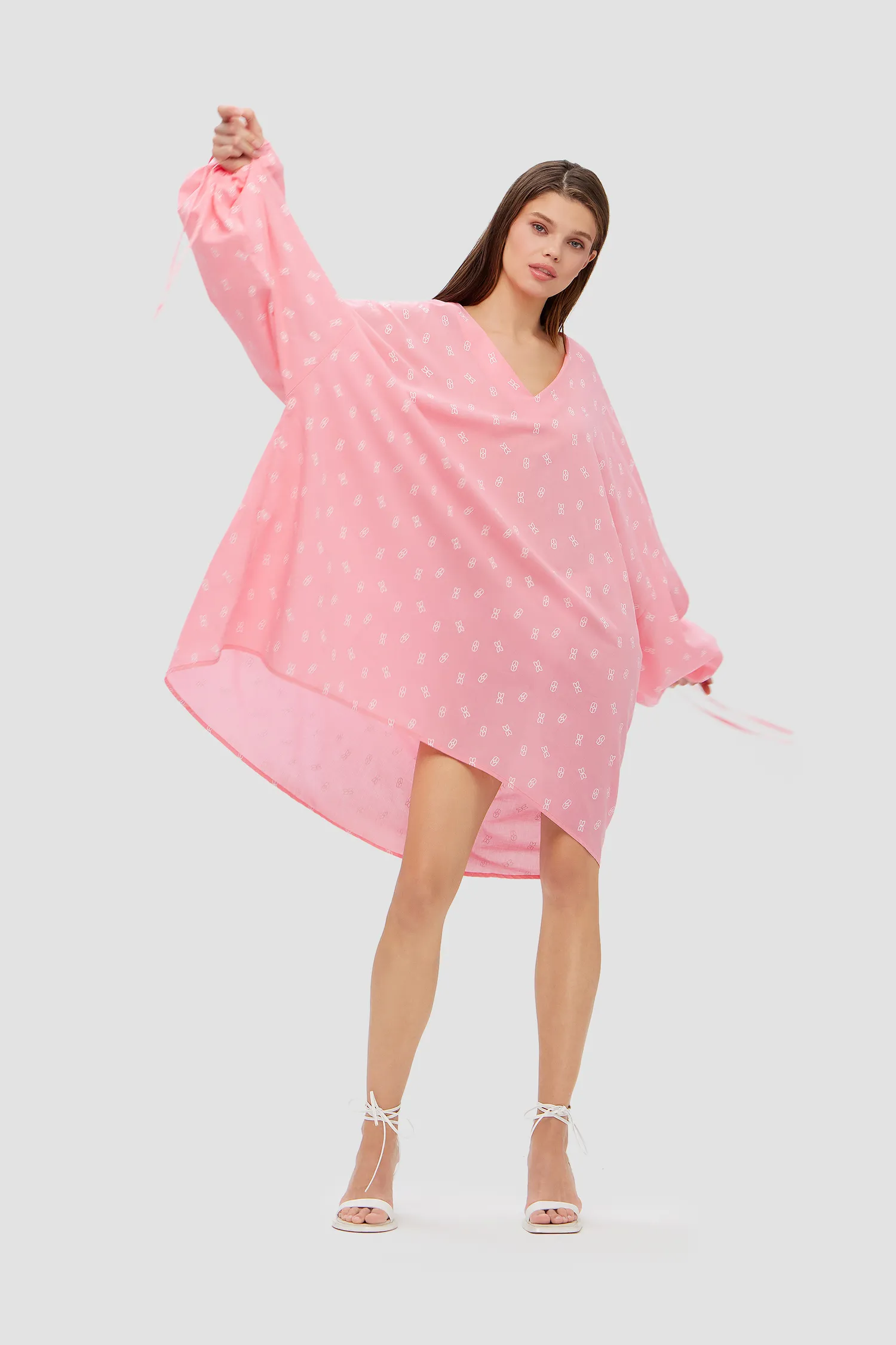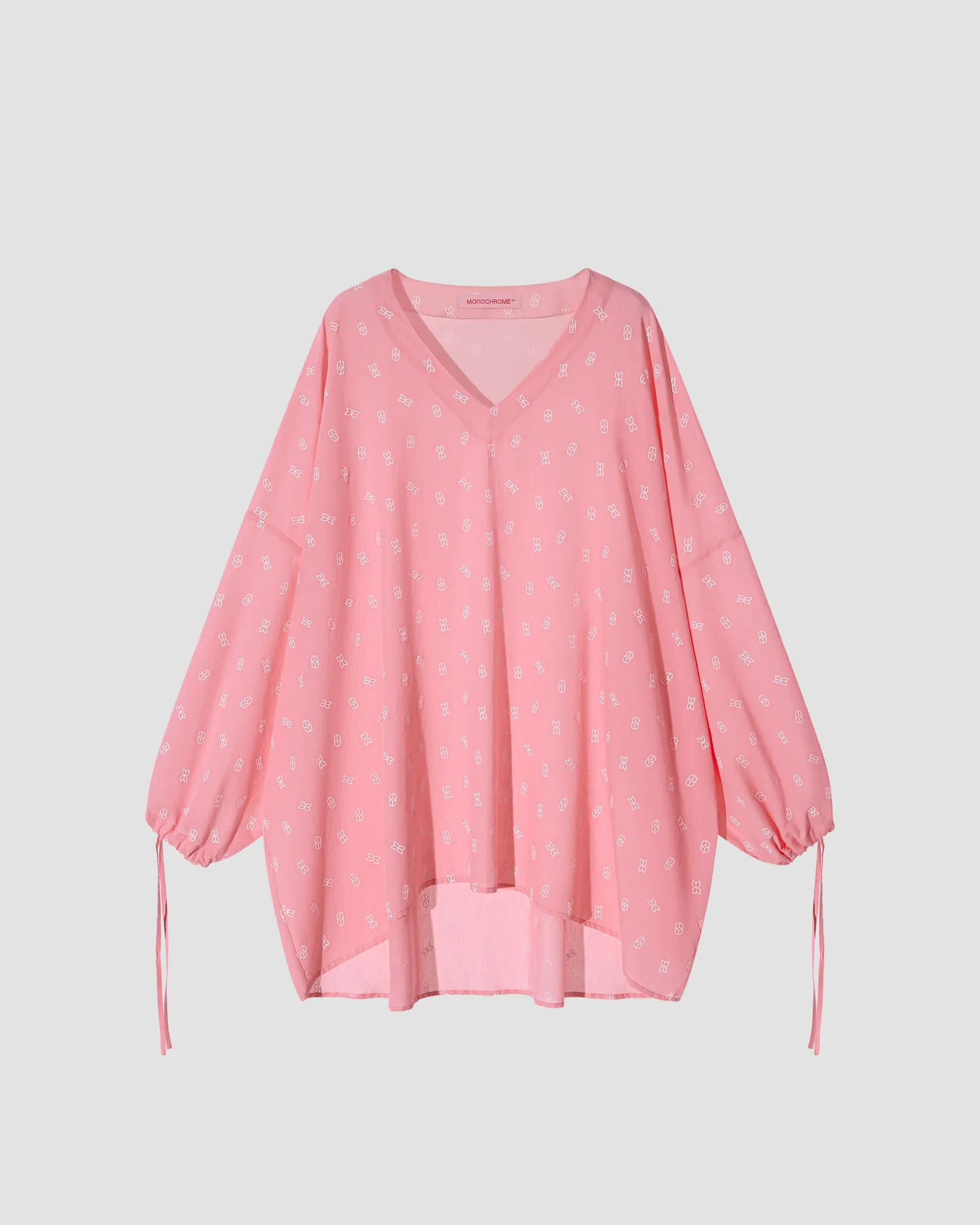 Оверсайз туника из 100% хлопка. V-образный вырез. Объемные рукава с завязками на запястье. Удлиненная спинка. Легкая дышащая ткань с принтом в виде элемента фирменного паттерна MONOCHROME. Скрытая петелька в рукавах, чтобы можно было укоротить длину. Сделано в России на собственной мануфактуре MONOCHROME.