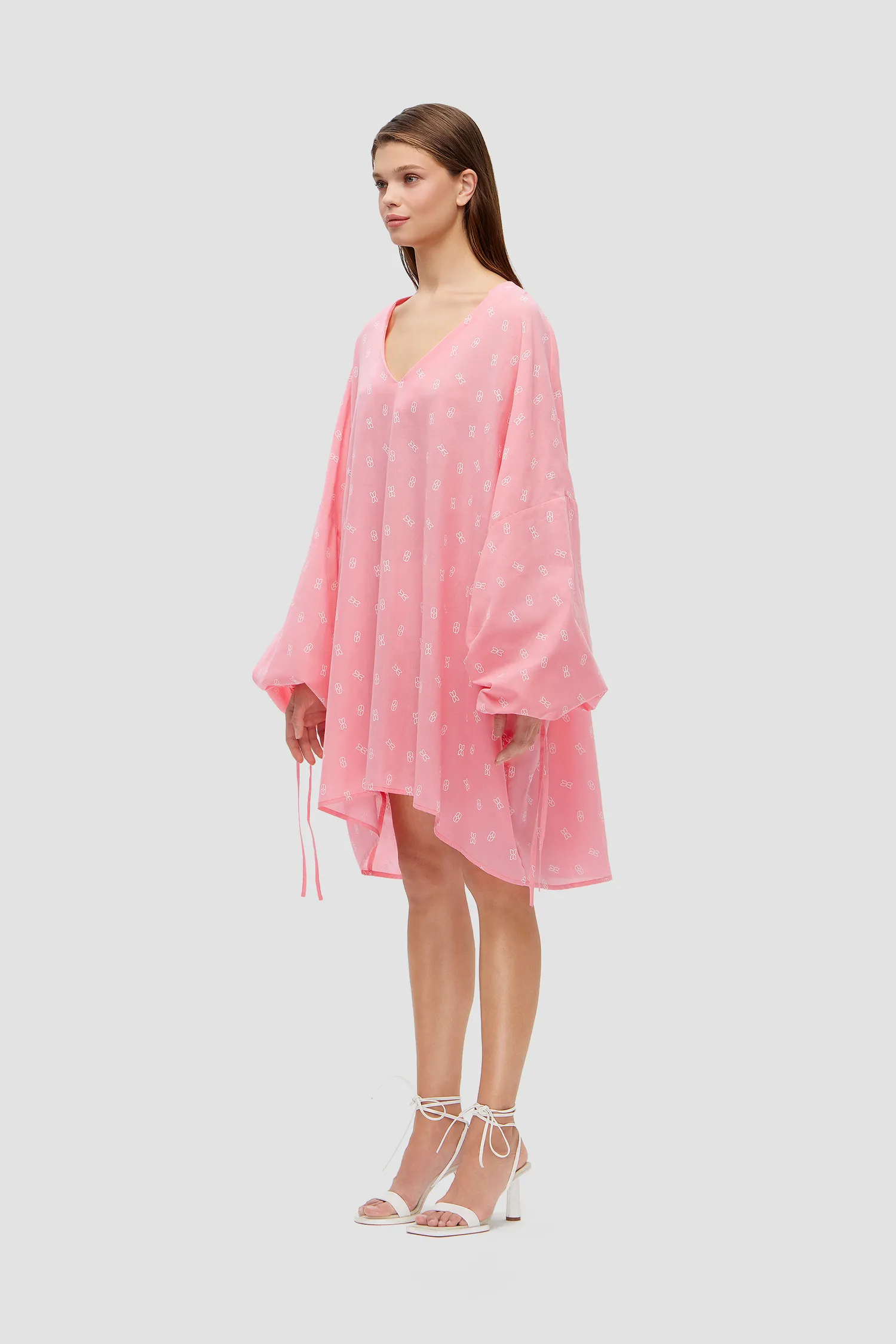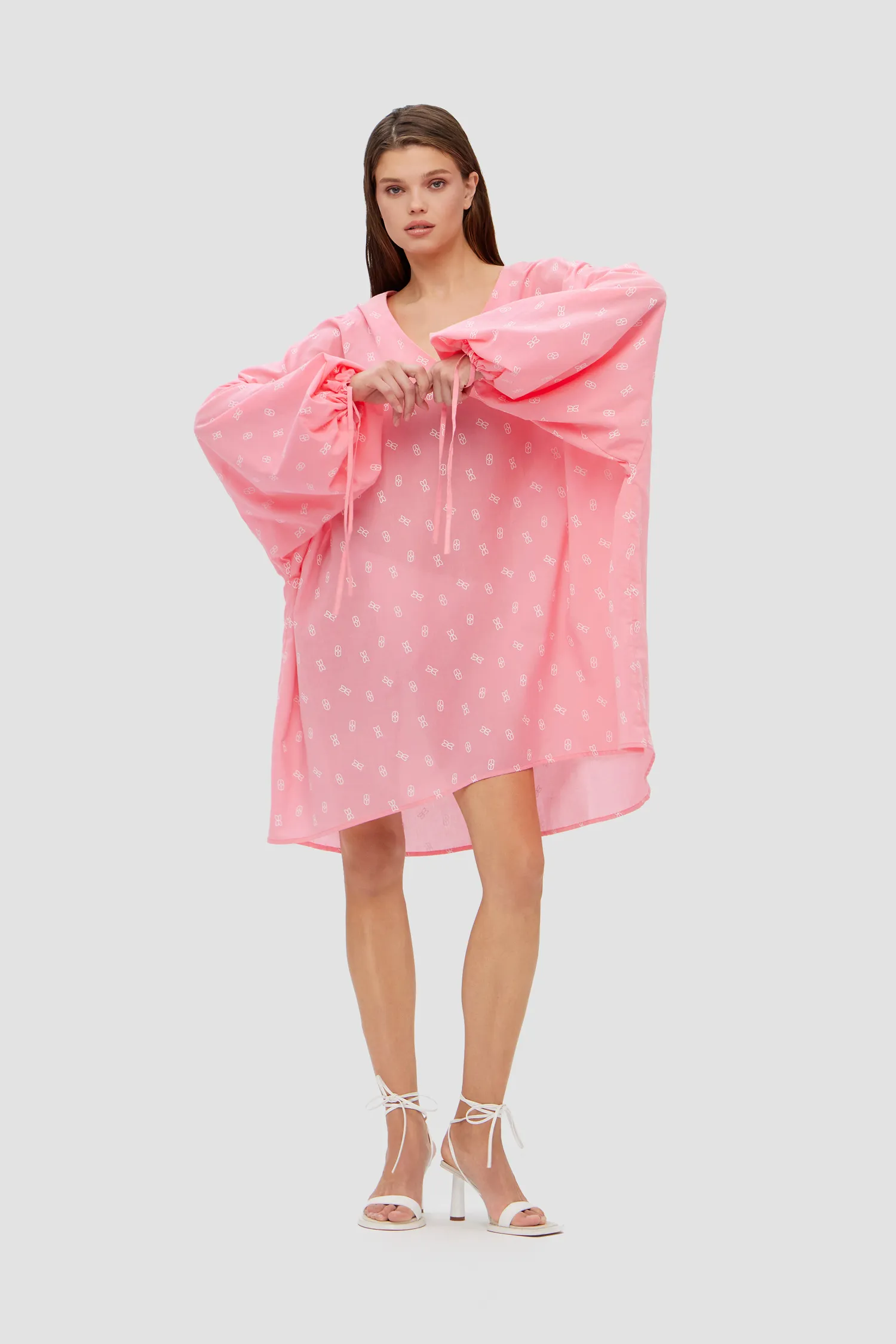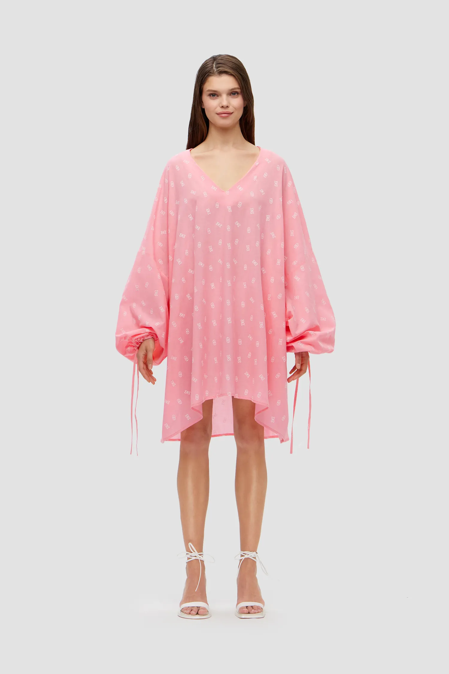 Оверсайз туника из 100% хлопка. V-образный вырез. Объемные рукава с завязками на запястье. Удлиненная спинка. Легкая дышащая ткань с принтом в виде элемента фирменного паттерна MONOCHROME. Скрытая петелька в рукавах, чтобы можно было укоротить длину. Сделано в России на собственной мануфактуре MONOCHROME.