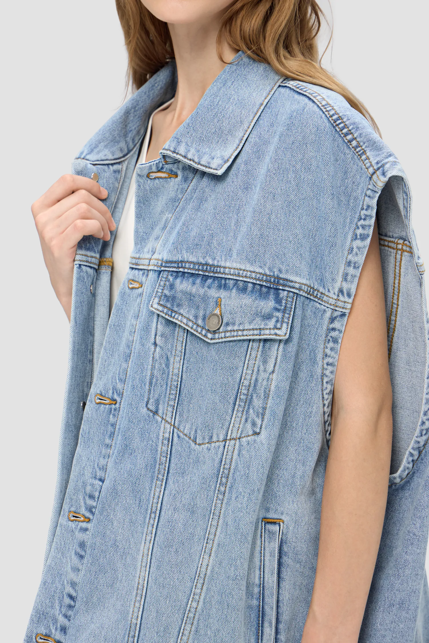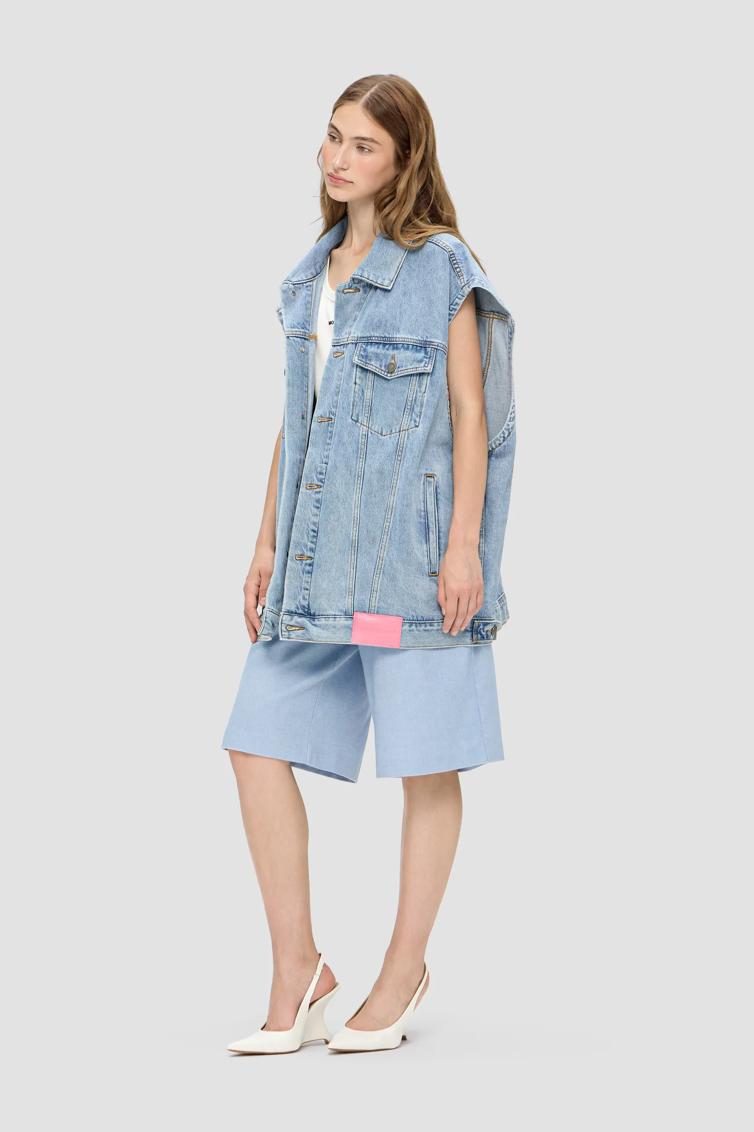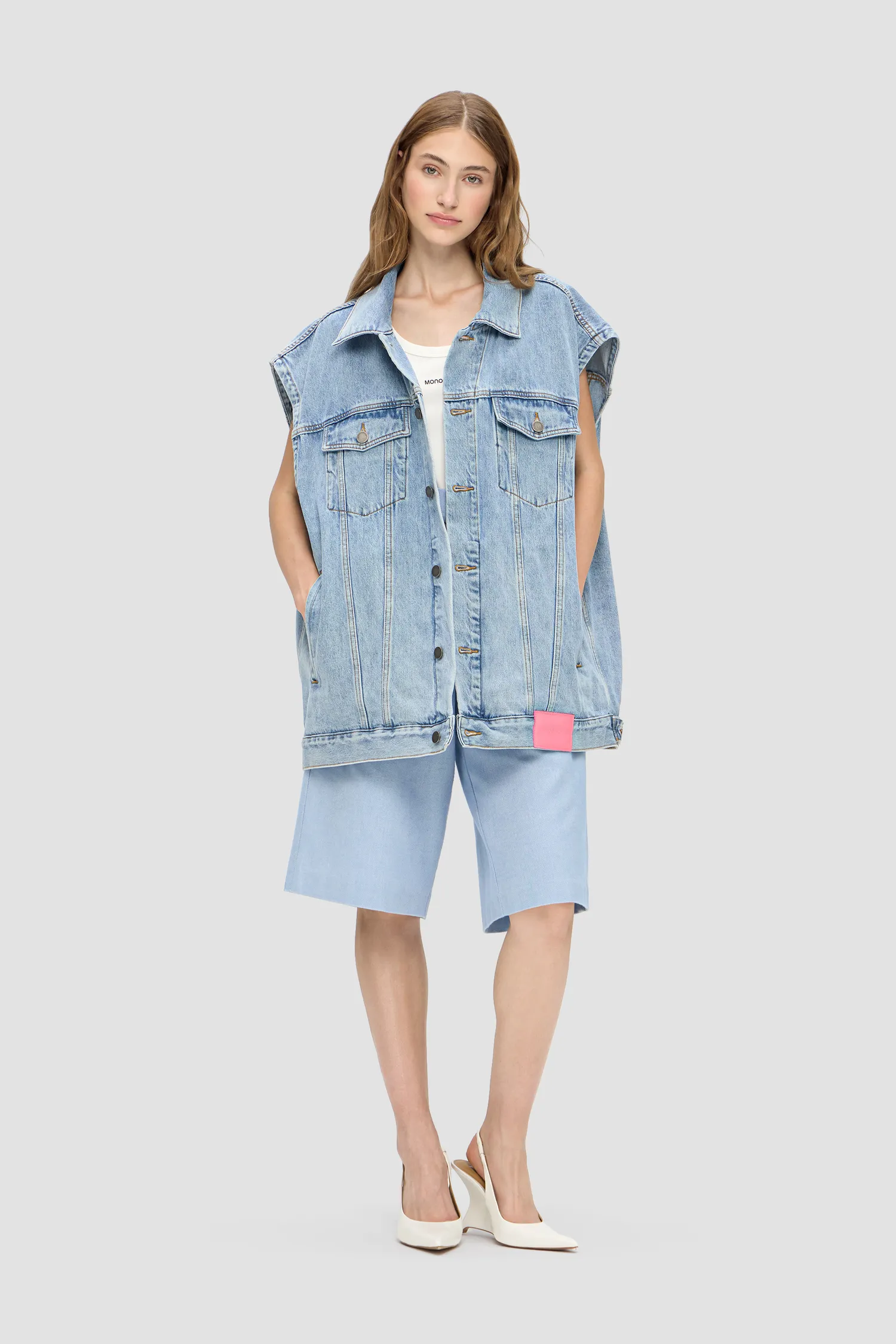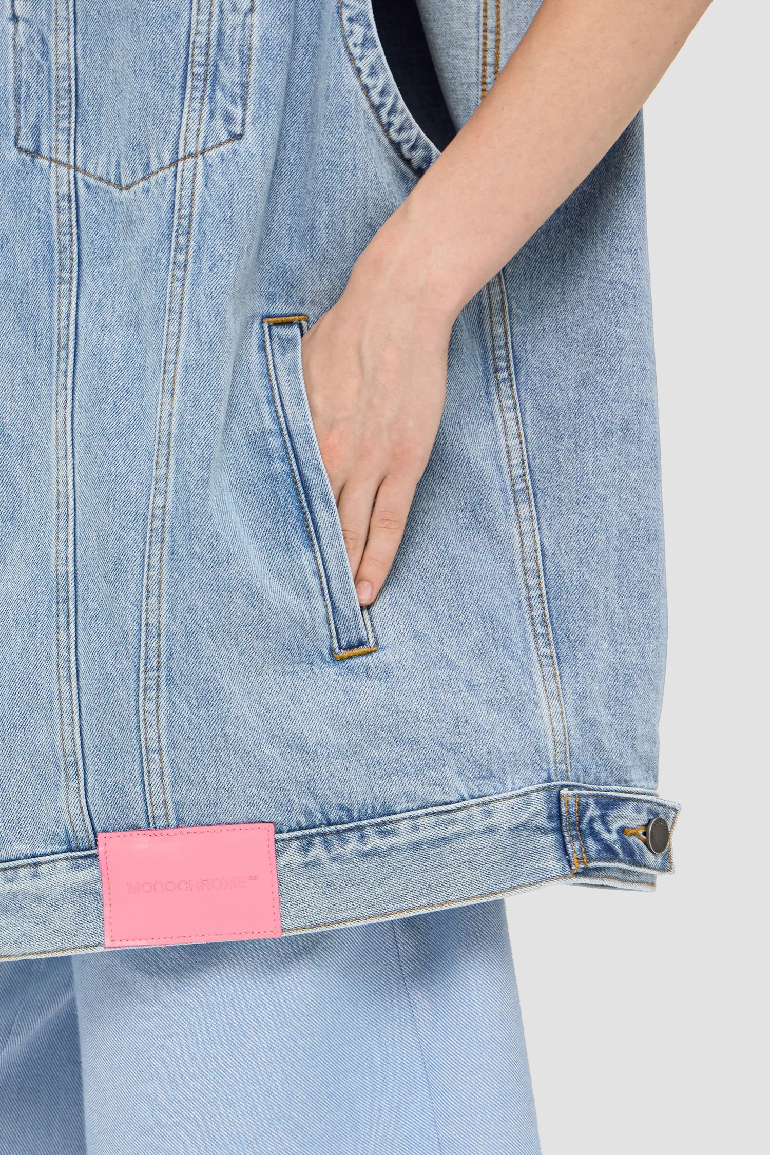 Оверсайз джинсовый жилет прямого кроя из смесового хлопка. Отложной воротник. Застежка на брендированные пуговицы. Два нагрудных кармана, два скрытых боковых. Кожаный розовый лейбл спереди. Onesize&Unisex. Упаковка в подарочную коробку.