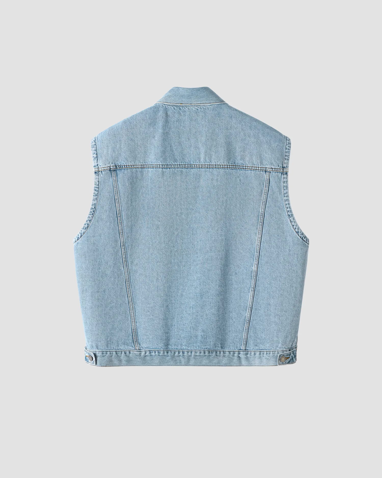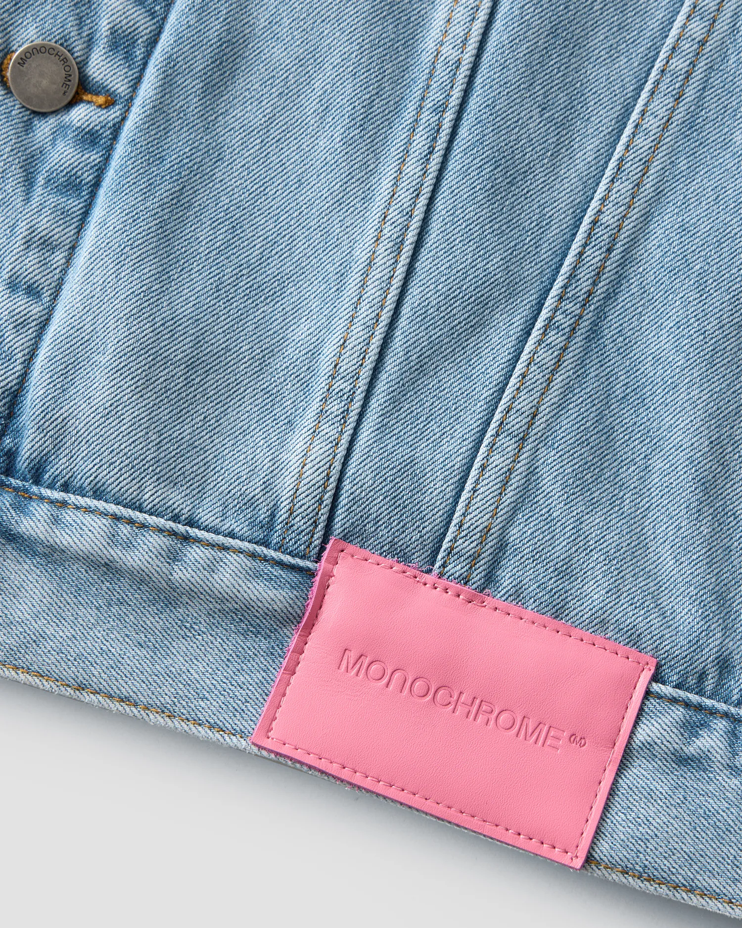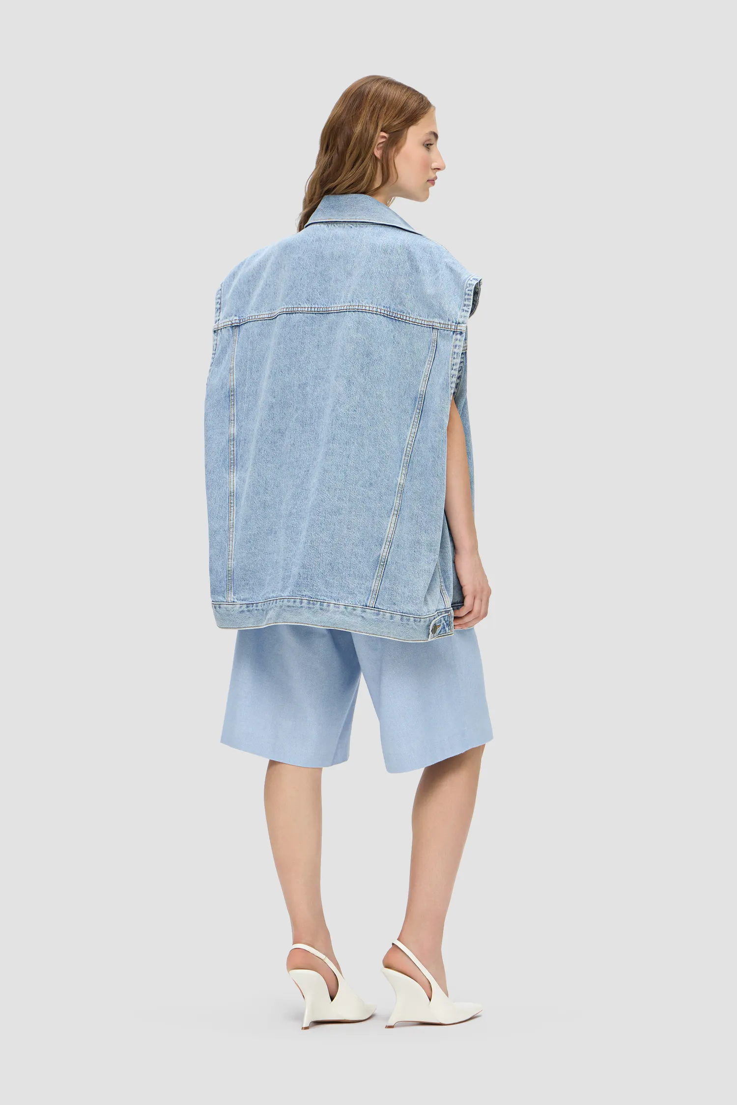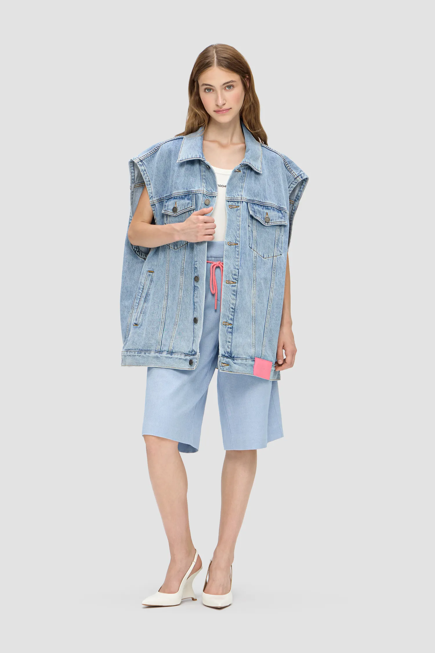 Оверсайз джинсовый жилет прямого кроя из смесового хлопка. Отложной воротник. Застежка на брендированные пуговицы. Два нагрудных кармана, два скрытых боковых. Кожаный розовый лейбл спереди. Onesize&Unisex. Упаковка в подарочную коробку.