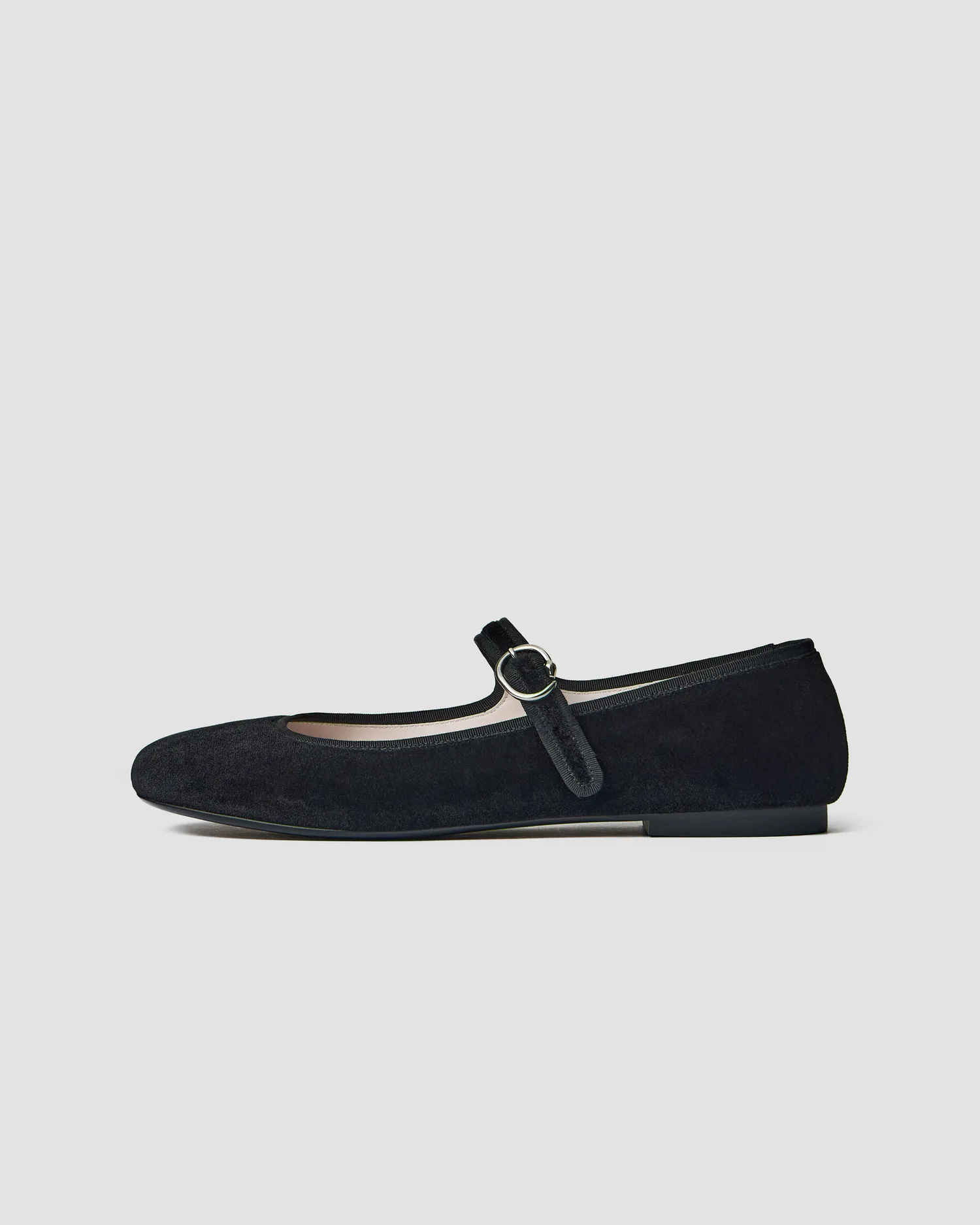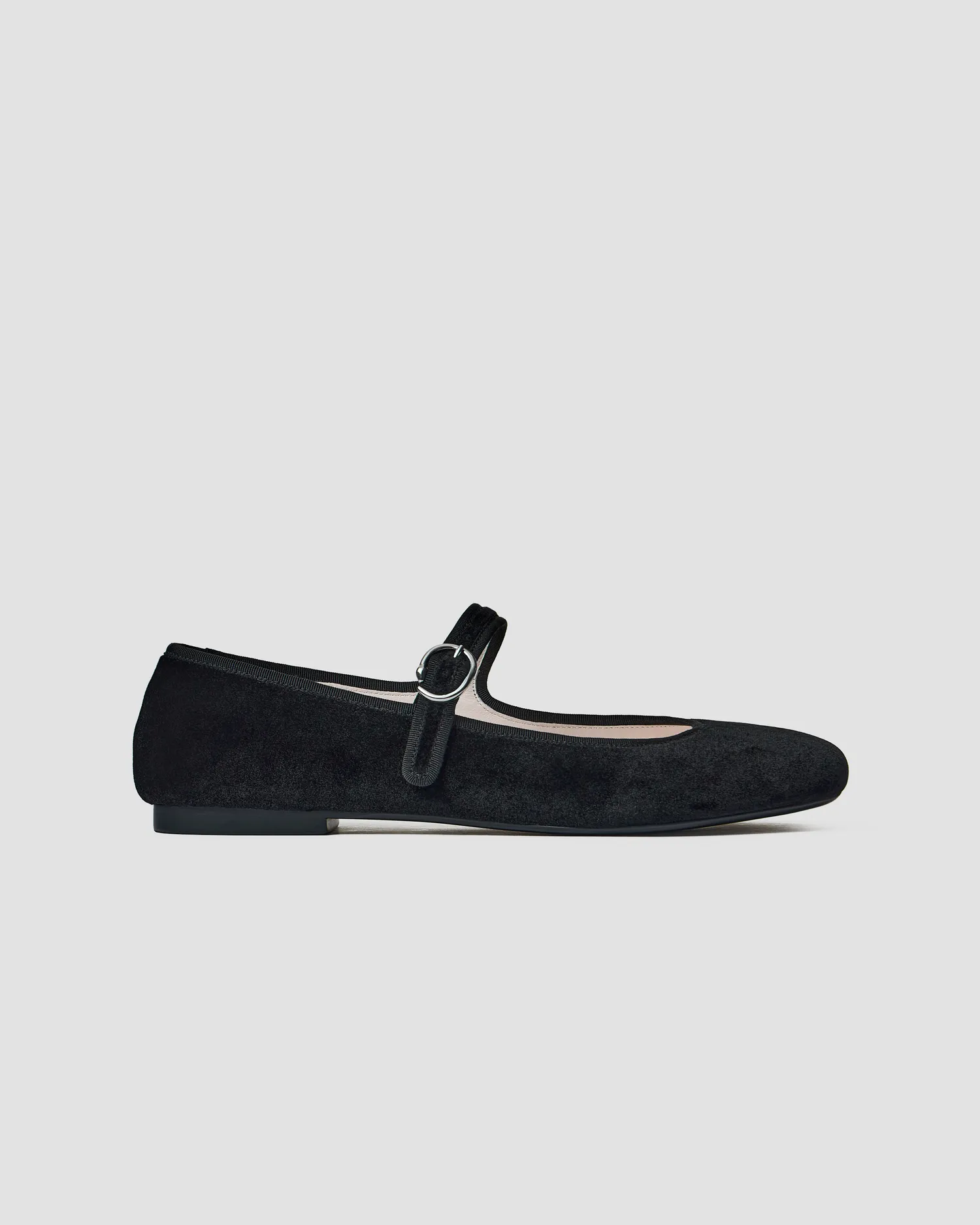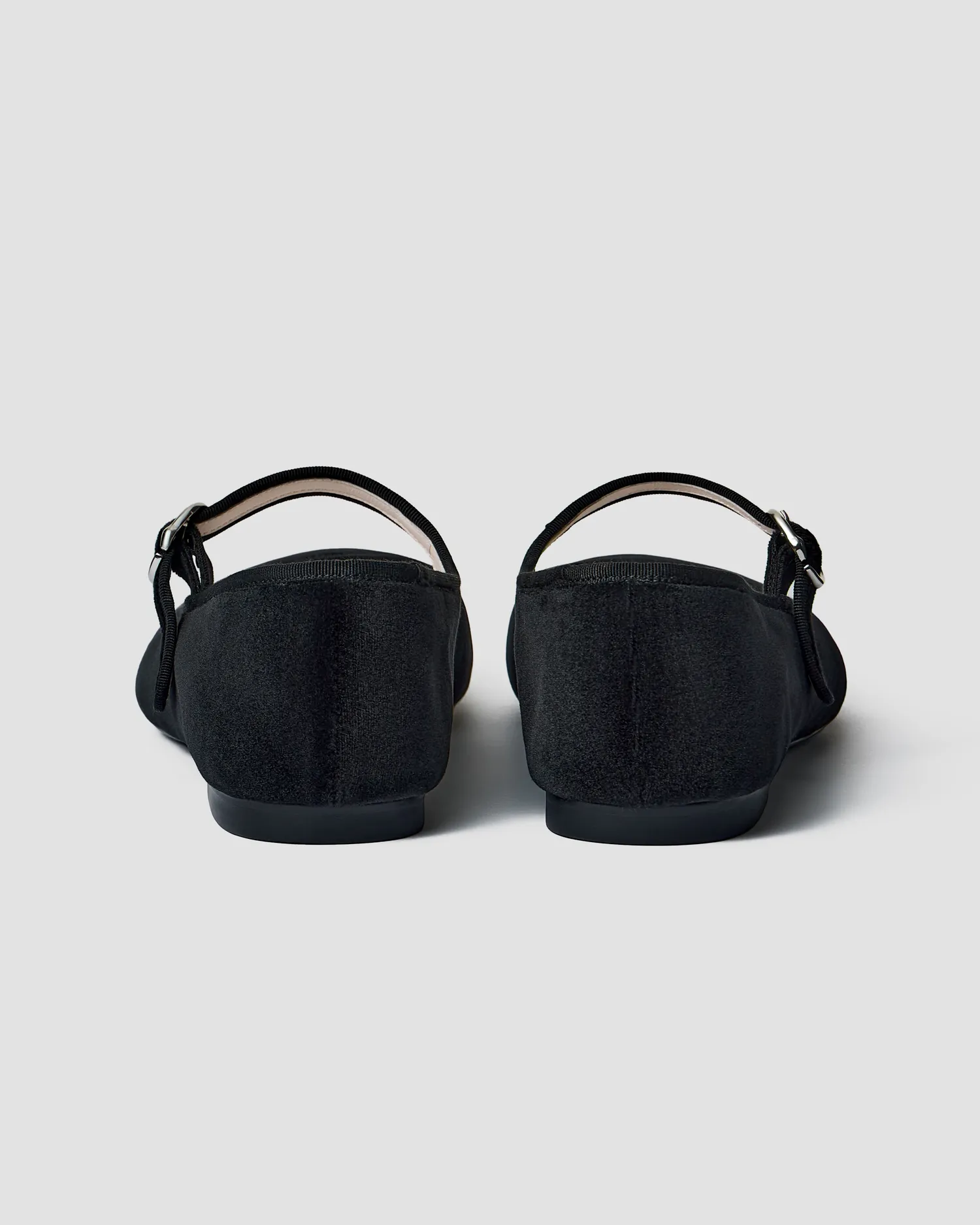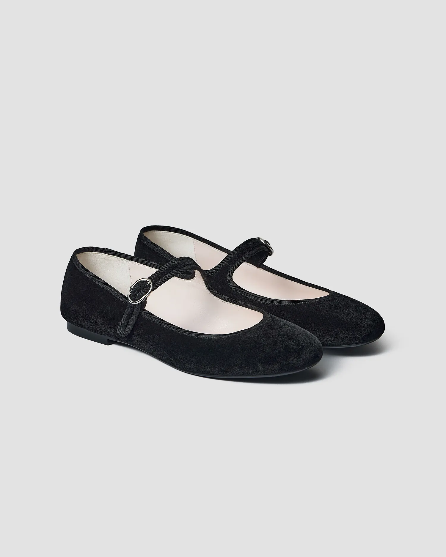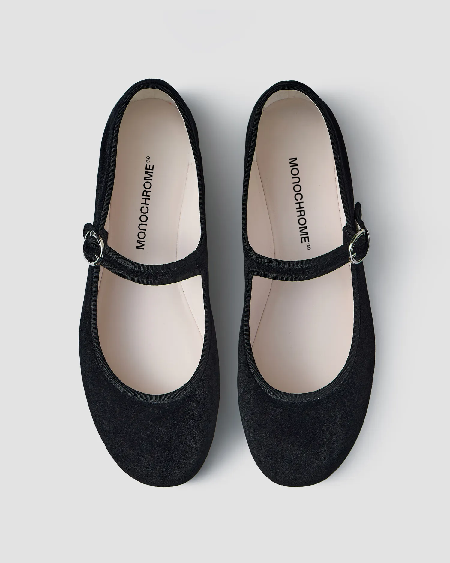 Классические балетки Мэри Джейн черного цвета. Верх выполнен из матового бархатистого материала. Подошва изготовлена из нескользящего износоустойчивого каучука. Закрытый носок и пятка. Застежка на регулируемый ремешок в виде змеи. Легкие и невесомые балетки, идеально подходящие как для вечернего выхода, так и для повседневной носки. Упаковка в фирменную обувную коробку, в комплект входит пыльник.