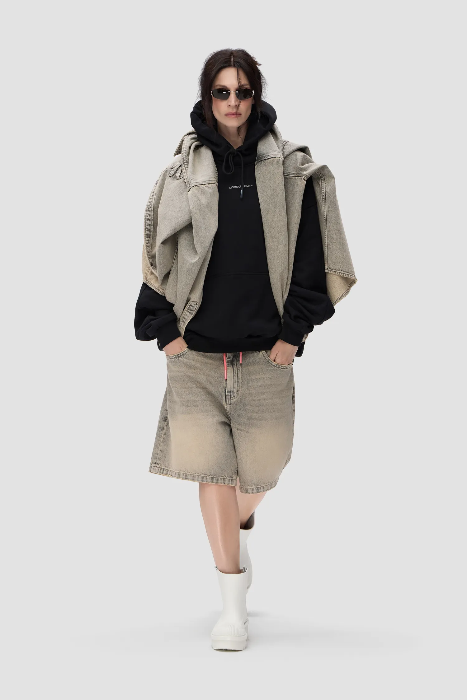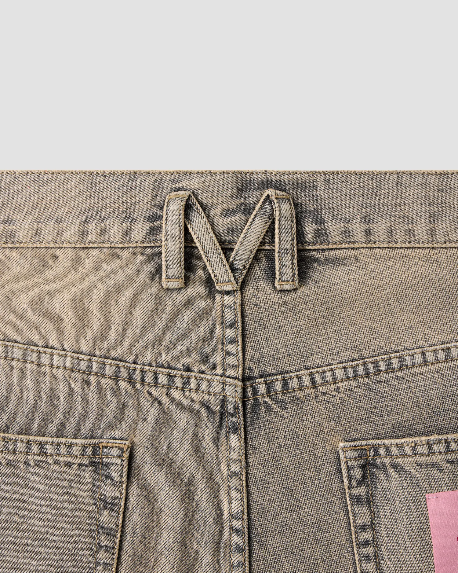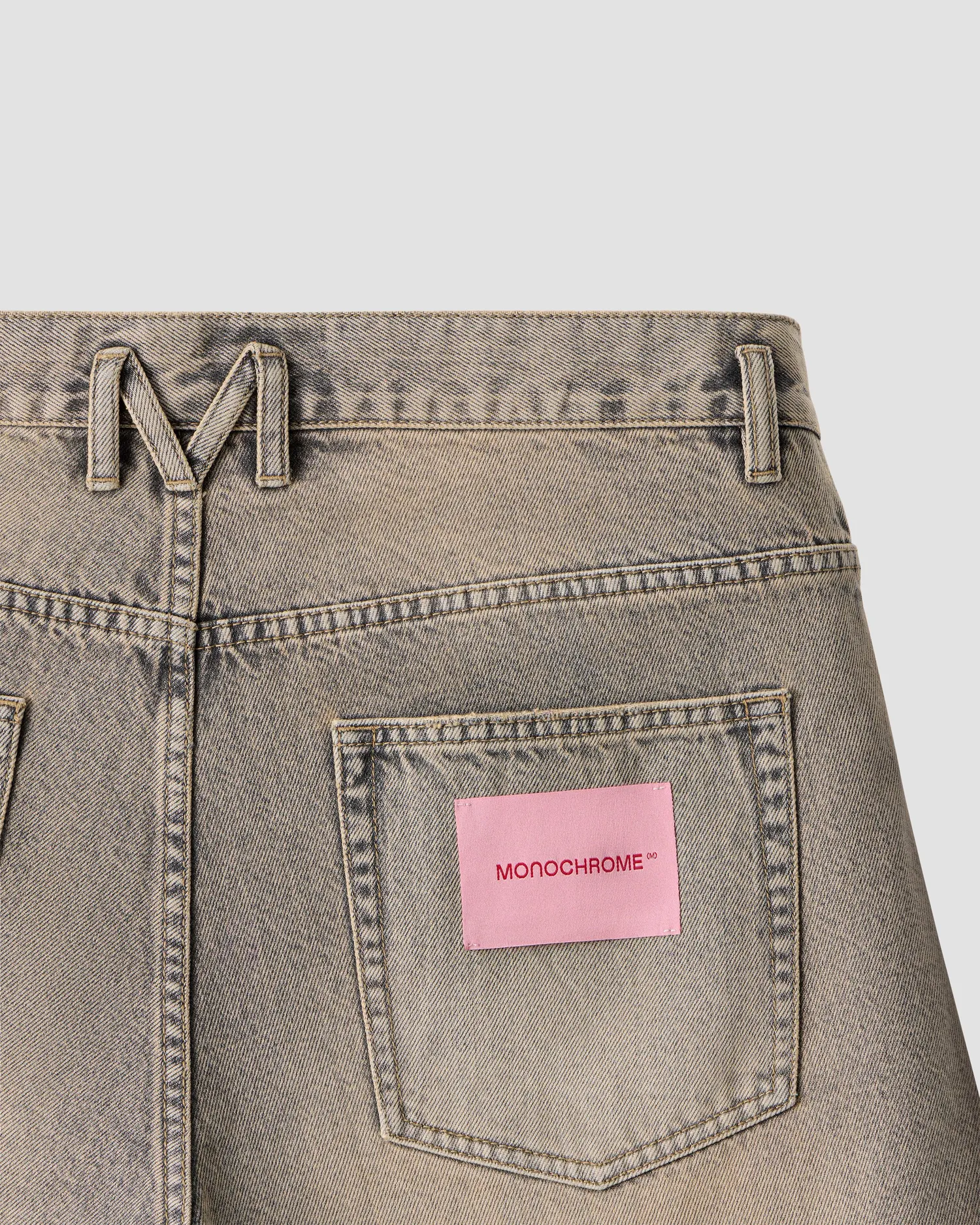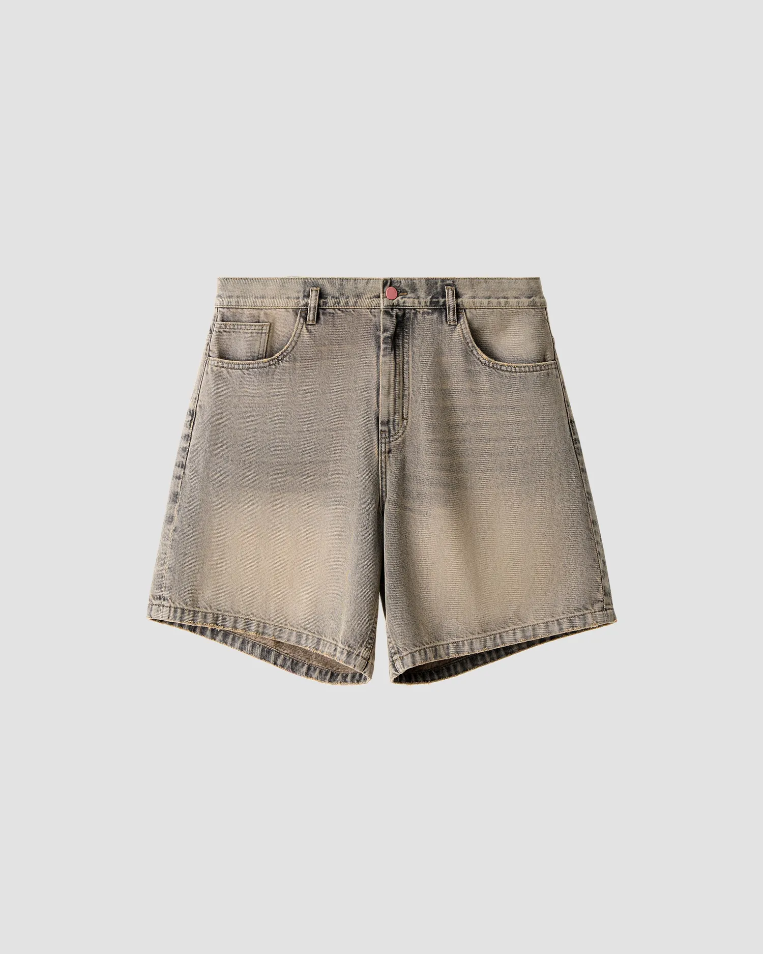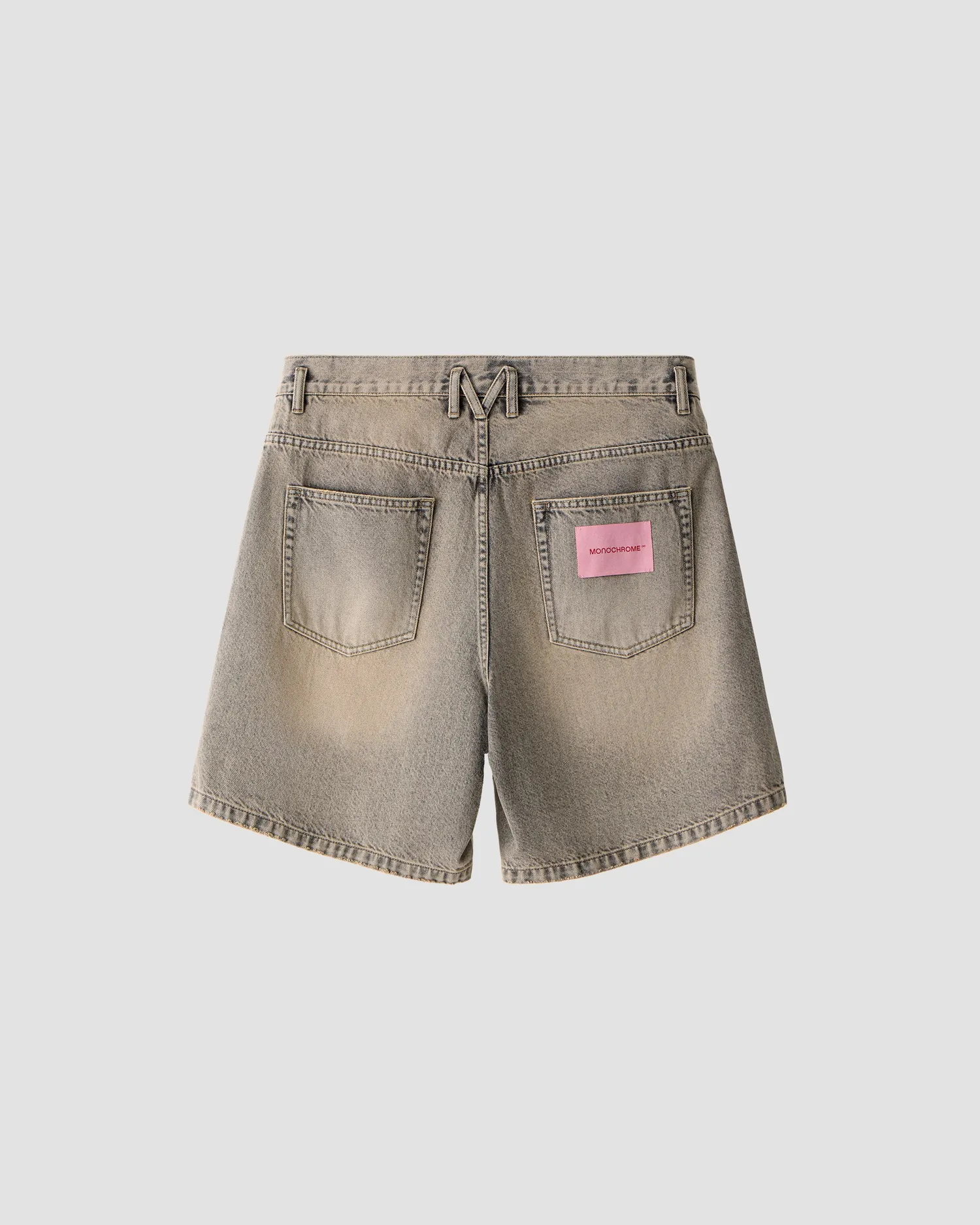 Шорты denim песочного цвета из смесового хлопка. Петли для ремня переплетены в виде фирменной М с задней стороны. Пять карманов. Застёжка на молнии и пуговицу спереди. Розовый шнурок для талии в комплекте. Тканевый лейбл сзади. Onesize&Unisex. Упаковка в подарочную коробку.