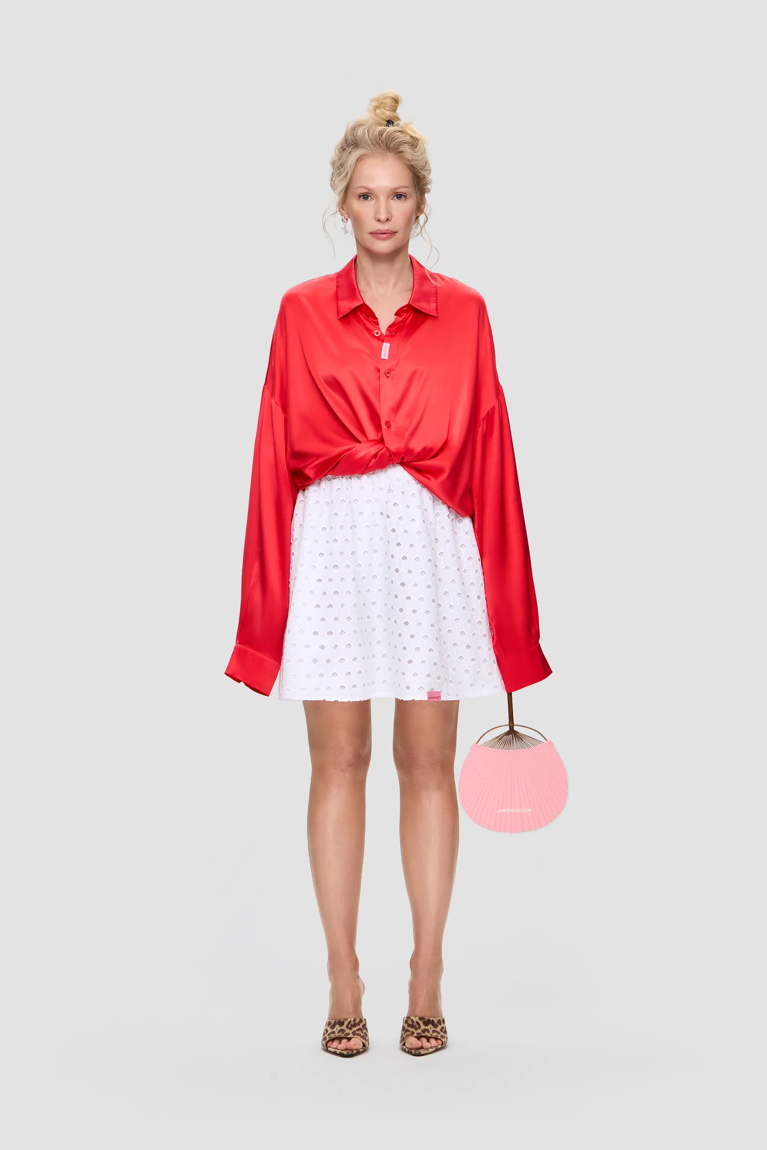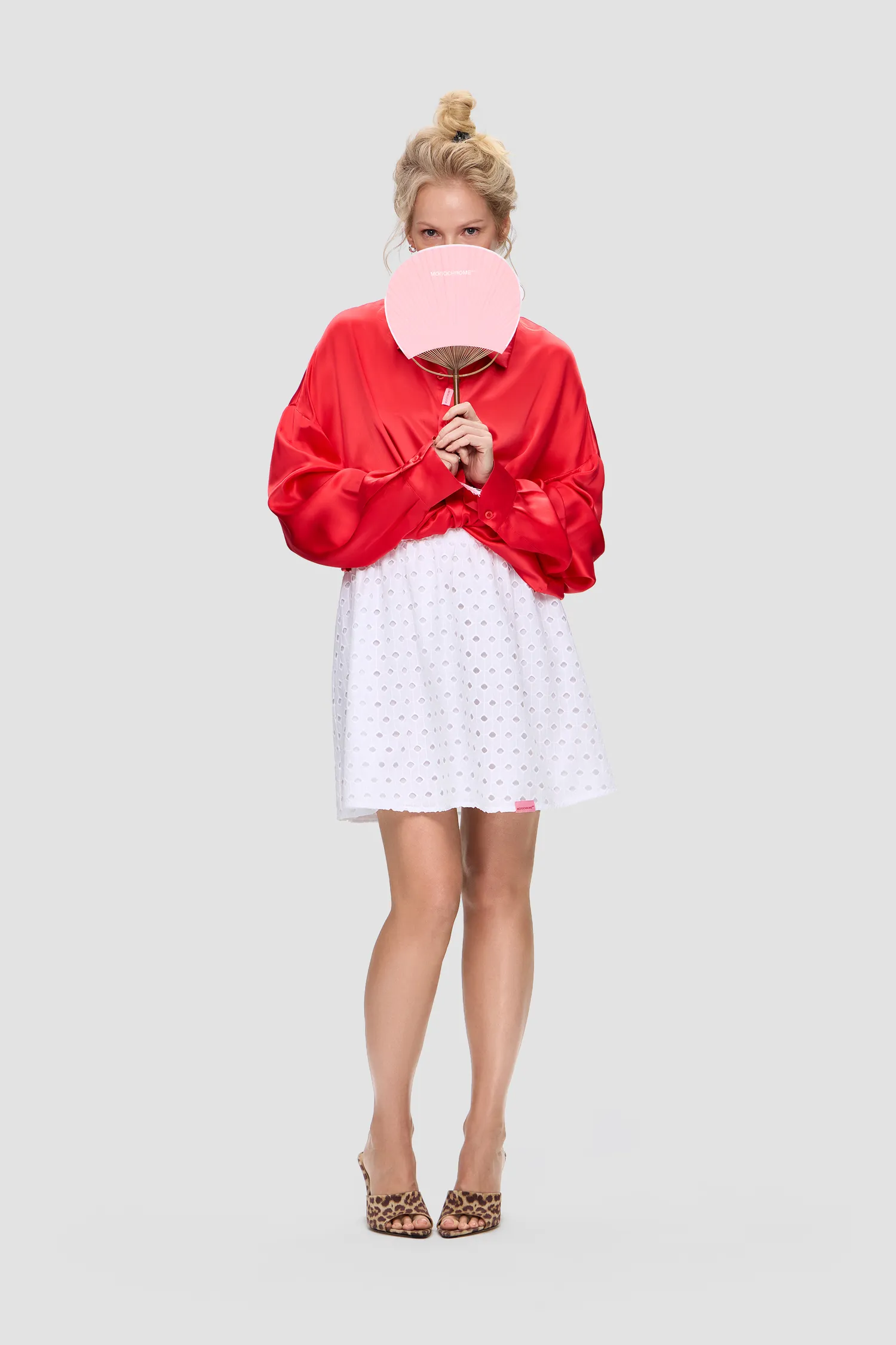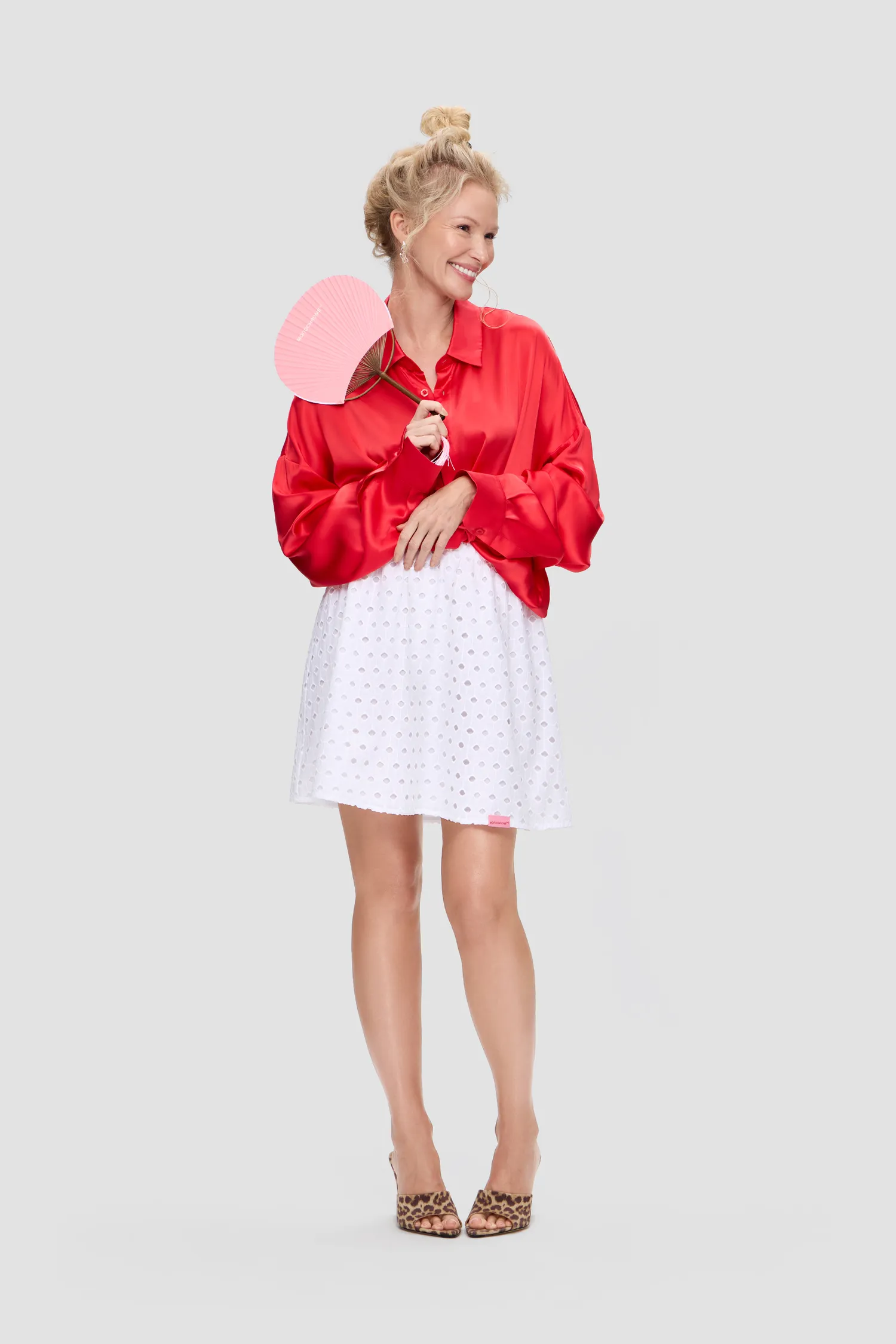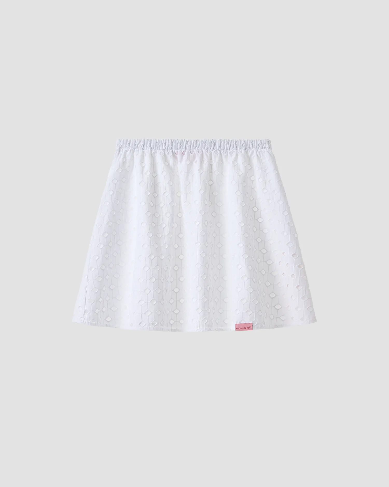 Юбка свободного кроя белого цвета. Пояс на резинке. Легкая ажурная ткань-шитьё из 100% хлопка. Жаккардовый лейбл по нижнему краю изделия розового цвета. Упаковка в подарочную коробку.