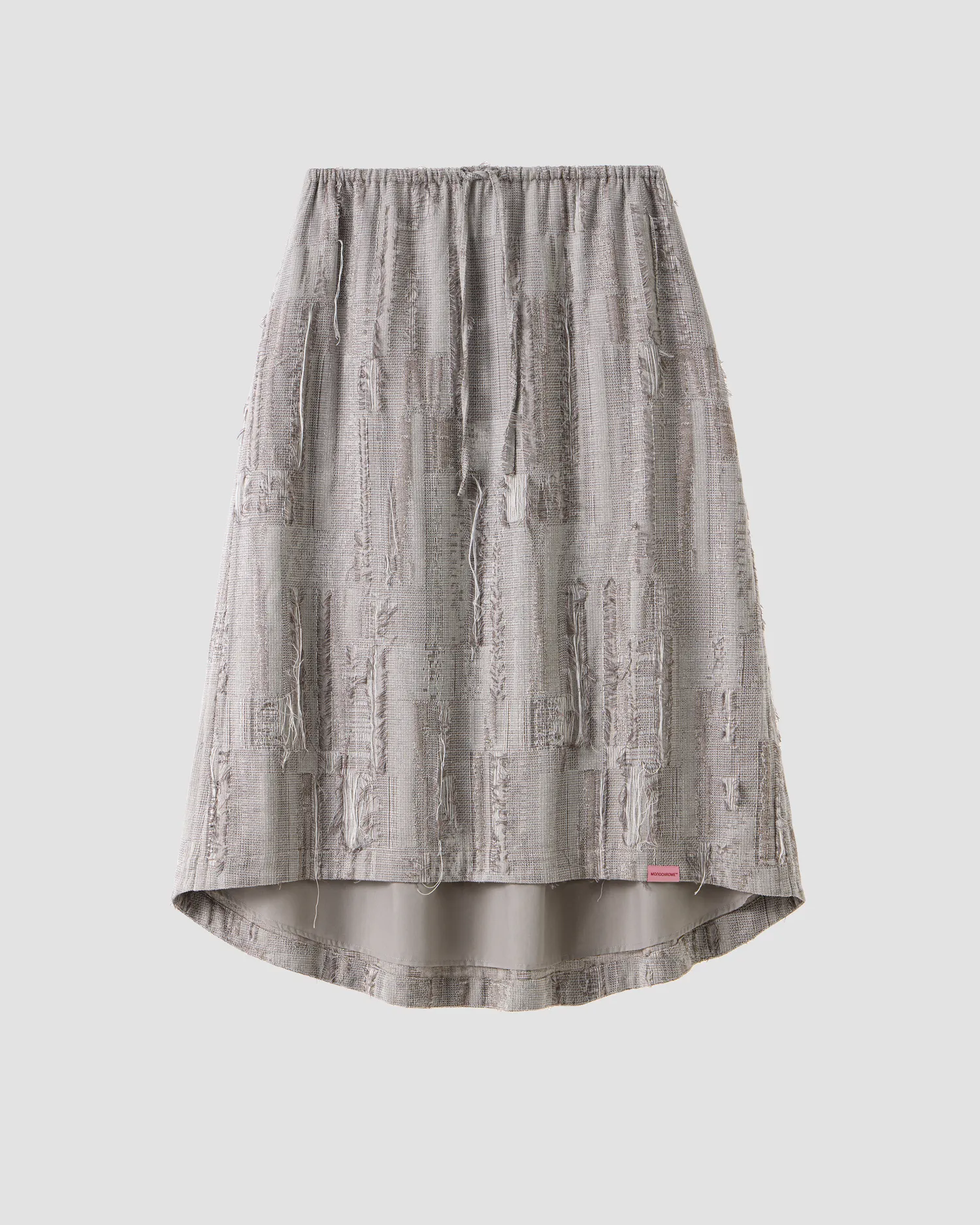 Юбка серого цвета из коллекции VILLAGE'25. Выполнена из смесовой вискозы со льном. Ткань имеет фактуру с деликатным рваным эффектом и спущенными нитями. Юбка имеет удлиненную заднюю часть. Подклад в тон изделия. Пояс на резинке с завязками. Жаккардовый флажок розового цвета. Упаковка в подарочную коробку.