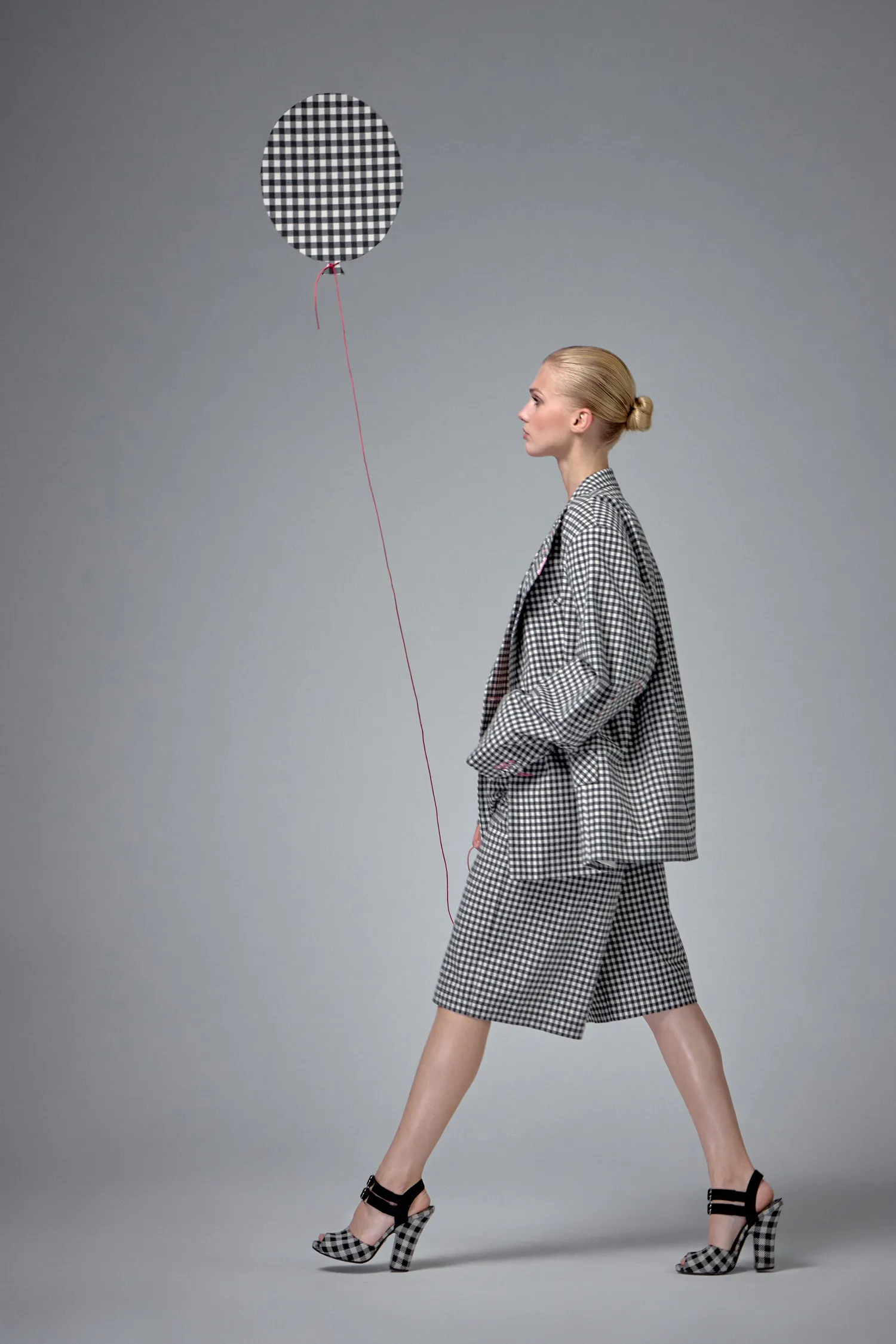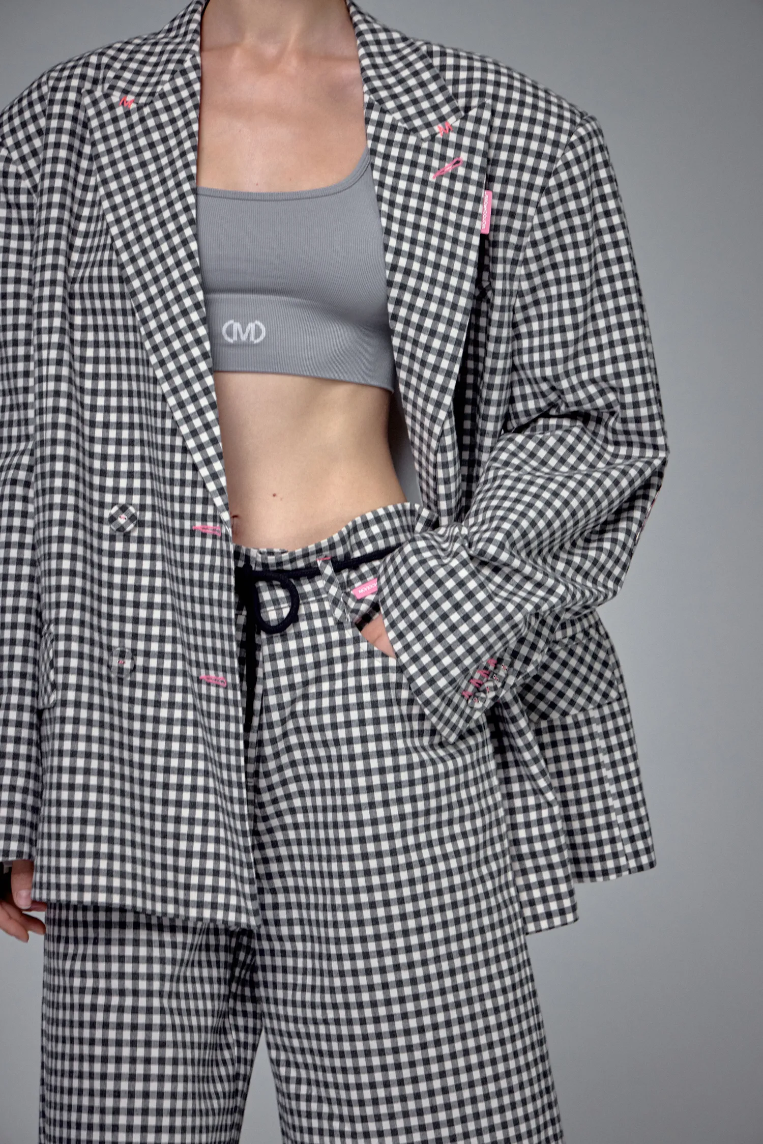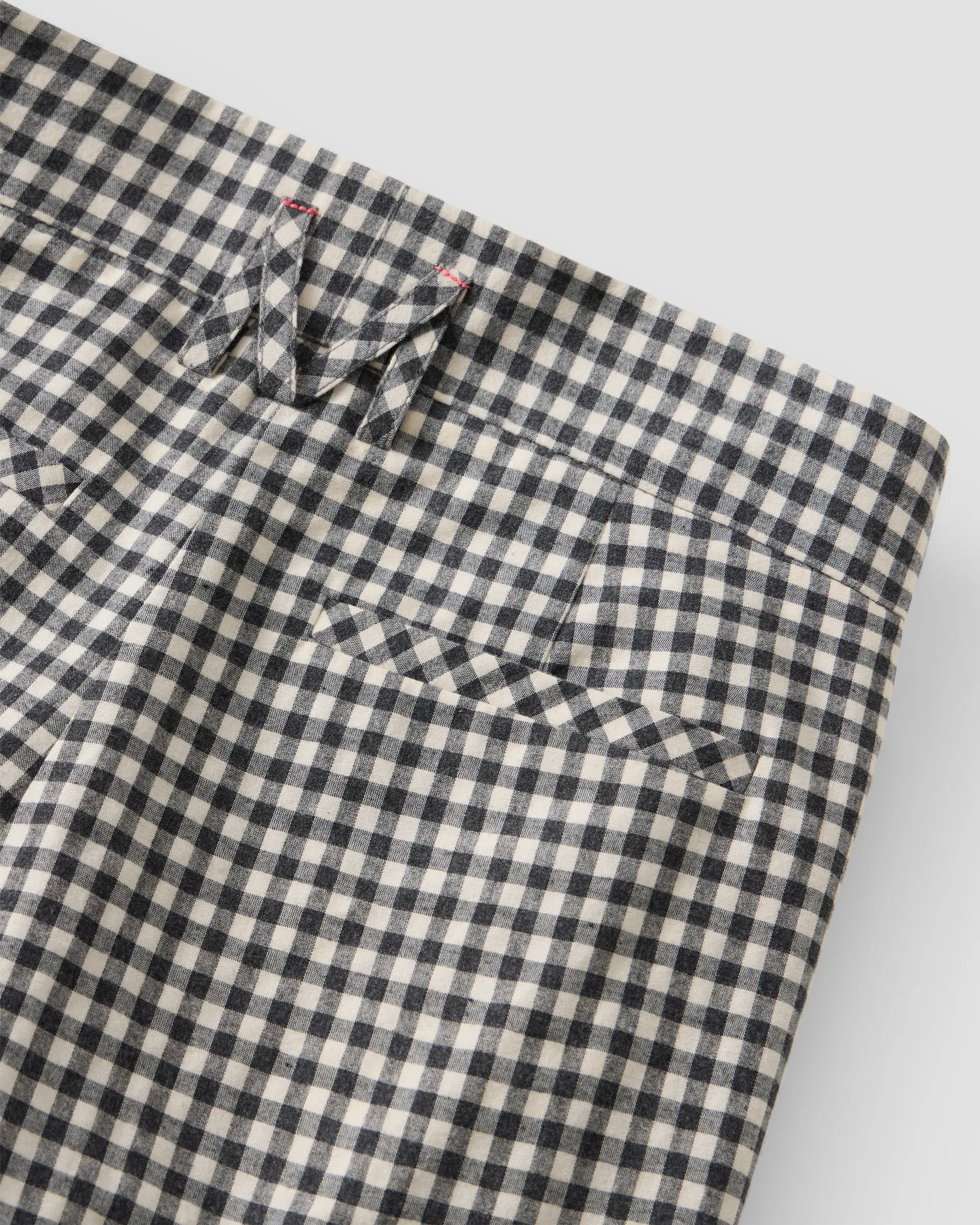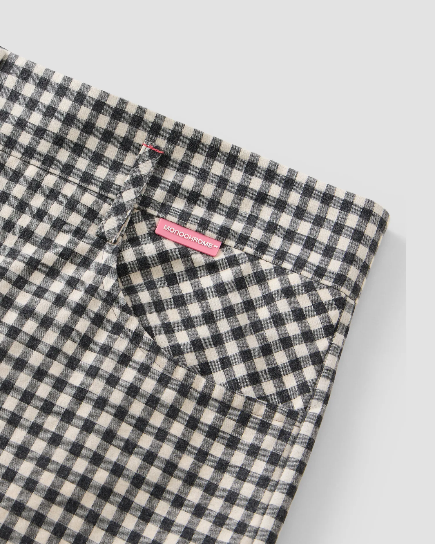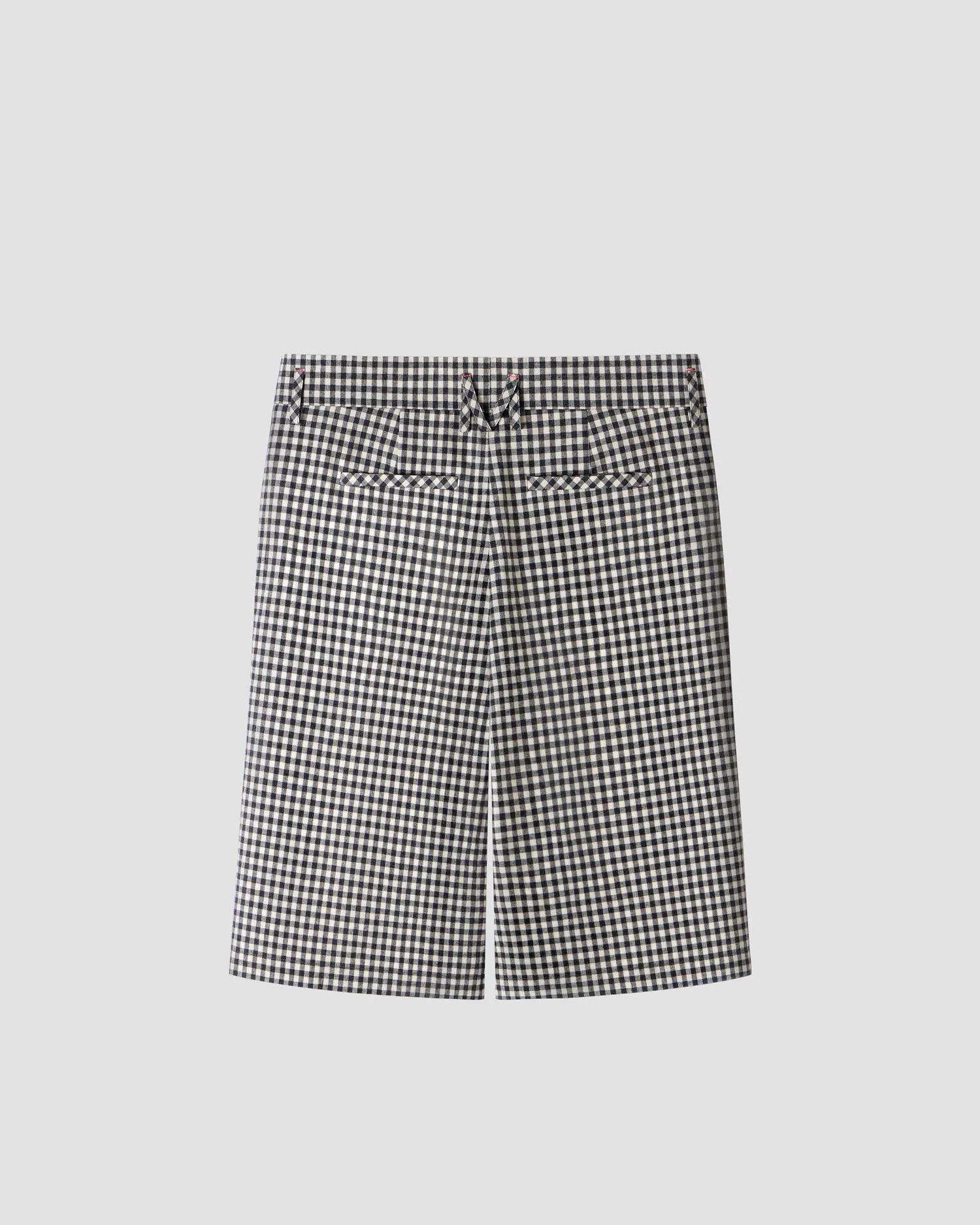 Шорты в мелкую клетку из 100% хлопка. Петли для ремня переплетены в виде фирменной М с задней стороны. Пять карманов. Застёжка на молнии и пуговицу спереди. Тканевый лейбл сзади. Полимерная нашивка розового цвета с логотипом. Onesize&Unisex. Упаковка в подарочную коробку.