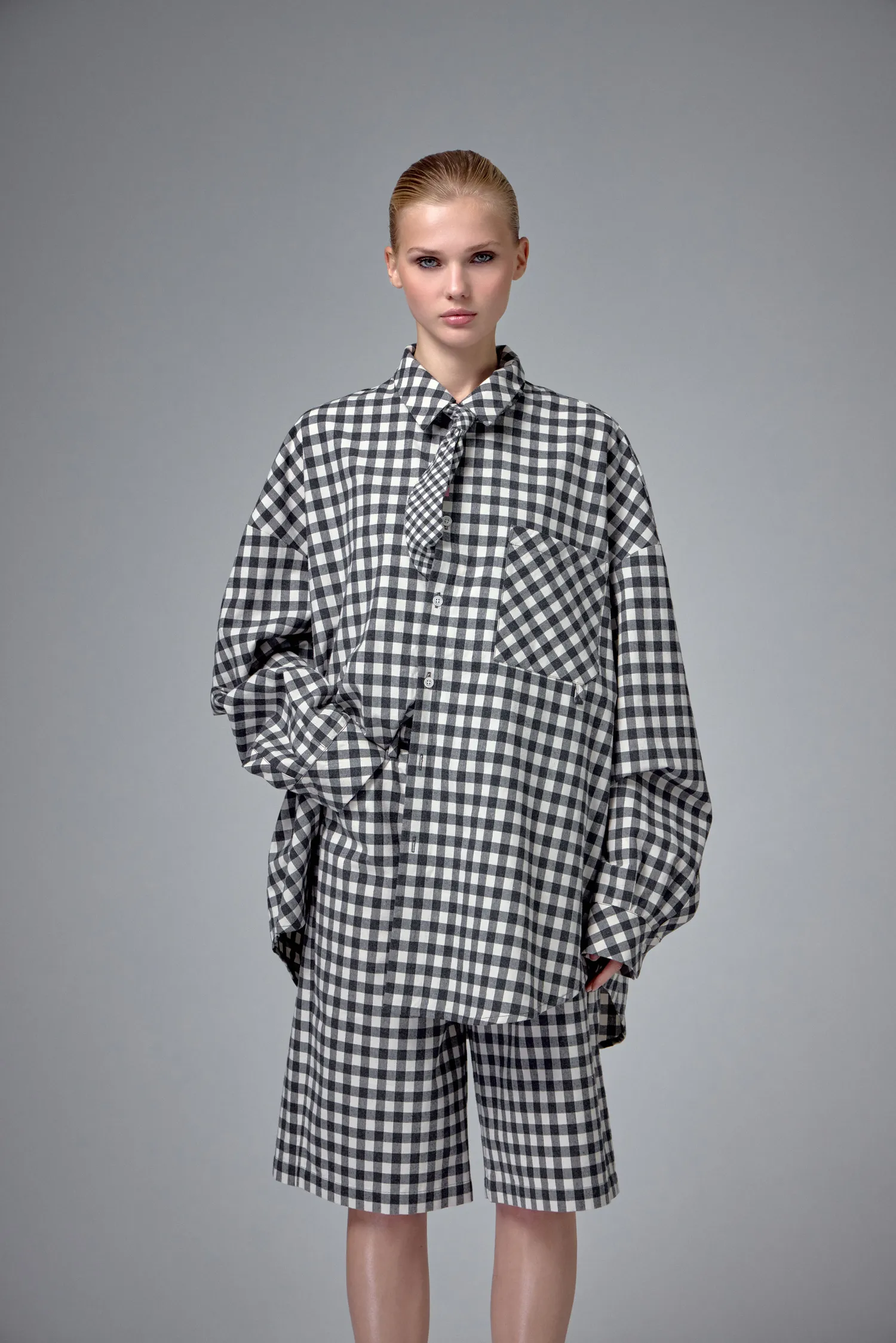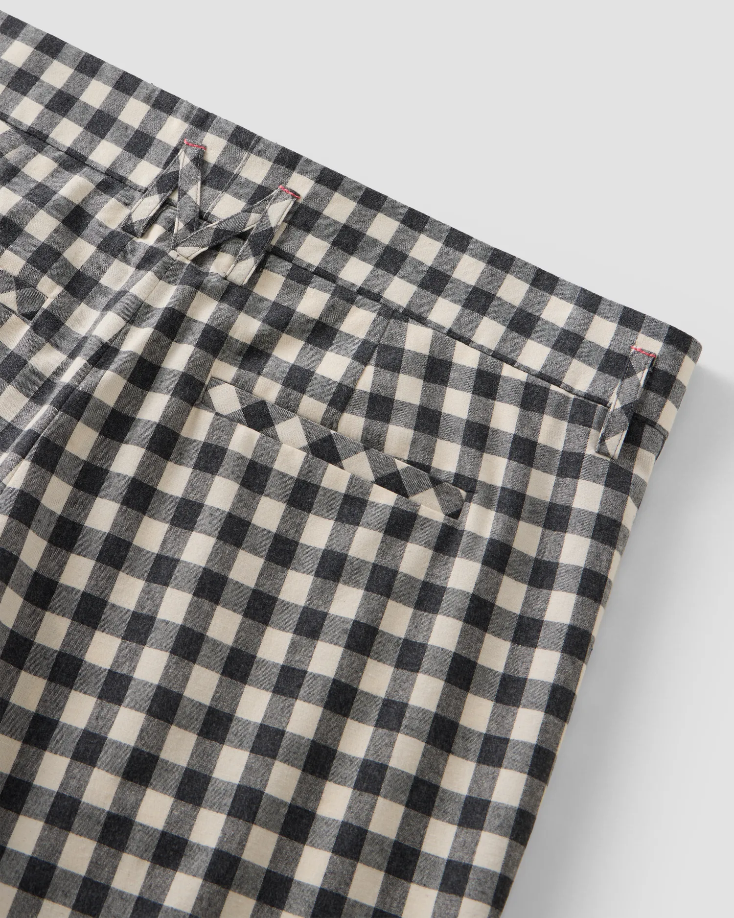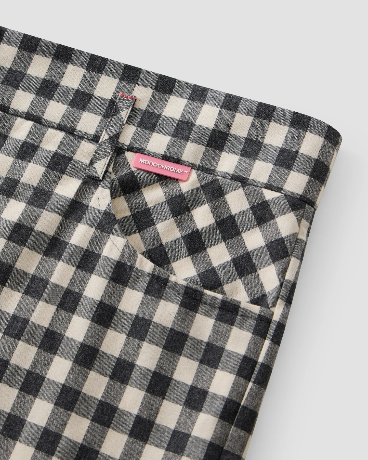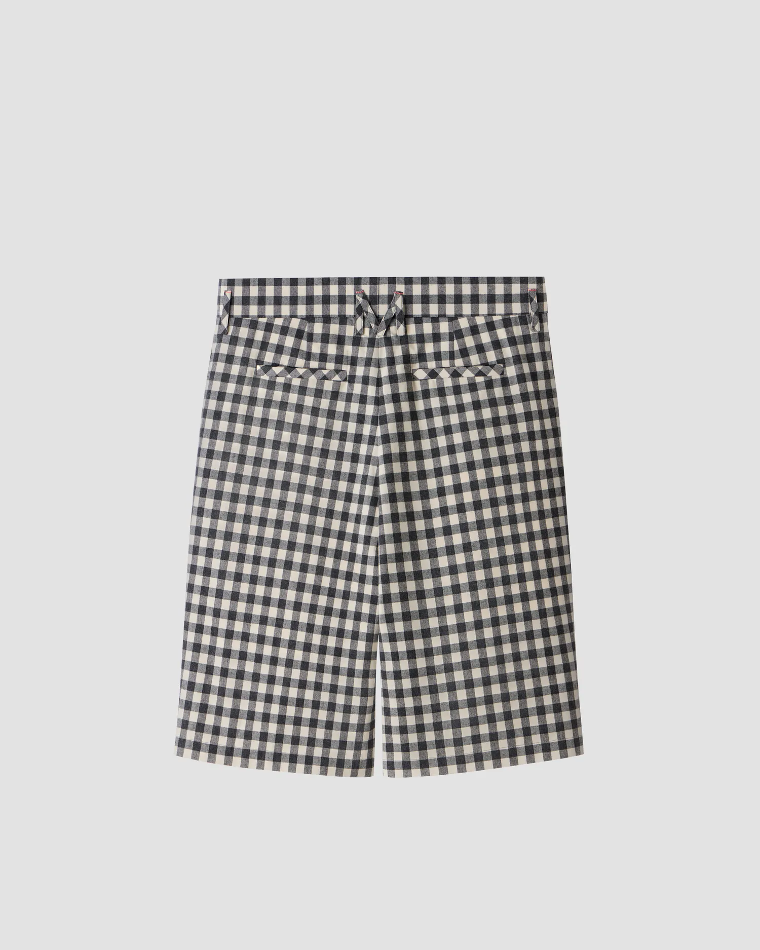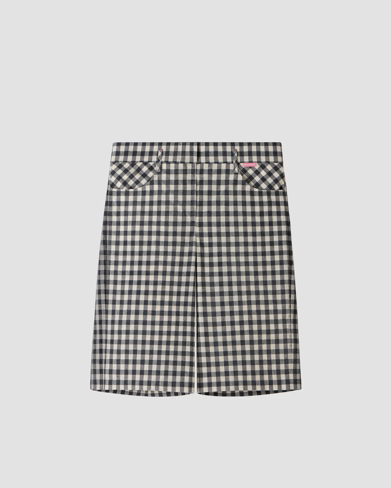 Шорты в клетку из 100% хлопка. Петли для ремня переплетены в виде фирменной М с задней стороны. Пять карманов. Застёжка на молнии и пуговицу спереди. Полимерная нашивка розового цвета с логотипом. Onesize&Unisex. Упаковка в подарочную коробку.