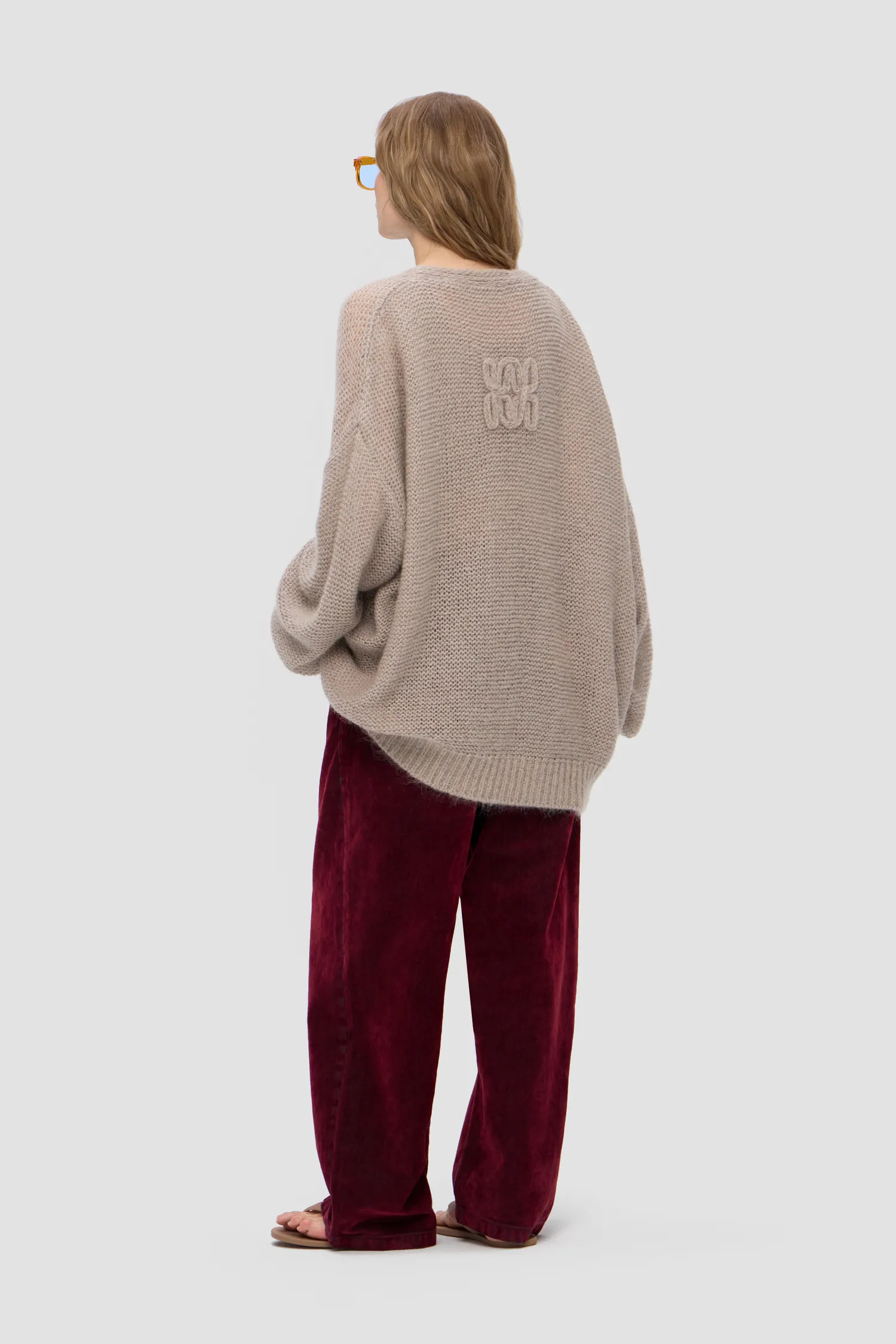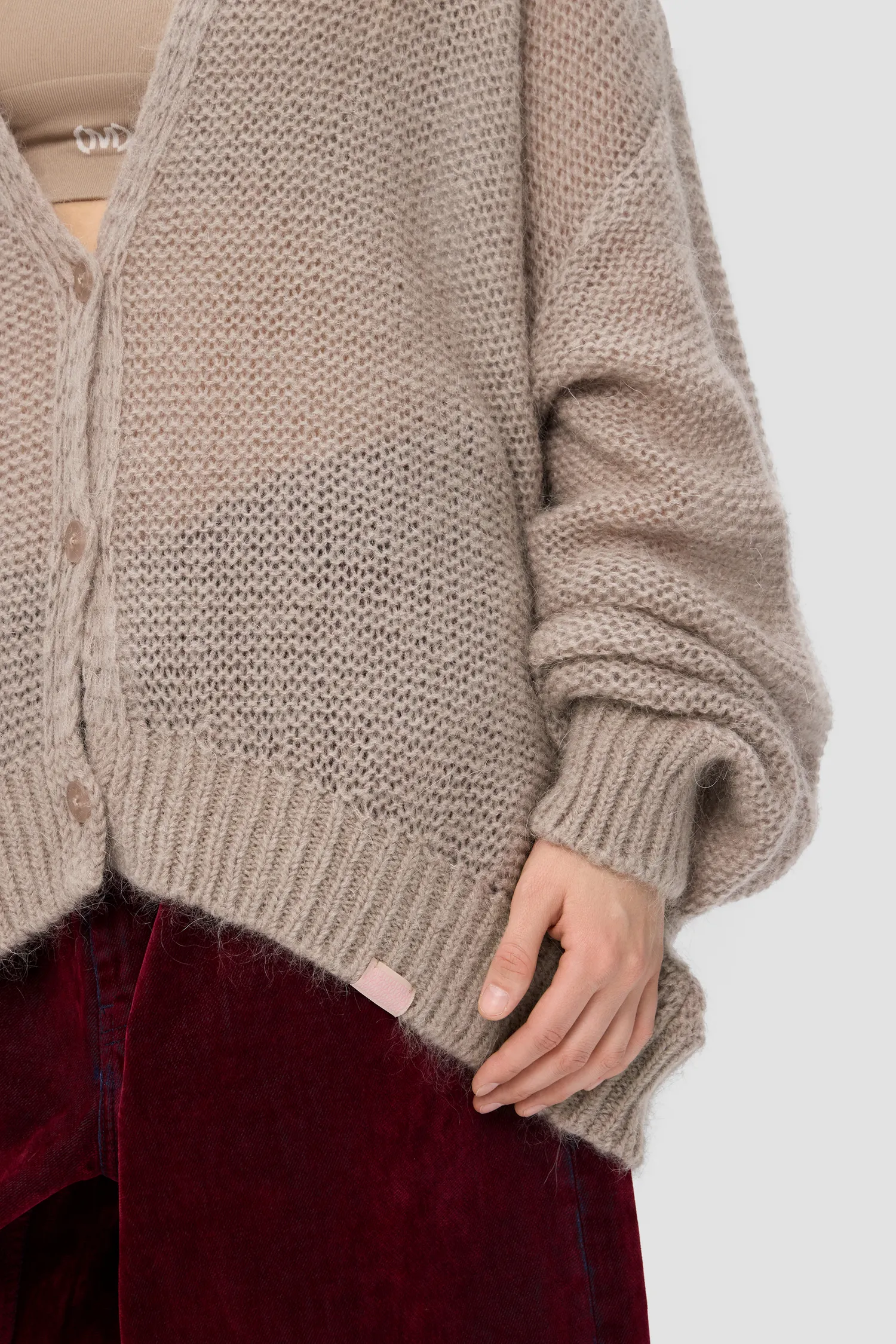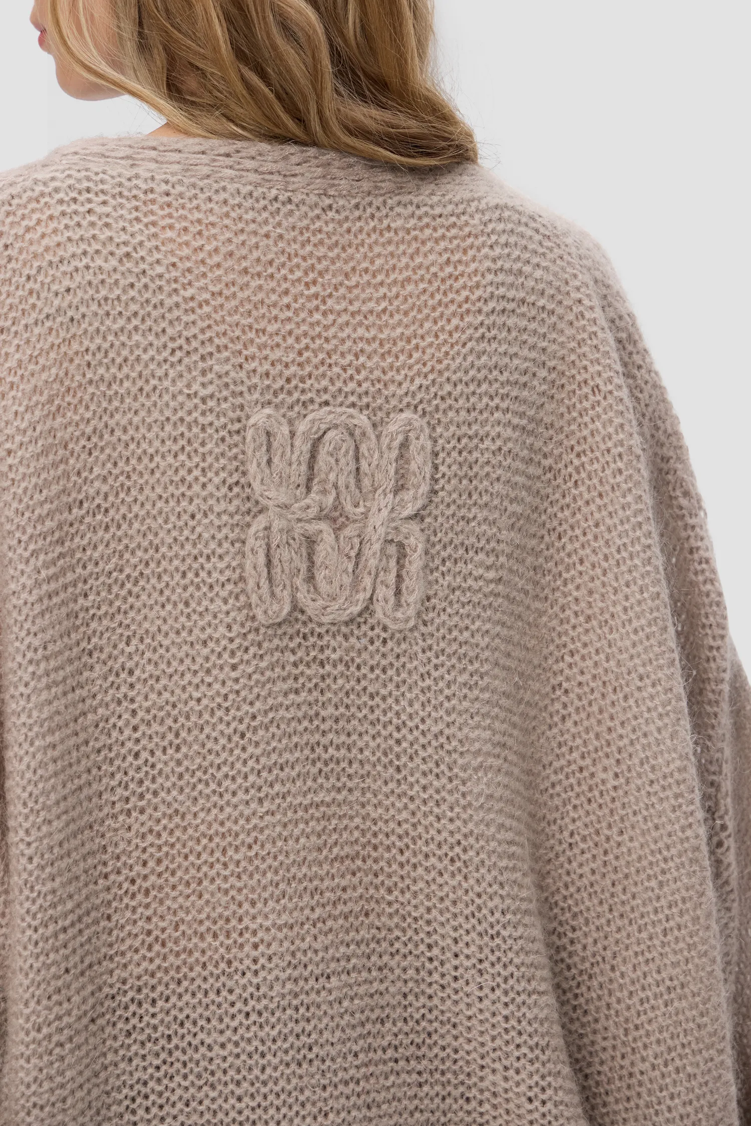 Воздушный oversize кардиган из смесового мохера. V-образный вырез. Приспущенные плечи. Крупная вязка. Удлиненные и объемные рукава. Укороченный перед. Застежка на брендированные пуговицы. Вывязанные элементы фирменного паттерна MONOCHROME на спинке. Жаккардовый лейбл на внутренней стороне изделия. Упаковка в подарочную коробку.