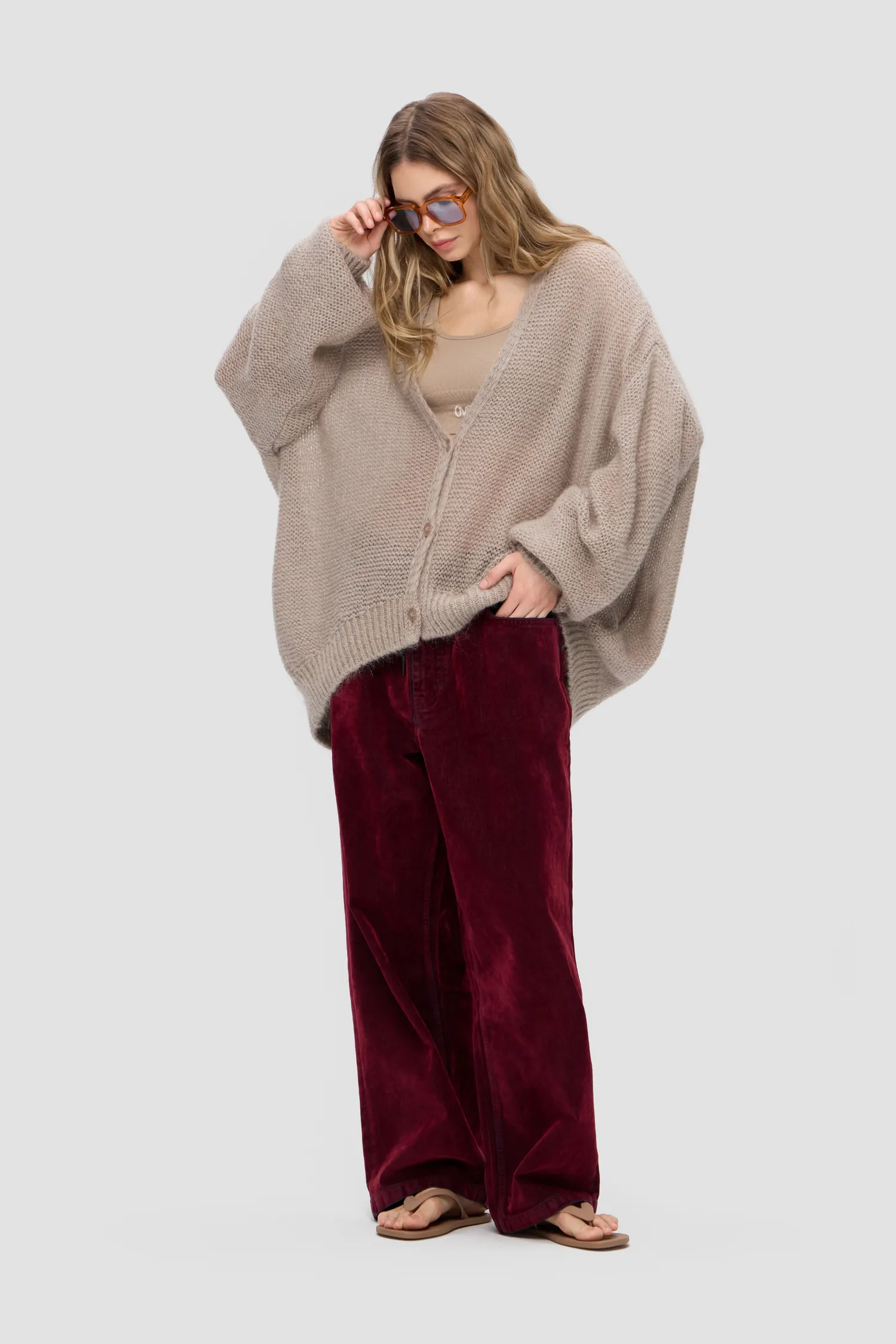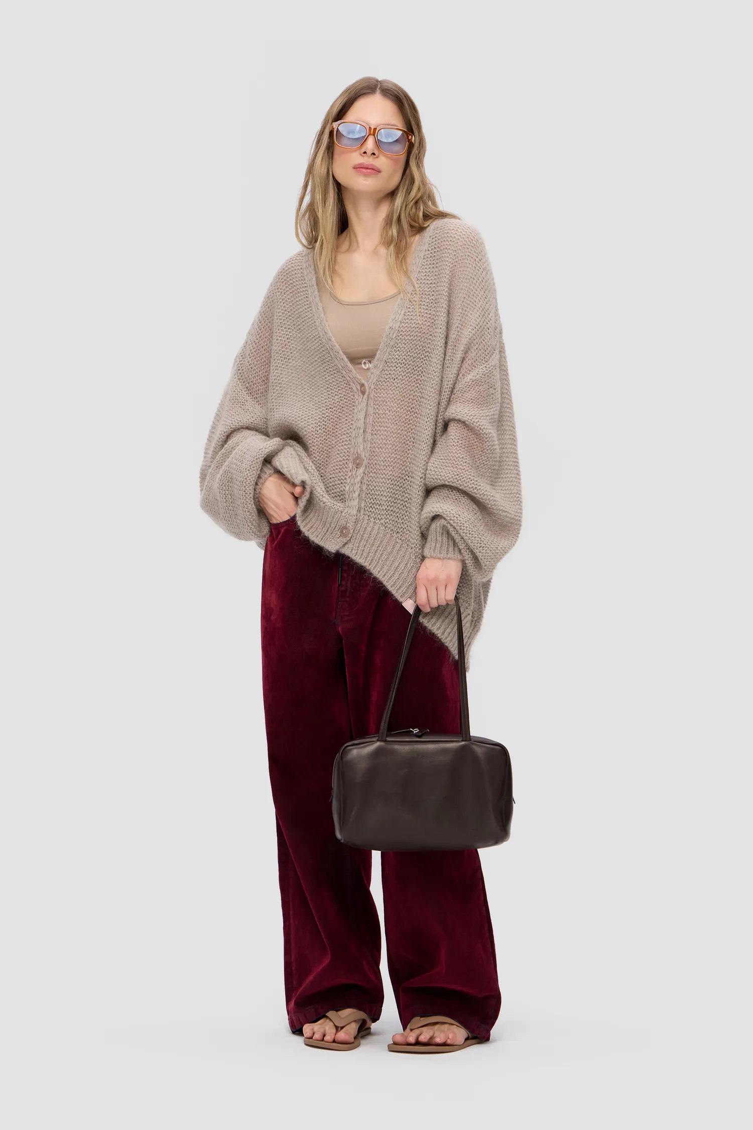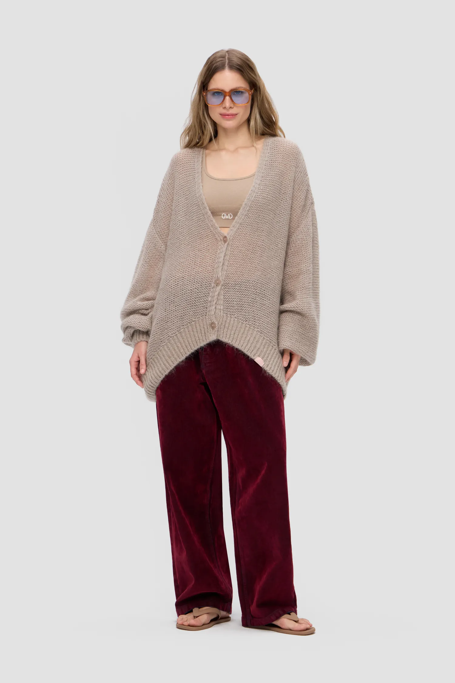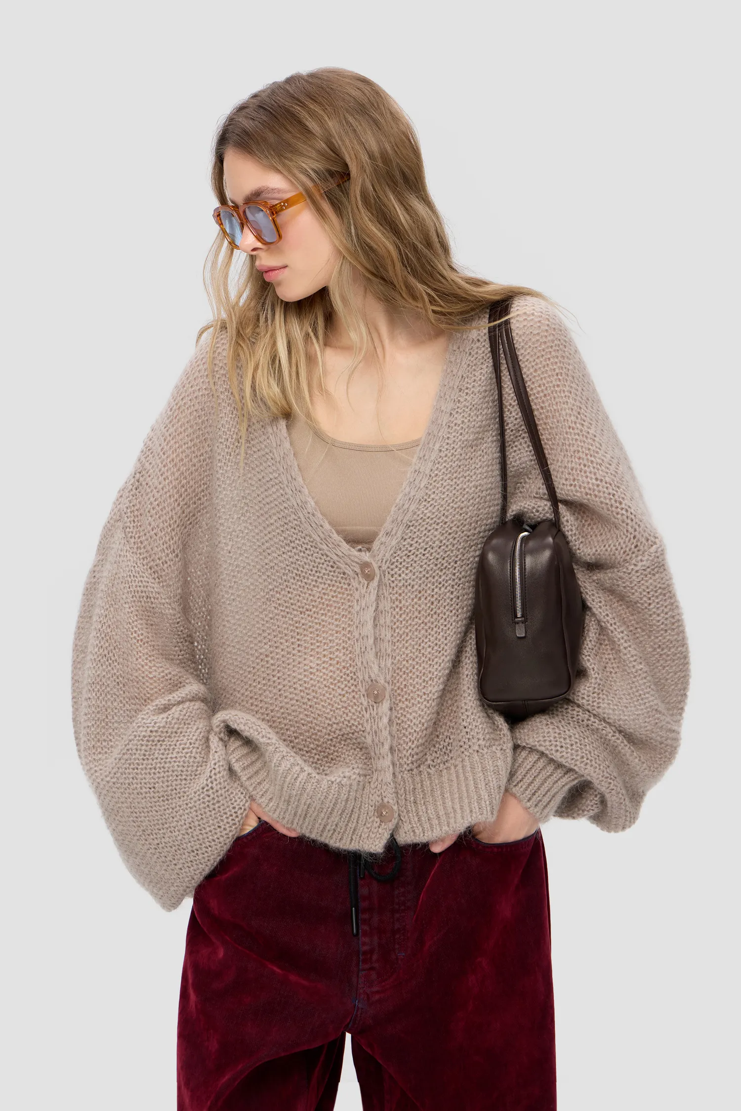 Воздушный oversize кардиган из смесового мохера. V-образный вырез. Приспущенные плечи. Крупная вязка. Удлиненные и объемные рукава. Укороченный перед. Застежка на брендированные пуговицы. Вывязанные элементы фирменного паттерна MONOCHROME на спинке. Жаккардовый лейбл на внутренней стороне изделия. Упаковка в подарочную коробку.