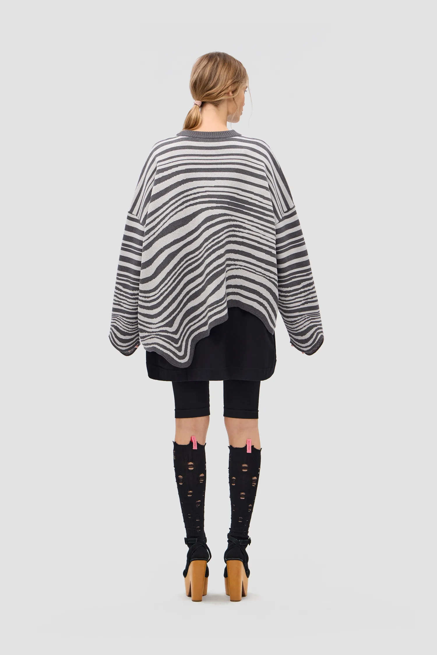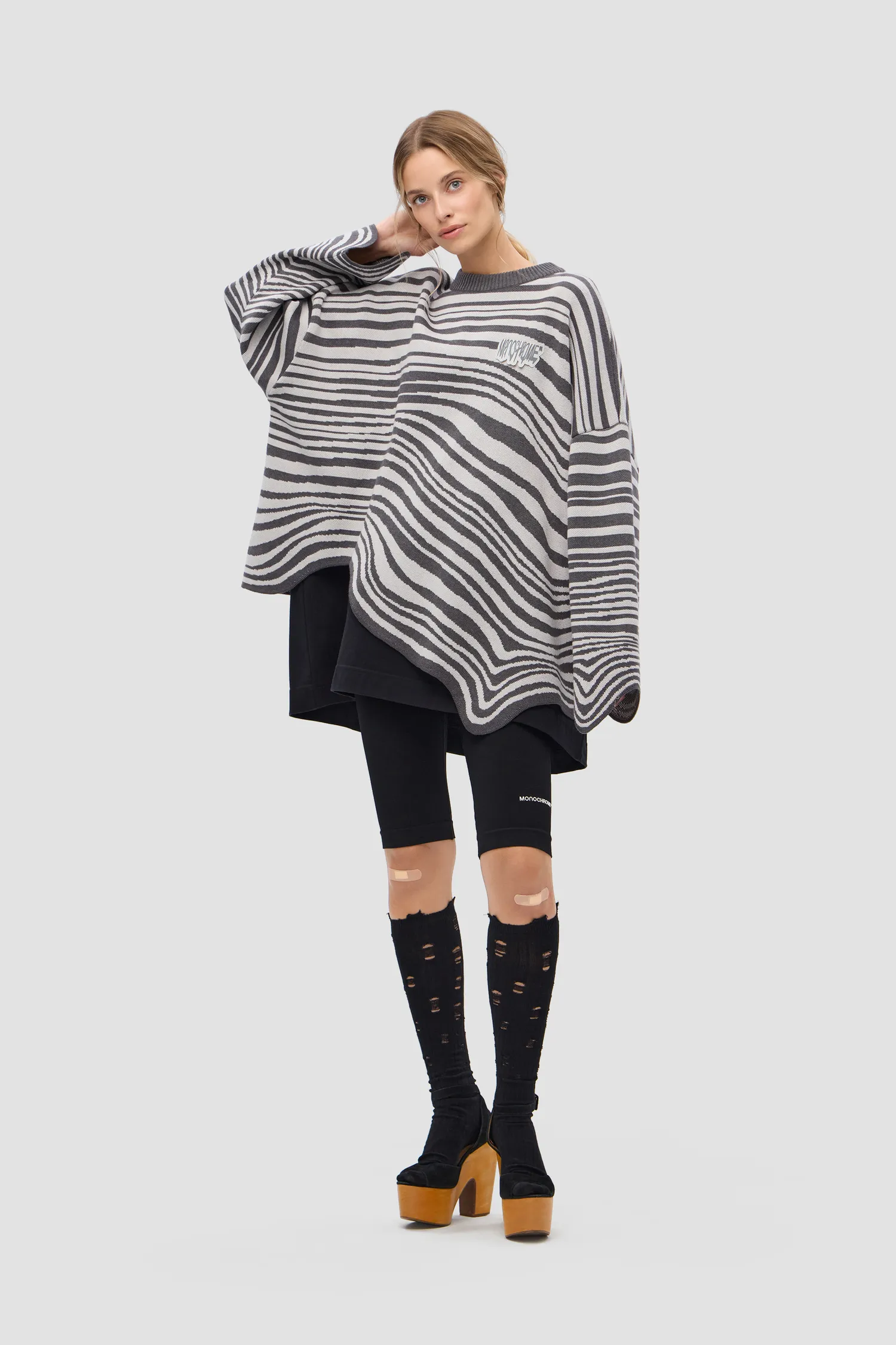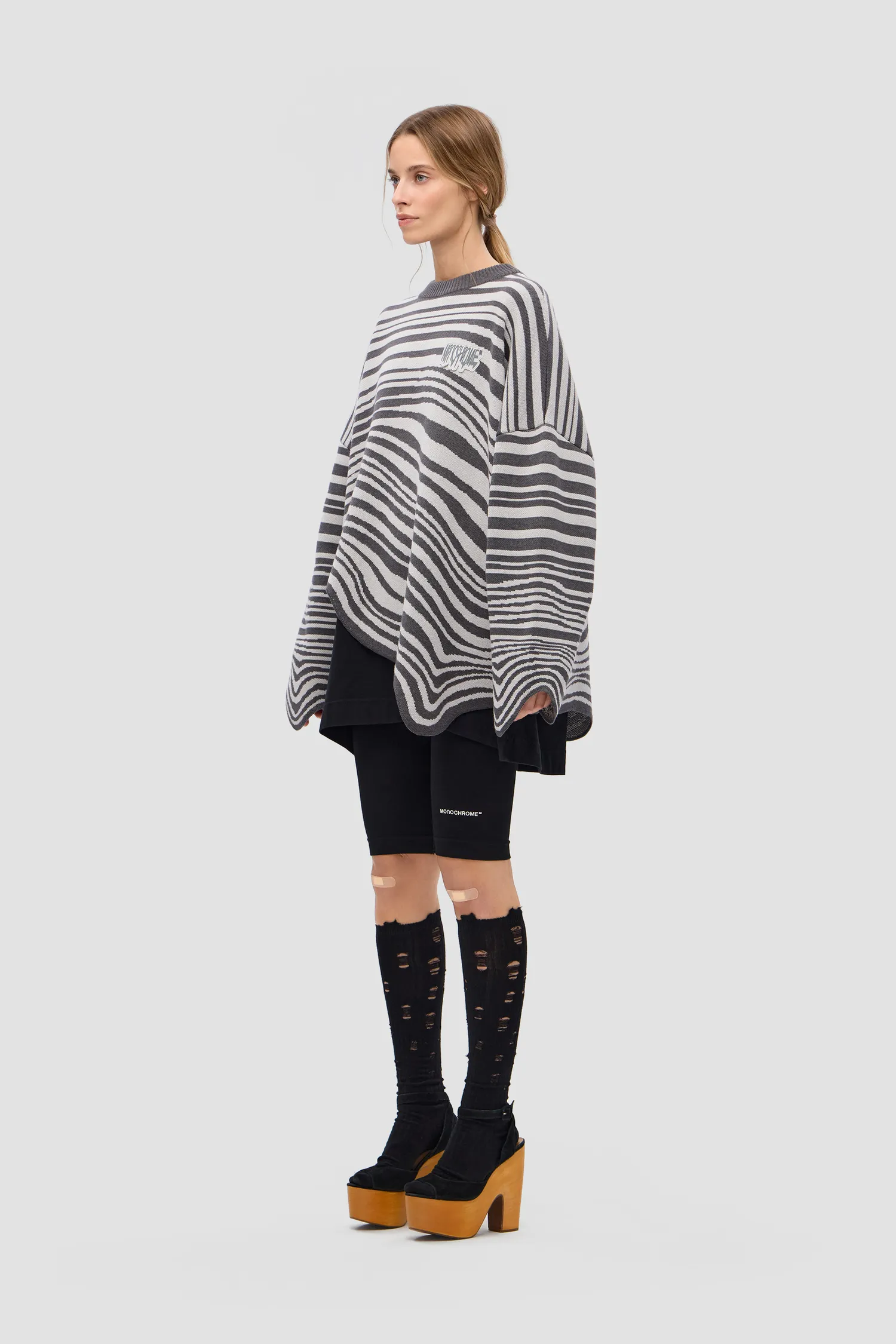 Свитер с ассиметричными линиями и волнообразным силуэтом серого цвета. Смесовый хлопок. Полимерная нашивка в области груди. Гладкая фактура. О-образная горловина. Onesize&Unisex. Упаковка в подарочную коробку.