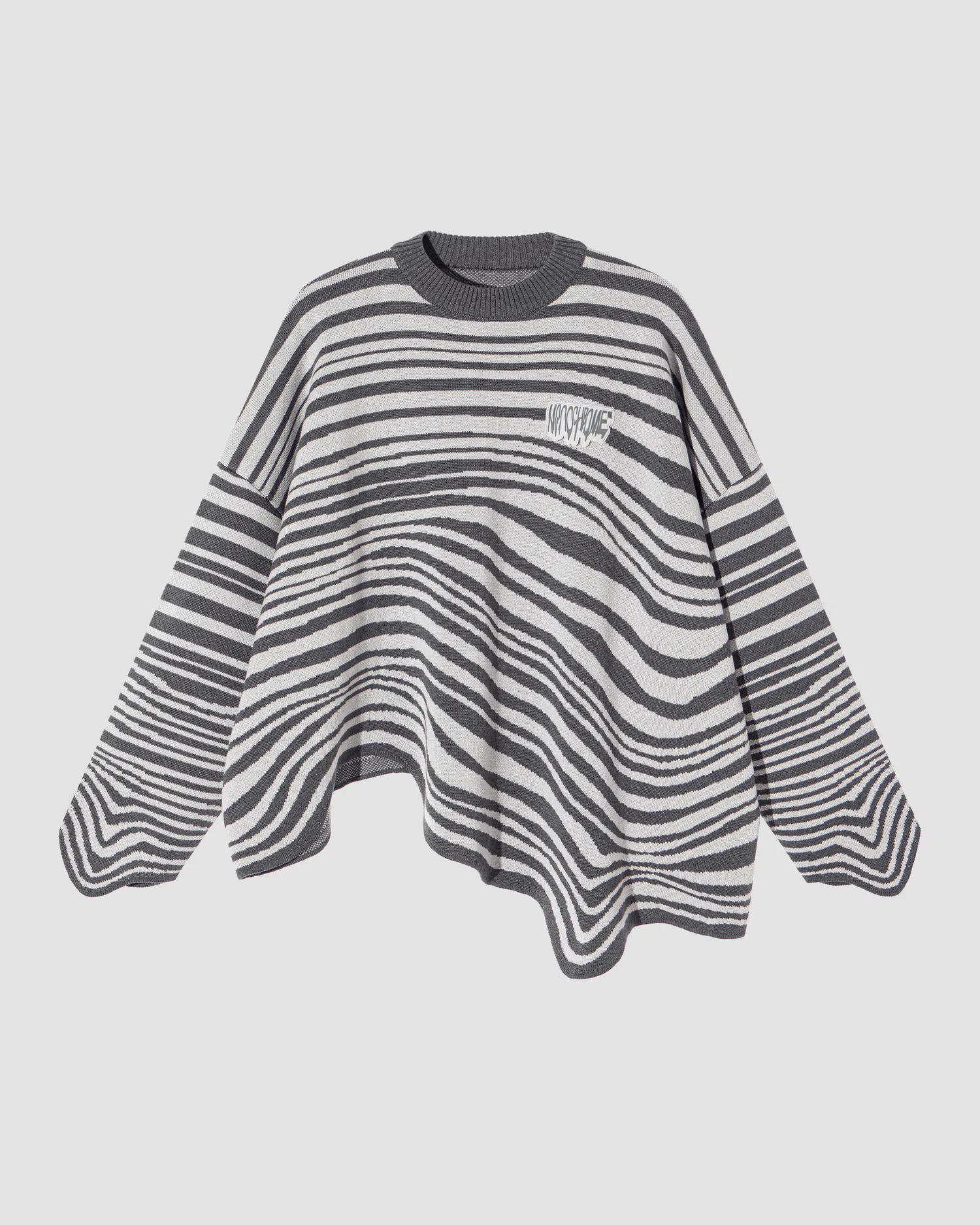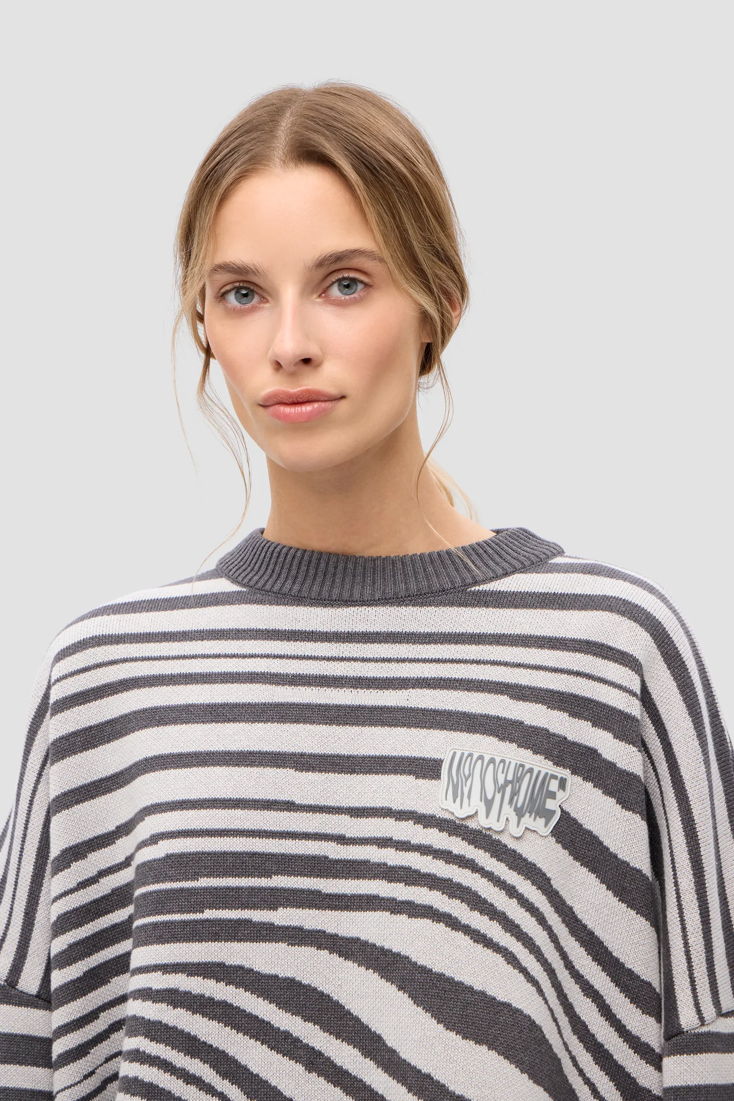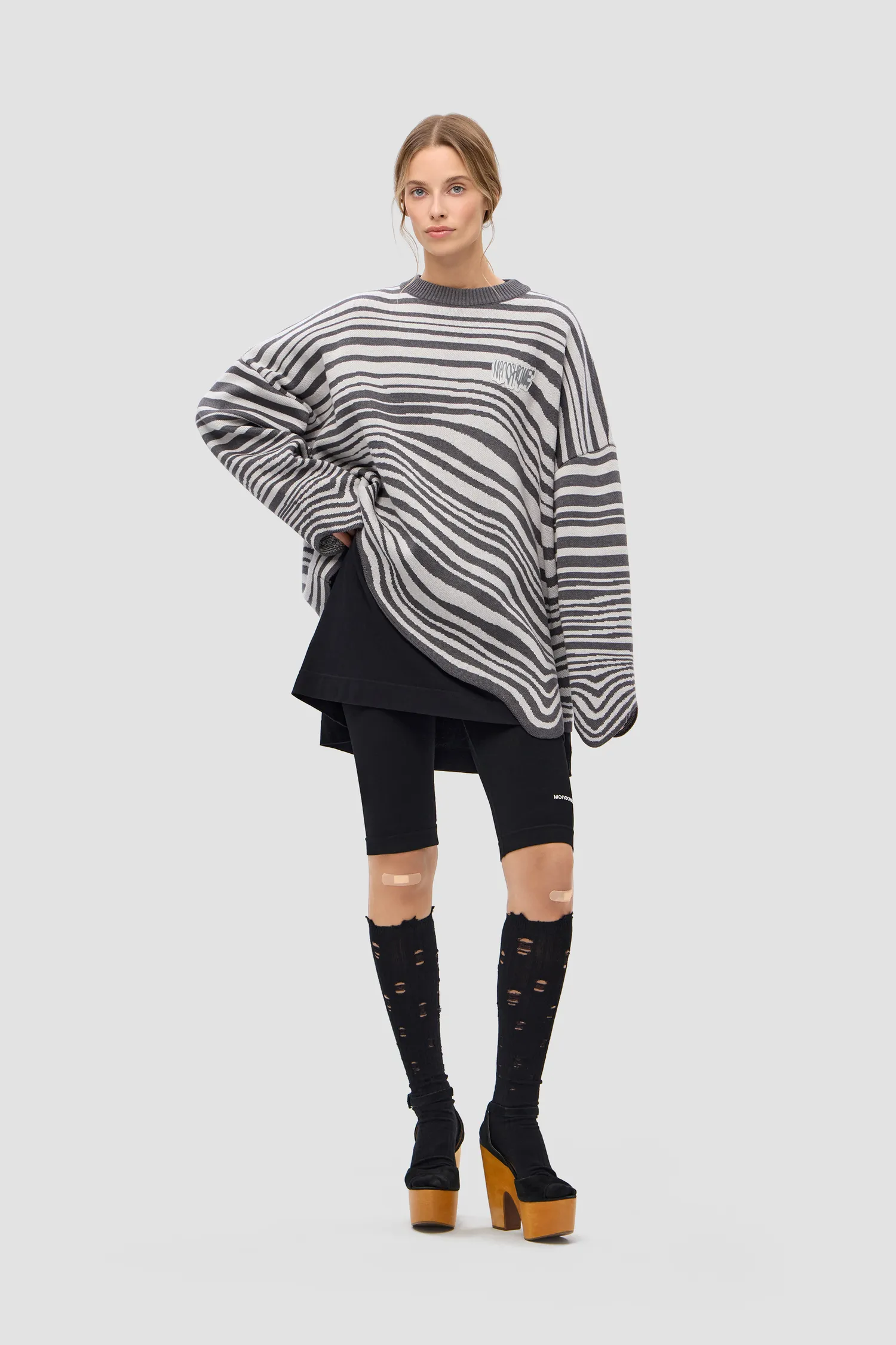 Свитер с ассиметричными линиями и волнообразным силуэтом серого цвета. Смесовый хлопок. Полимерная нашивка в области груди. Гладкая фактура. О-образная горловина. Onesize&Unisex. Упаковка в подарочную коробку.