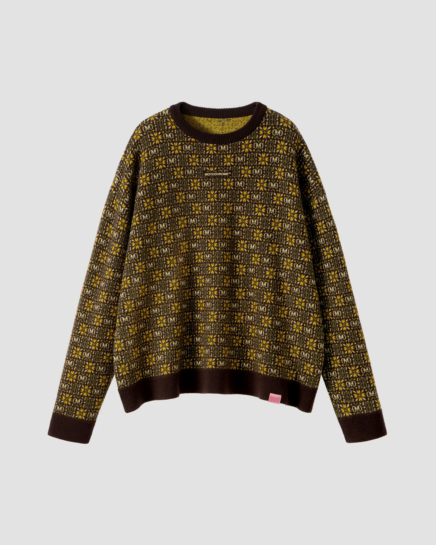 Oversized свитер с вязальным узором в виде фирменных элементов MONOCHROME из коллекции VILLAGE'25. О-образный вырез. Выполнен из смесовой шерсти. Гладкая фактура вязки. Рельефный логотип в области груди. Жаккардовый флажок по нижнему краю изделия в розовом цвете. Onesize&Unisex. Упаковка в подарочную коробку.