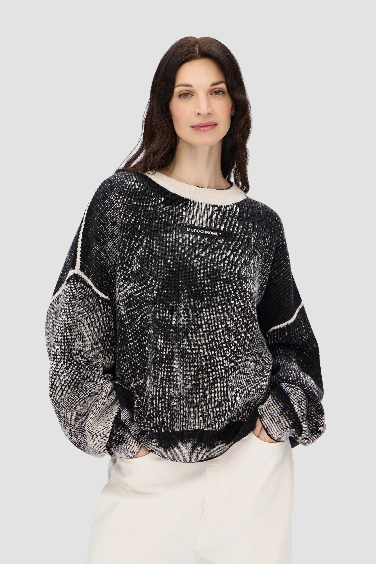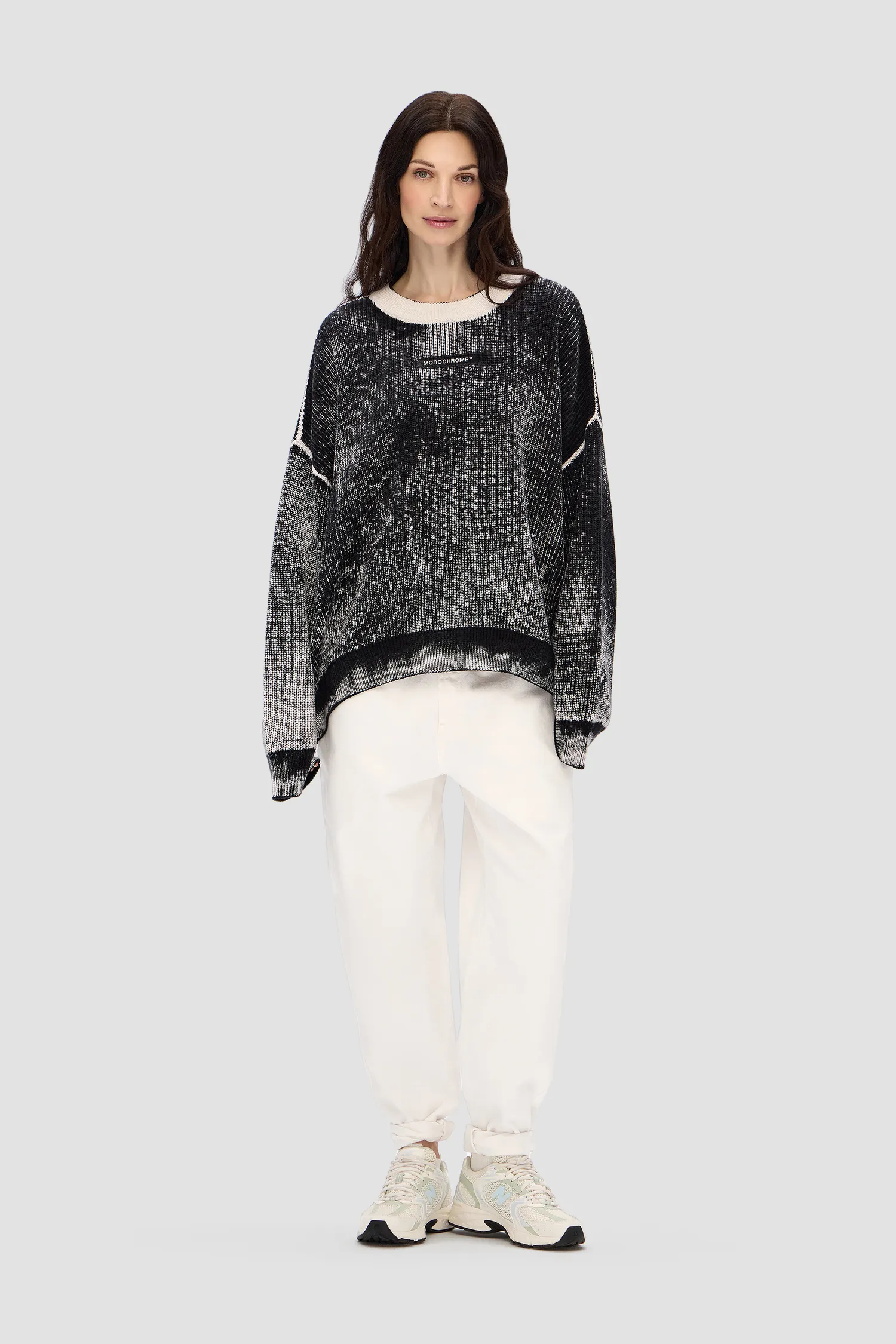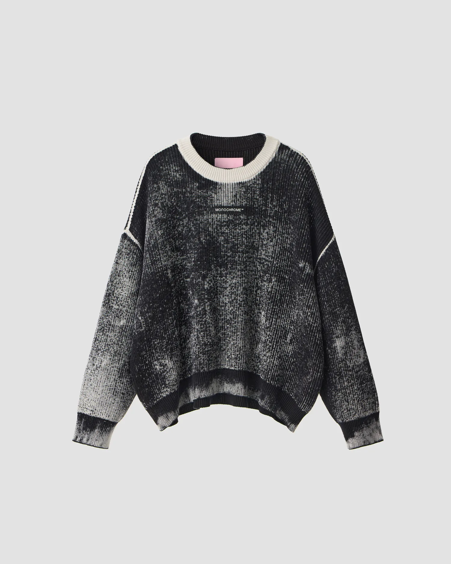 Укороченный oversized свитер в рубчик из 100% хлопка. О-образный вырез. Изделия окрашиваются вручную, поэтому каждый свитер имеет уникальный рисунок. В области диафрагмы расположен рельефный логотип MONOCHROME.