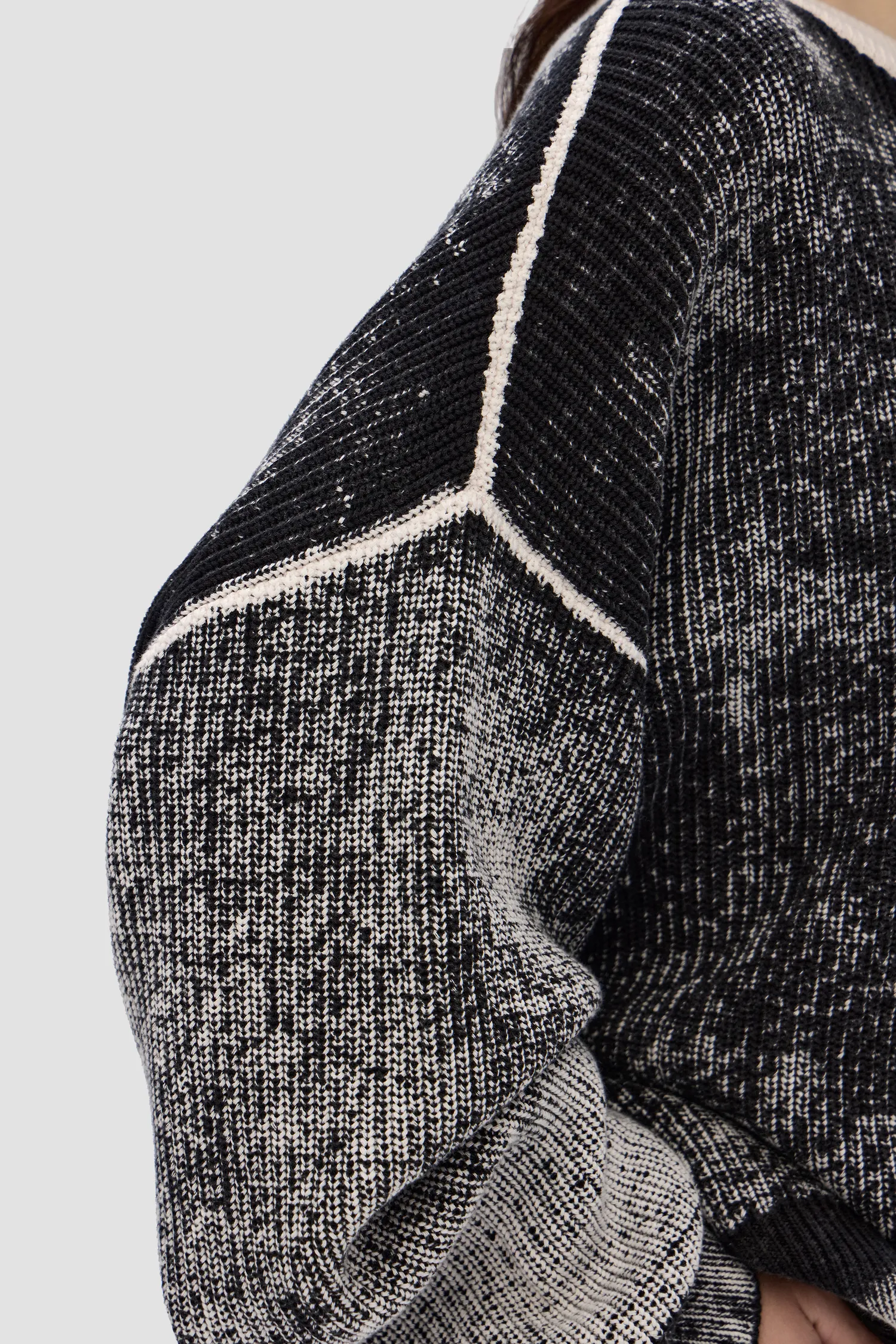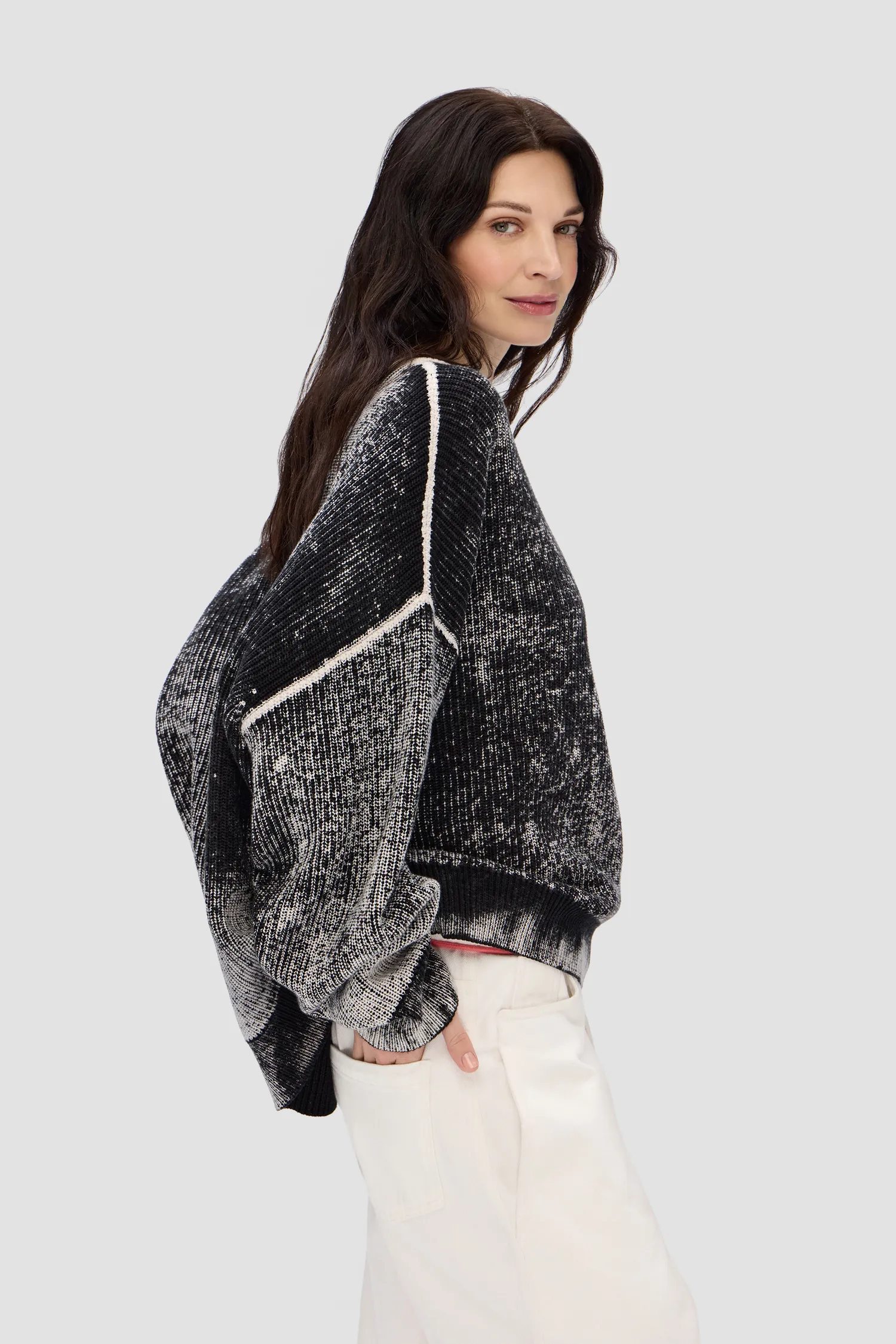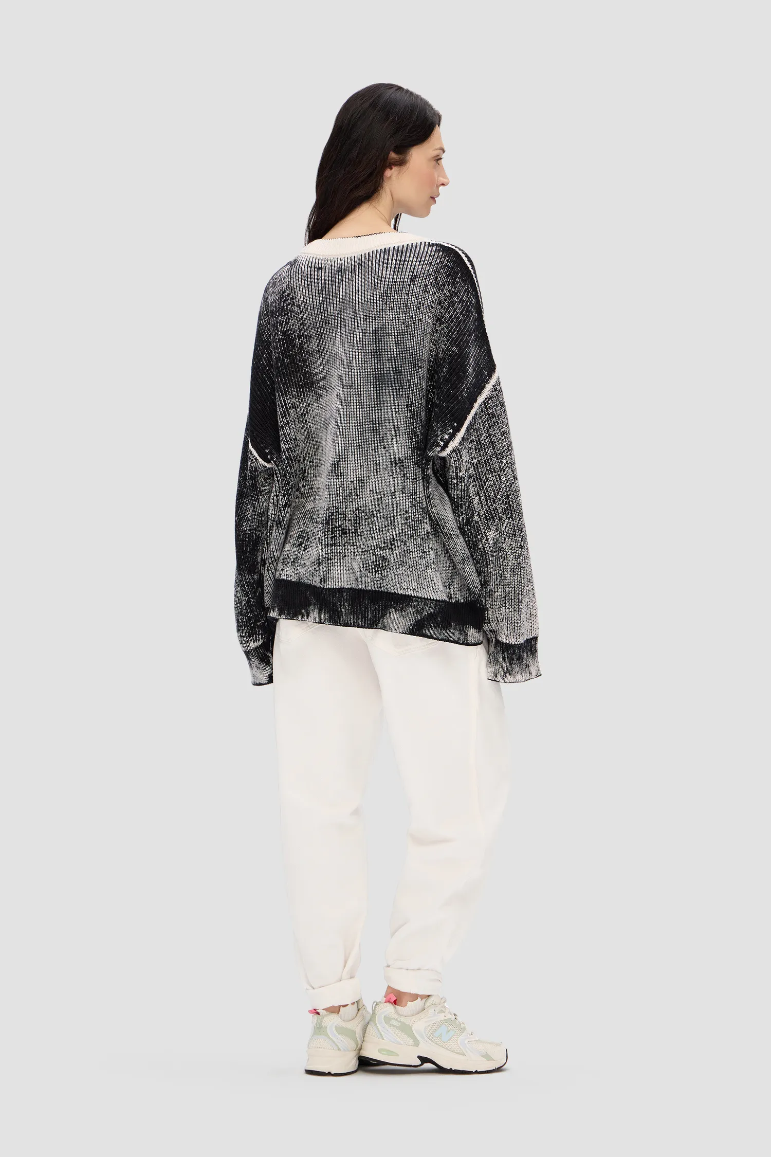 Укороченный oversized свитер в рубчик из 100% хлопка. О-образный вырез. Изделия окрашиваются вручную, поэтому каждый свитер имеет уникальный рисунок. В области диафрагмы расположен рельефный логотип MONOCHROME.