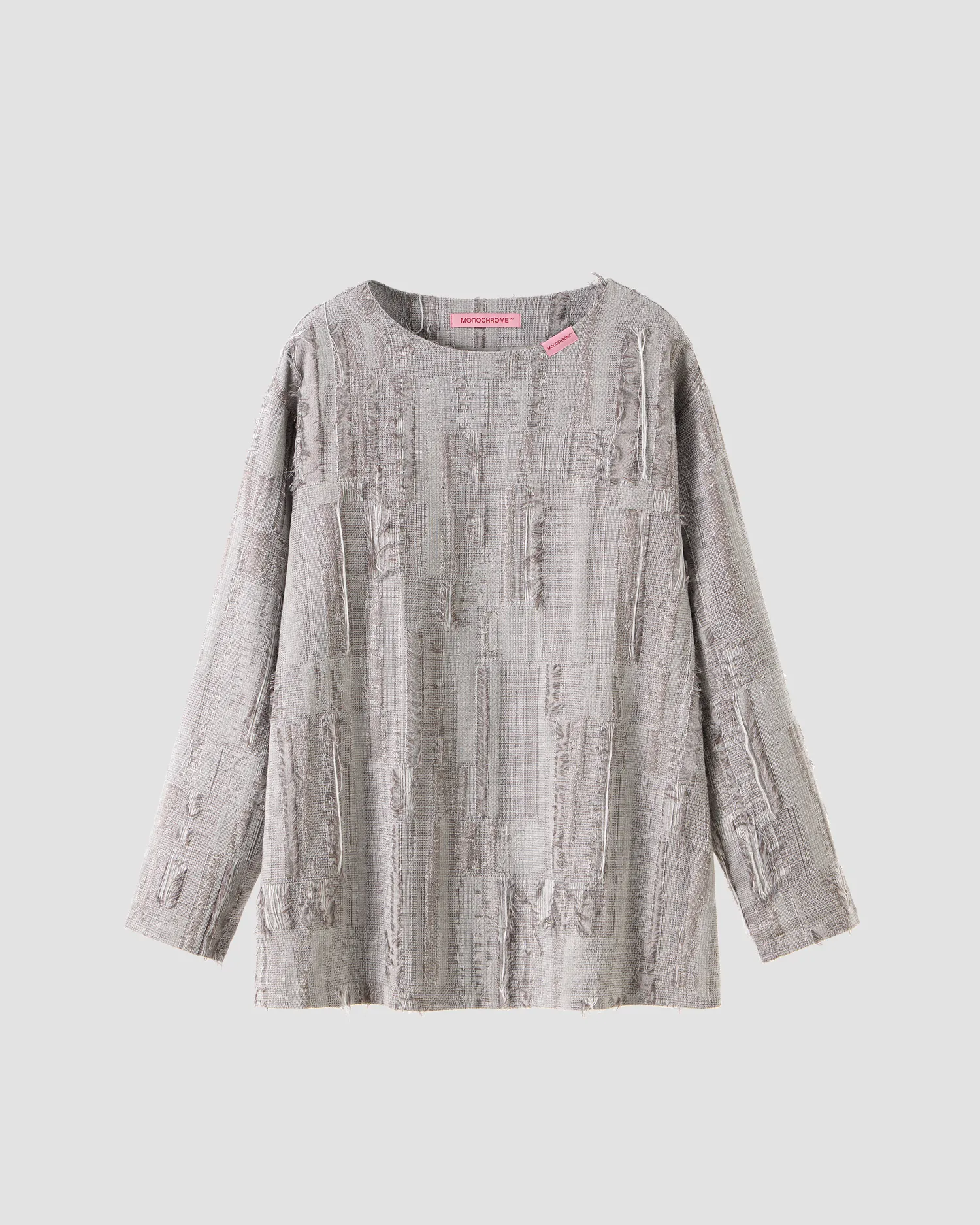 Oversized лонгслив серого цвета из коллекции VILLAGE'25. Выполнен из смесовой вискозы со льном. Ткань имеет фактуру с деликатным рваным эффектом и спущенными нитями. Подклад в тон изделия. О-образный вырез. Жаккардовый флажок розового цвета в области горловины. Onesize&Unisex. Упаковка в подарочную коробку.