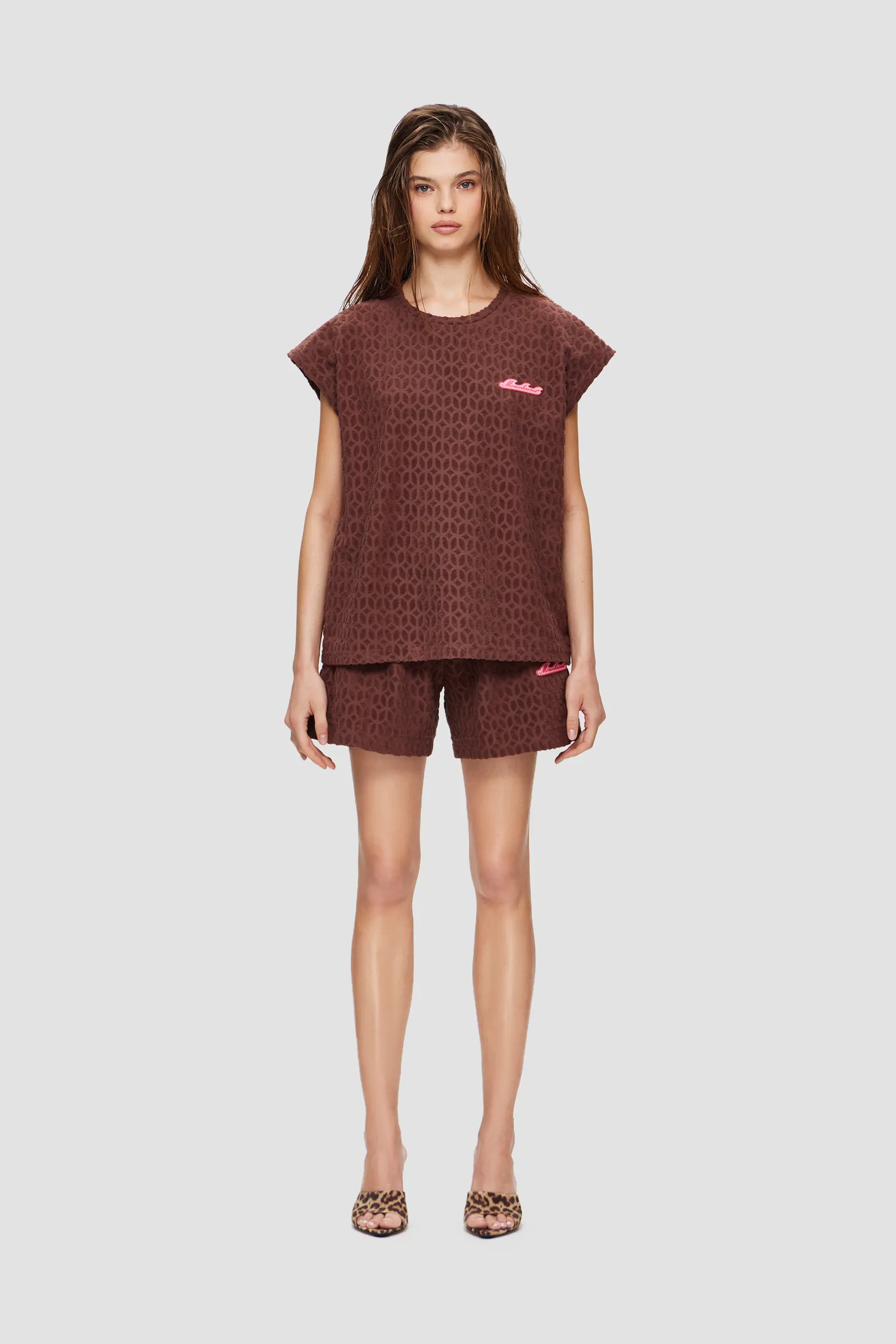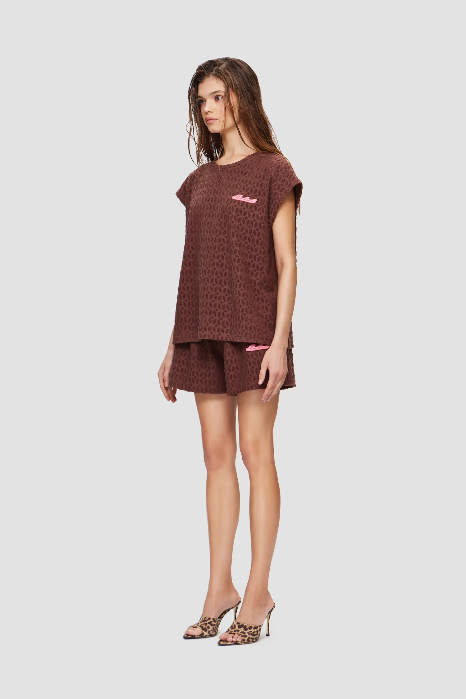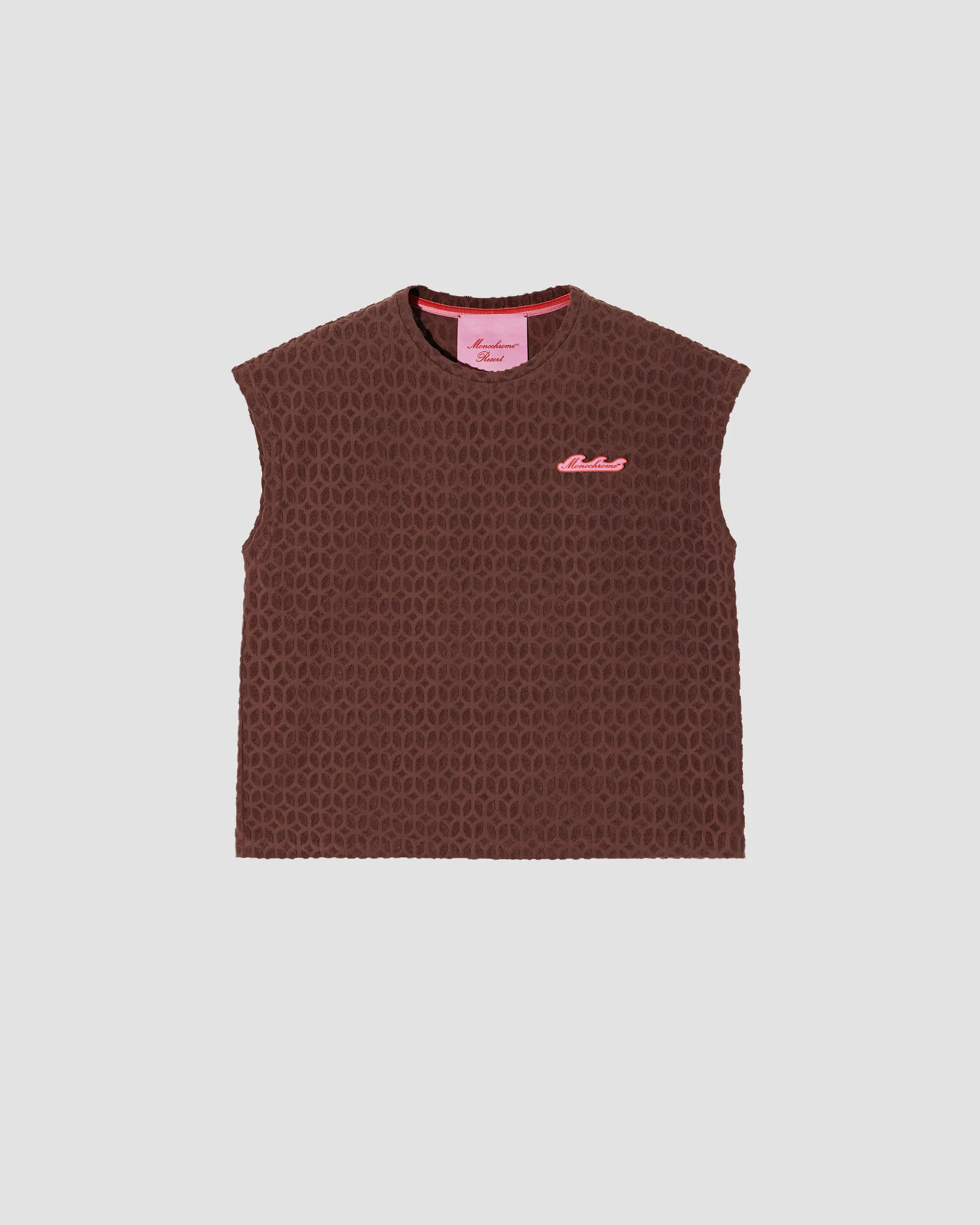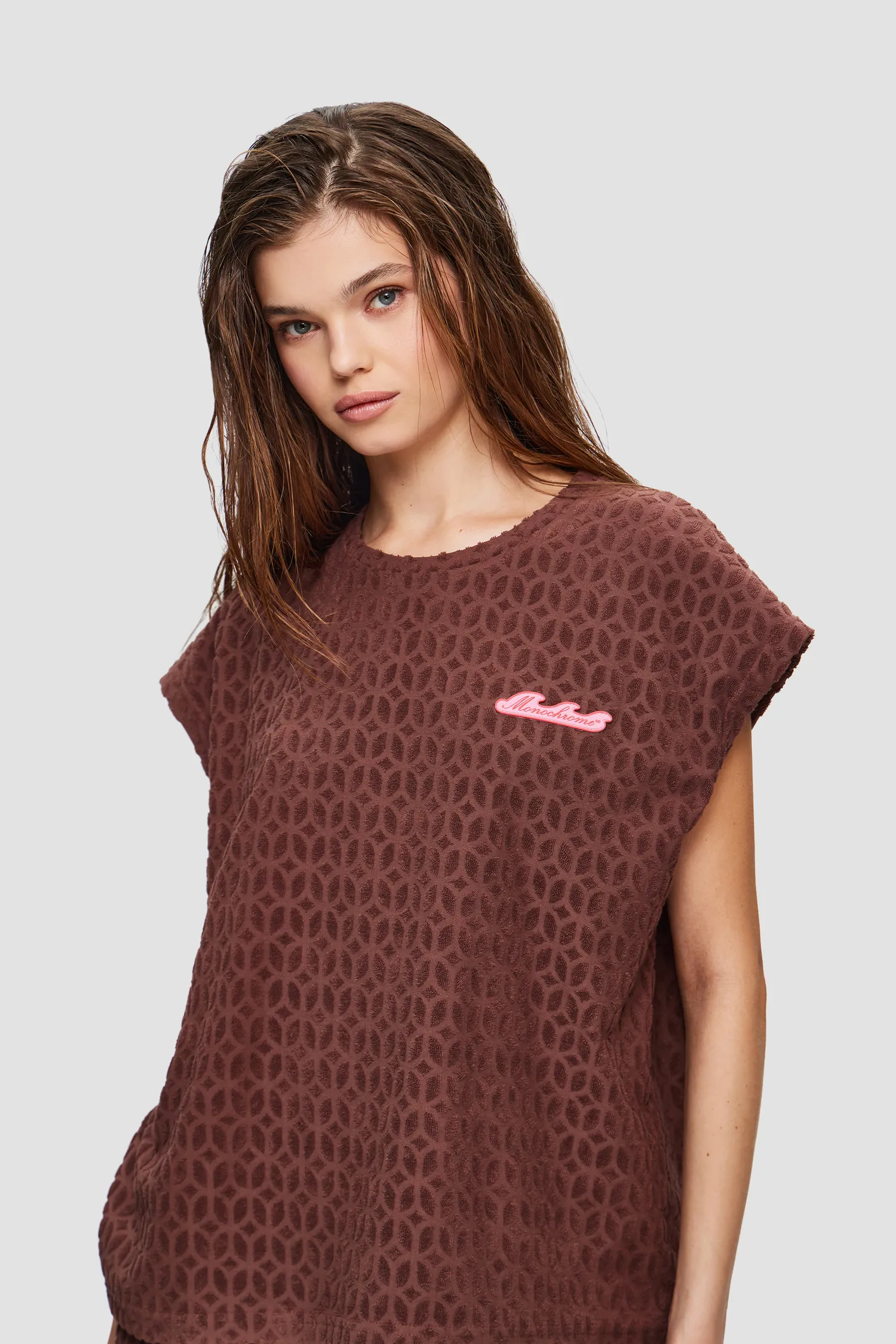 Майка из махровой ткани с фактурным узором в виде фирменного паттерна MONOCHROME. Полотно выполнено из мягкого 100% хлопка, приятного на ощупь. В области груди расположена полимерная нашивка в виде волны, разработанная специально для капсулы RESORT. Упаковка в подарочную коробку. Сделано в России на собственной мануфактуре MONOCHROME.