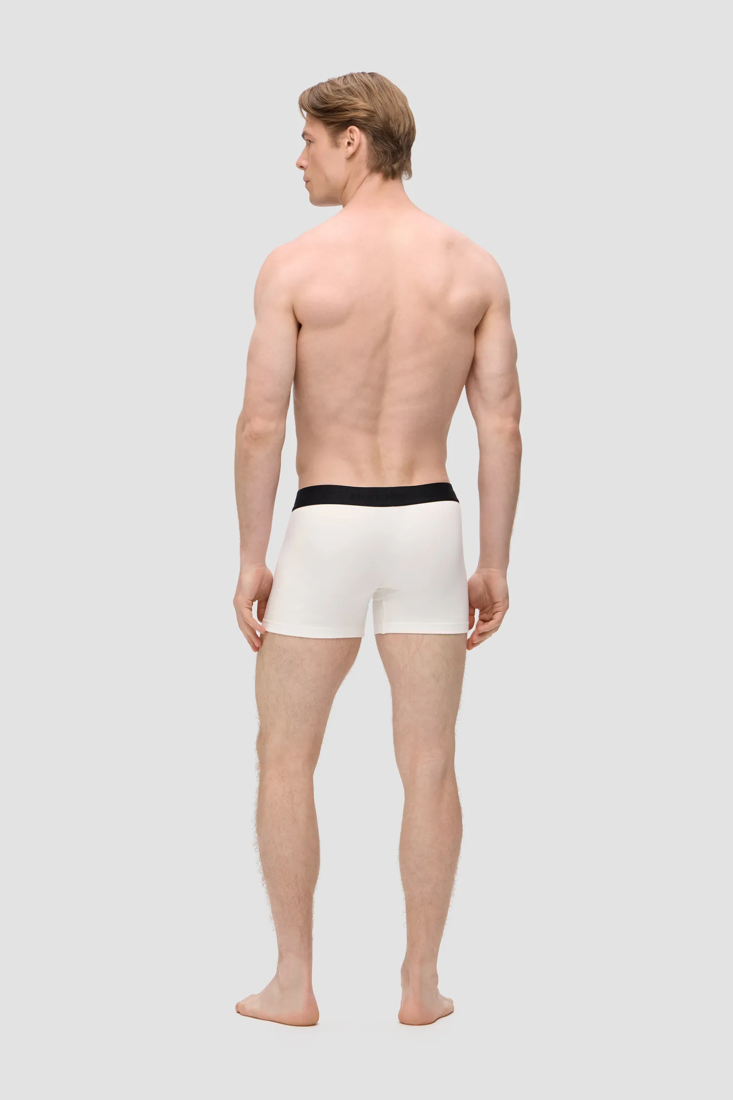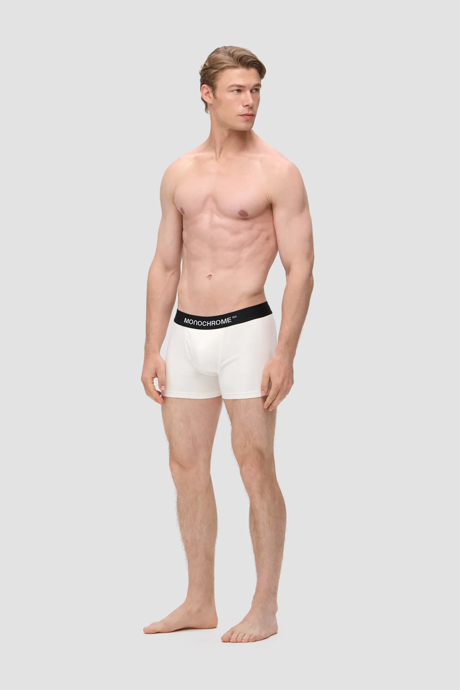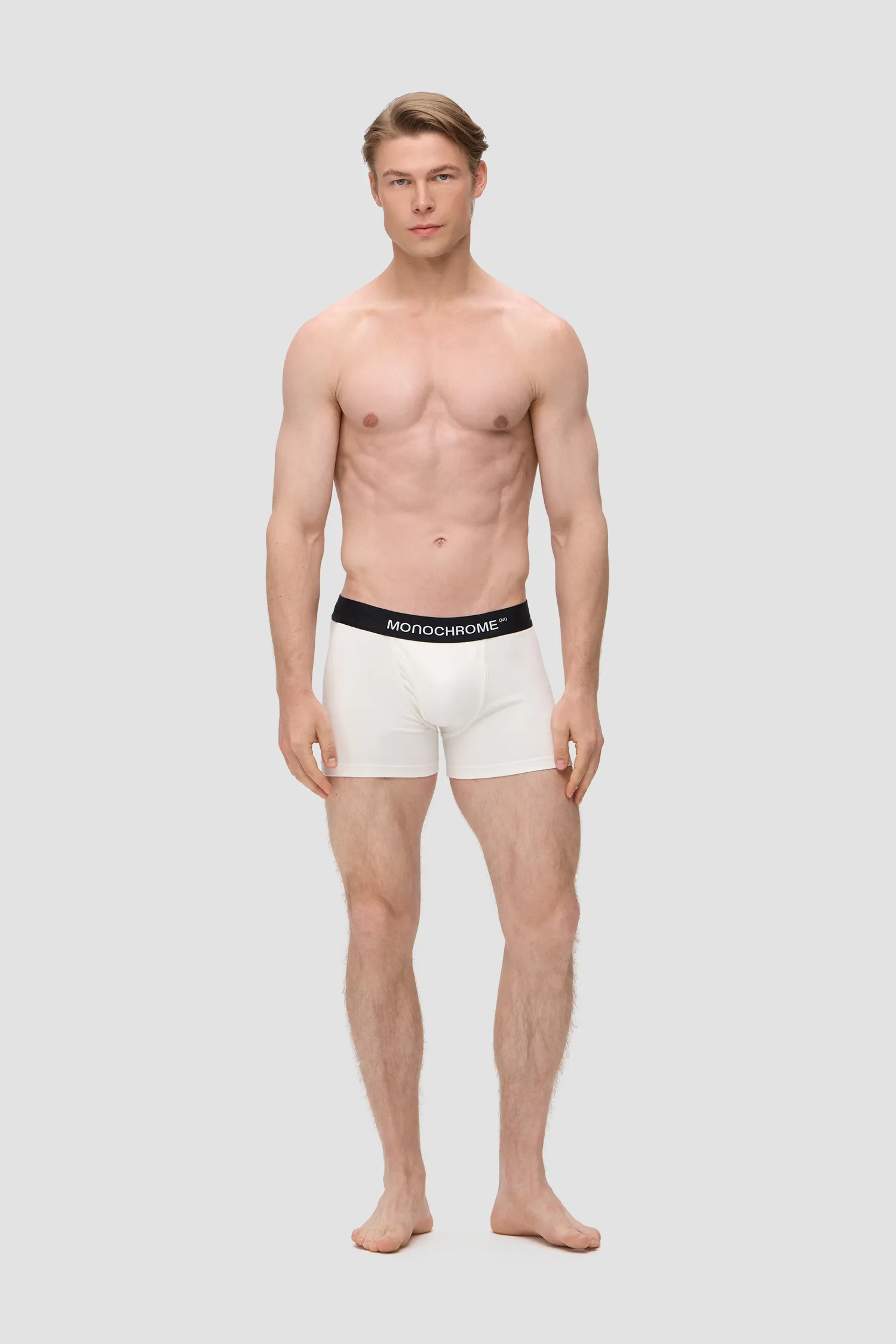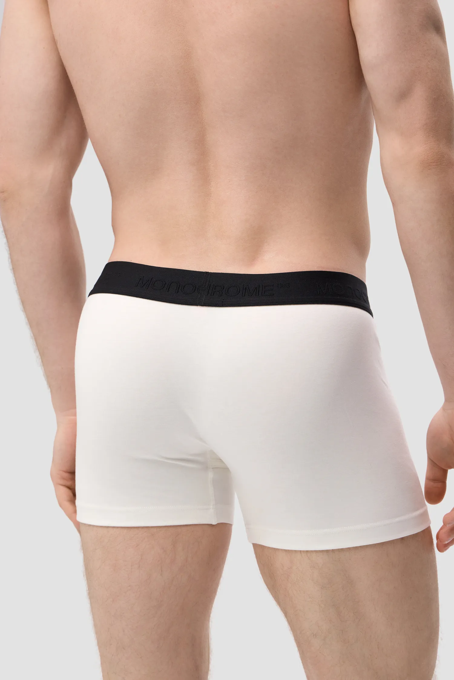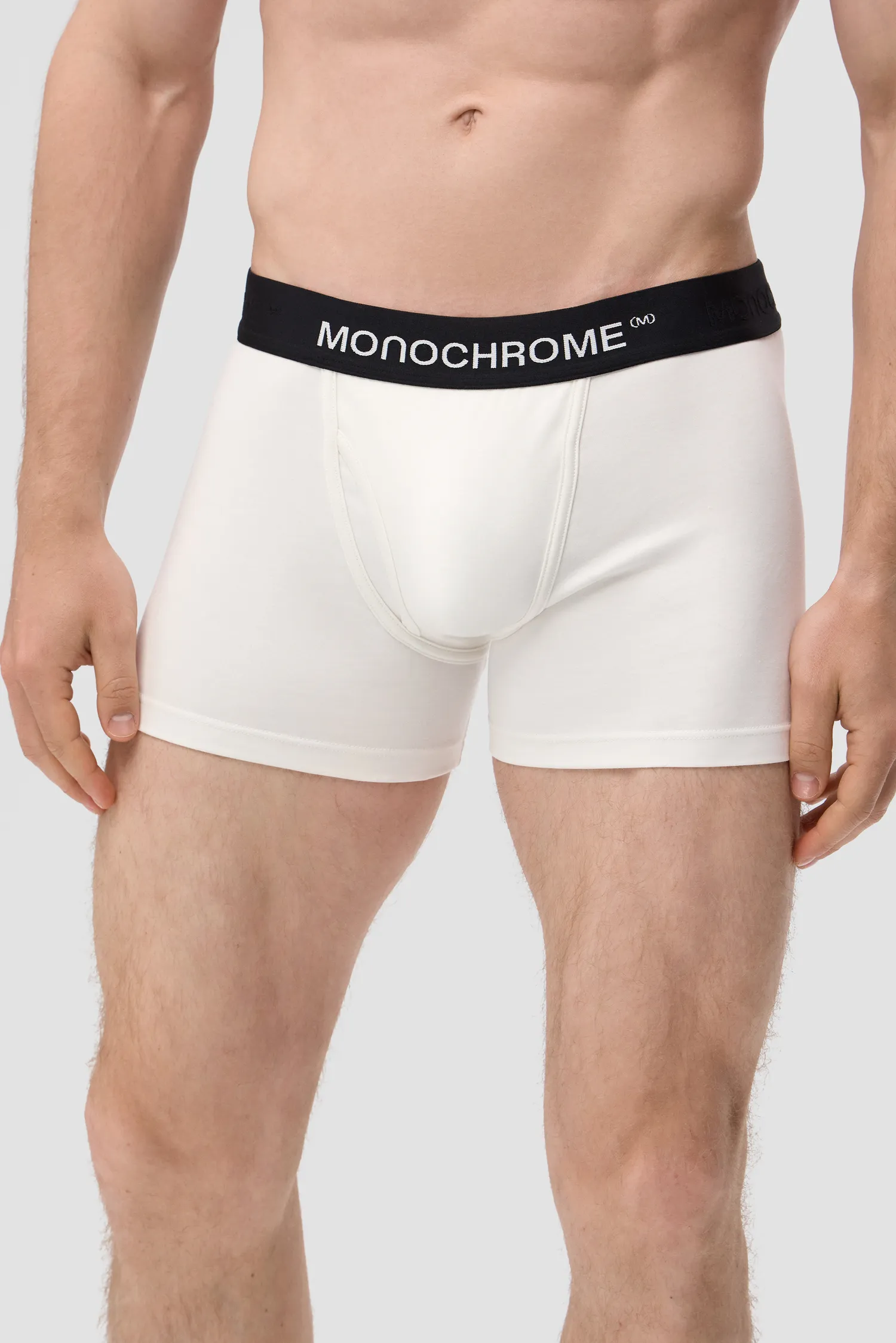 Мужские трусы-боксеры молочного цвета из смесового хлопка. Внешняя резинка черного цвета, обеспечивает надежную фиксацию и предотвращает смещение белья во время движения. Вышитый фирменный логотип MONOCHROME на резинке. Упаковка в коробку для белья. Для изделий линейки UNDERWEAR используется модал, получаемый из эвкалиптовой древесины. Изделия из этого материала отличаются особой мягкостью и приятно ощущаются на теле.