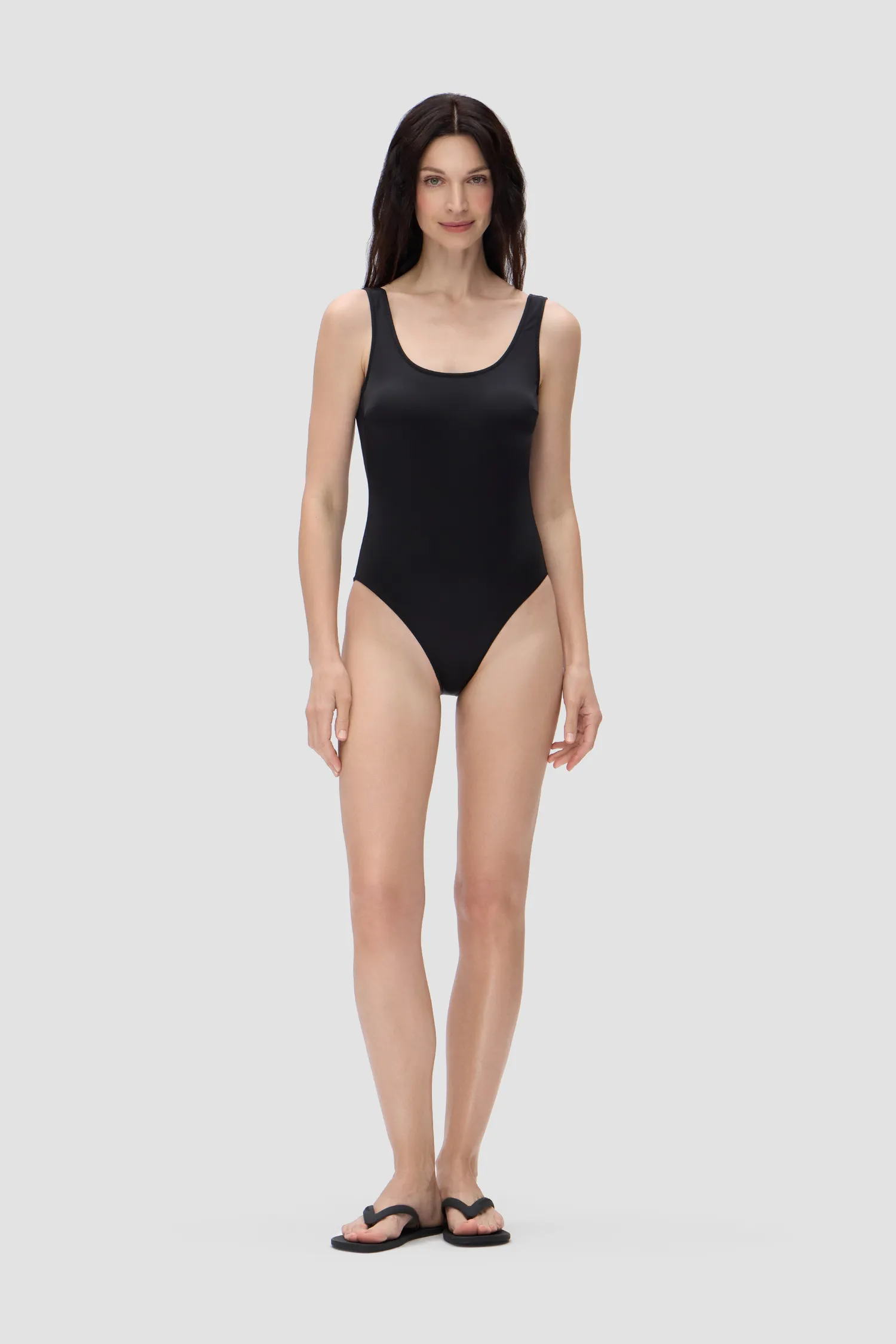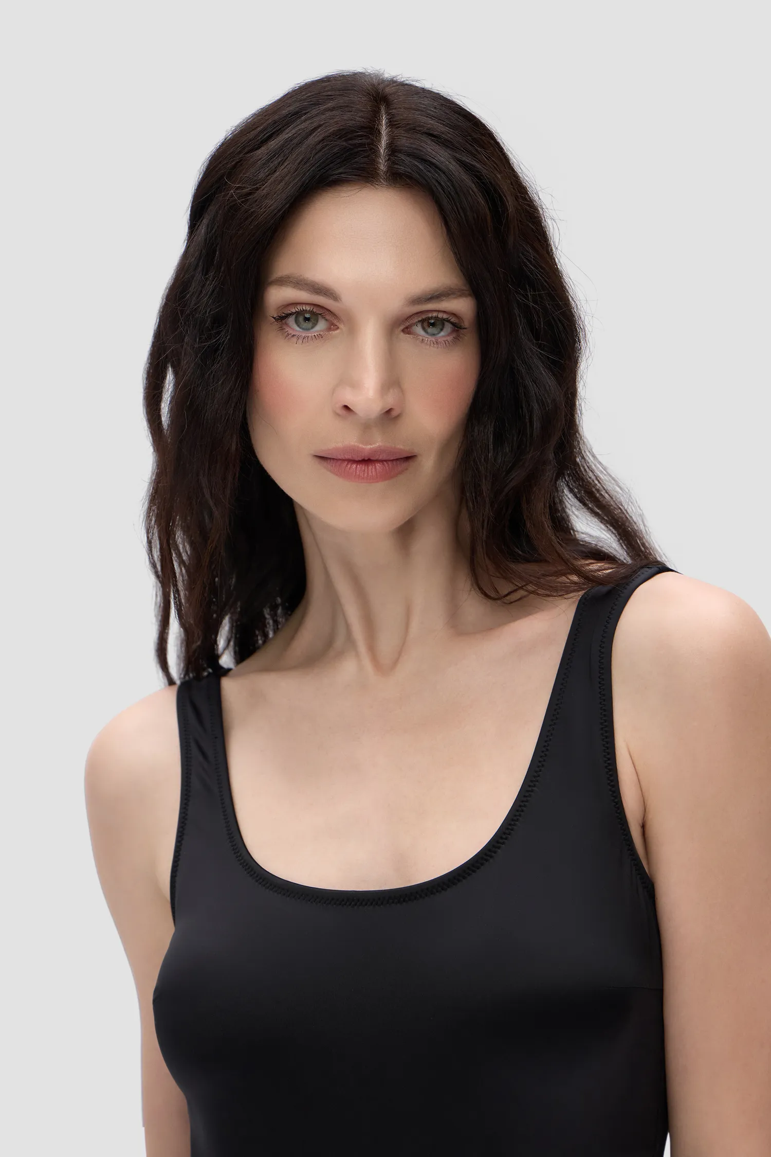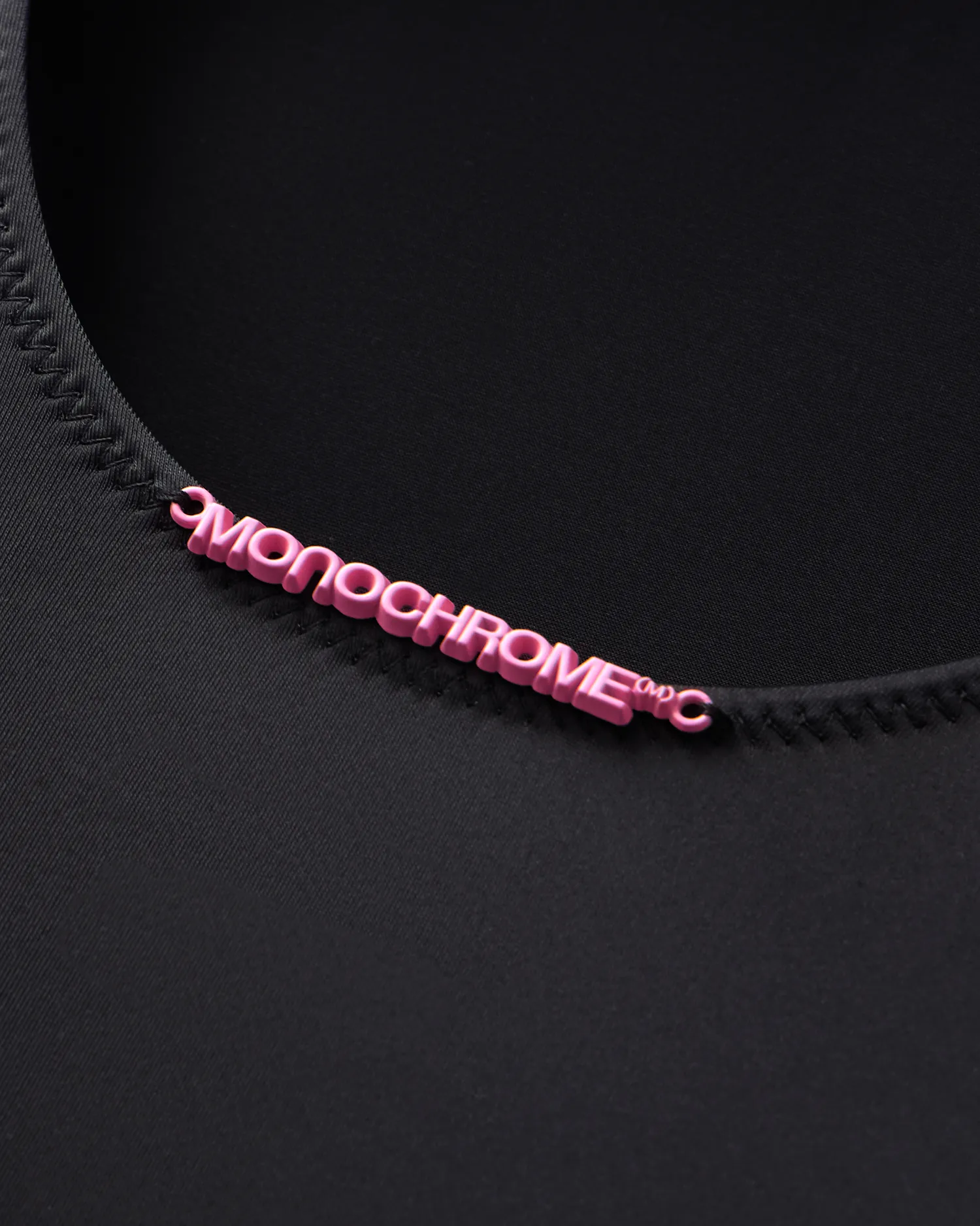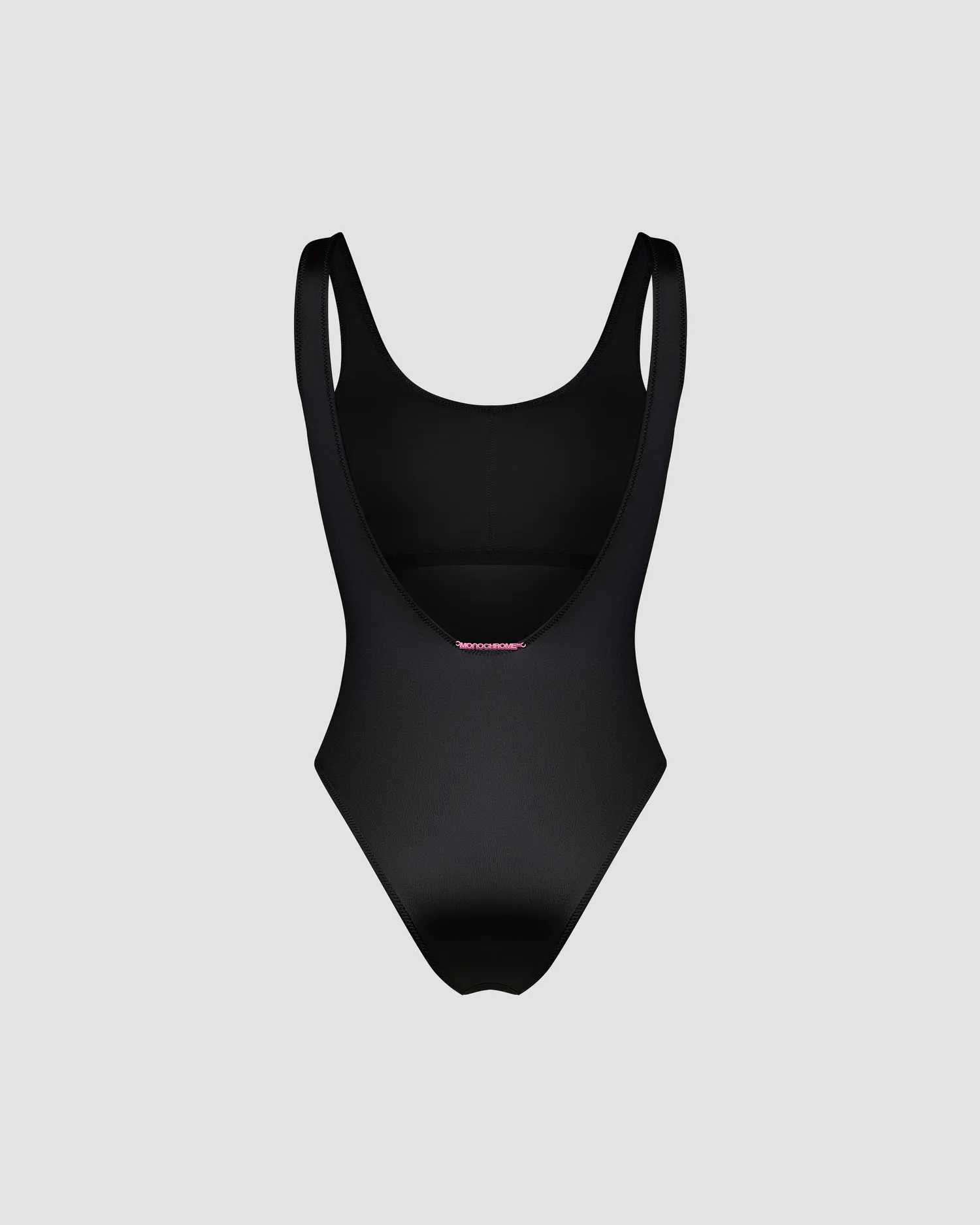 Слитный купальник черного цвета. Классическое бра с поддержкой груди и съёмными чашечками. Широкие бретели. Глубокий U-образный вырез на спине. Фирменный металлический логотип MONOCHROME в розовом цвете. Подходит для бассейна и открытой воды. Упакован в фирменную косметичку из водонепроницаемого материала и в подарочную коробку.